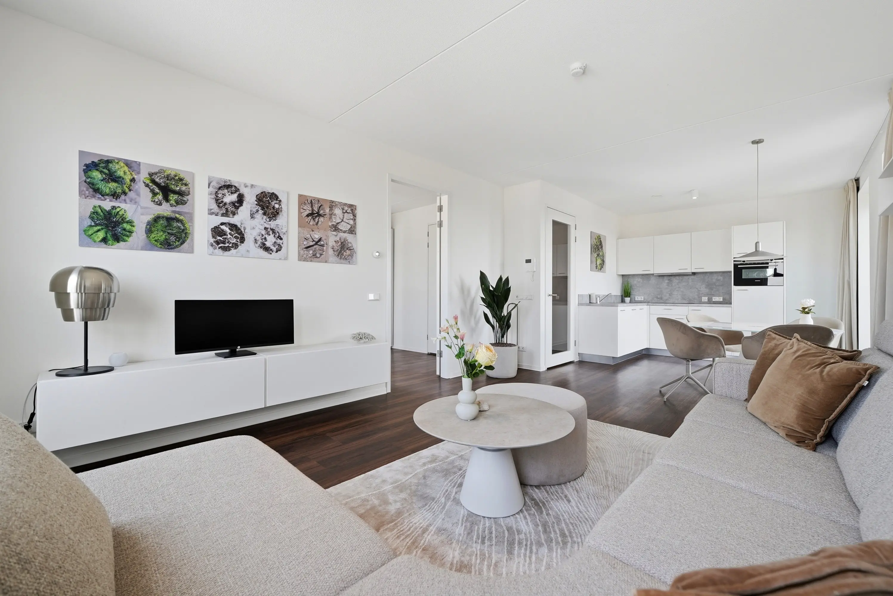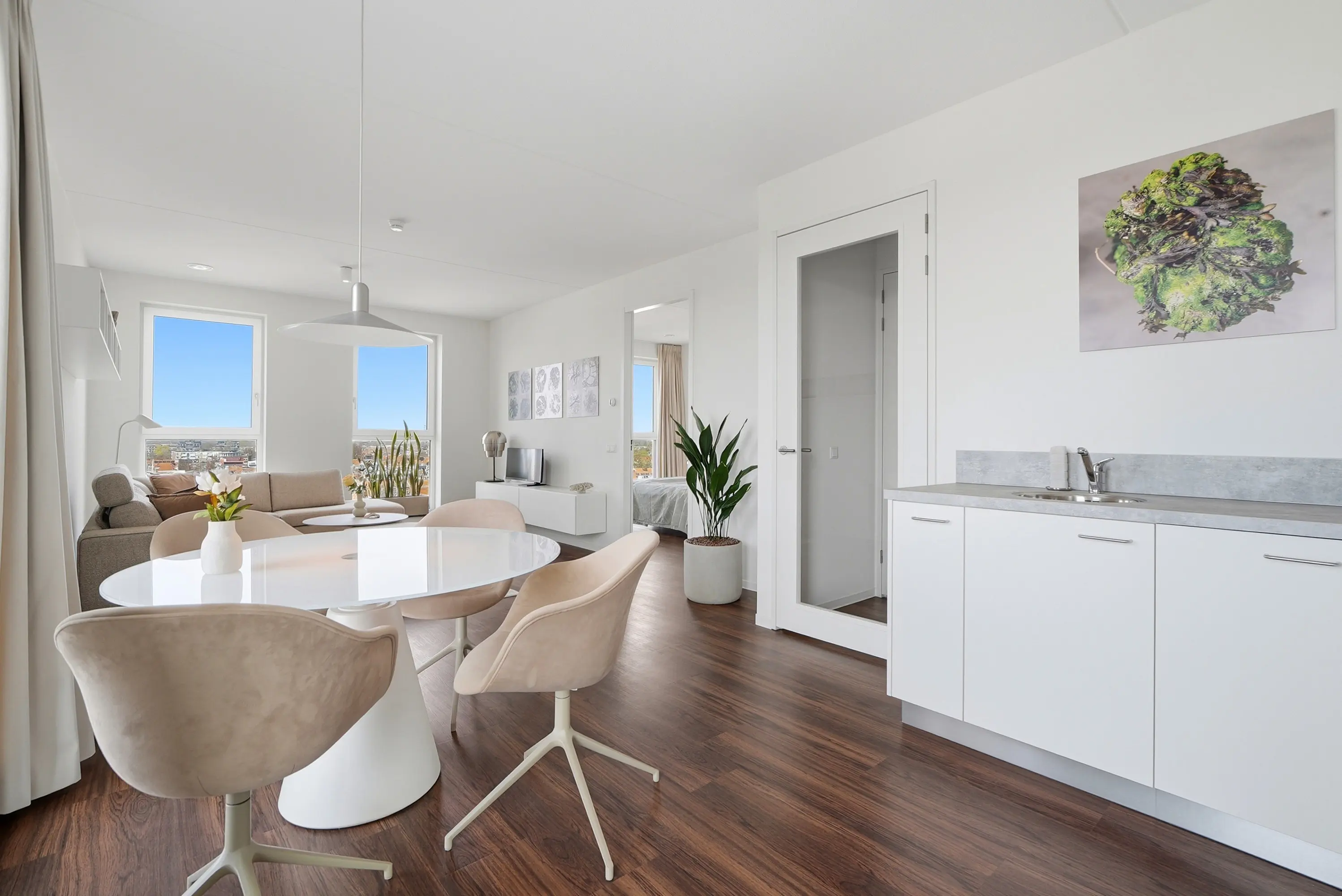 Het appartement is met zorg en oog voor detail ingericht. Grote raampartijen zorgen voor een aangename lichtinval en versterken het ruimtelijke karakter van de woning. Over de gehele woning ligt een stijlvolle bruine PVC-vloer, die warmte toevoegt aan het interieur en een elegant contrast vormt met de lichte afwerking van wanden en keuken.