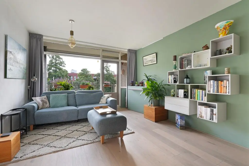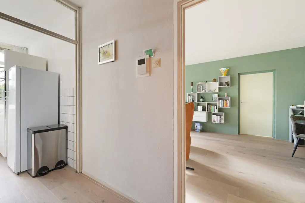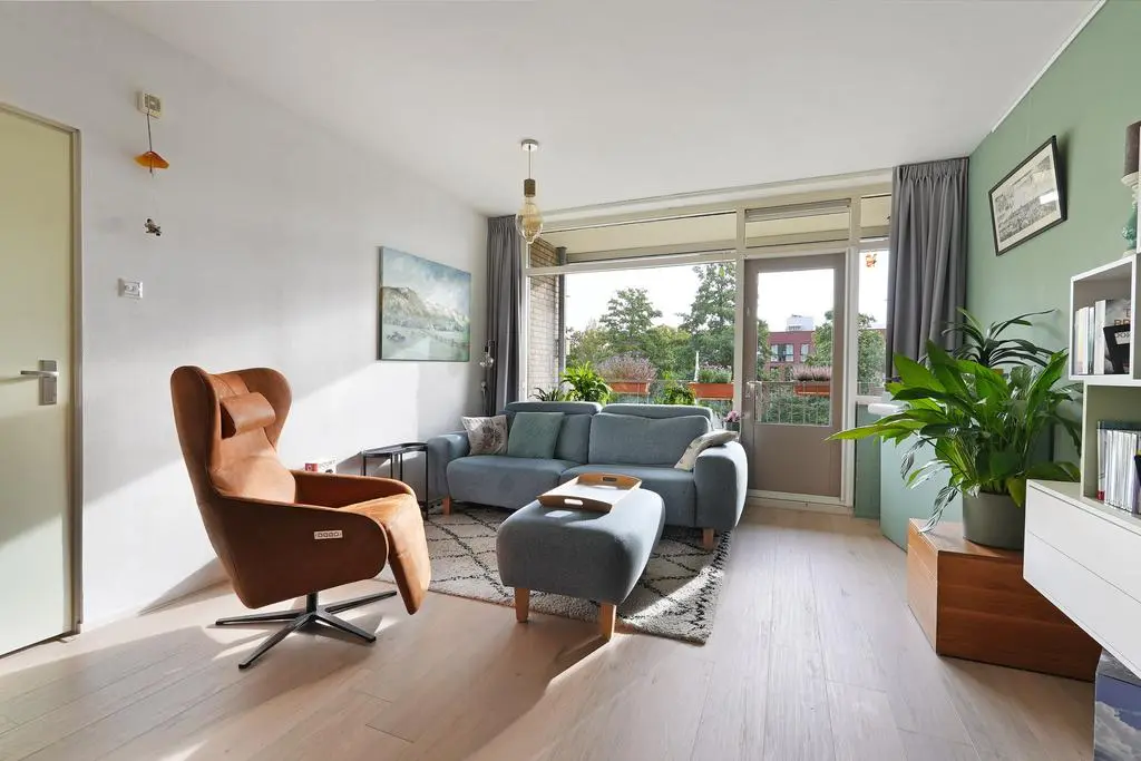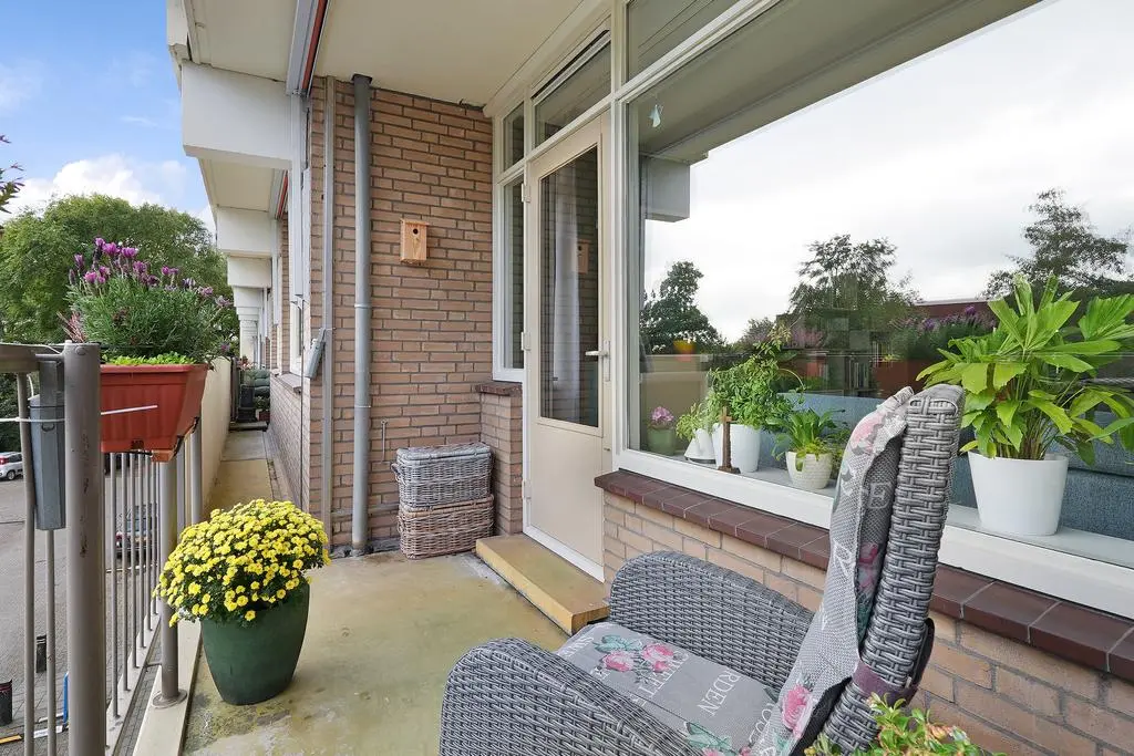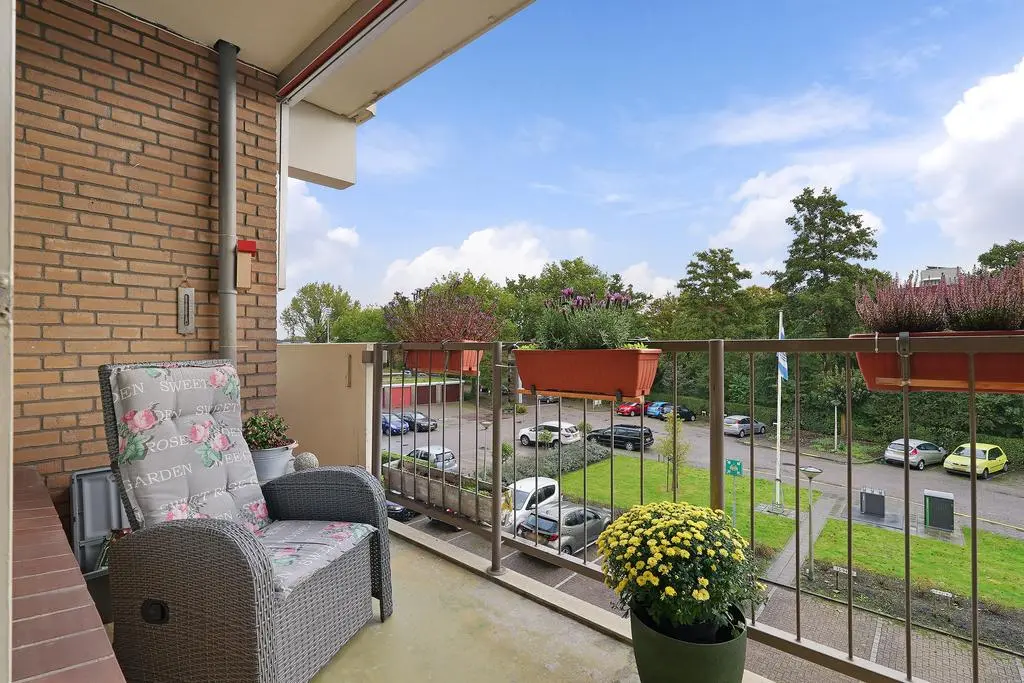 Aangekomen op de verdieping treft u de hal met meterkast, garderobe en doorgang naar het appartement. Bij binnenkomst in de woonkamer ervaart u direct de lichte beleving en de gezellige indeling met direct aaneensluitend het overdekte balkon. Hier heeft u ruimte voor een zitje en heeft u een prettig uitzicht en bezonning met volop privacy.