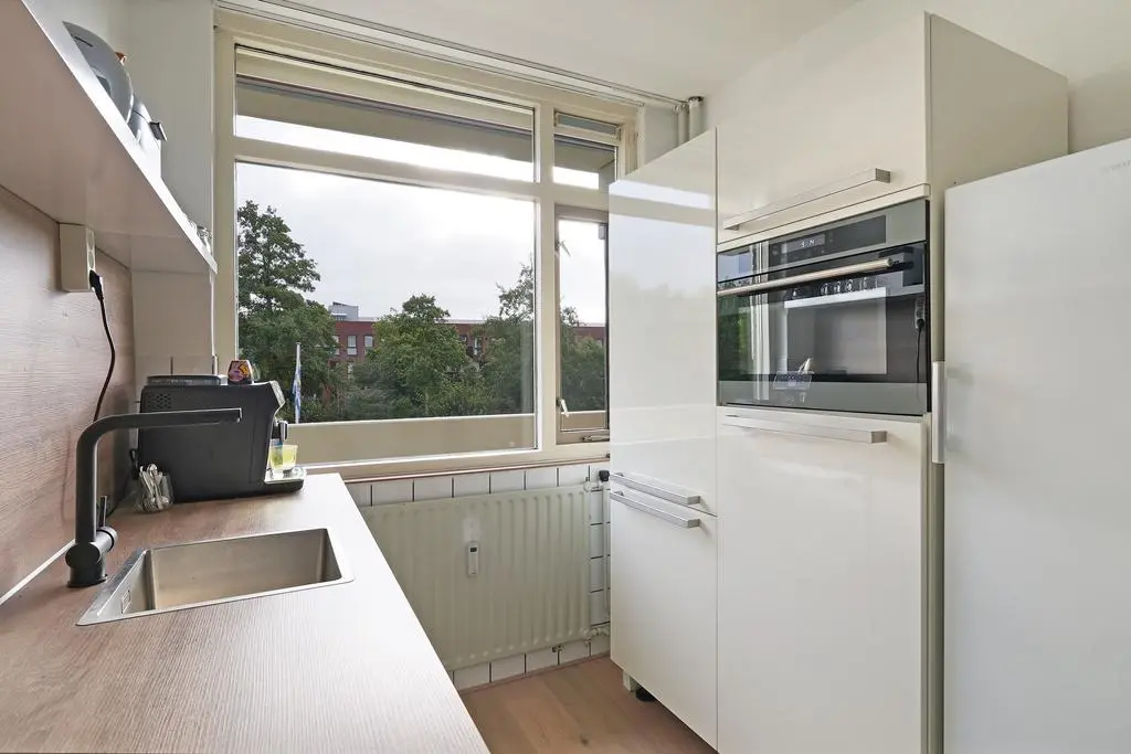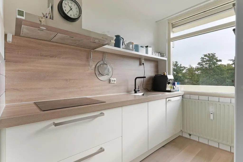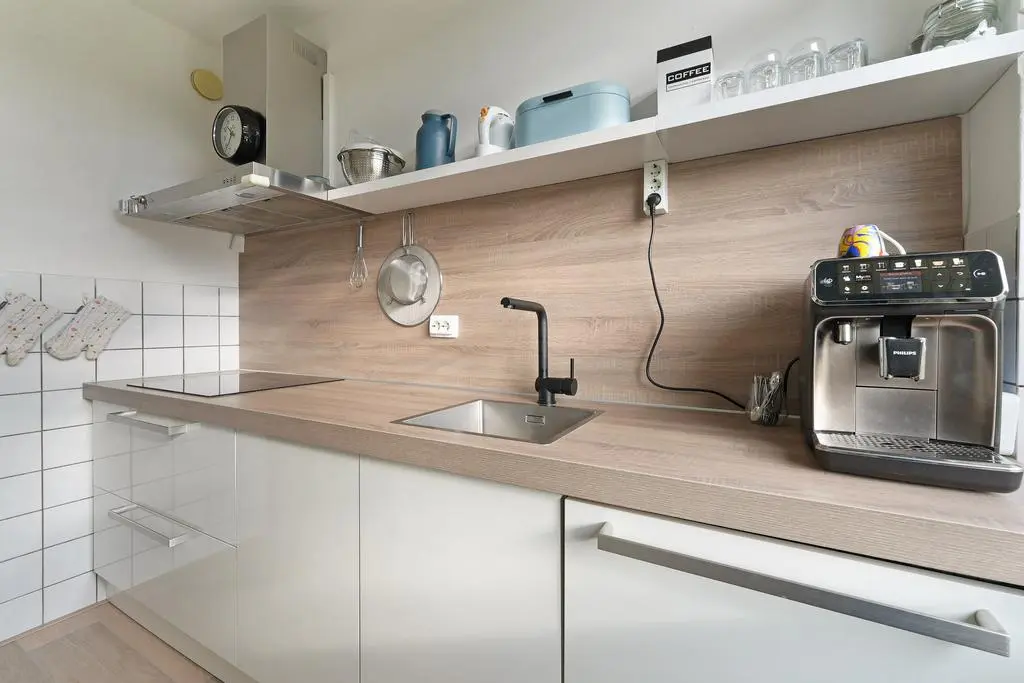 De gesloten keuken is uitgevoerd in een keurig verzorgde parallelopstelling met lichte kastfronten en een houtlook werkblad. De inbouwapparatuur is eveneens verzorgd met een inductiekookplaat, vaatwasser, combi-oven en koel-vriescombinatie.