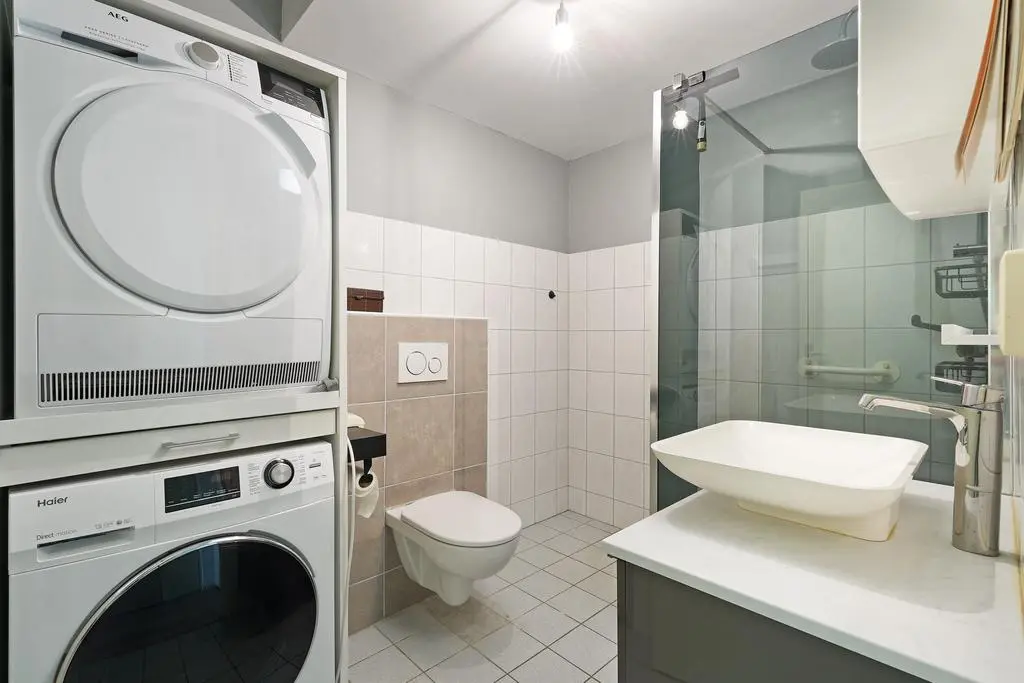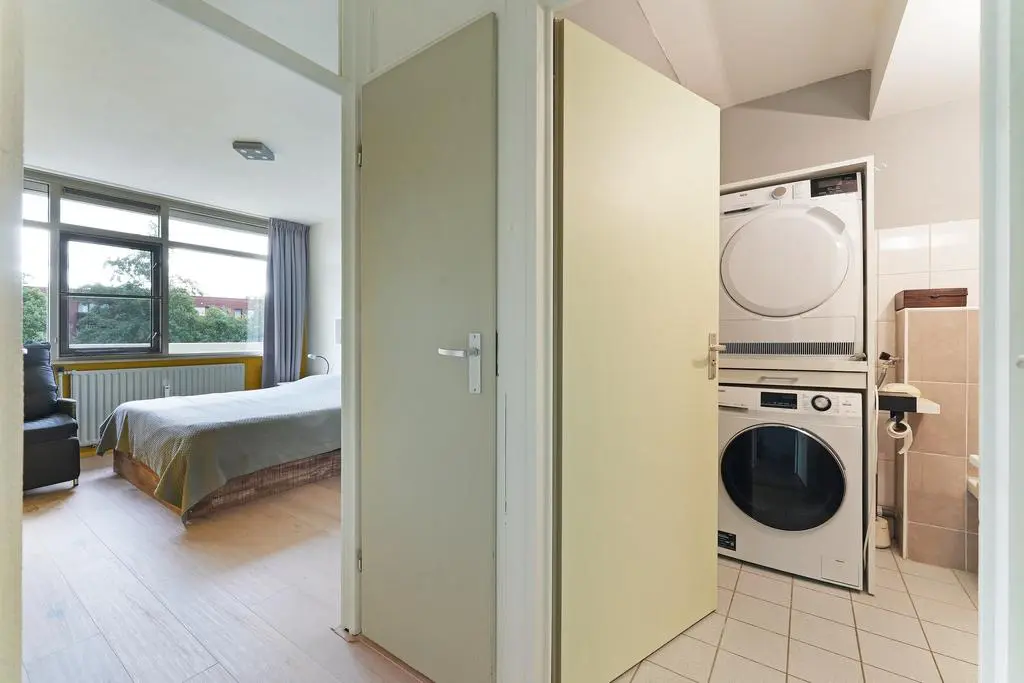 Verder treft u een tussengang met 2 maal een inpandige kastruimte, de ruime en bovenal lichte slaapkamer en de ruime badkamer. In deze nette badkamer treft u een toilet, ruime inloopdouche, wasmachine- en drogeropstelling en wastafelmeubel.