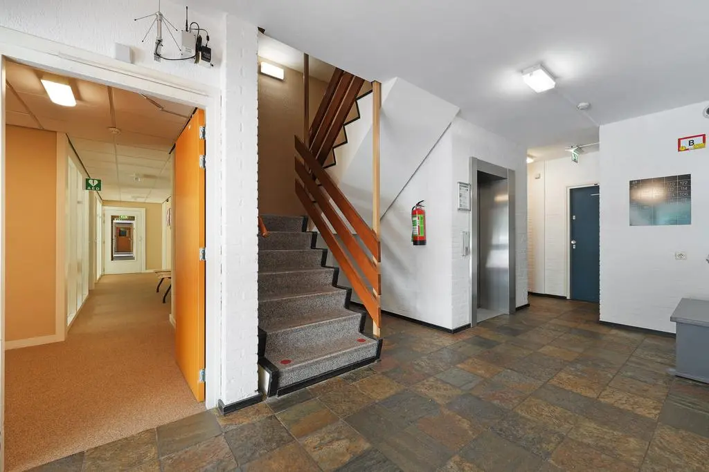 Entree in afgesloten portiek/welkomsthal met intercom en postbussen. Verder toegang tot de lift en het trappenhuis, eigen inpandige berging en een gezamenlijke fietsenstalling.