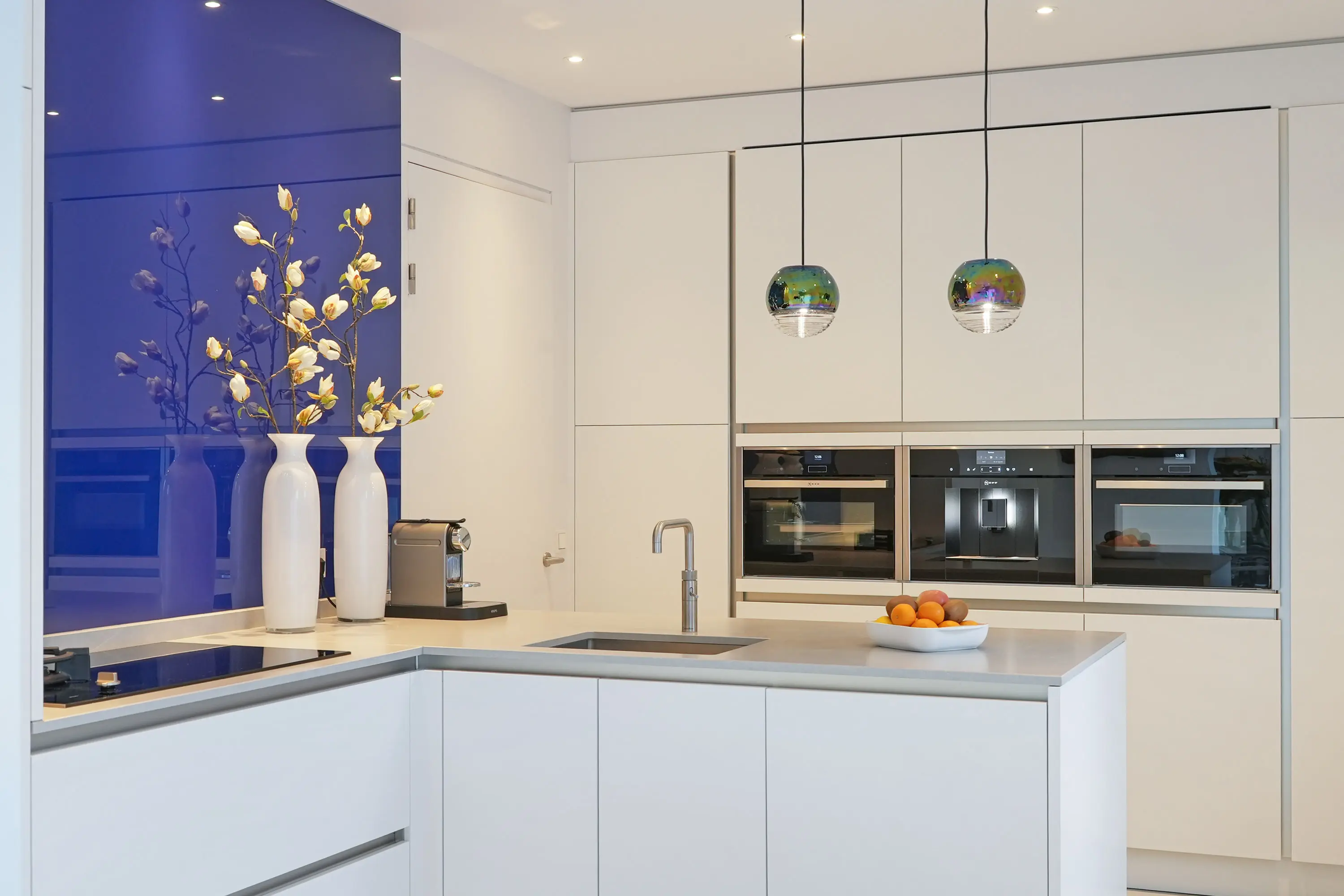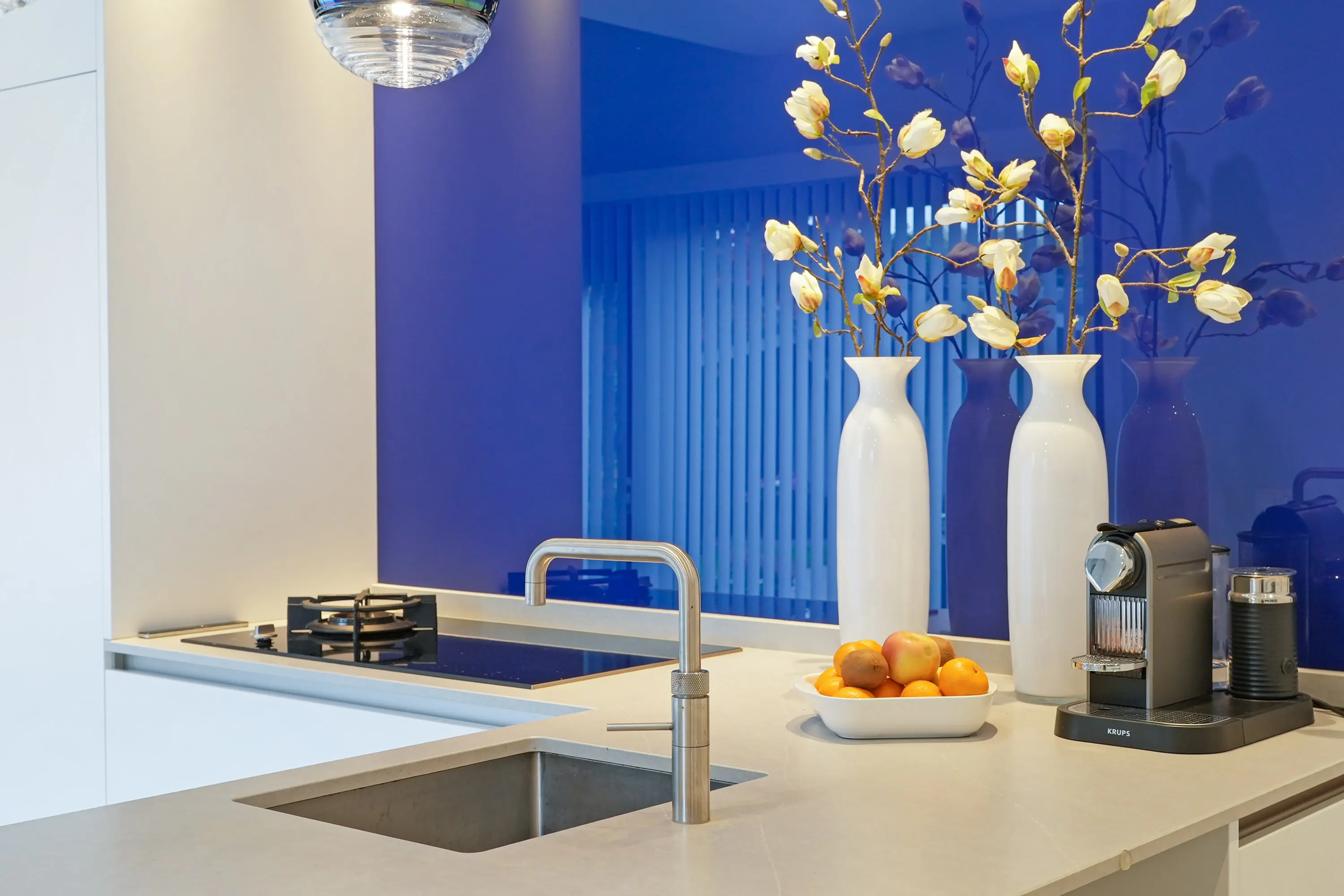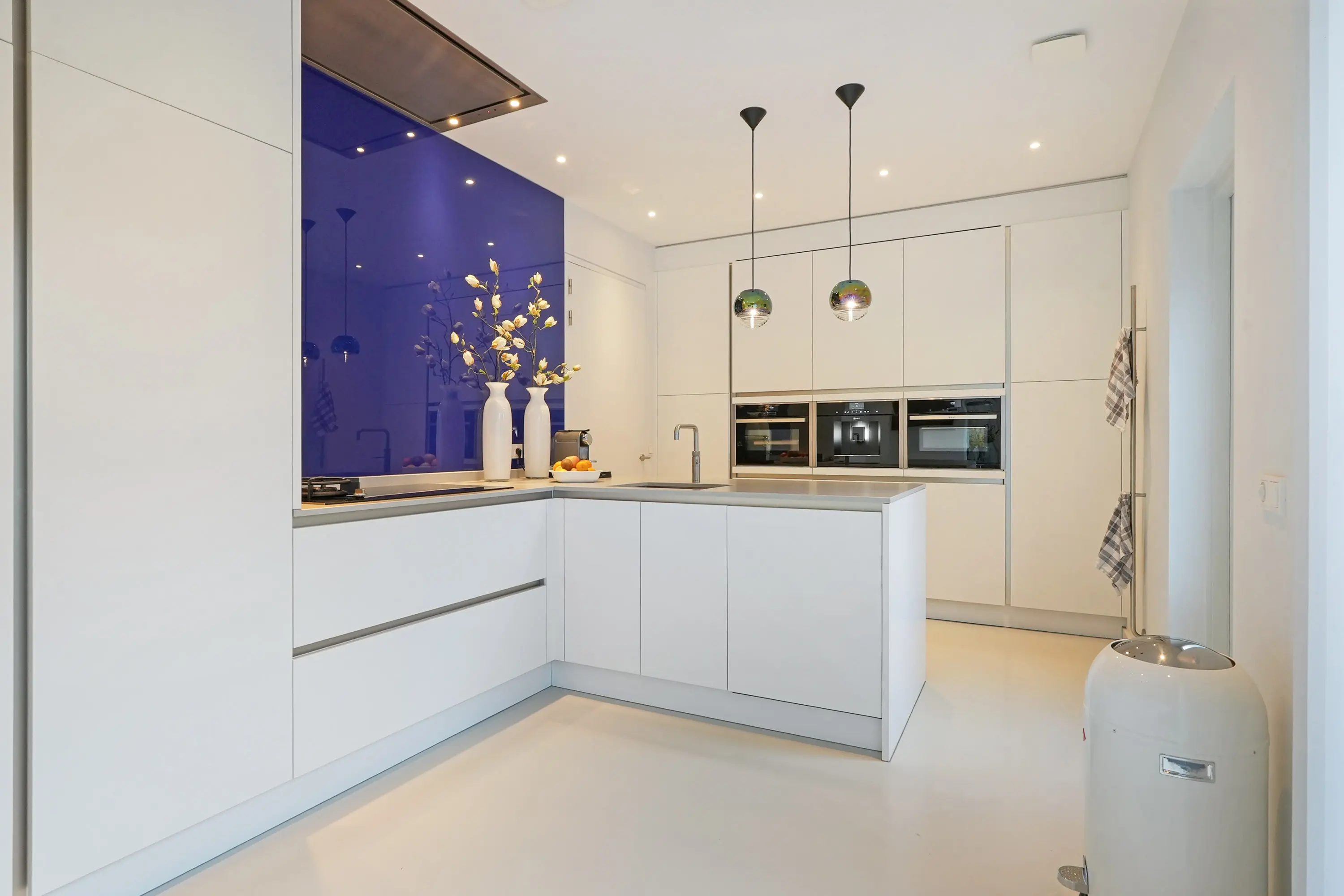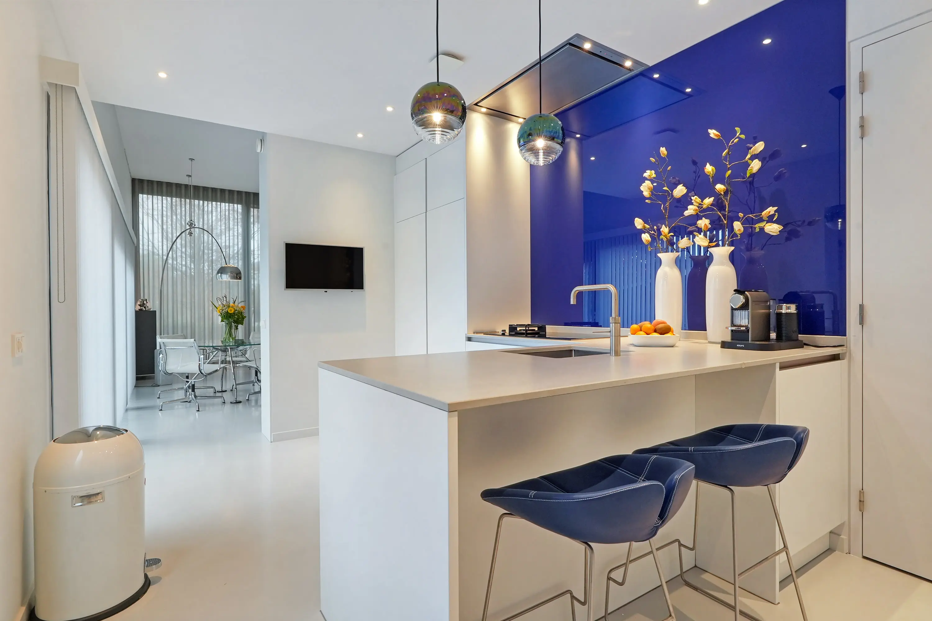 De Beda woonkeuken (Nederlandse maatwerkkeuken van topkwaliteit) vormt het stijlvolle hart van de woning en is een toonbeeld van eigentijds design. De keuken is uitgevoerd met een schiereiland met baropstelling. De greeploze, matwitte fronten zorgen voor een strak lijnenspel en worden gecombineerd met een doorlopend composiet werkblad van Dominicus dat rust en eenheid brengt in het geheel. Een echte blikvanger is de diepblauwe glazen achterwand achter de kookplaat, een gedurfd en elegant accent dat de ruimte een moderne en exclusieve uitstraling geeft. Het glas reflecteert het licht op subtiele wijze, wat bijdraagt aan de ruimtelijkheid en sfeer van de keuken. Een stijlvolle handdoekverwarmer voegt daarnaast een extra vleug comfort toe en benadrukt de hoogwaardige afwerking van de woonkeuken.