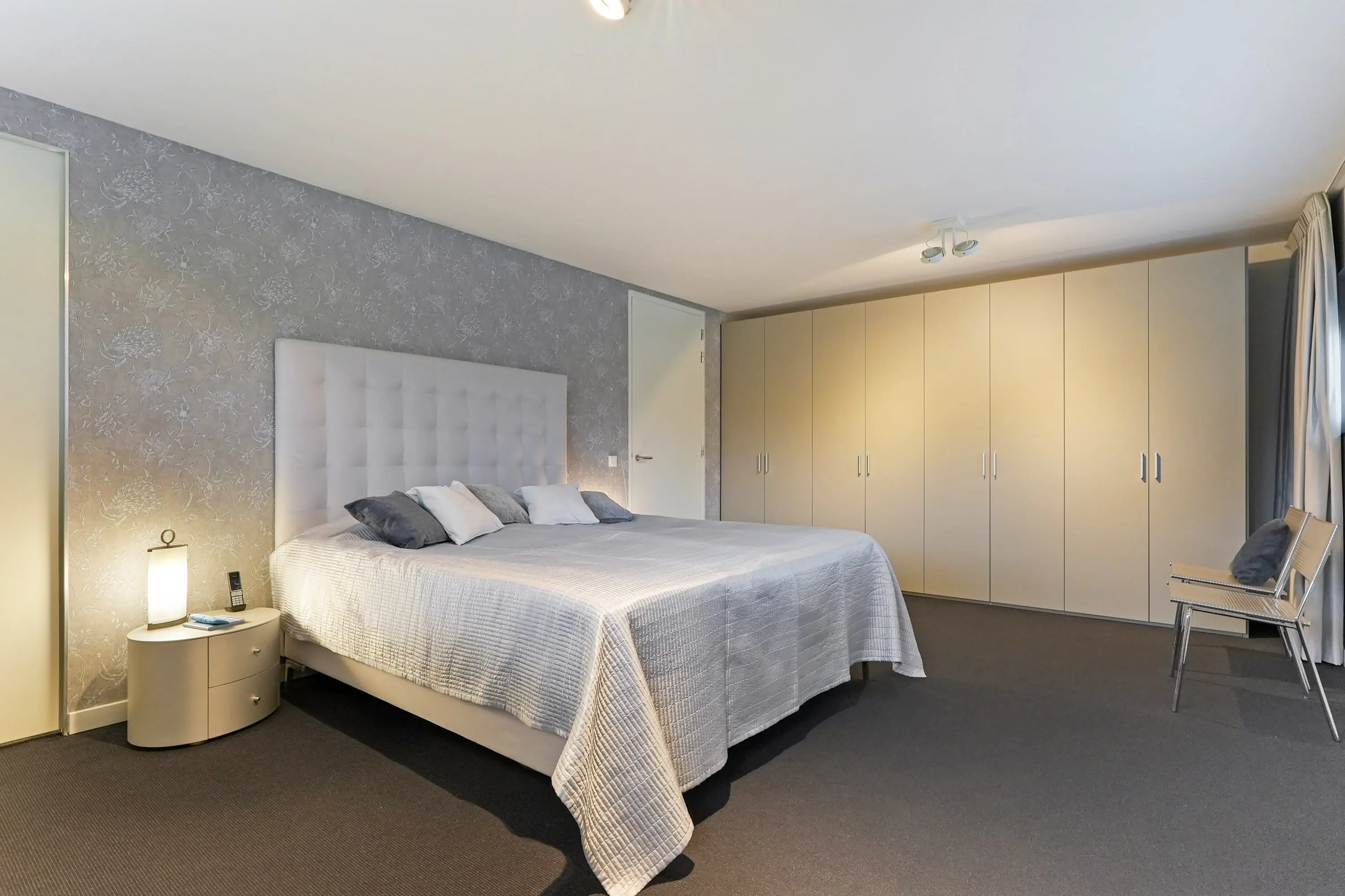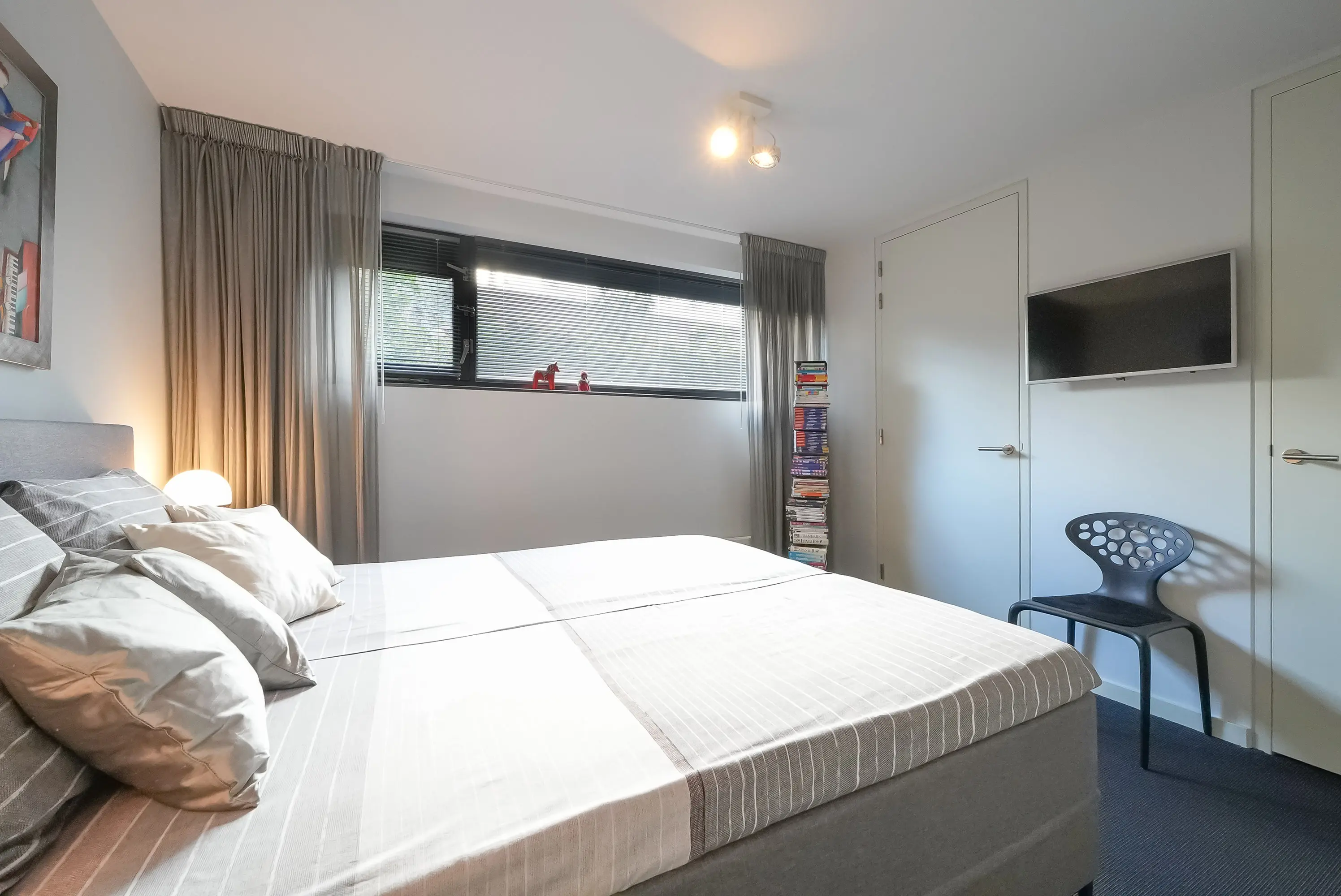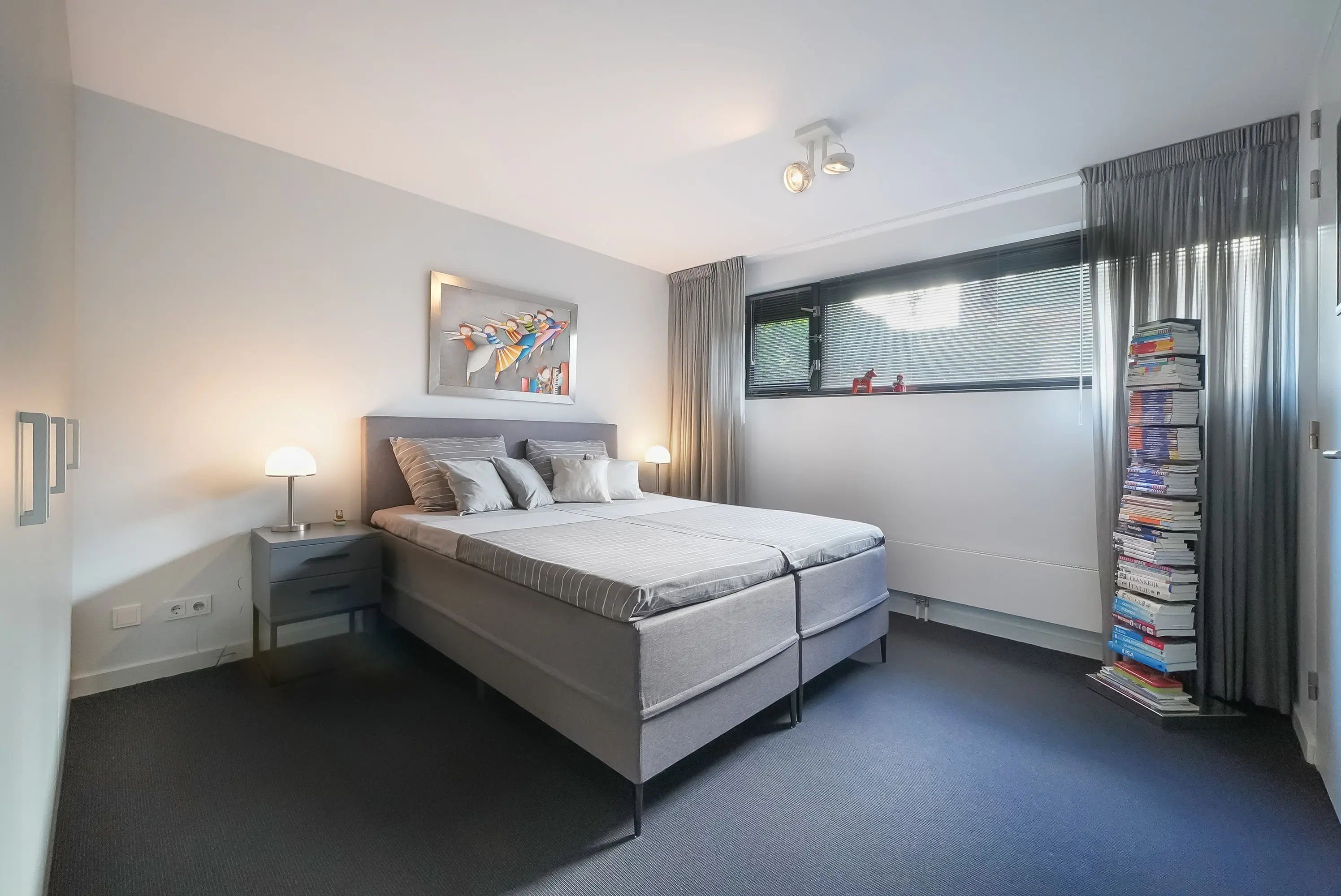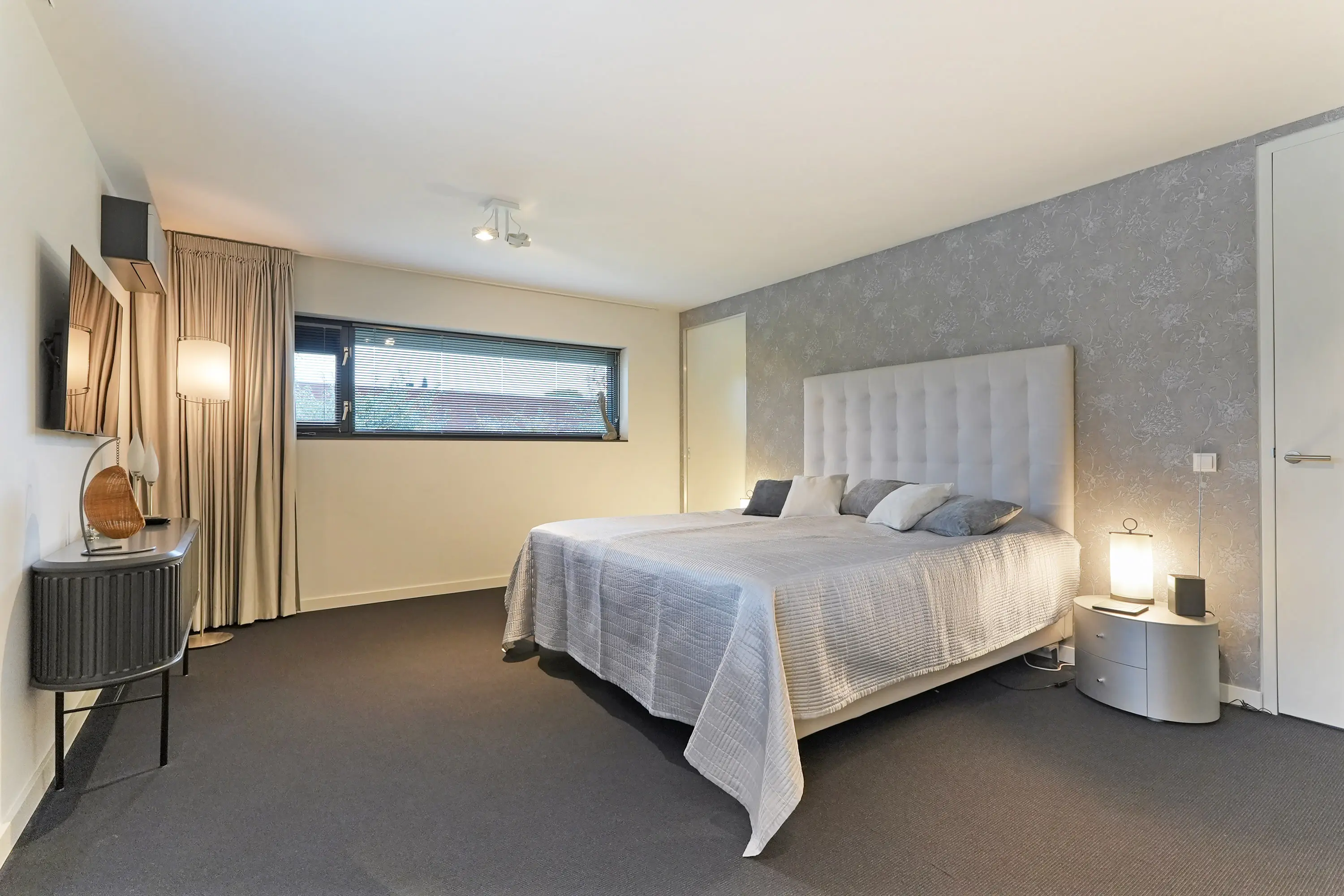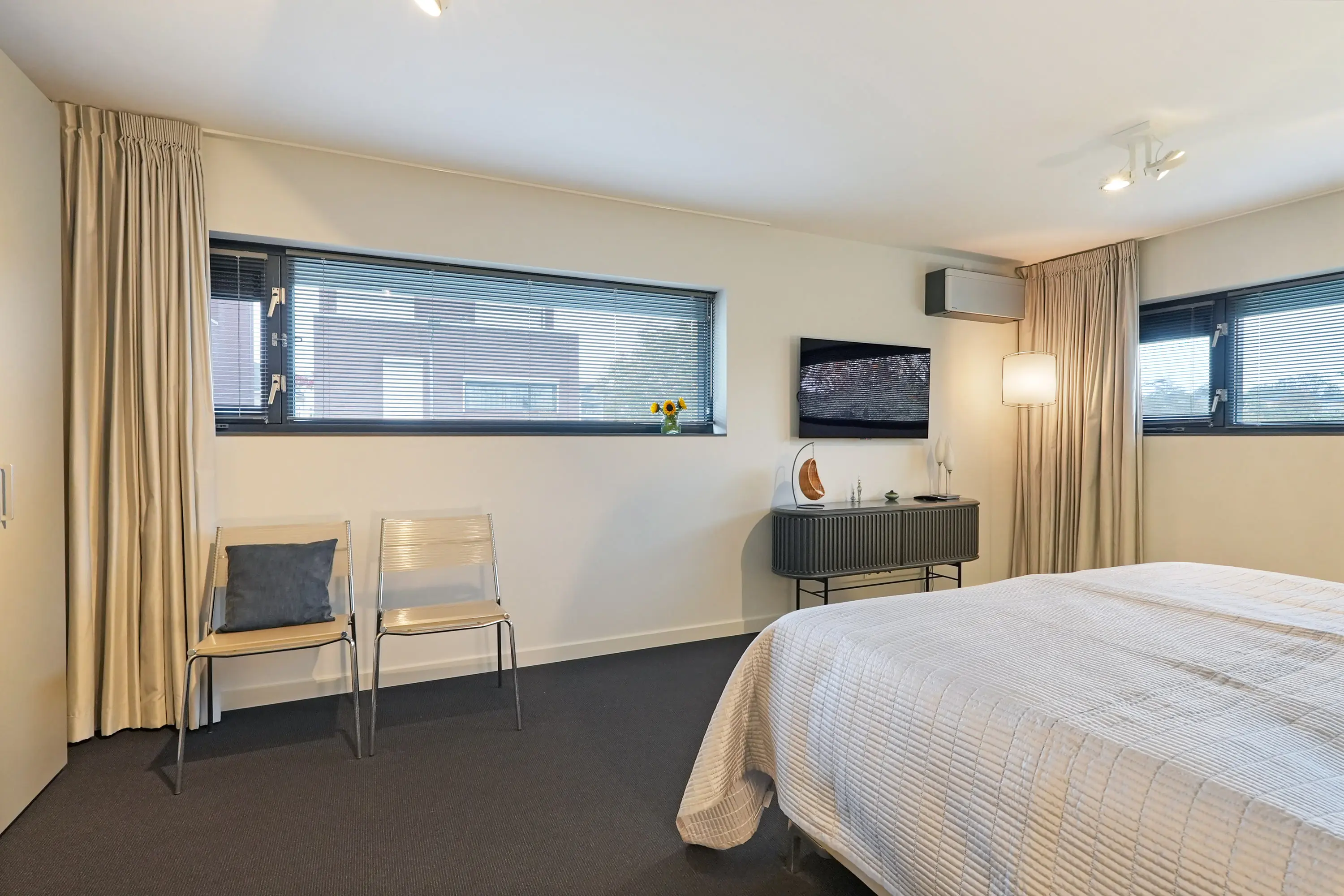 De woning kent een bijzonder aangename split-level indeling, die zorgt voor een speelse ruimtelijkheid en een natuurlijke scheiding tussen wonen, werken en ontspannen. Vanuit de hal leidt een halve trap omhoog naar het privégedeelte, waar de master bedroom met aangrenzende badkamer is gesitueerd. De master bedroom is een oase van rust, ontworpen met oog voor comfort en balans. De Italiaanse kledingkast zorgt voor een serene, opgeruimde uitstraling, terwijl de hoogwaardige materialen en ingetogen kleurstelling de sfeer van een luxe hotelkamer oproepen. De en-suite badkamer is stijlvol en modern ingericht met een Corian wastafelblad, een dubbel wastafelmeubel, Grohe inbouwkranen en een royale inloopdouche met regendouche. Alles ademt kwaliteit en verfijning, van de materiaalkeuze tot de detaillering. Een halve trap naar beneden leidt naar een tweede woonniveau met een lichte werkruimte, ideaal als thuiswerkplek of atelier. Aangrenzend bevindt zich een comfortabele gastenkamer met walk-in closet en een tweede badkamer, voorzien van een douche, wastafelmeubel en tweede toilet. Deze verdieping biedt volop privacy voor gasten of familie en maakt de woning bovendien uiterst flexibel in gebruik, of het nu gaat om logeren, werken of ontspannen.