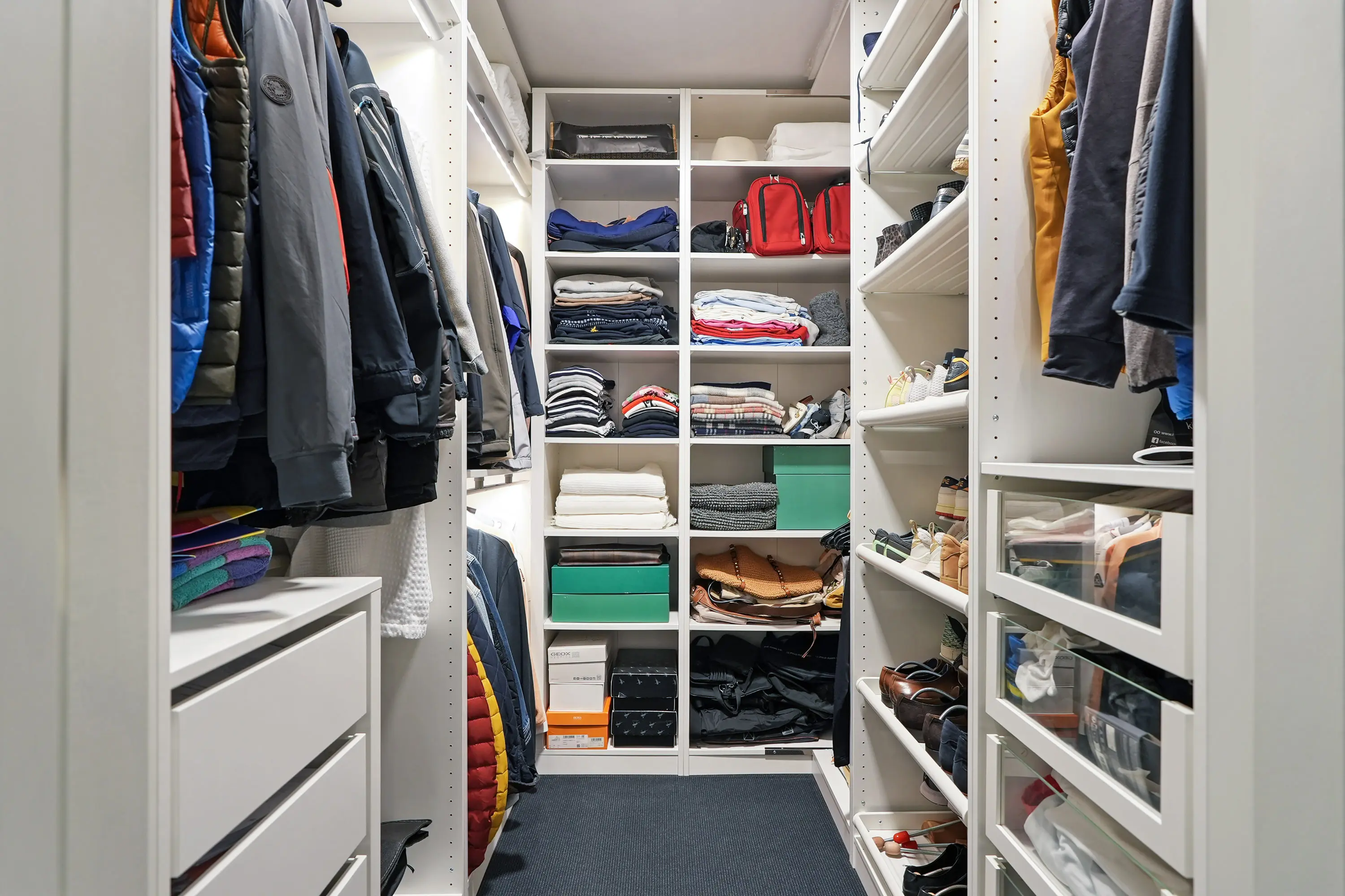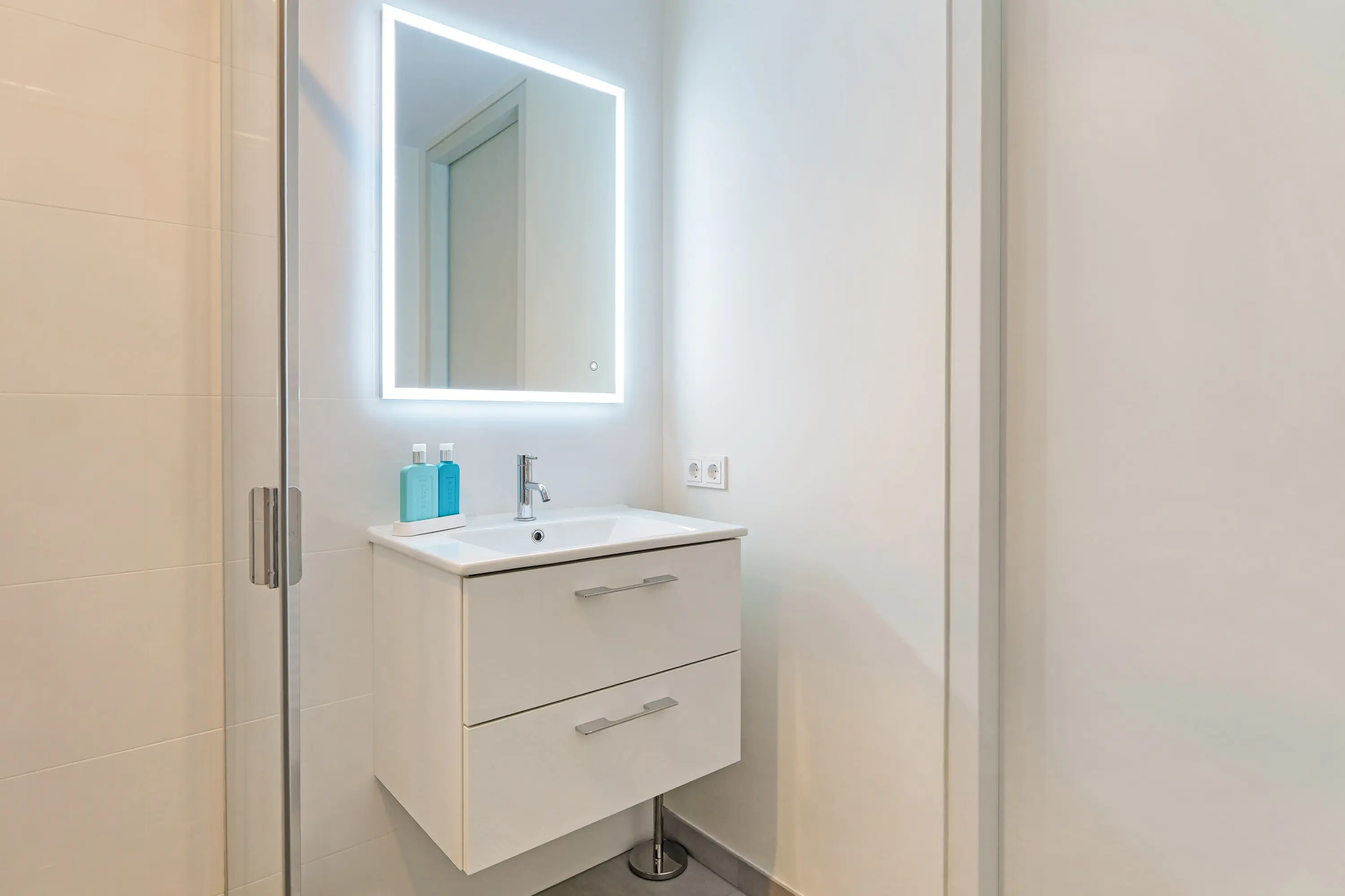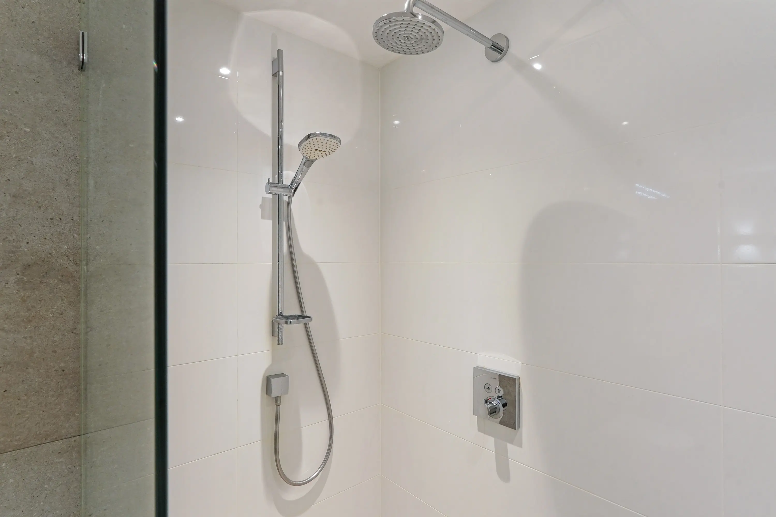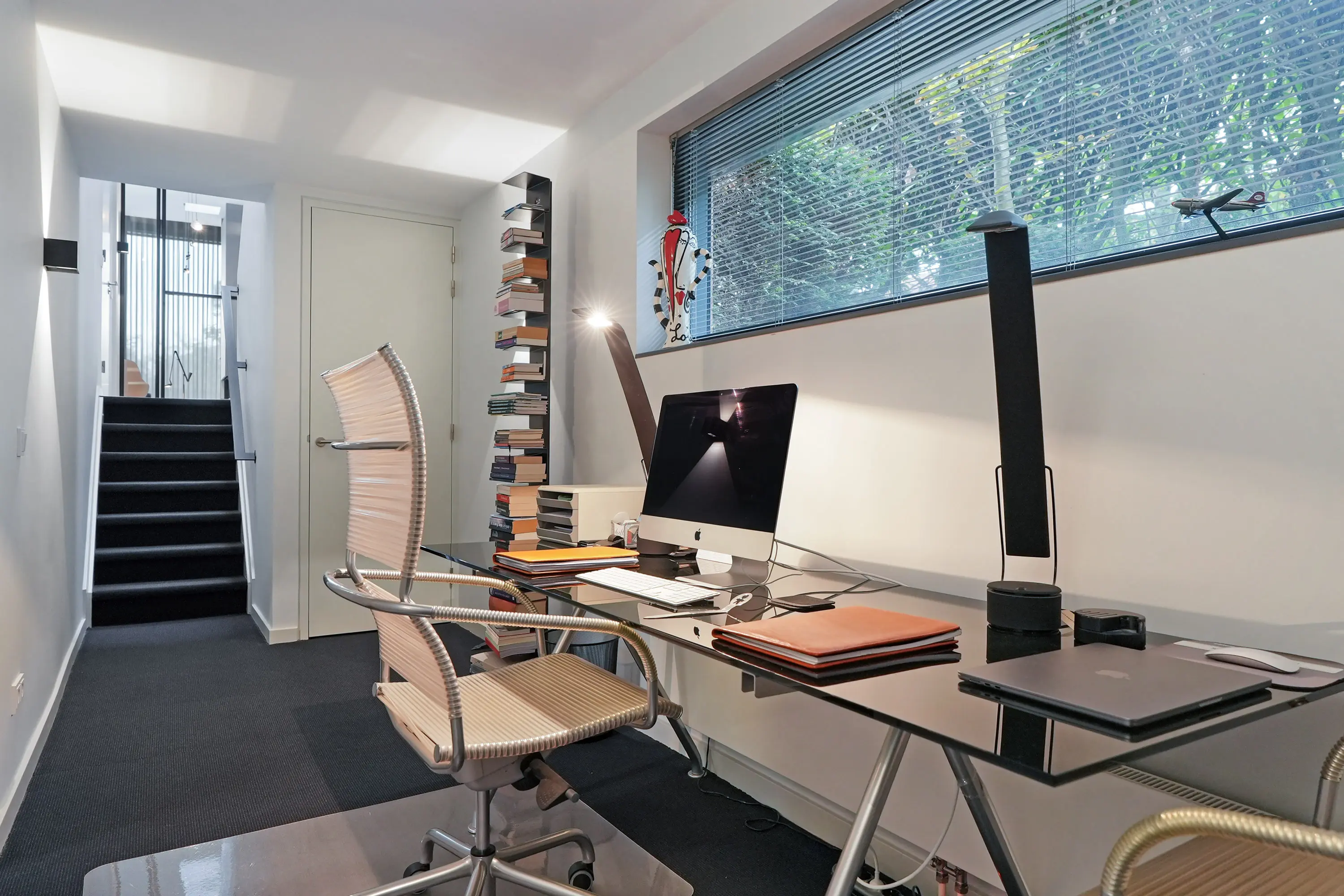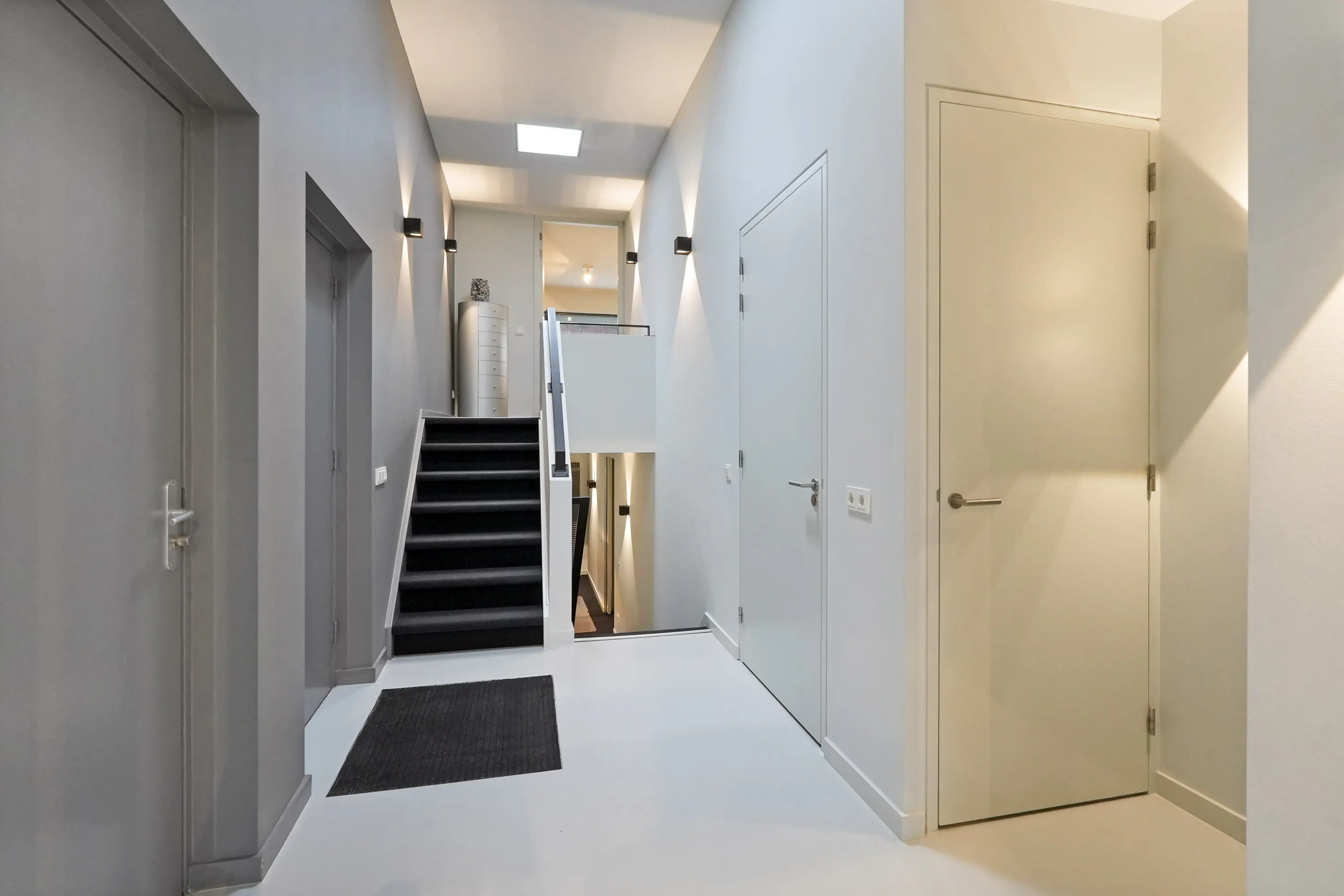De woning kent een bijzonder aangename split-level indeling, die zorgt voor een speelse ruimtelijkheid en een natuurlijke scheiding tussen wonen, werken en ontspannen. Vanuit de hal leidt een halve trap omhoog naar het privégedeelte, waar de master bedroom met aangrenzende badkamer is gesitueerd. De master bedroom is een oase van rust, ontworpen met oog voor comfort en balans. De Italiaanse kledingkast zorgt voor een serene, opgeruimde uitstraling, terwijl de hoogwaardige materialen en ingetogen kleurstelling de sfeer van een luxe hotelkamer oproepen. De en-suite badkamer is stijlvol en modern ingericht met een Corian wastafelblad, een dubbel wastafelmeubel, Grohe inbouwkranen en een royale inloopdouche met regendouche. Alles ademt kwaliteit en verfijning, van de materiaalkeuze tot de detaillering. Een halve trap naar beneden leidt naar een tweede woonniveau met een lichte werkruimte, ideaal als thuiswerkplek of atelier. Aangrenzend bevindt zich een comfortabele gastenkamer met walk-in closet en een tweede badkamer, voorzien van een douche, wastafelmeubel en tweede toilet. Deze verdieping biedt volop privacy voor gasten of familie en maakt de woning bovendien uiterst flexibel in gebruik, of het nu gaat om logeren, werken of ontspannen.