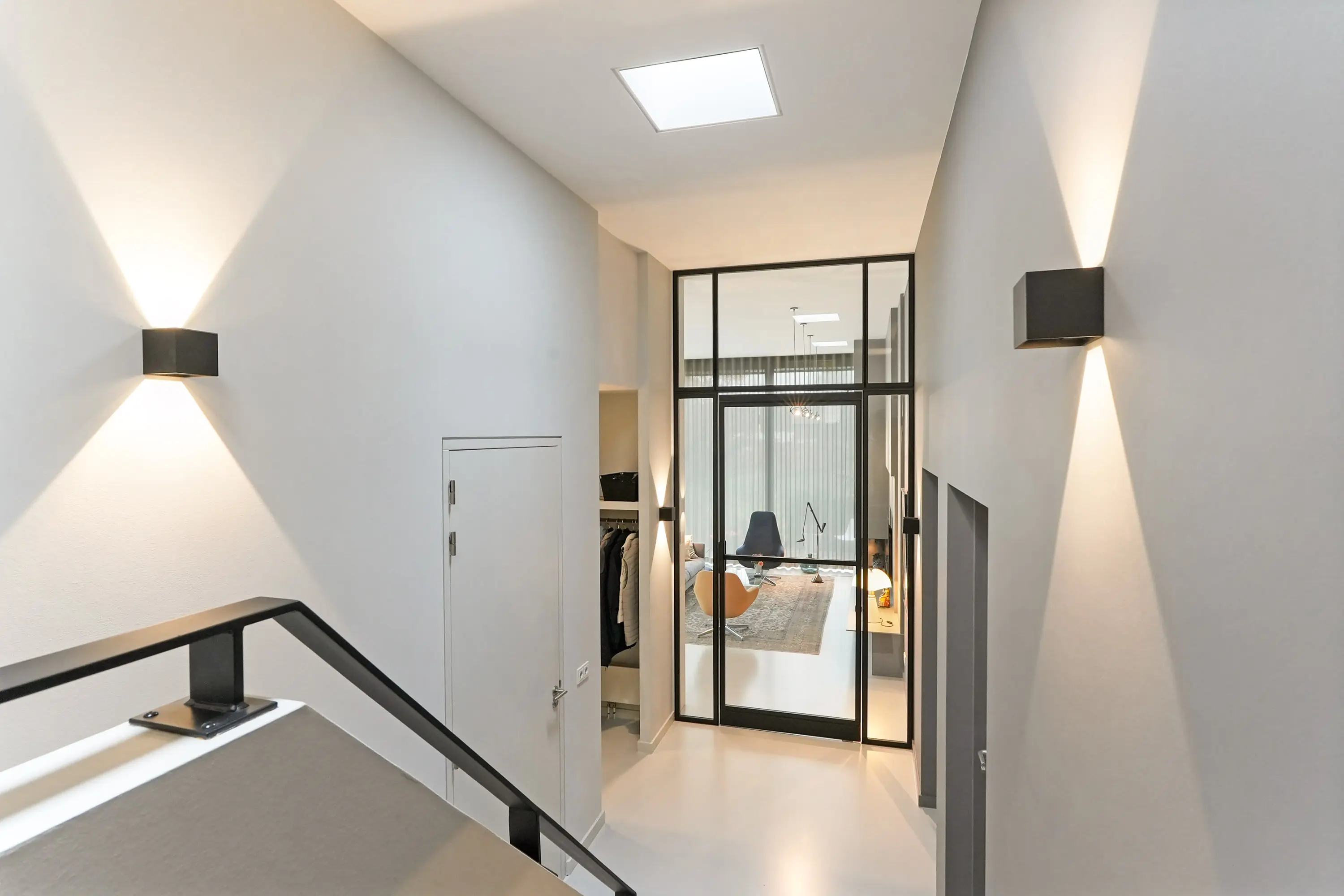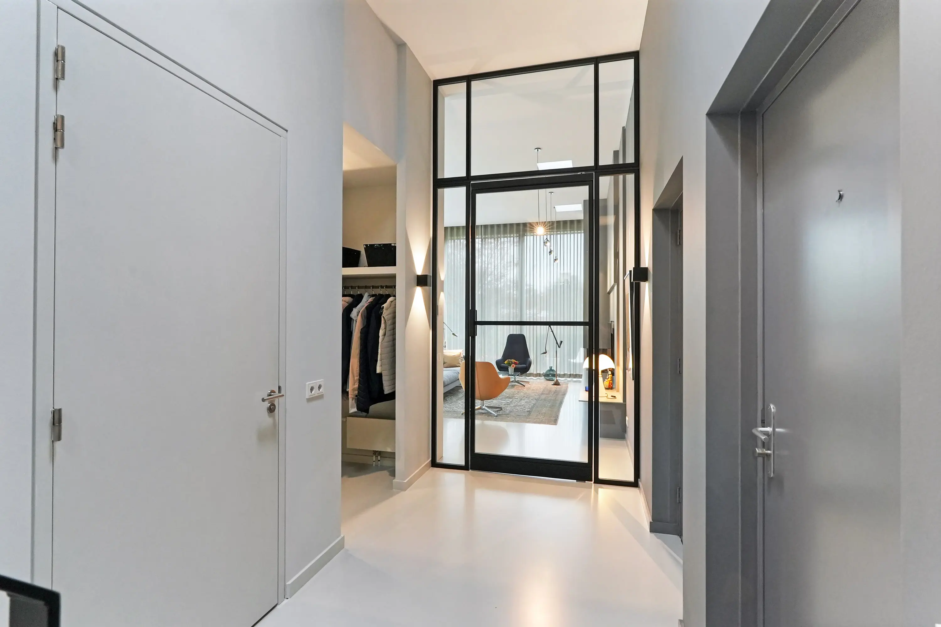 De entree met garderobe en modern toilet zet direct de toon: strak vormgegeven, doordacht ingedeeld en met oog voor detail. Een luxe stalen taatsdeur met bijpassend raamwerk vormt een stijlvol architectonisch statement en zorgt voor een prachtige lichtinval in de hal. Twee strategisch geplaatste lichtkoepels versterken dit effect, waardoor de hal een bijzonder ruimtelijke en uitnodigende sfeer krijgt. Samen met de hoge raampartijen en de open zichtlijnen ontstaat een aangename overgang naar de woonkamer, waarin licht en ruimte centraal staan.