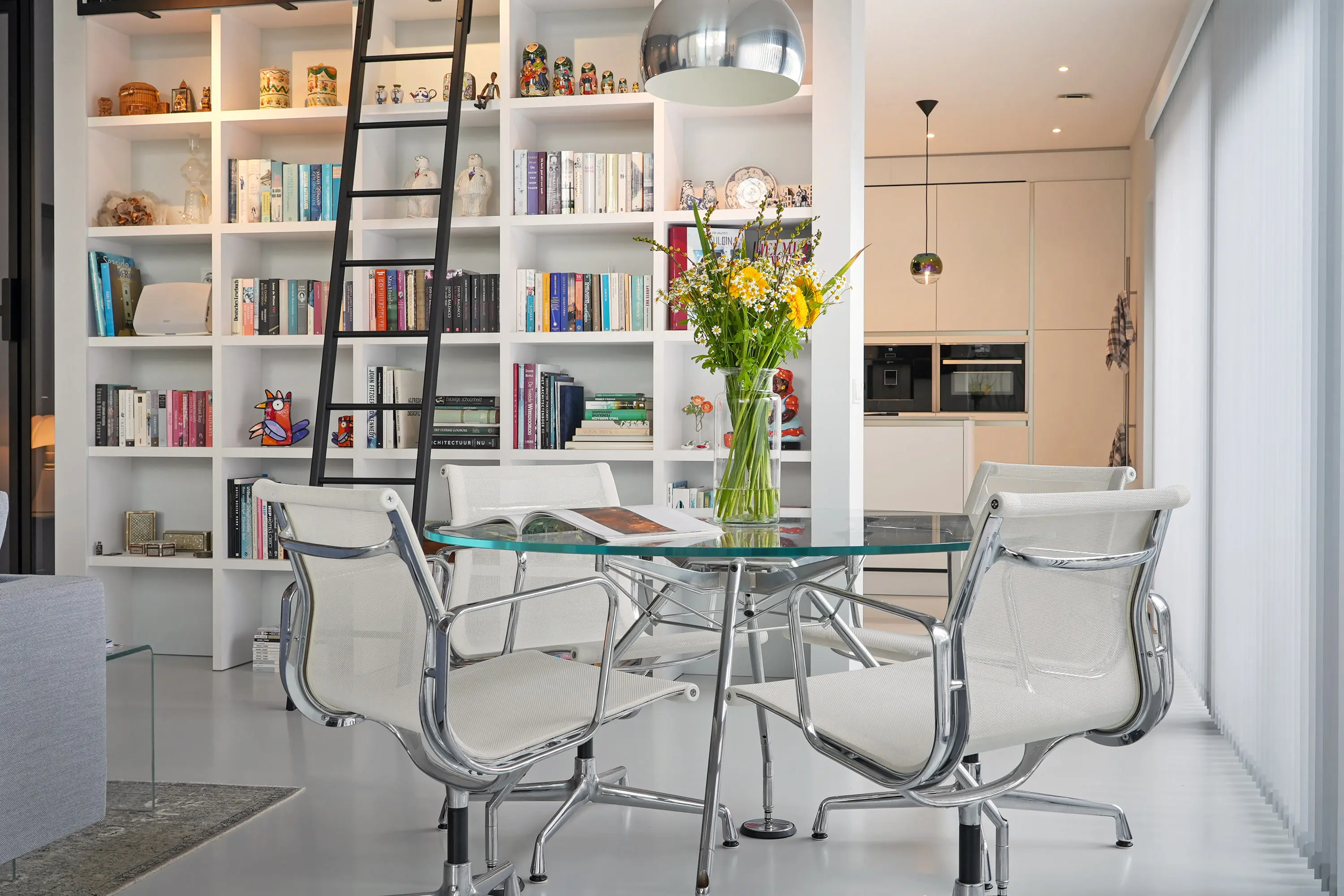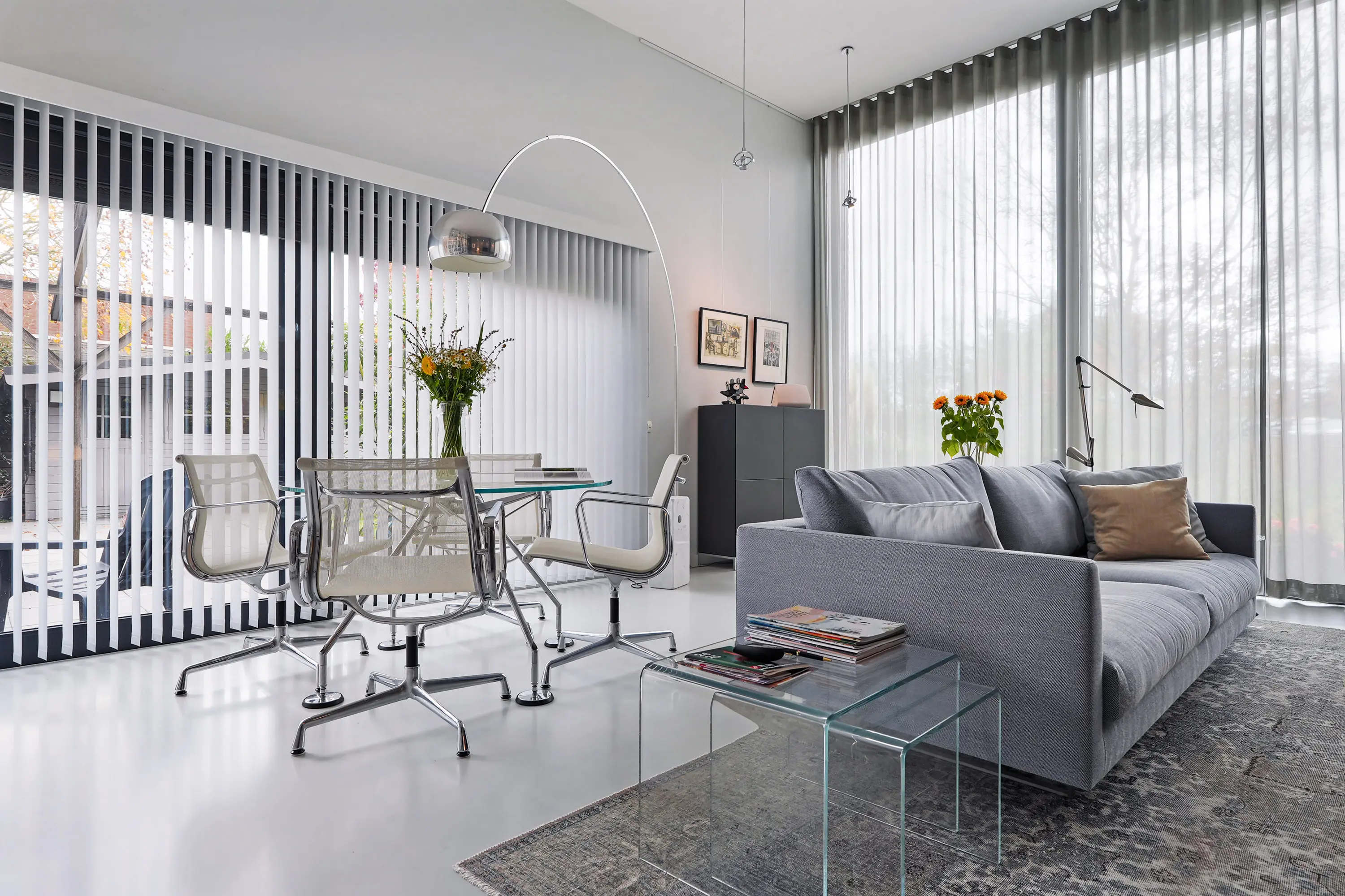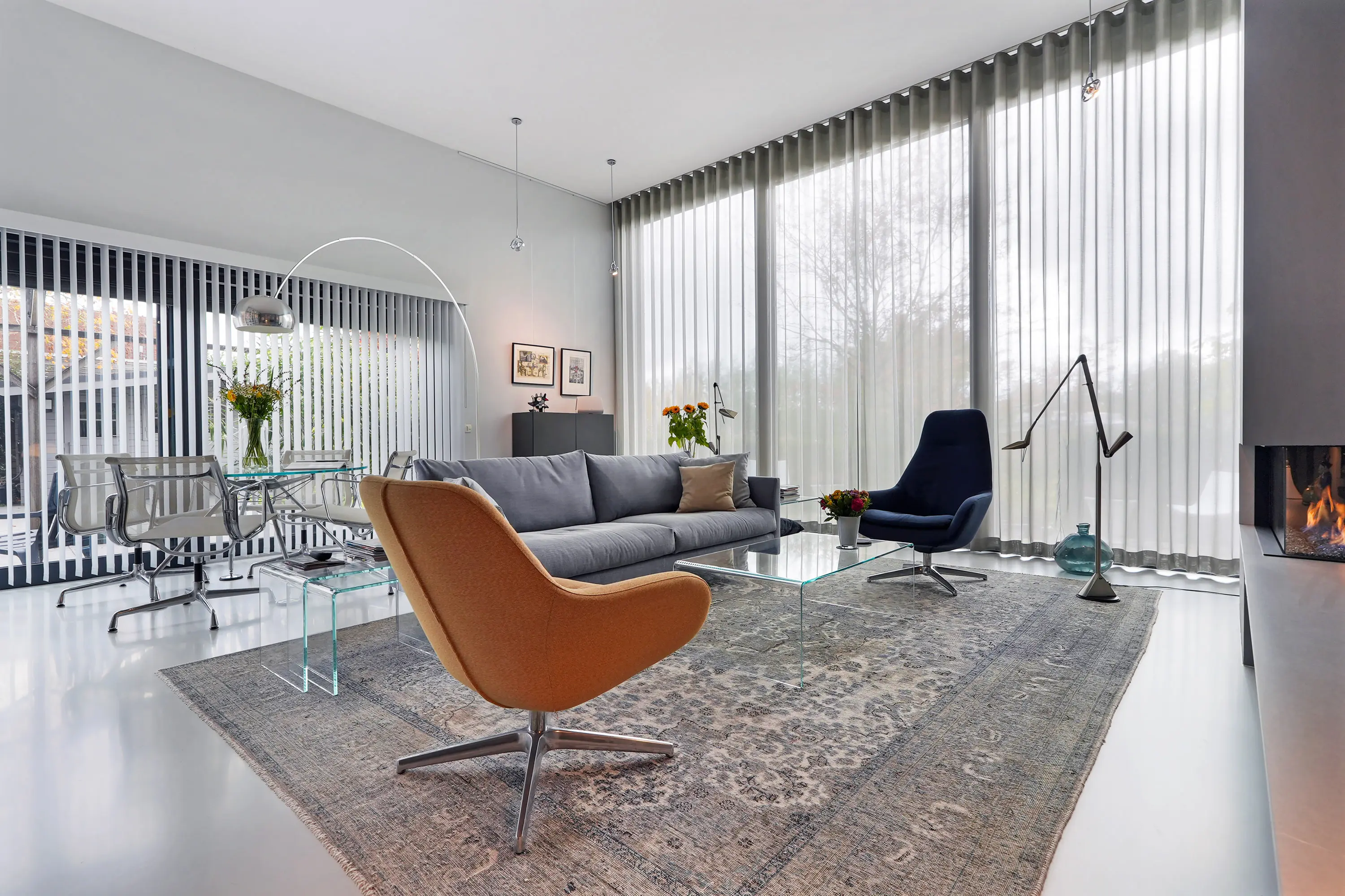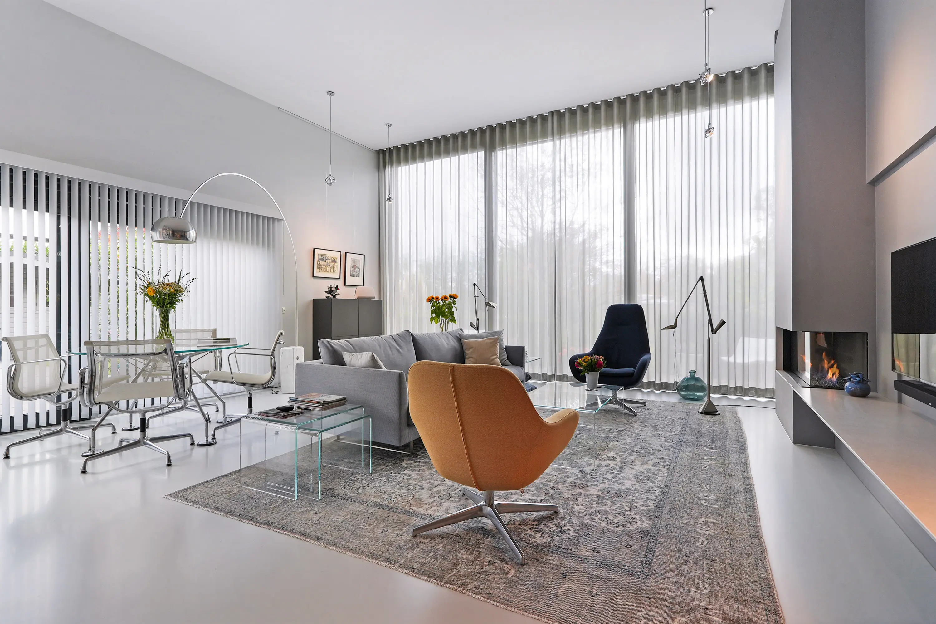De royale woonkamer is één van de absolute blikvangers van de woning. Door de speelse indeling en de indrukwekkende plafondhoogte ademt de ruimte een gevoel van grandeur en luxe. Het overvloedige daglicht accentueert de strakke lijnen en hoogwaardige afwerking, terwijl de zichtlijnen naar de tuin en het water zorgen voor een voortdurend gevoel van verbinding met buiten.
