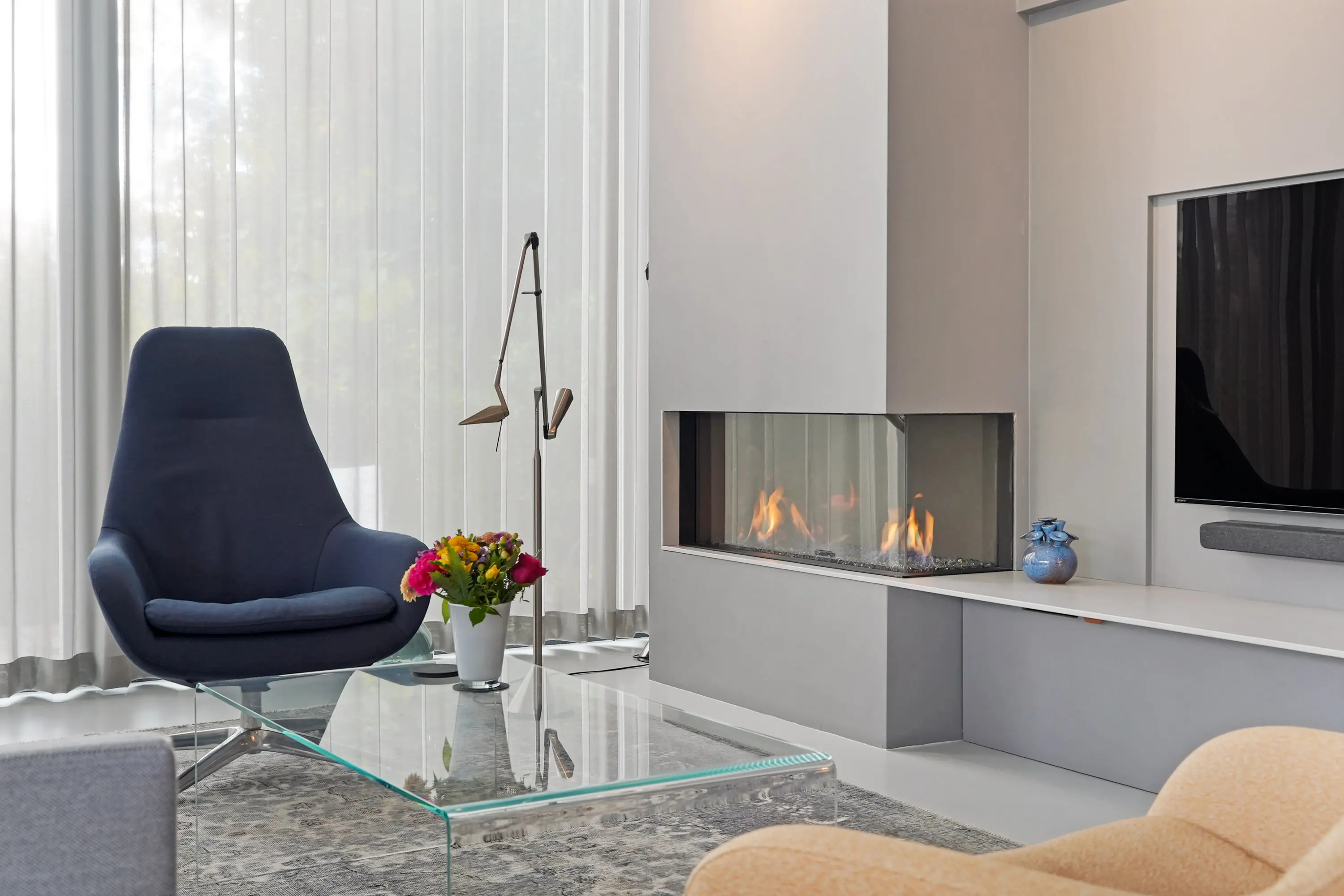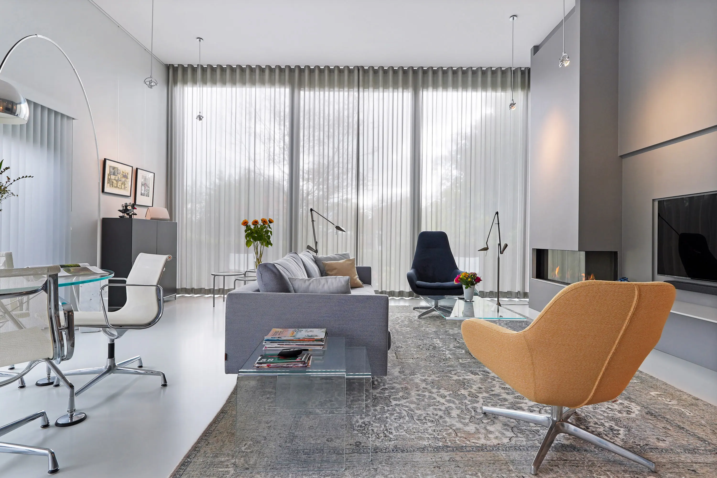 De afwerking is van hoog niveau, met een PU-gietvloer (Senzo Vloeren Amsterdam), vloerverwarming (woonkamer en keuken) en maatwerk van Meesters in Hout, waaronder een stijlvolle boekenkast, verfijnde wanddetails en de stalen taatsdeur en stalen leuningen. Een DRU-gashaard met in het verlengde een composiet blad vormt het hart van de zithoek en geeft de ruimte warmte en elegantie.