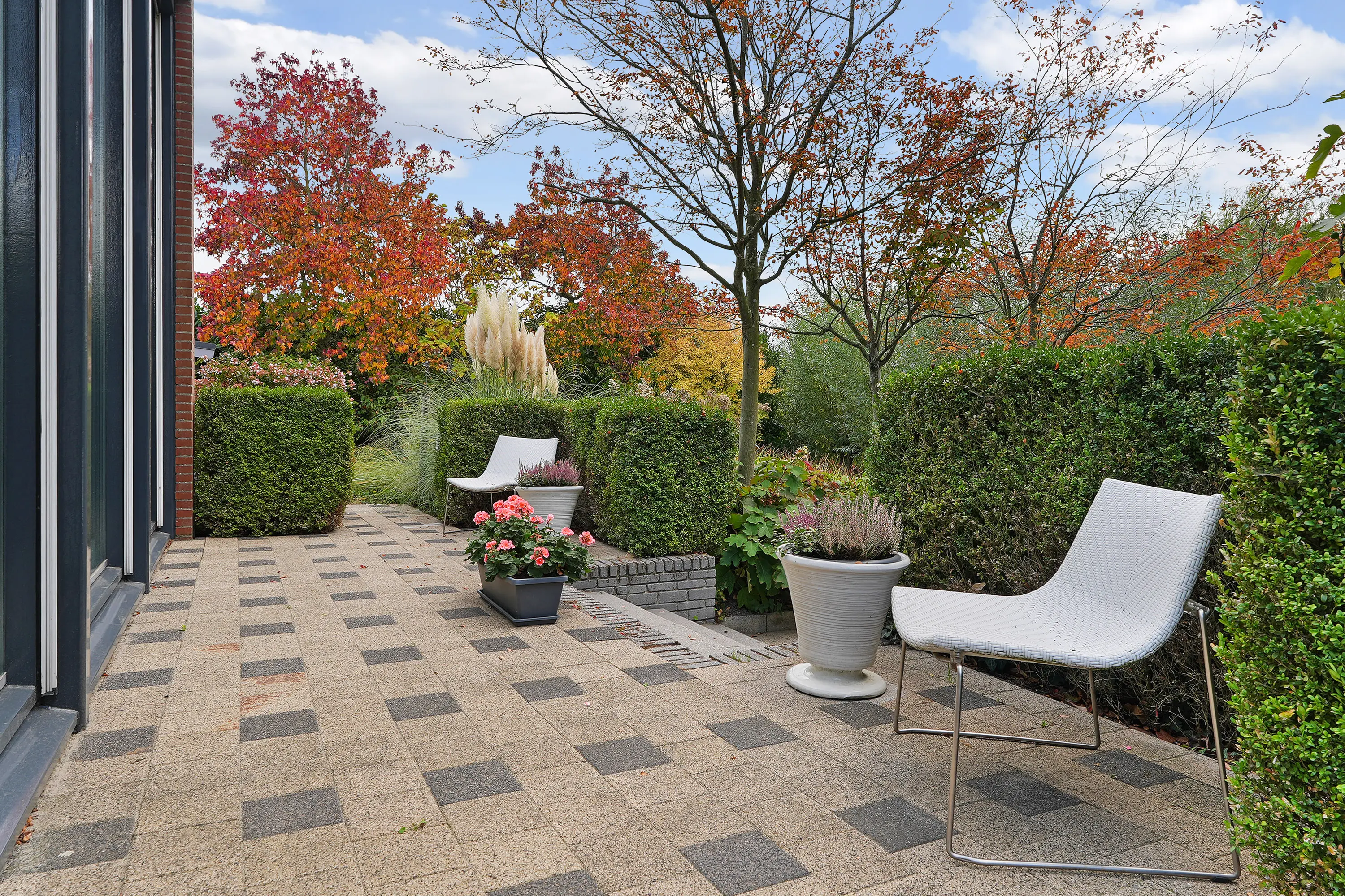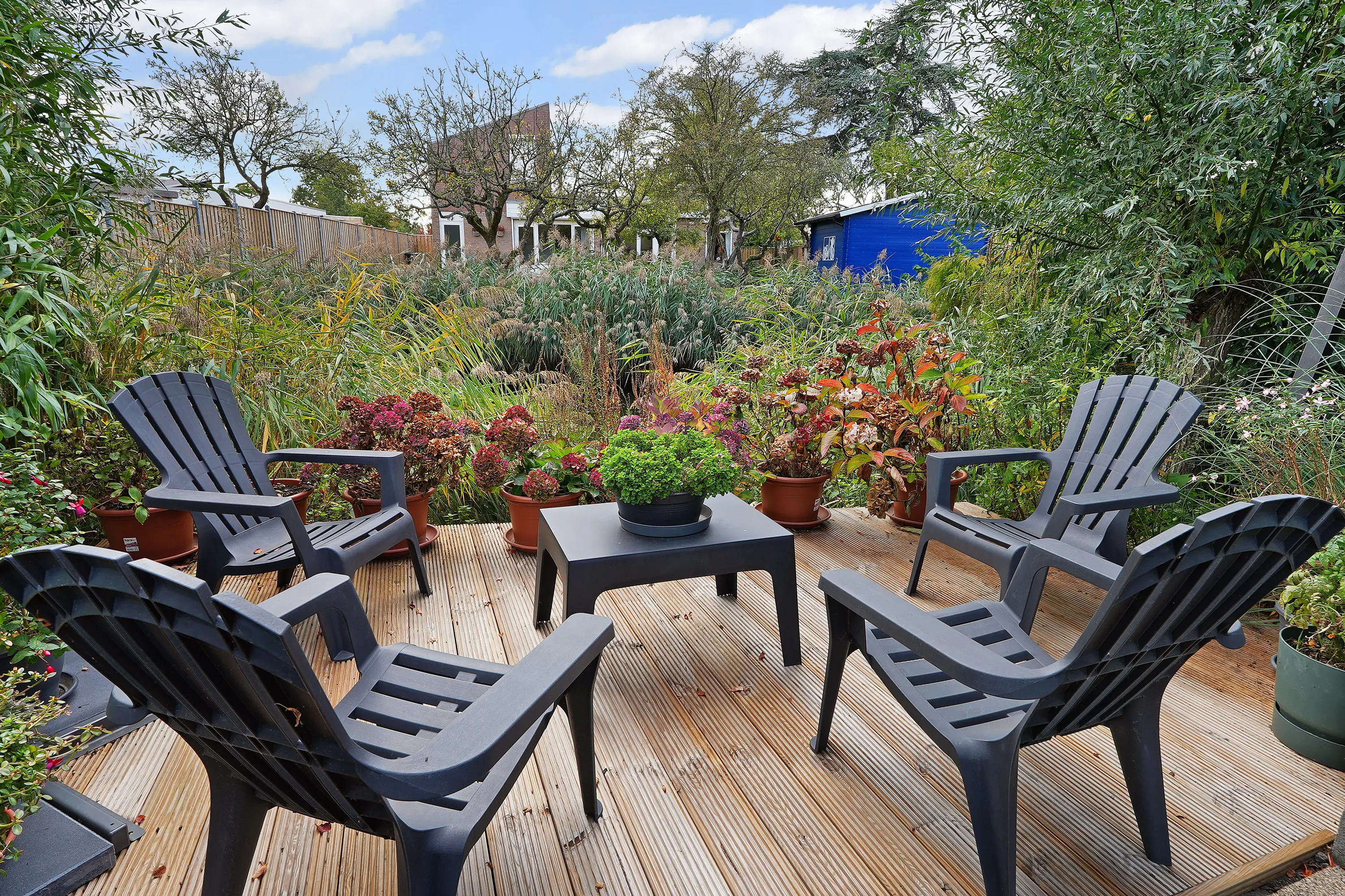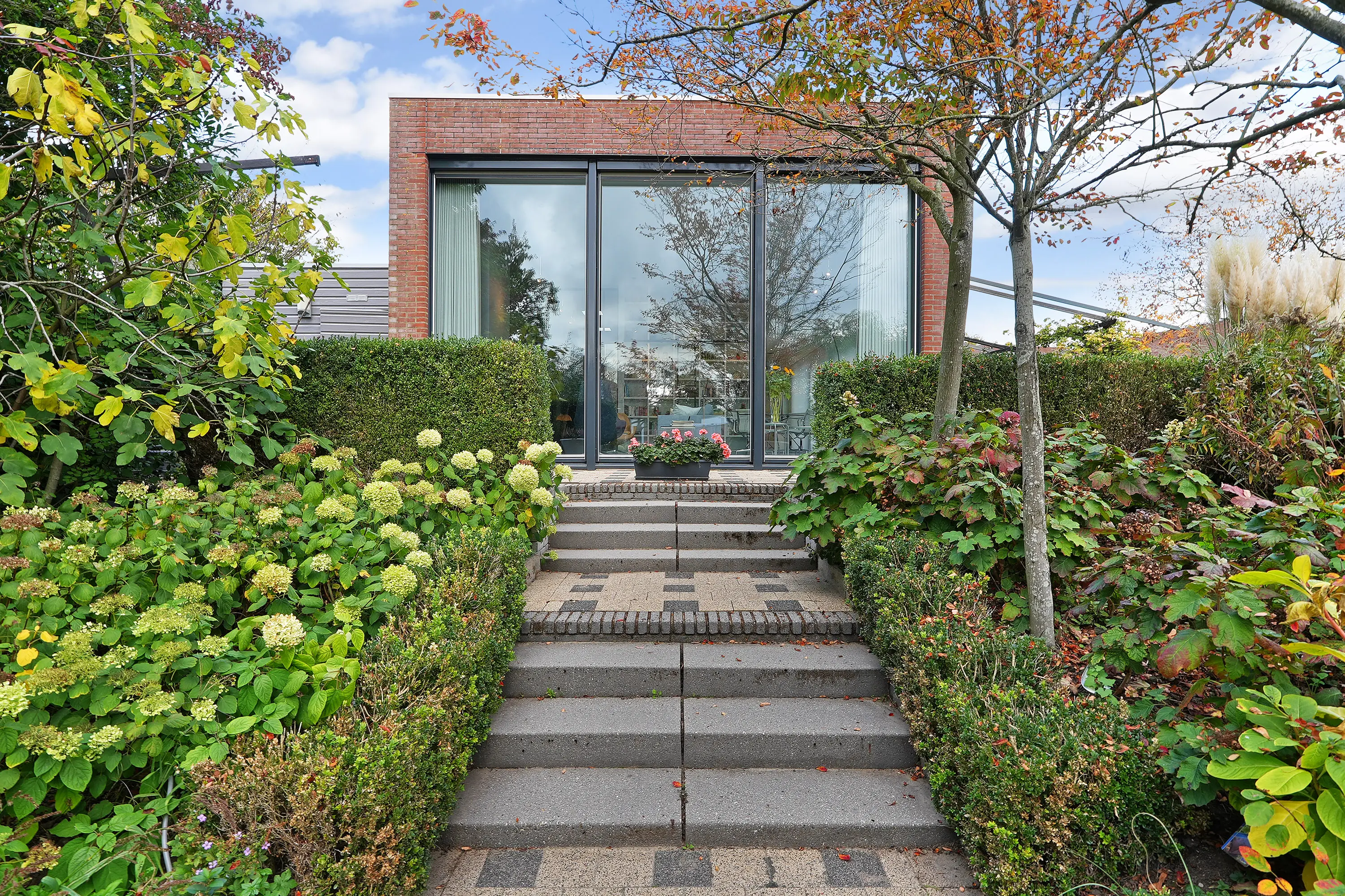 De tuin, ontworpen en aangelegd door Jan Pouwelse Groendoeners, vormt een harmonieuze verlenging van het interieur en past perfect bij de architectuur van de woning. Het perceel van 860 m² is fraai ingericht met volwassen beplanting, een verzorgd gazon en meerdere zonneterrassen die uitnodigen tot ontspannen en buitenleven. Aan de waterzijde bevindt zich een houten vlonder (2023), een heerlijke plek om in alle rust te genieten van het uitzicht en de zon. De tuin biedt optimale privacy en een aangename balans tussen openheid en geborgenheid.