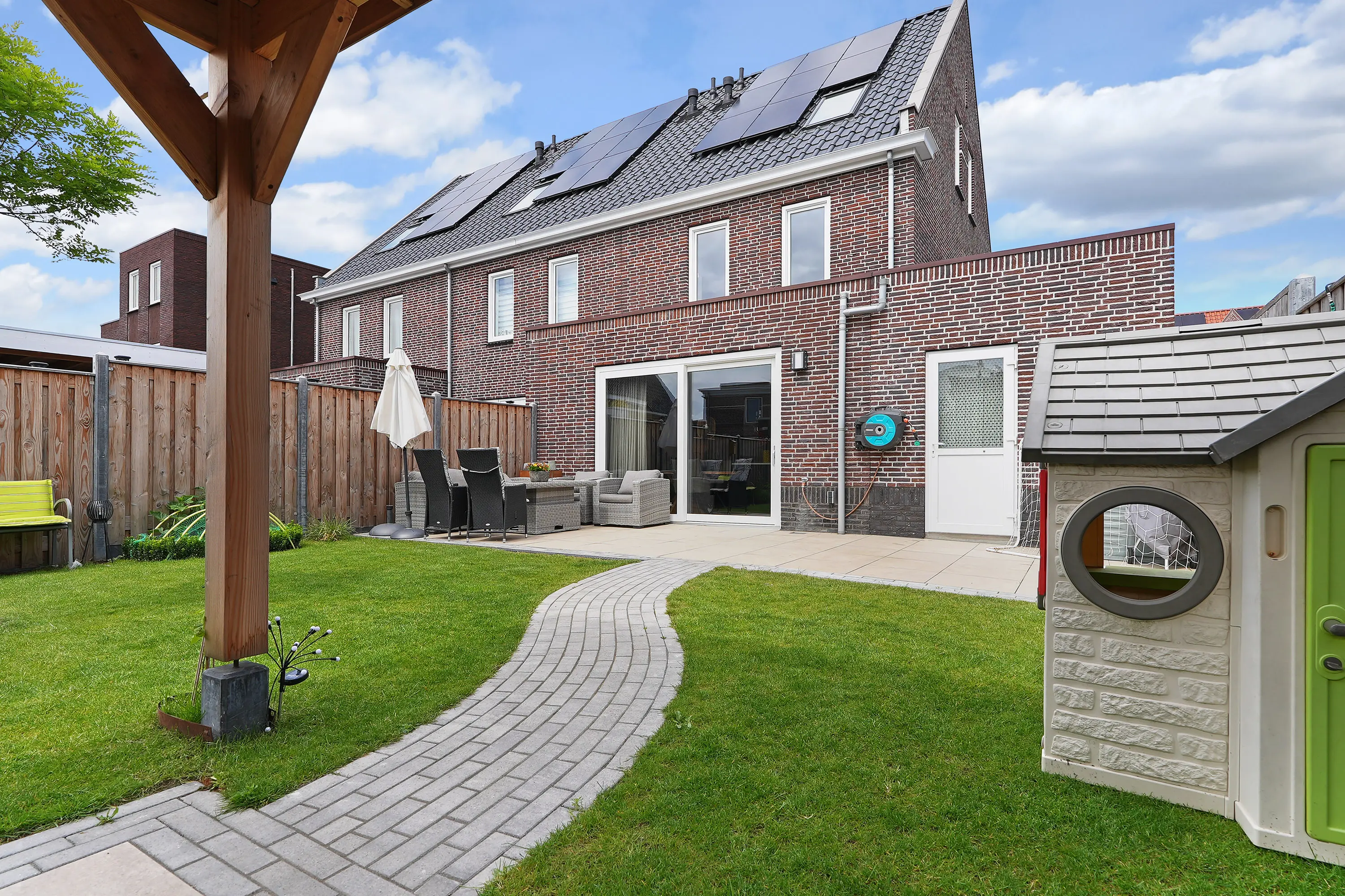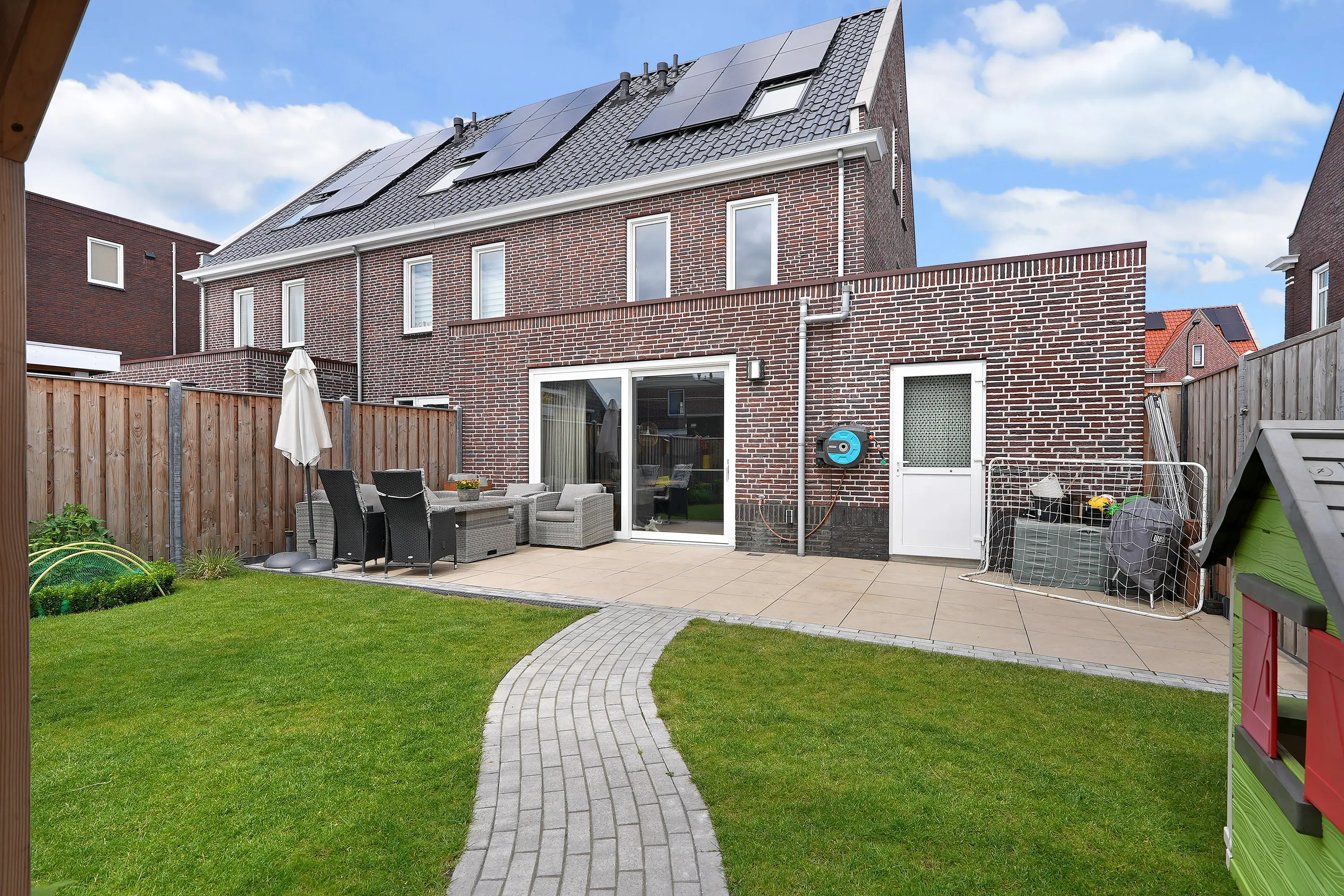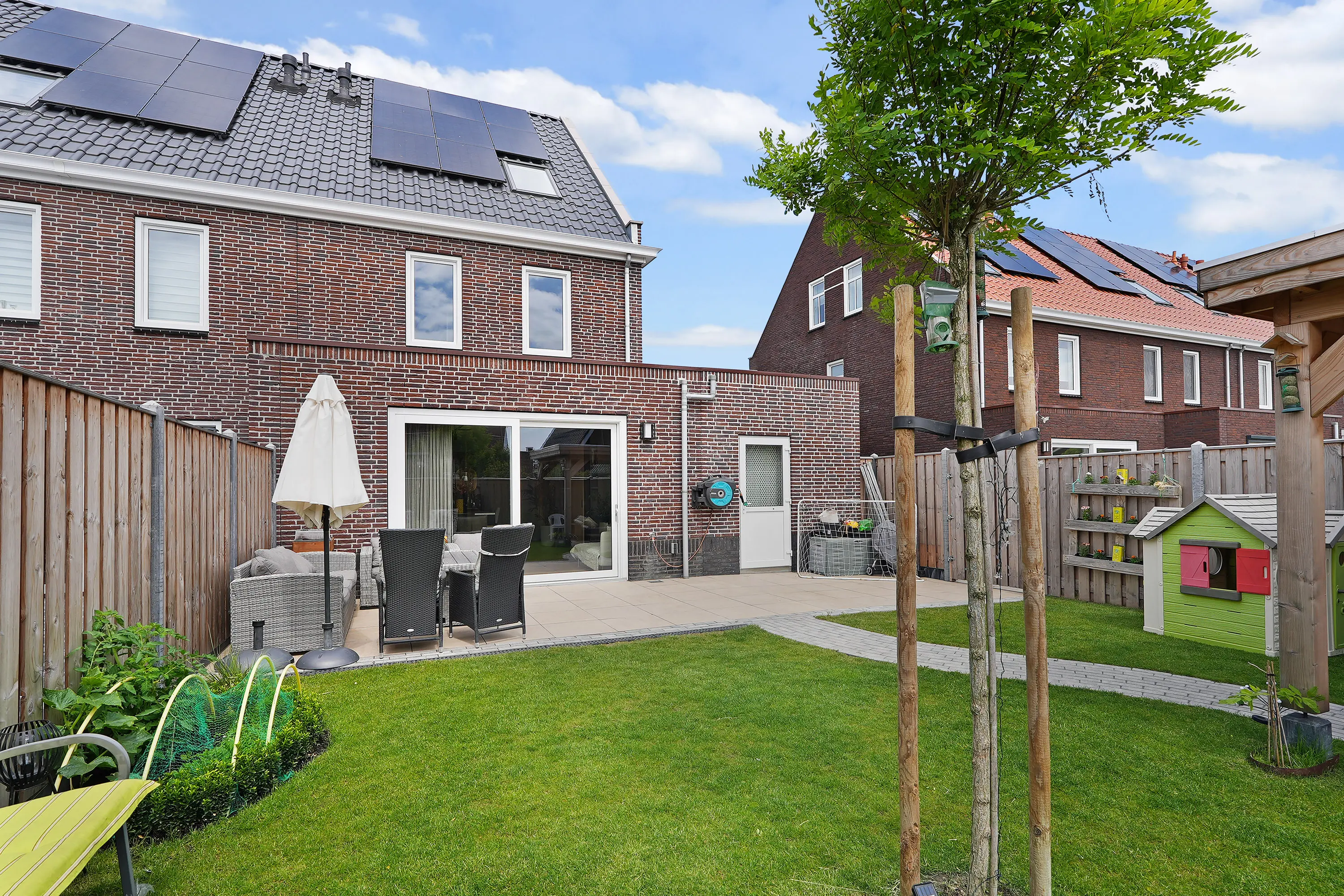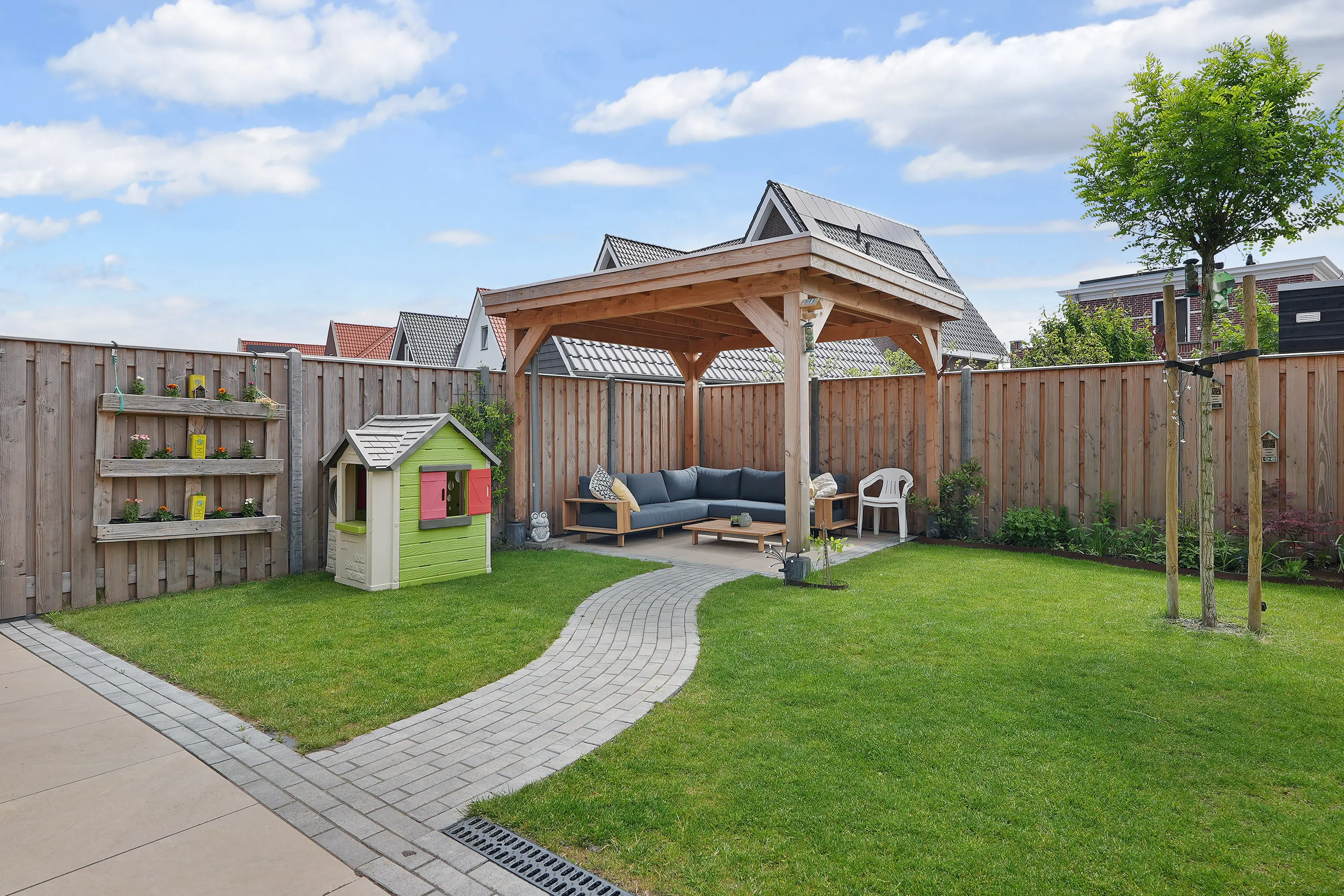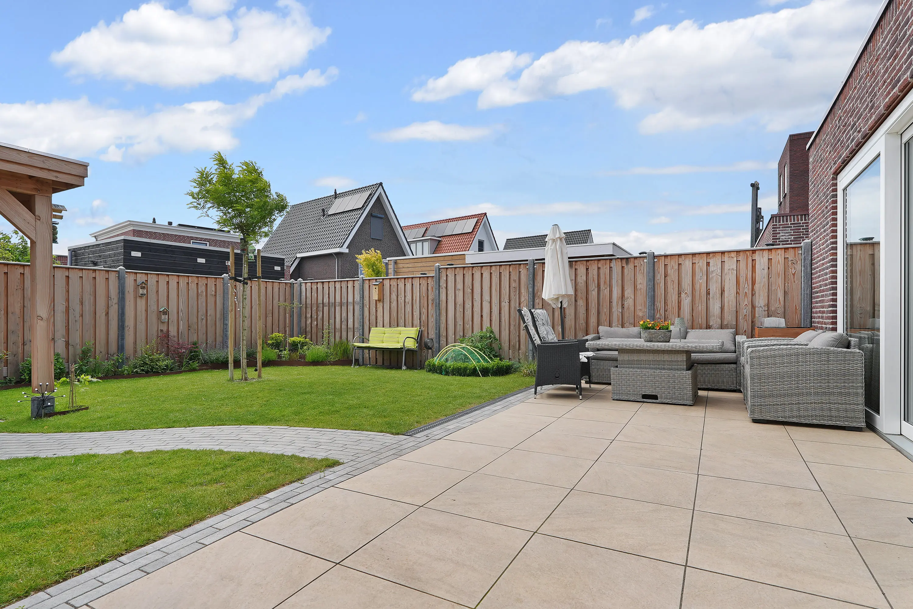 De volledig aangelegde tuin op het zuiden biedt veel privacy dankzij de laagbouw achter de woning. Direct aan de achtergevel bevindt zich een ruim terras, terwijl achterin de tuin een gazon ligt met een pad naar de gezellige terrasoverkapping. De tuin beschikt bovendien over een vrije achterom.