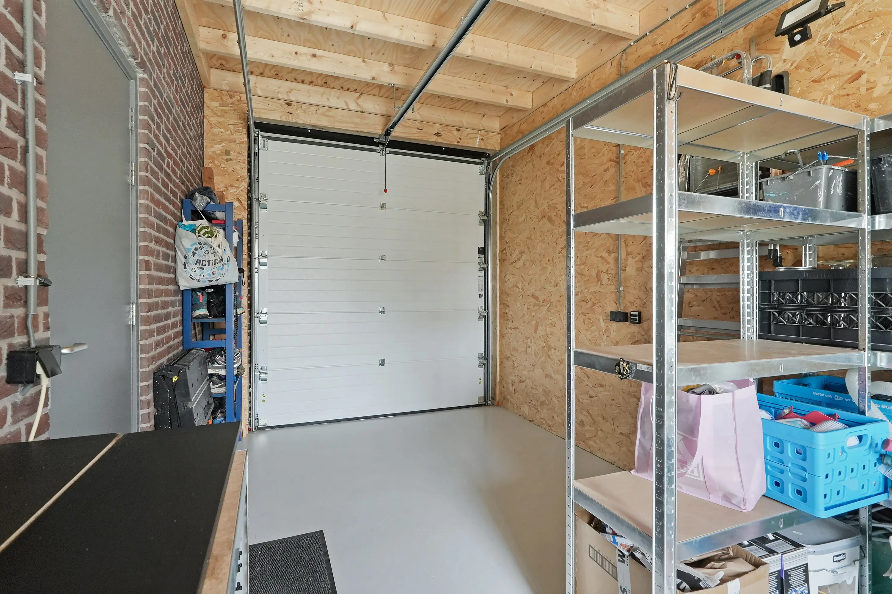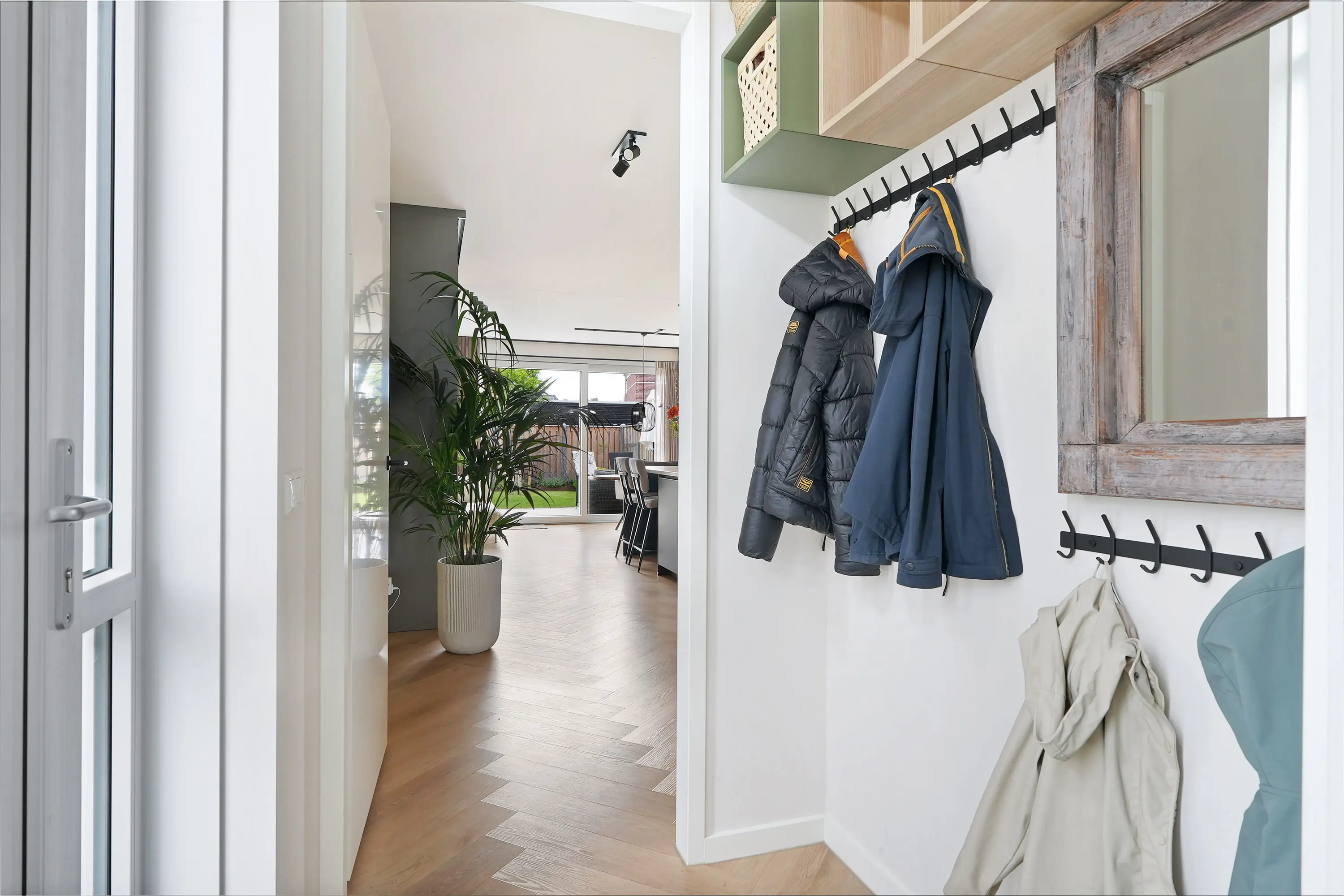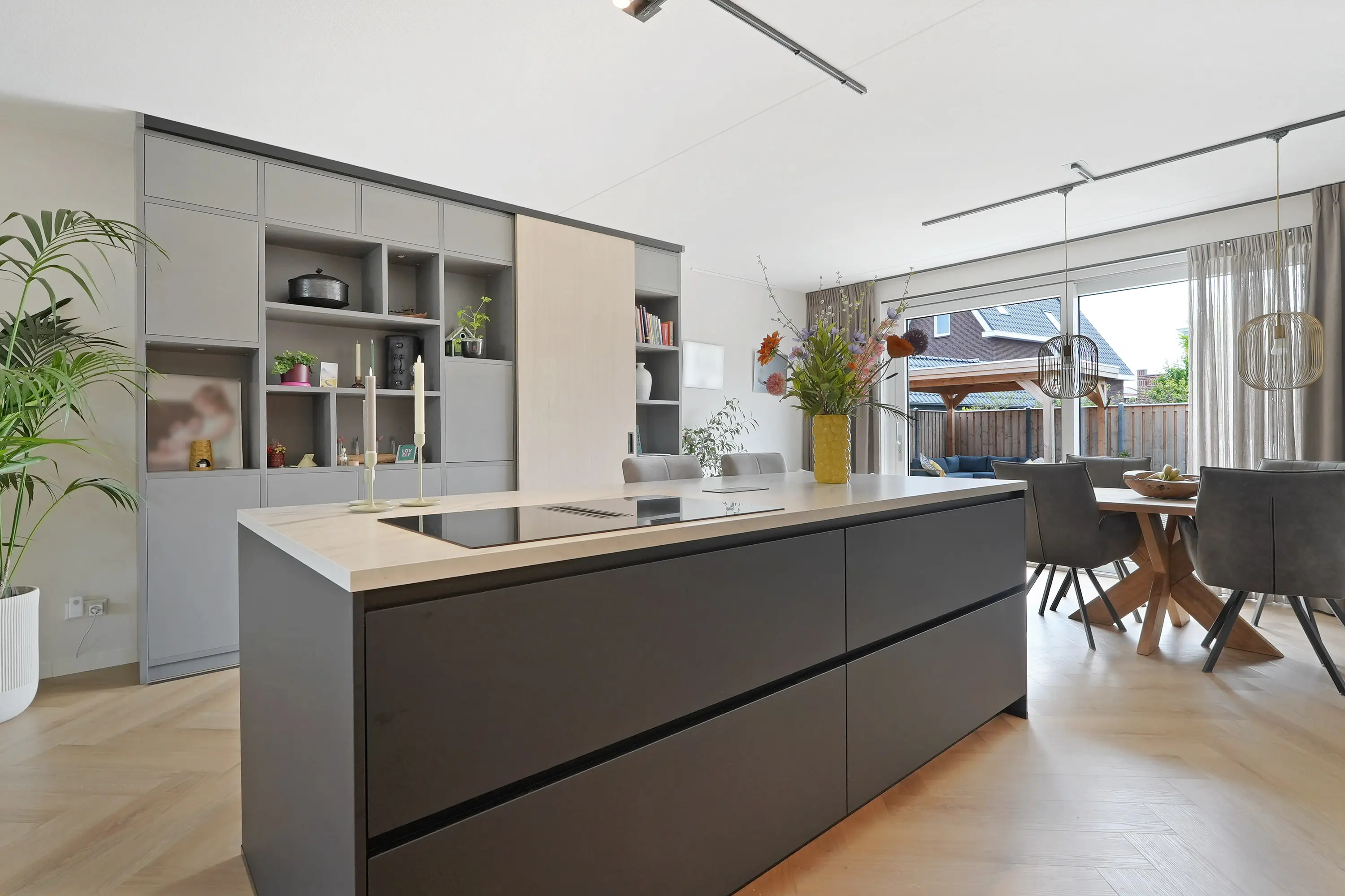 Een stijlvolle kastenwand tegenover de keuken zorgt niet alleen voor extra opbergruimte, maar biedt tevens een praktische, inpandige doorgang naar de aangebouwde garage. Dit maakt de woning extra functioneel en bijzonder aantrekkelijk.