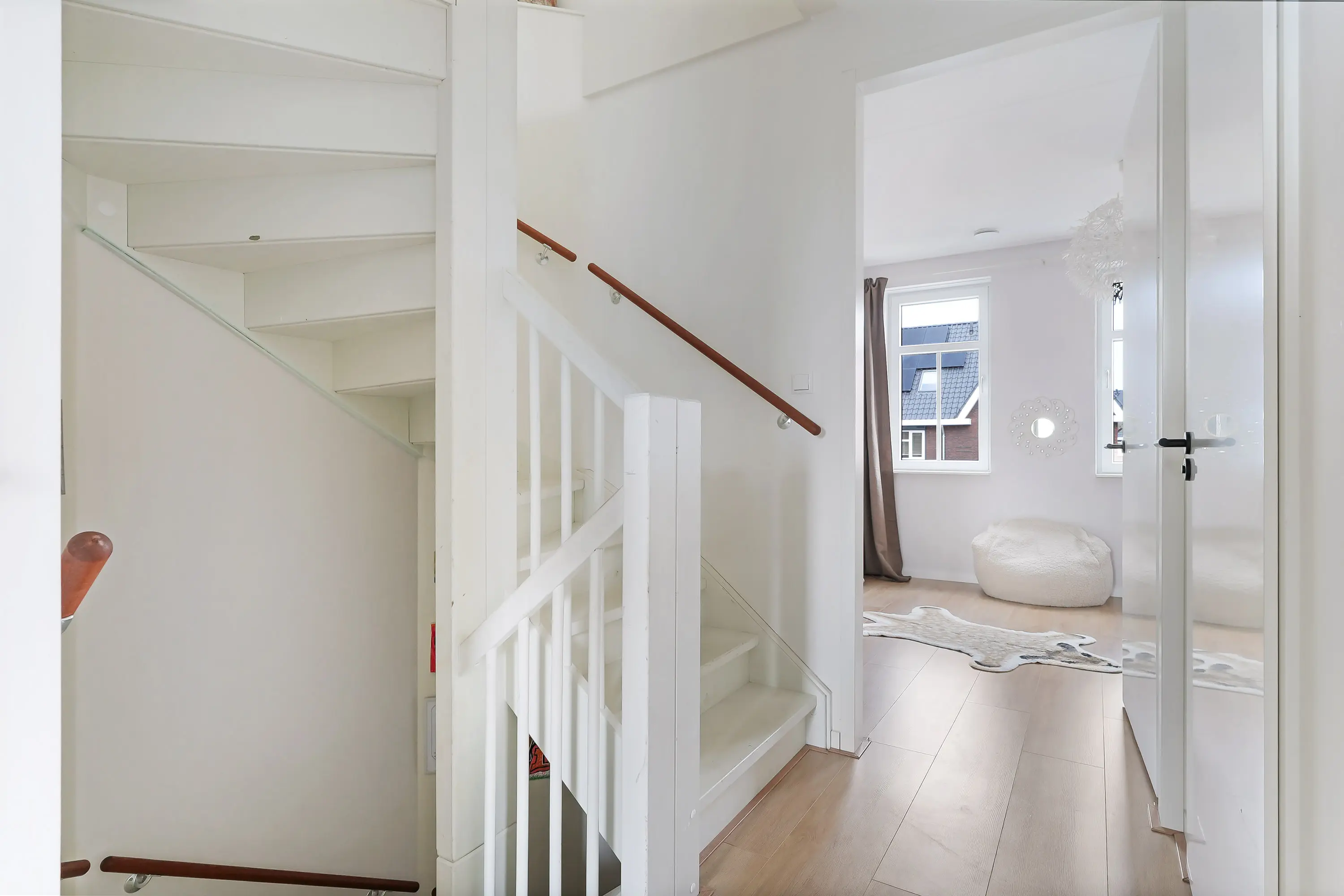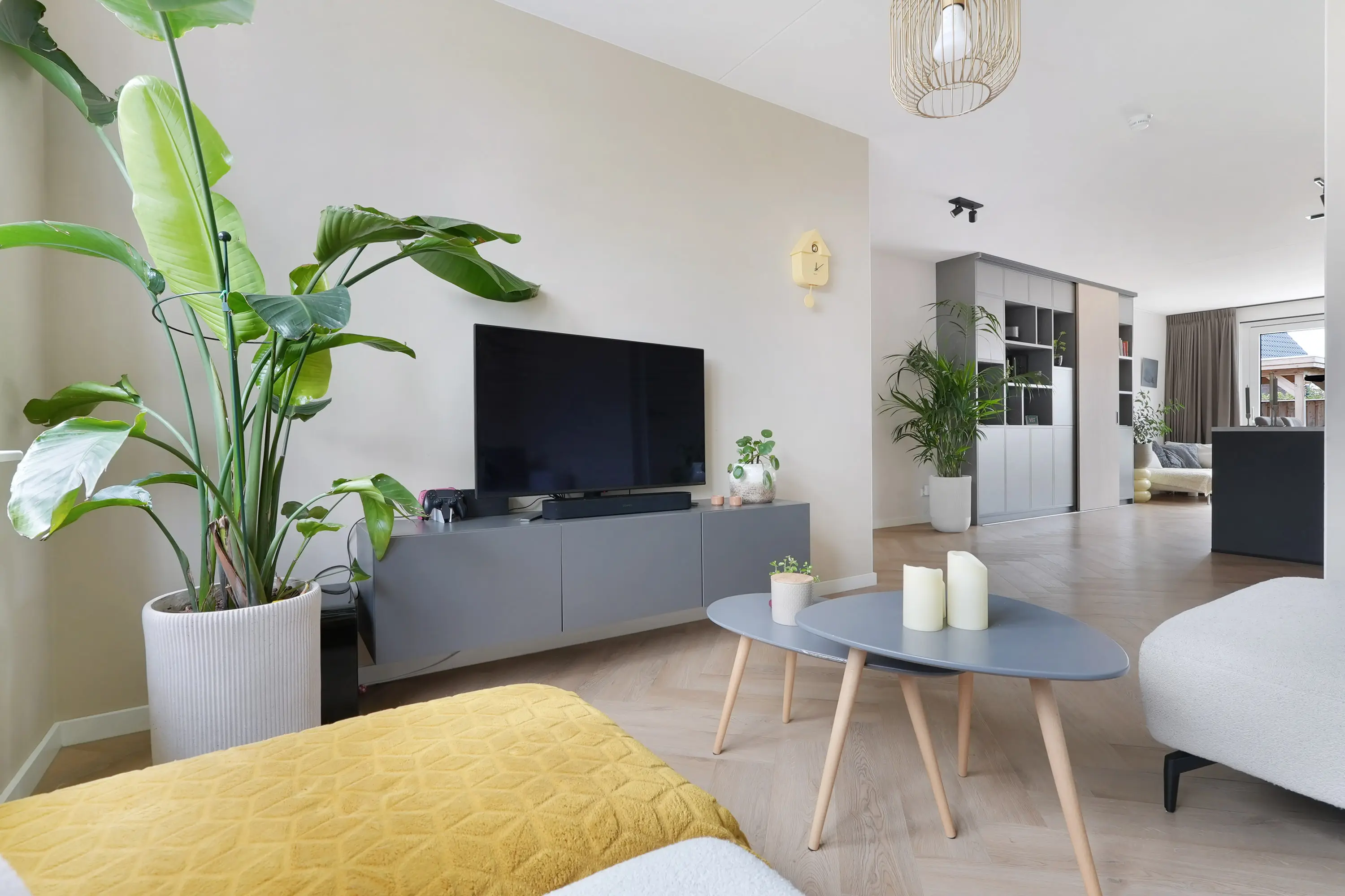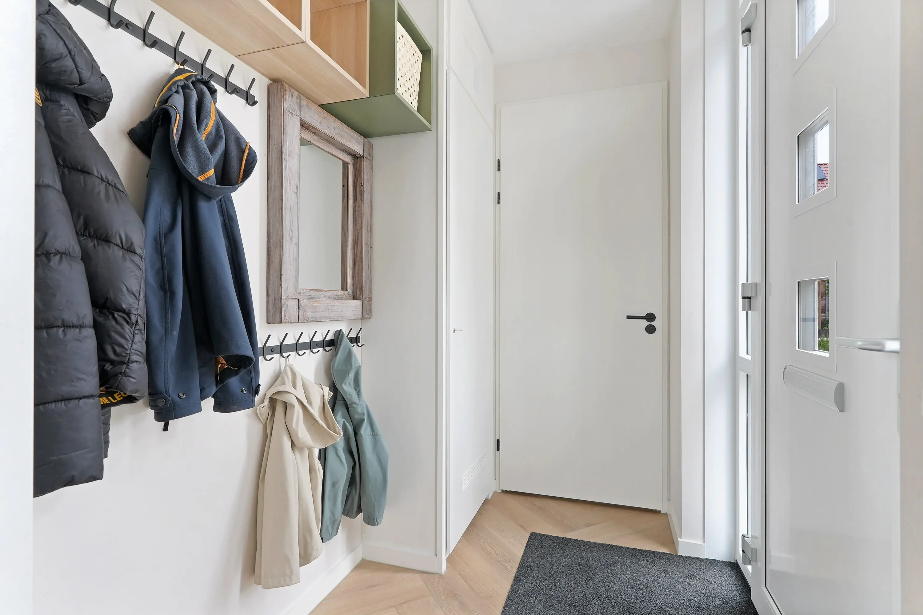 Een stijlvolle kastenwand tegenover de keuken zorgt niet alleen voor extra opbergruimte, maar biedt tevens een praktische, inpandige doorgang naar de aangebouwde garage. Dit maakt de woning extra functioneel en bijzonder aantrekkelijk.