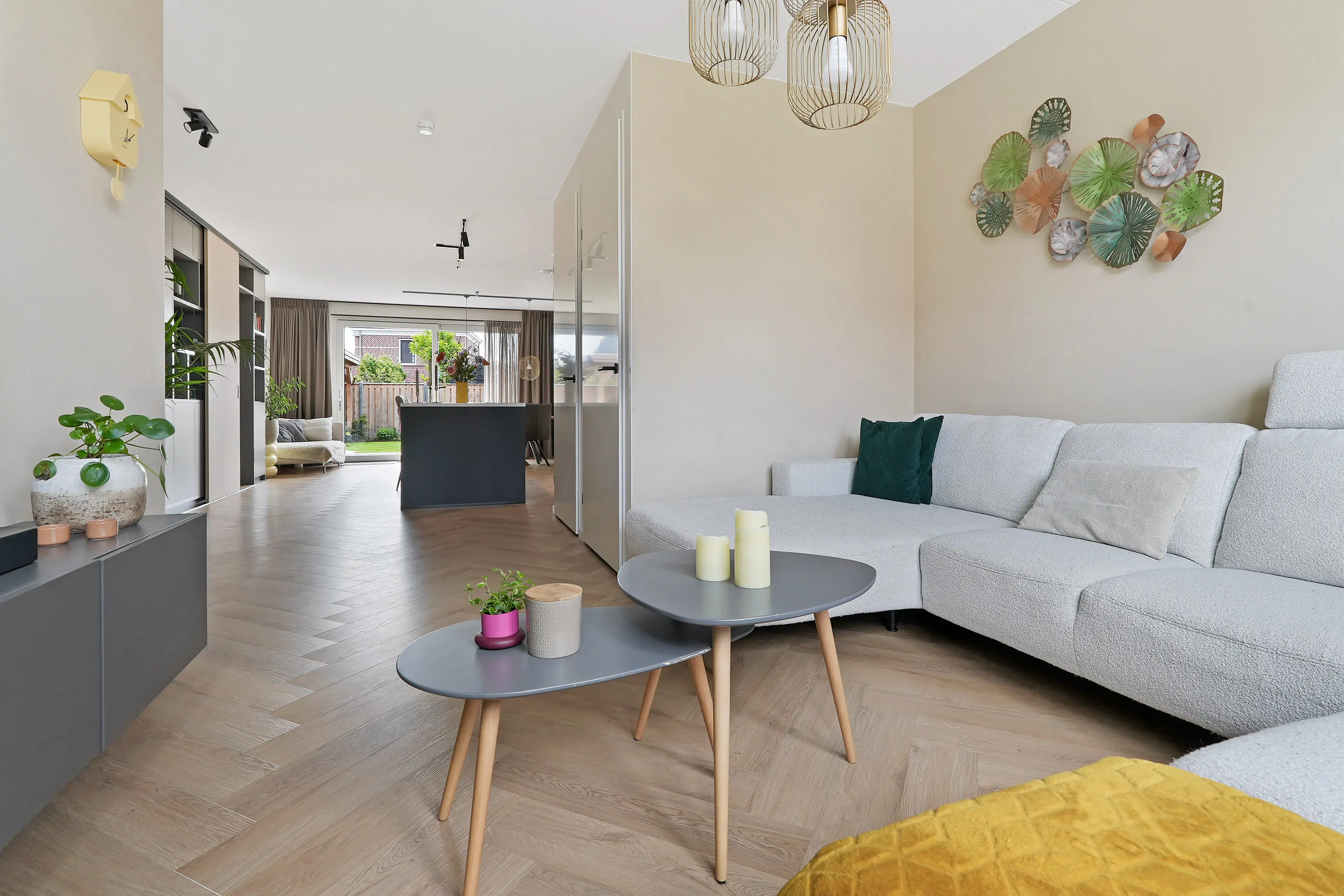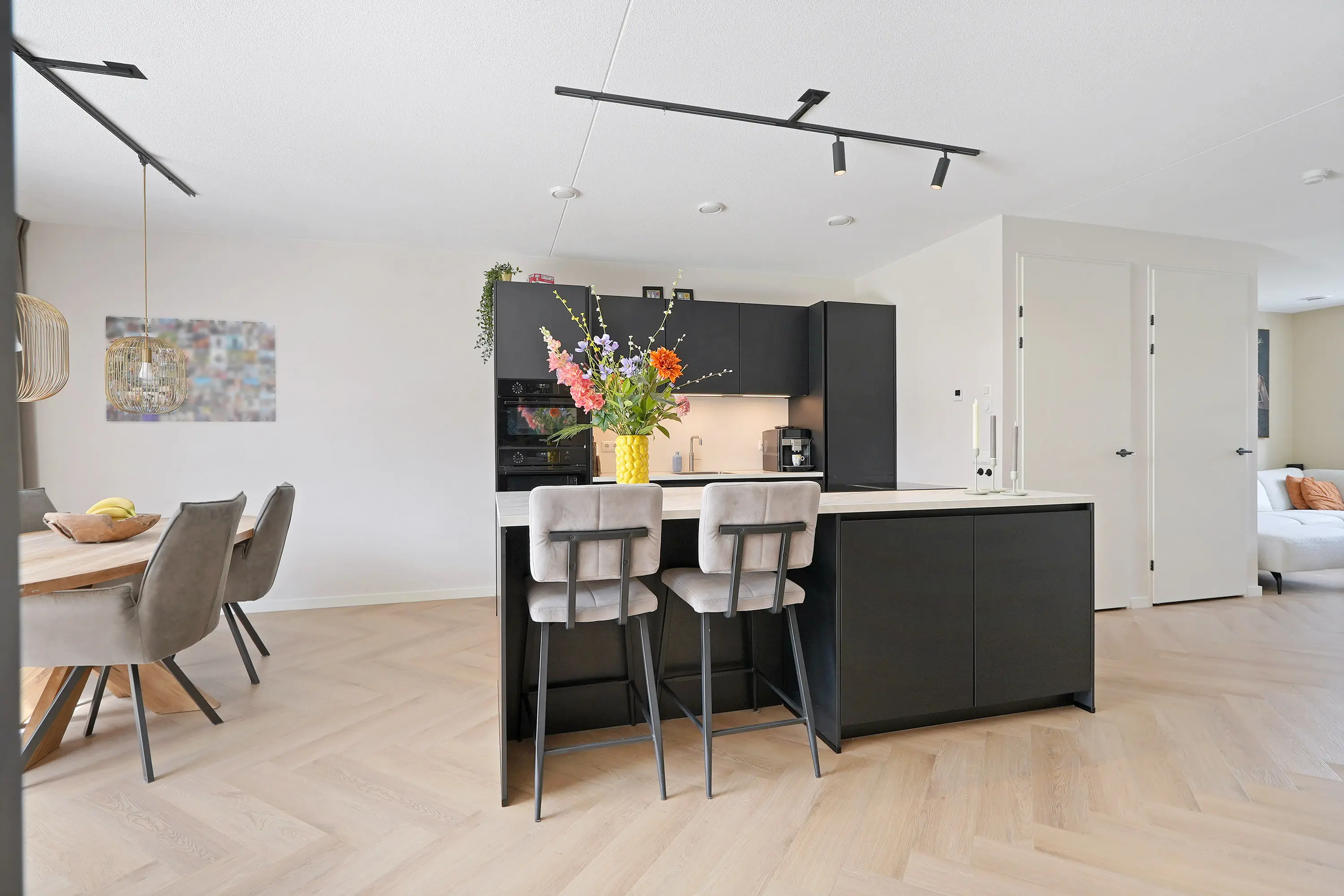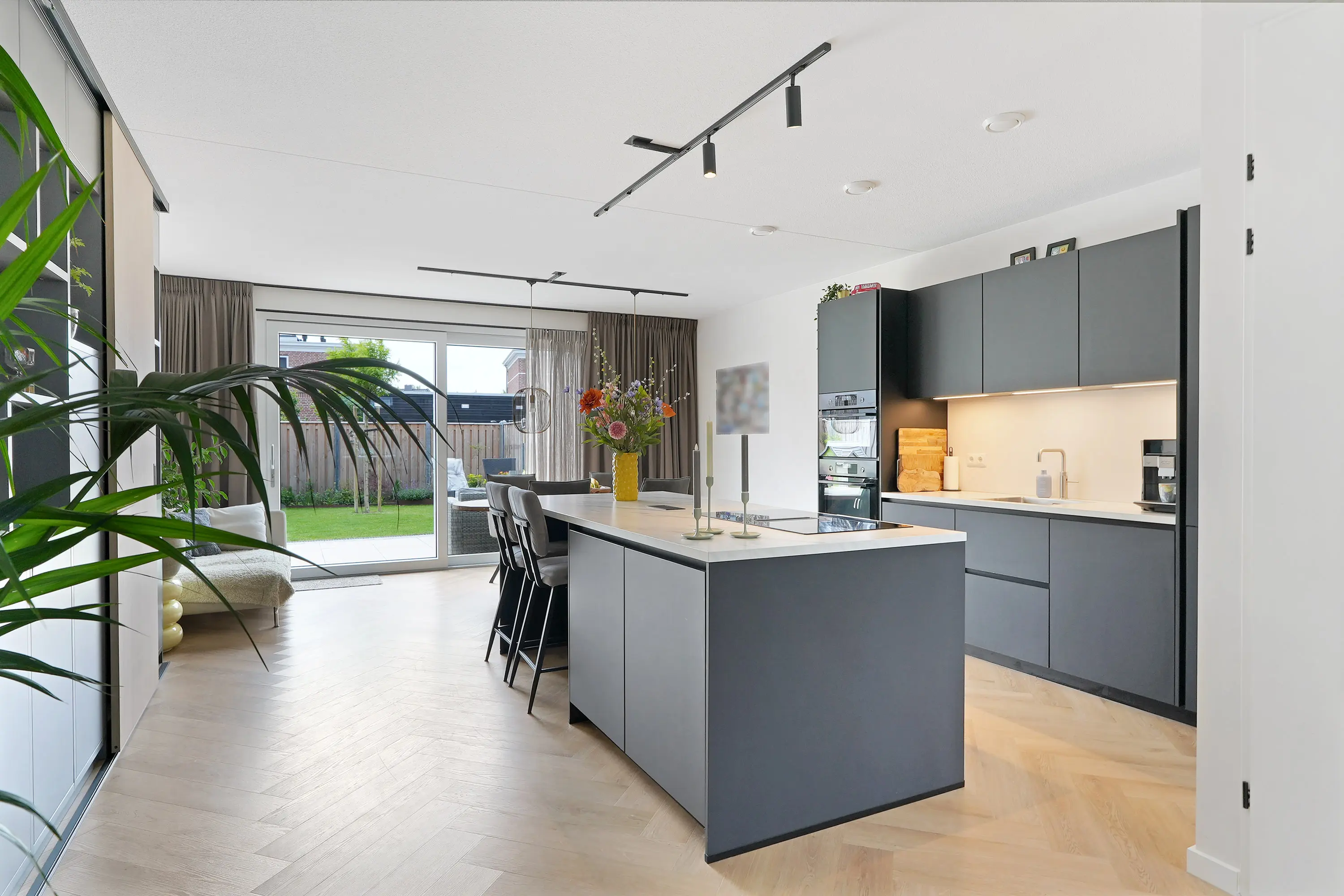 In de woonkamer, voorzien van een lichte visgraatvloer, vindt u de zithoek aan de voorzijde en de fantastische leefkeuken aan de tuinzijde. De keuken met kookeiland is werkelijk dé eyecatcher: strak vormgegeven in een donkere kleurstelling, met een licht marmerlook werkblad dat stijl en luxe uitstraalt. Uiteraard compleet met hoogwaardige inbouwapparatuur. De grote schuifpui verbindt binnen met buiten en leidt u naar de tuin.