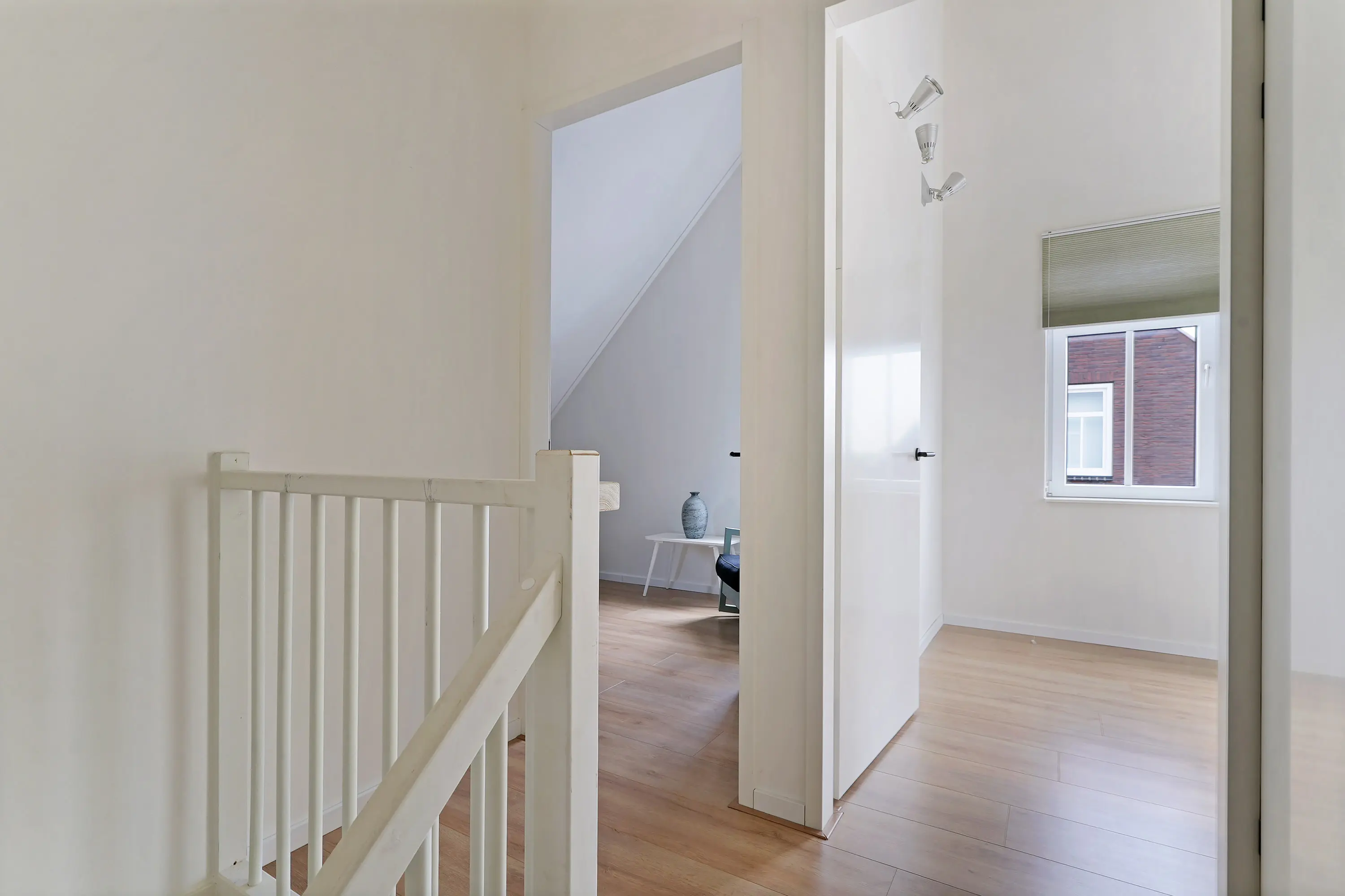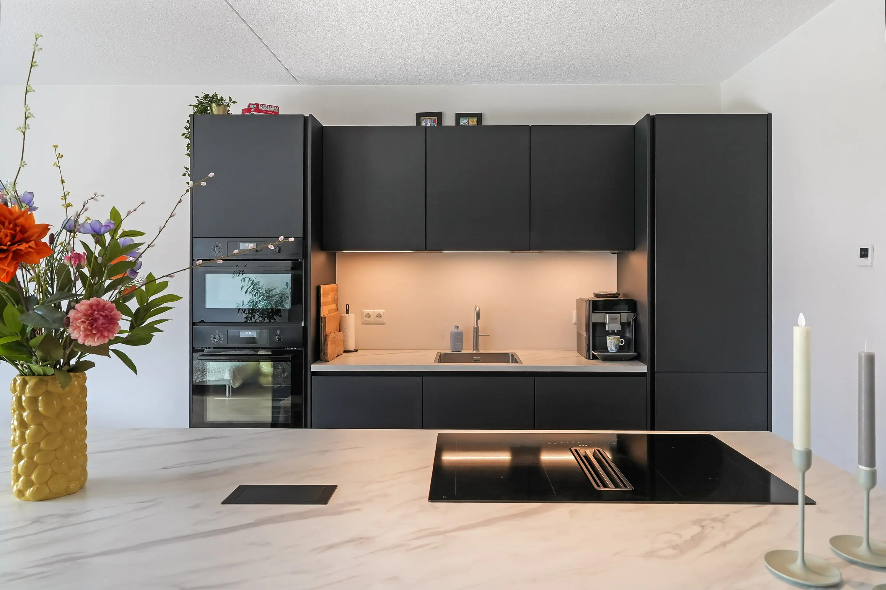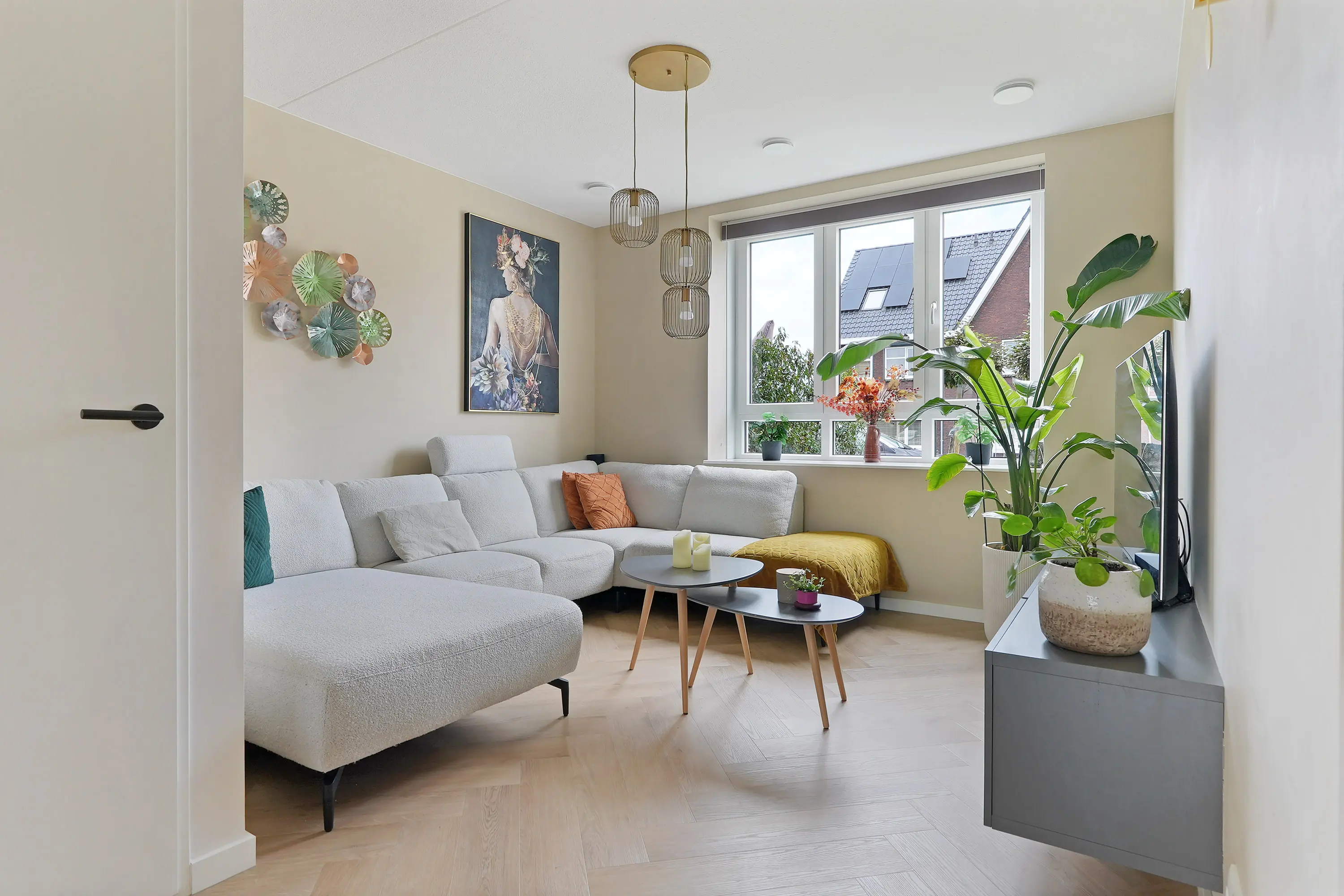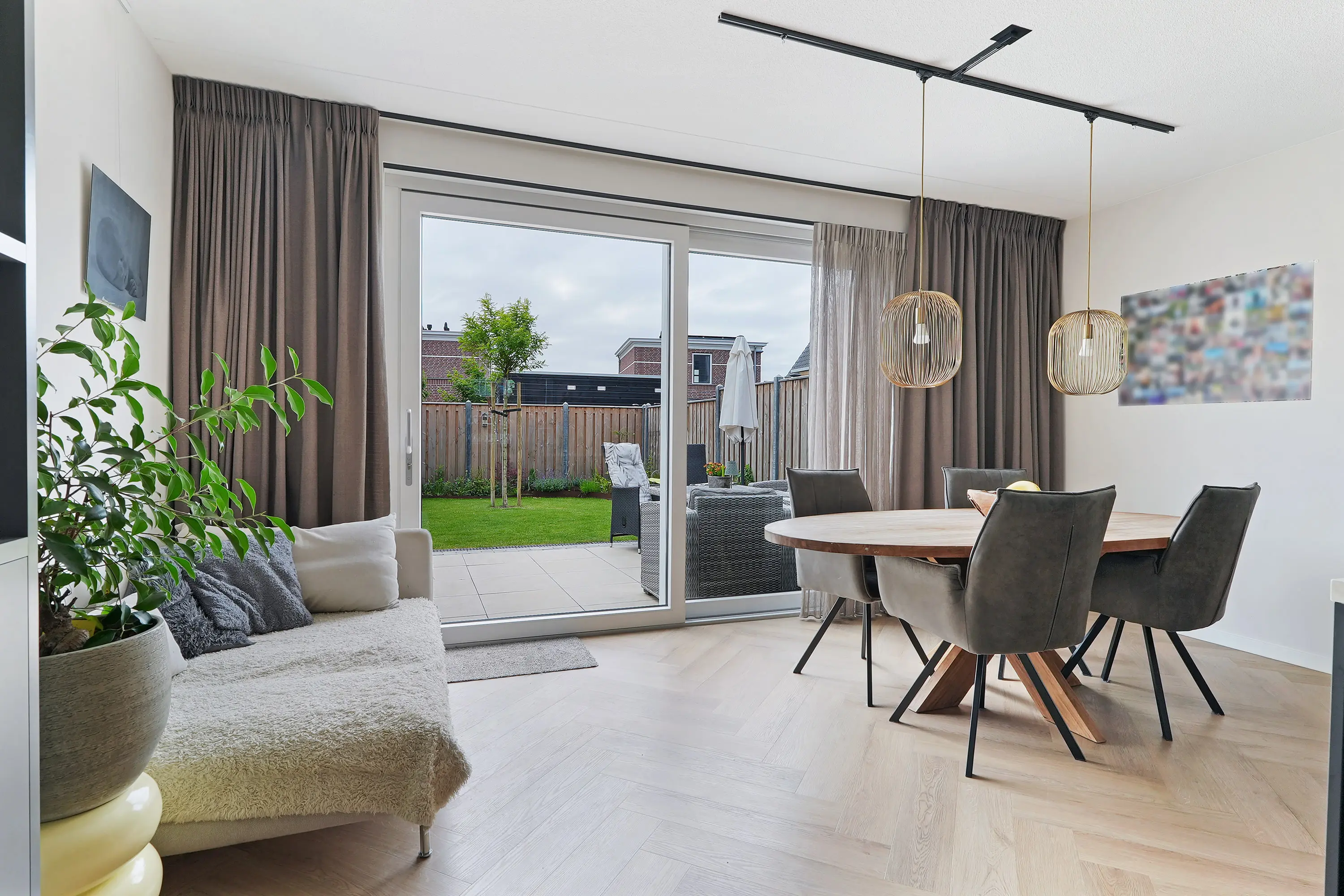In de woonkamer, voorzien van een lichte visgraatvloer, vindt u de zithoek aan de voorzijde en de fantastische leefkeuken aan de tuinzijde. De keuken met kookeiland is werkelijk dé eyecatcher: strak vormgegeven in een donkere kleurstelling, met een licht marmerlook werkblad dat stijl en luxe uitstraalt. Uiteraard compleet met hoogwaardige inbouwapparatuur. De grote schuifpui verbindt binnen met buiten en leidt u naar de tuin.