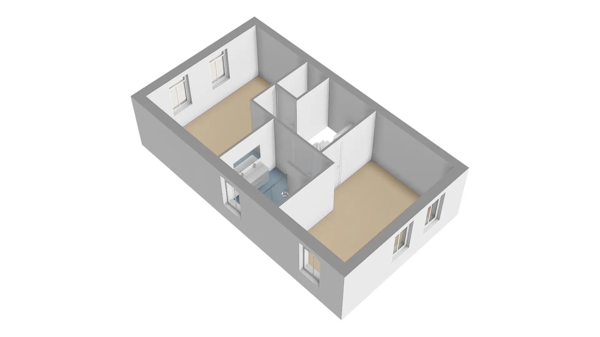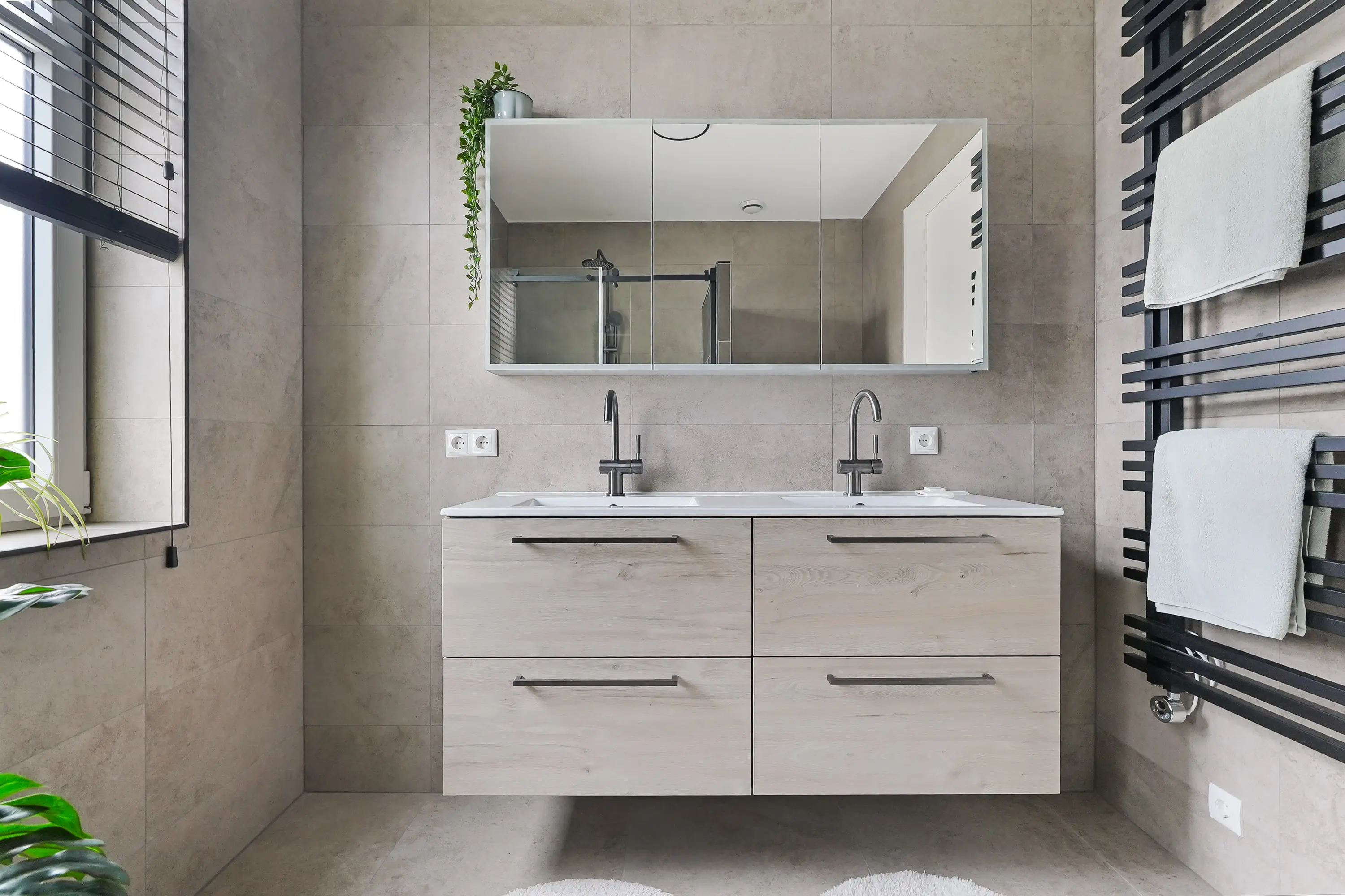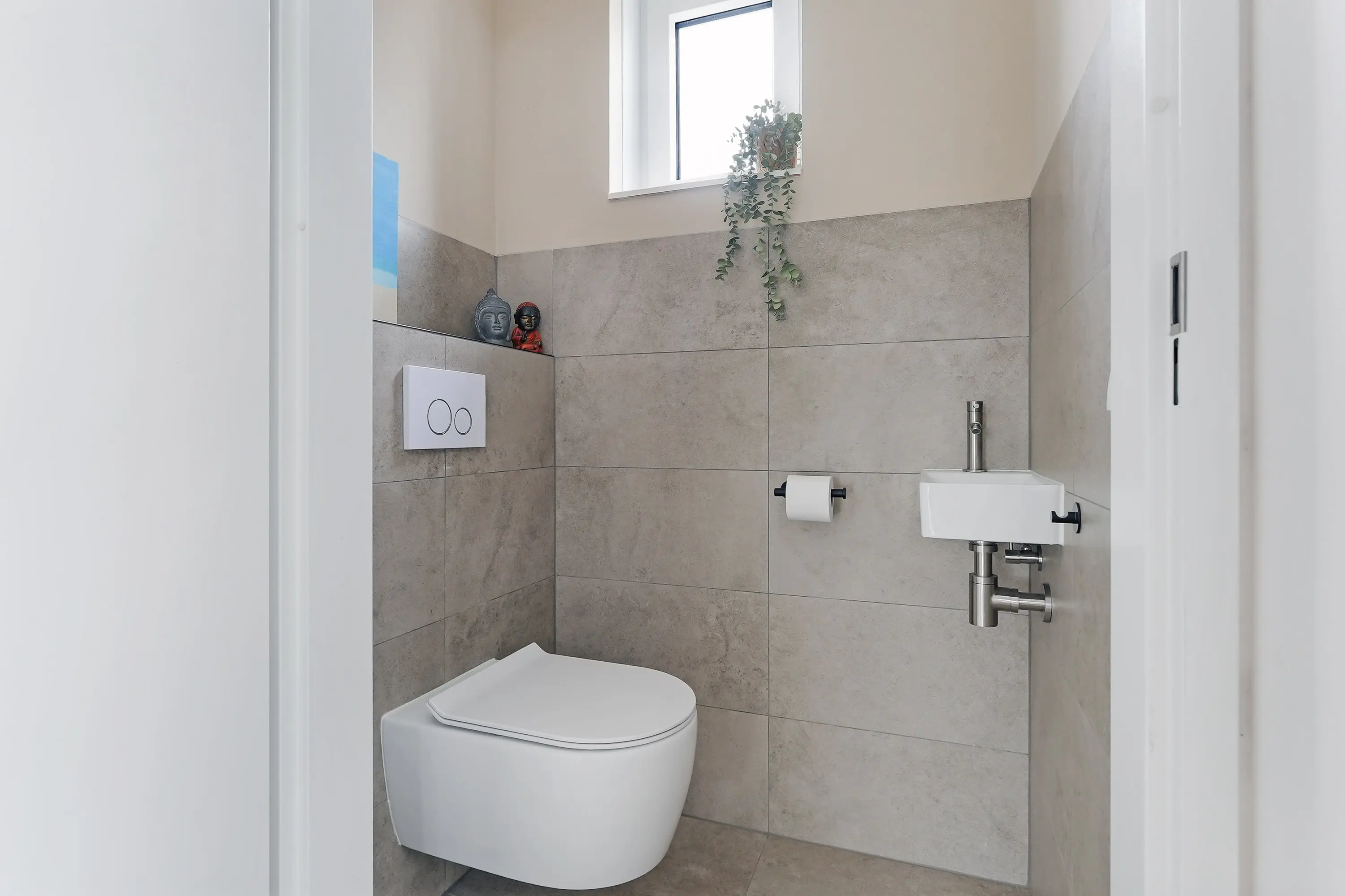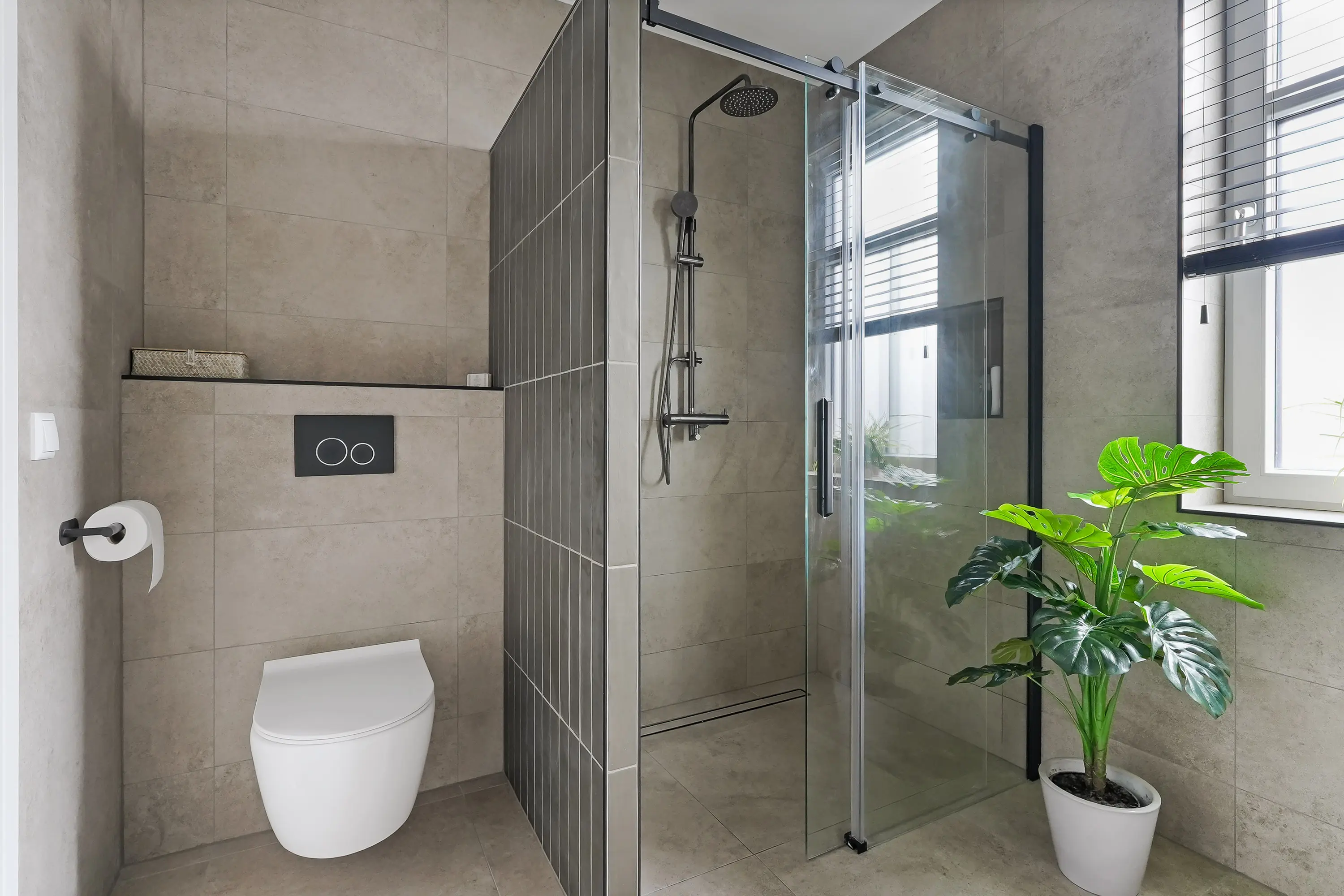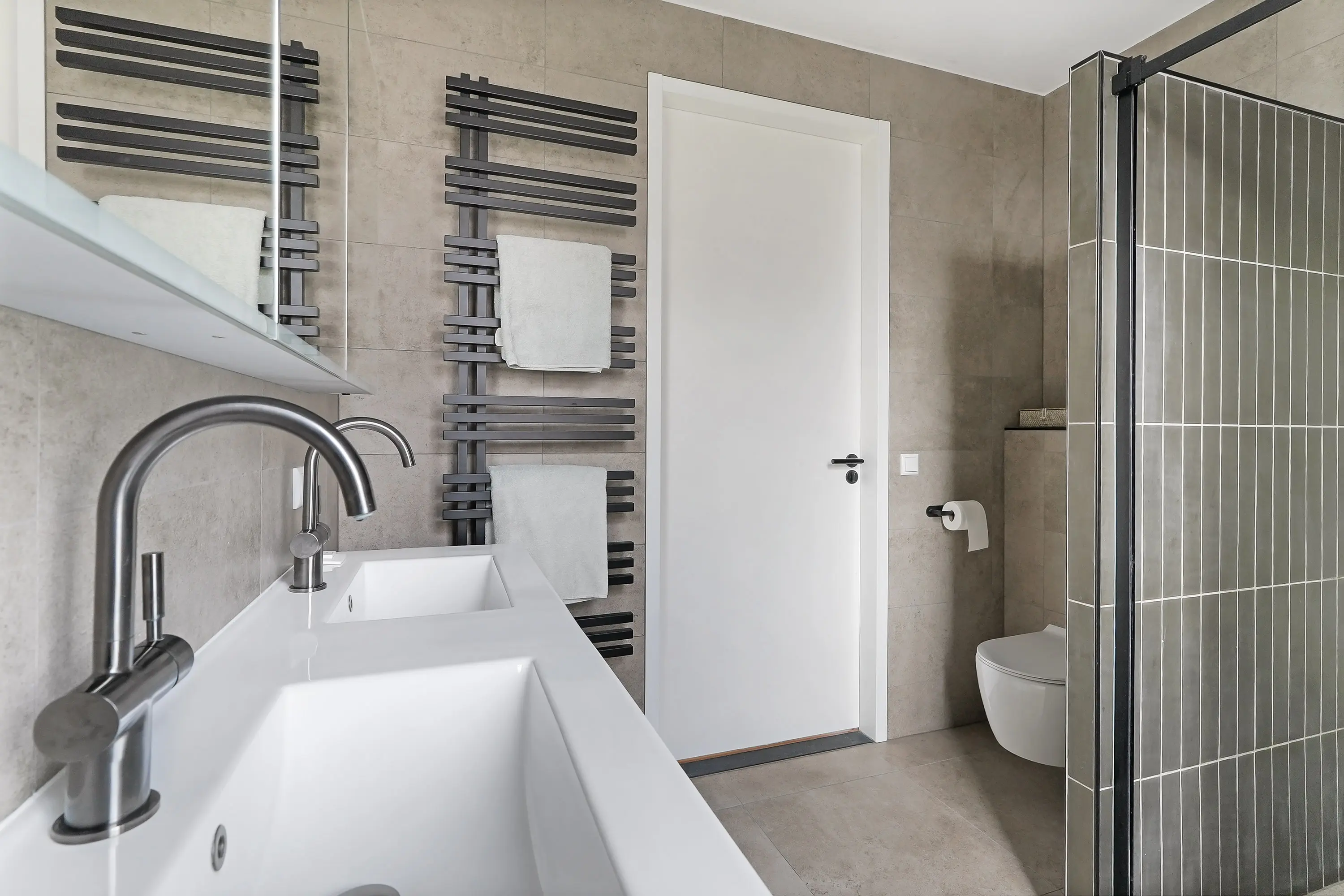 De overloop biedt toegang tot twee volwaardige slaapkamers, beiden met grote raampartijen en strak afgewerkte wanden. De badkamer is modern en stijlvol ingericht met betonlook tegels, een royale inloopdouche, tweede toilet en een fraai badmeubel met dubbele wastafel. Alles is tot in de puntjes afgewerkt – klaar voor jarenlang comfort.