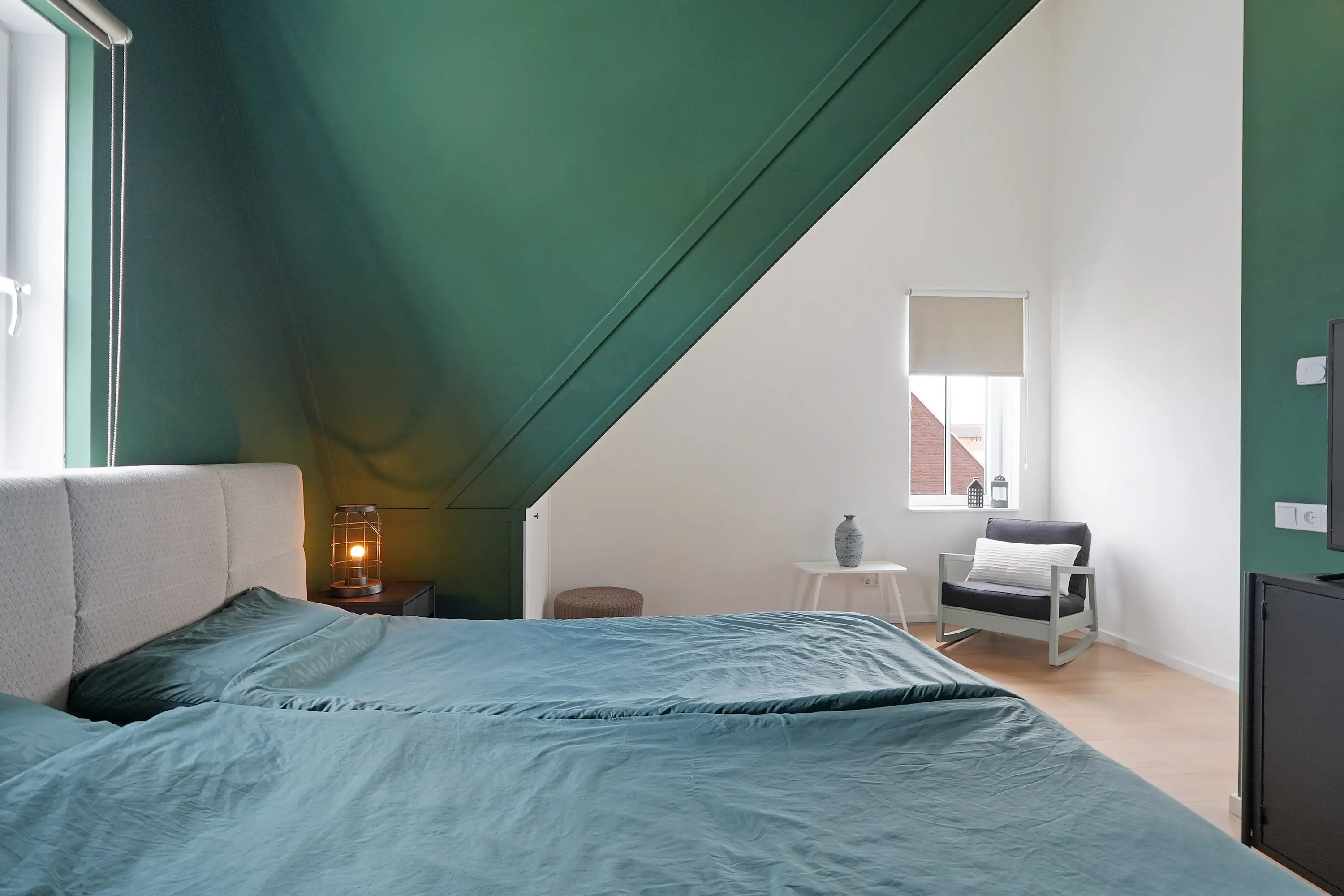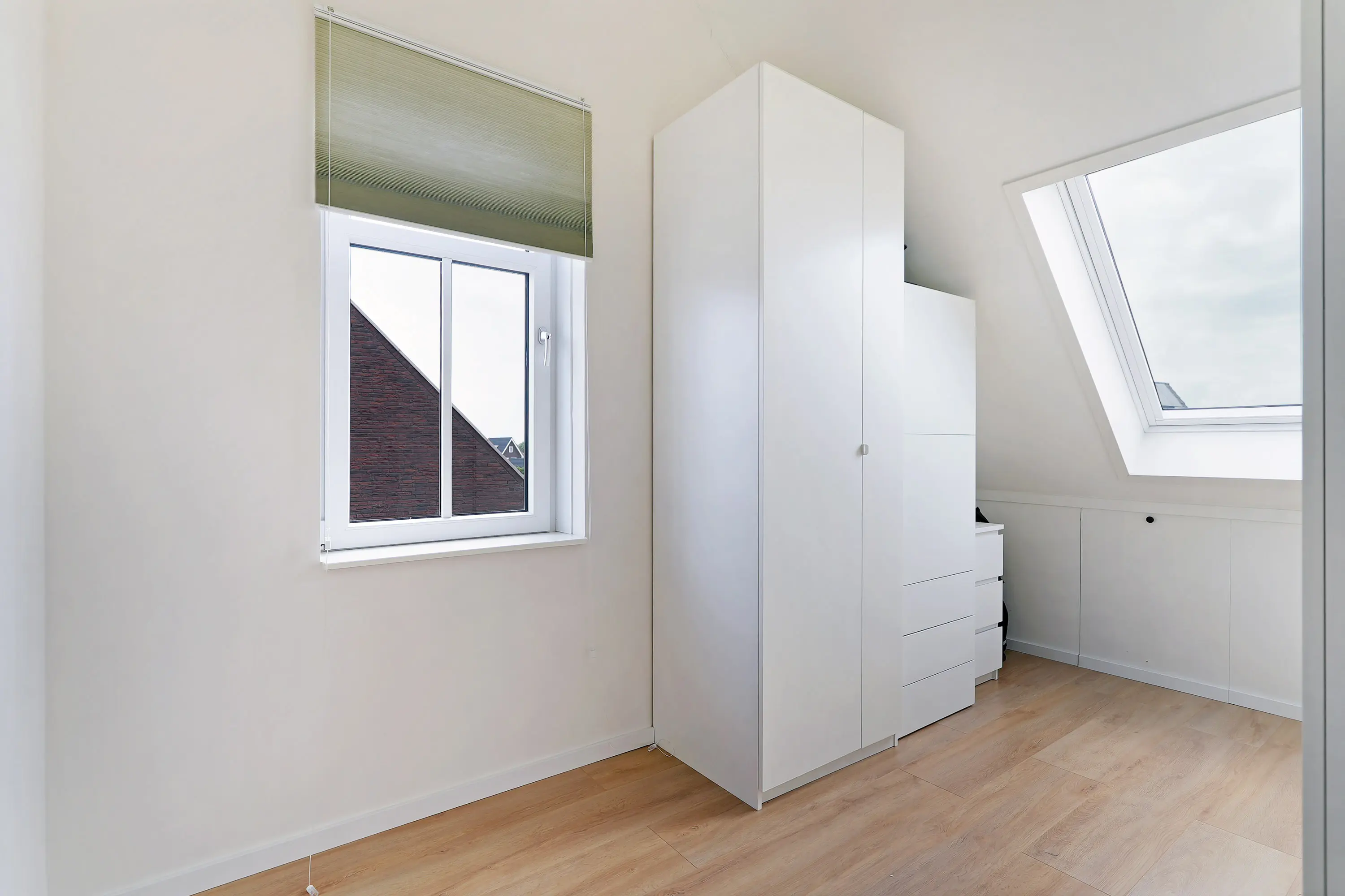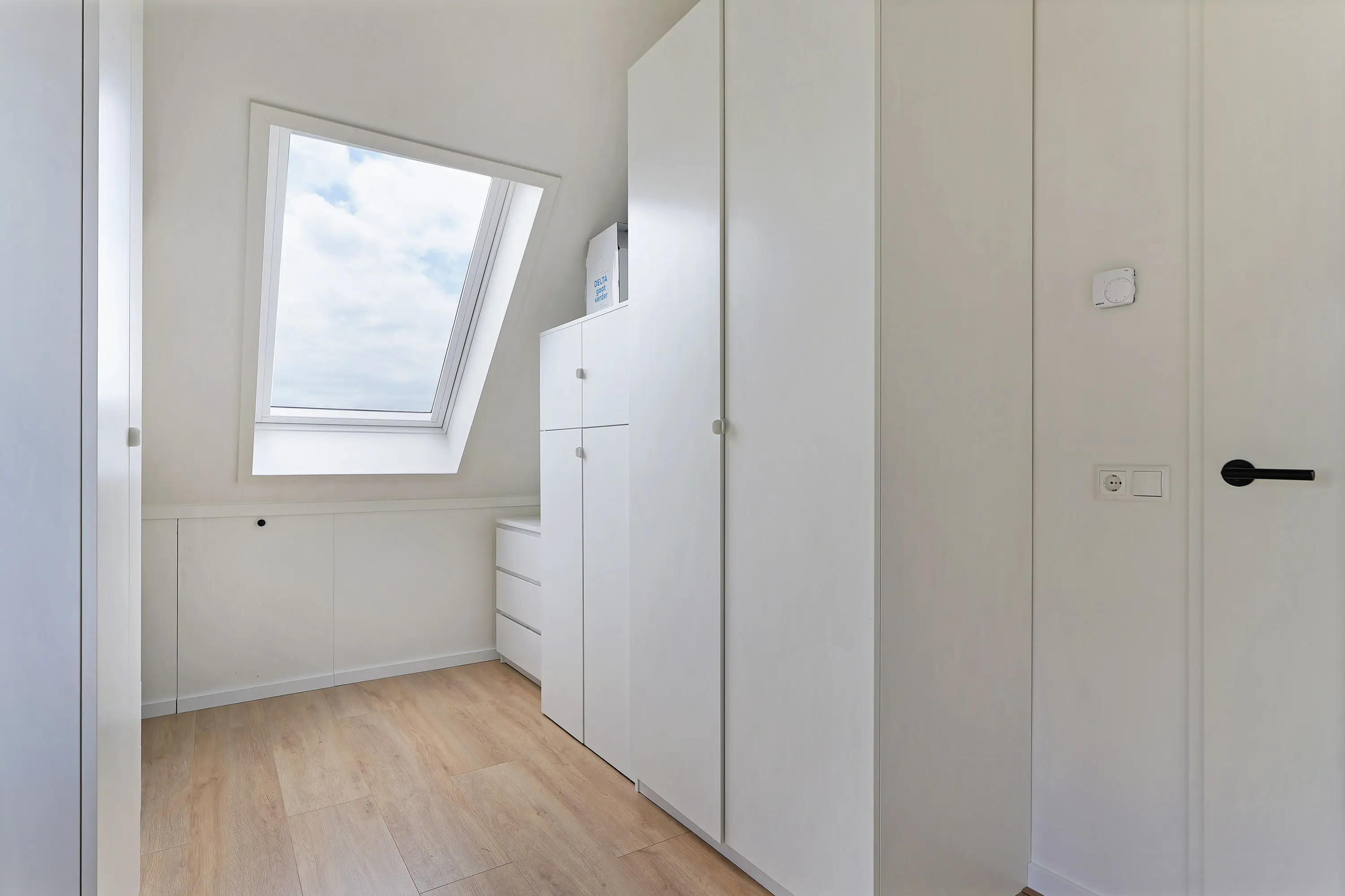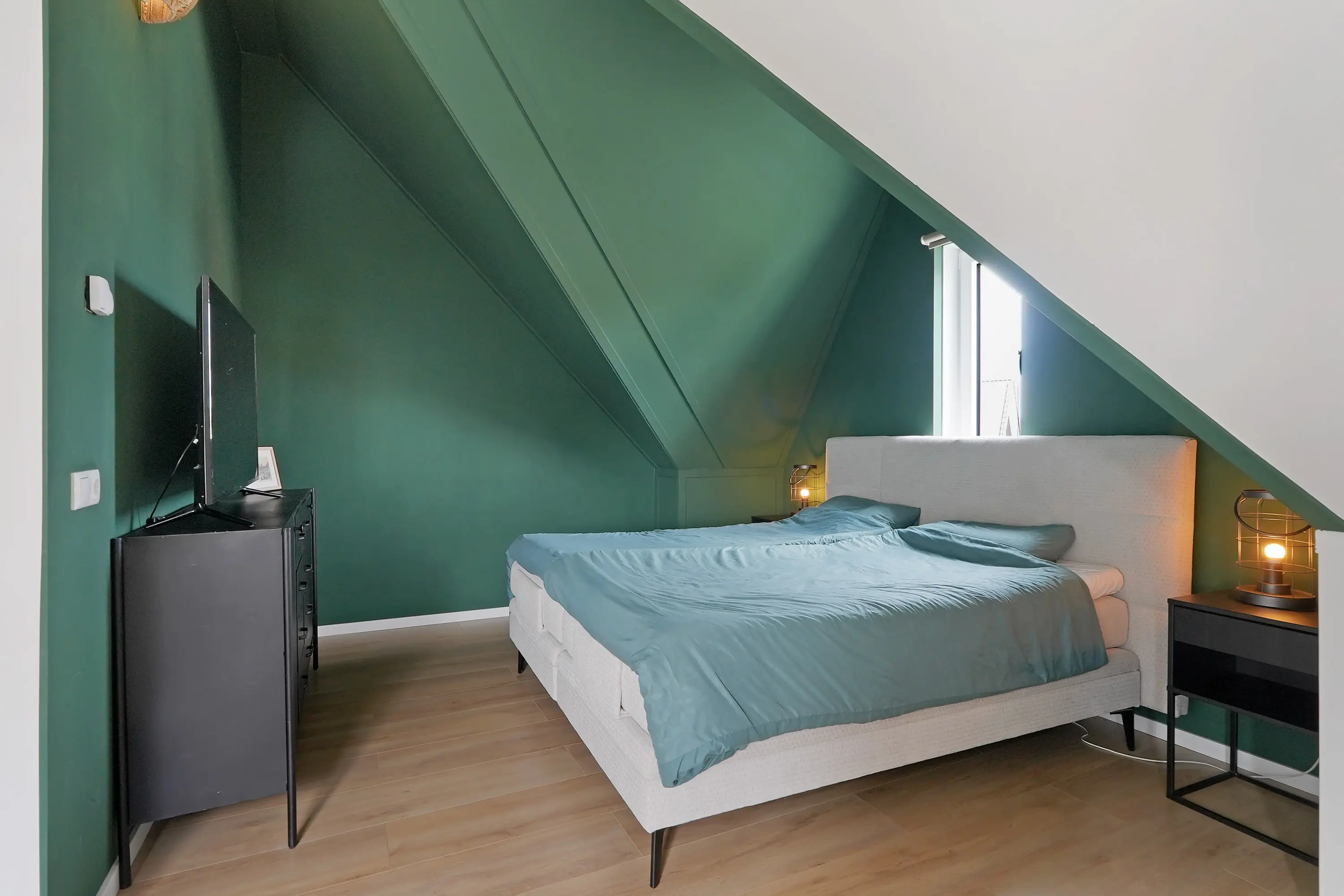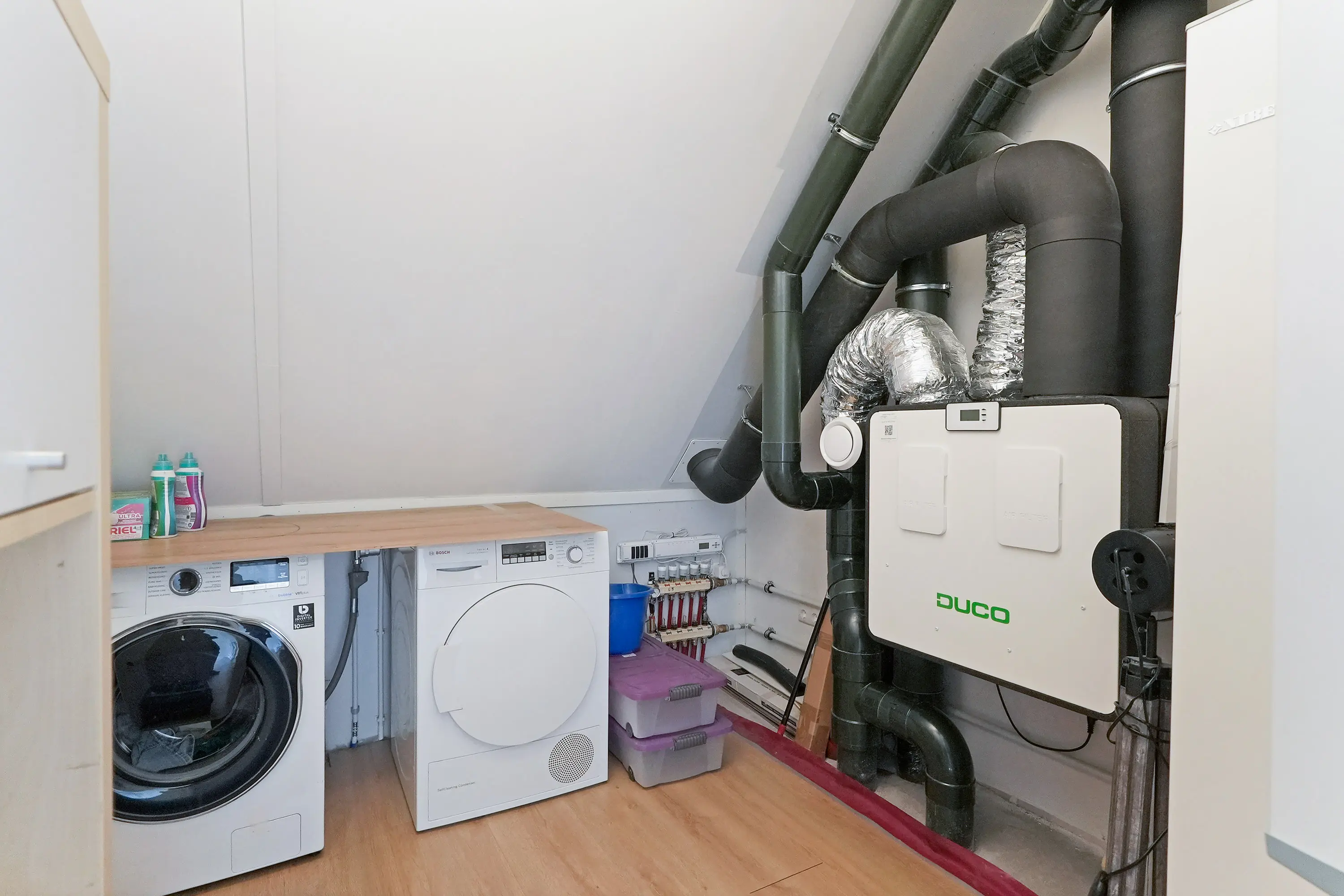 Een volwaardige verdieping met twee slaapkamers, waaronder een unieke ouderslaapkamer onder het karakteristieke samengestelde dak. De hoge nok maakt deze ruimte indrukwekkend. Daarnaast bevindt zich hier een aparte technische ruimte met wasmachineopstelling, warmtepomp en omvormer.