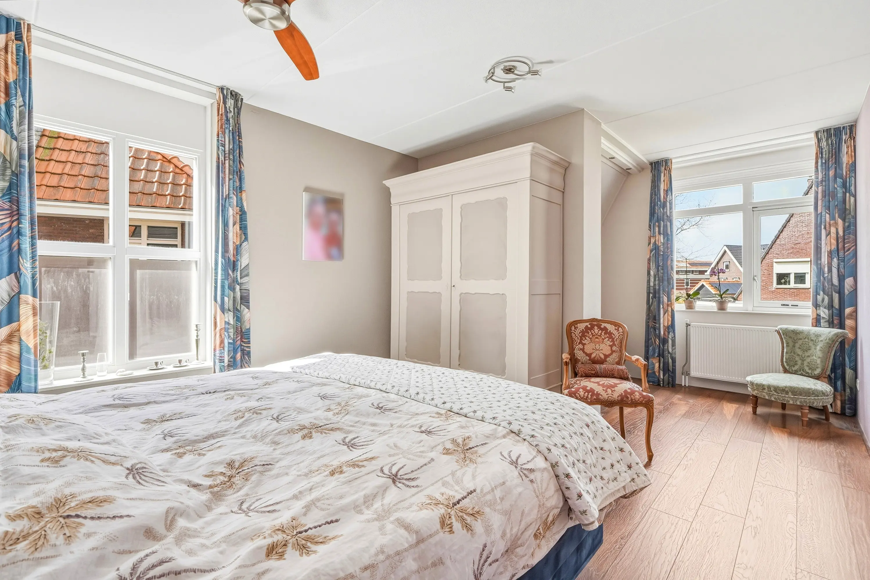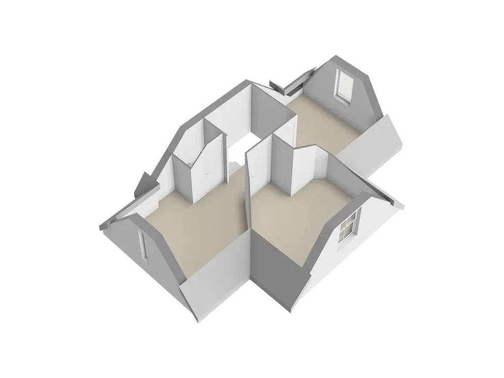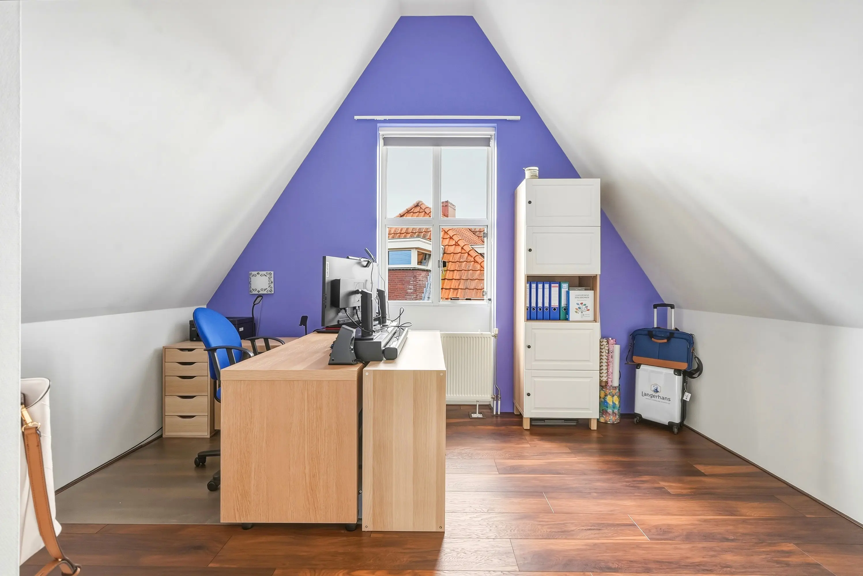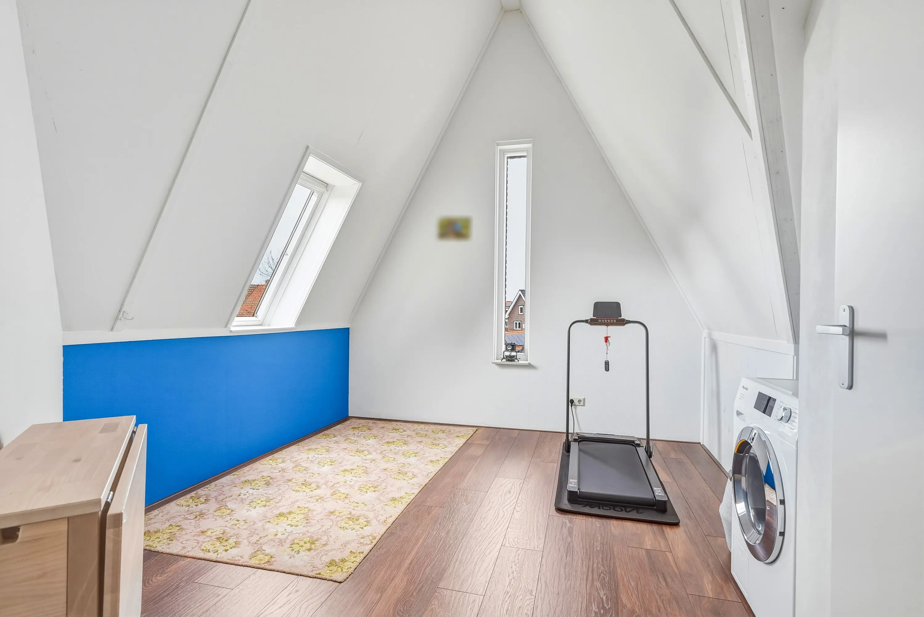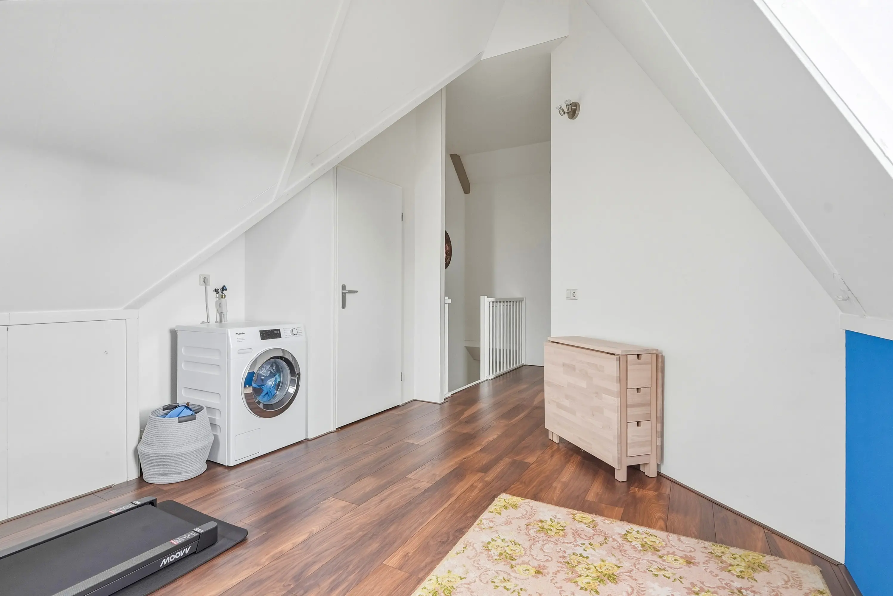 Ruime open zolderkamer met wasmachineaansluiting, dakraam, c.v.-kast en twee ruime slaapkamers waarvan één met dakraam en rolluik.
