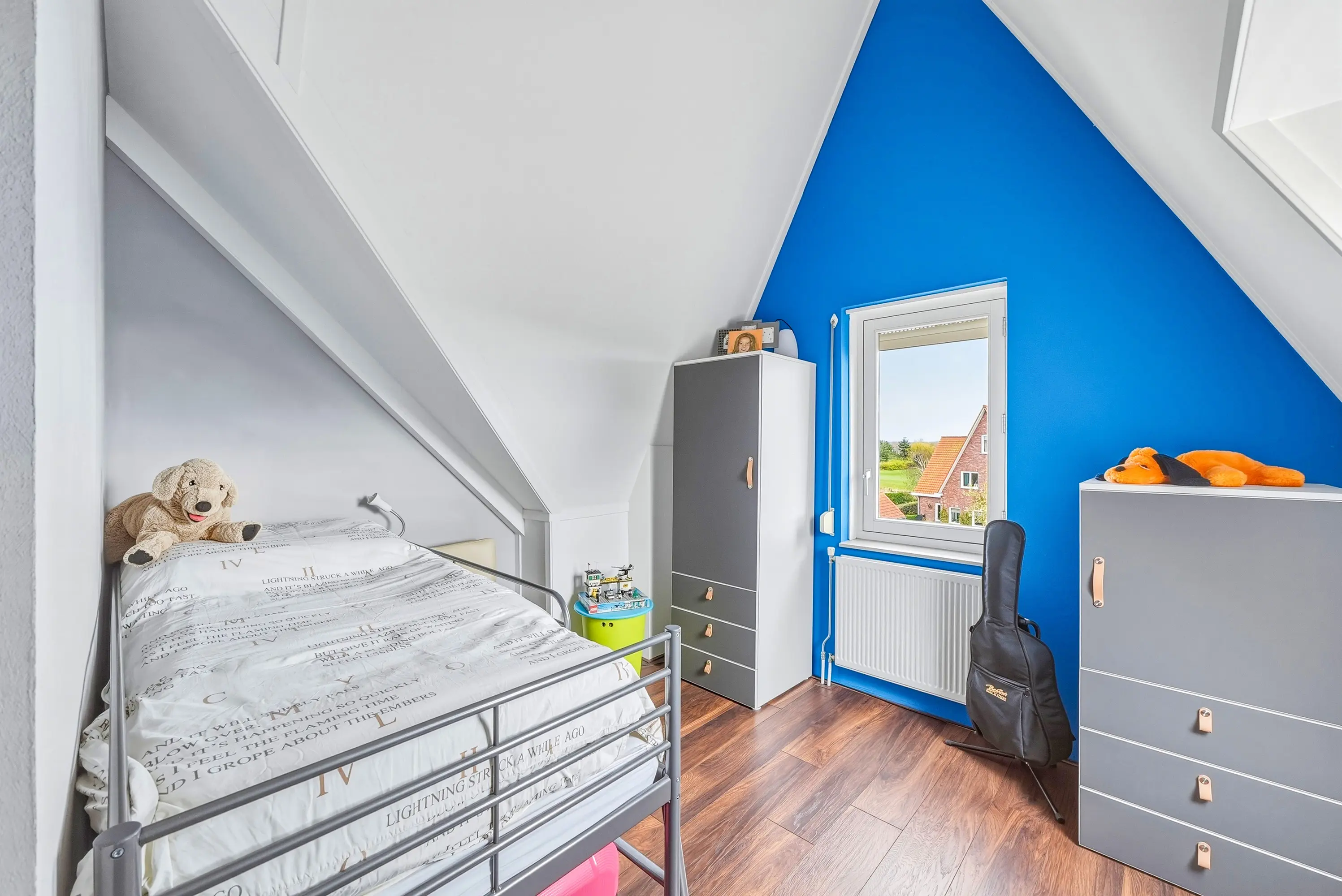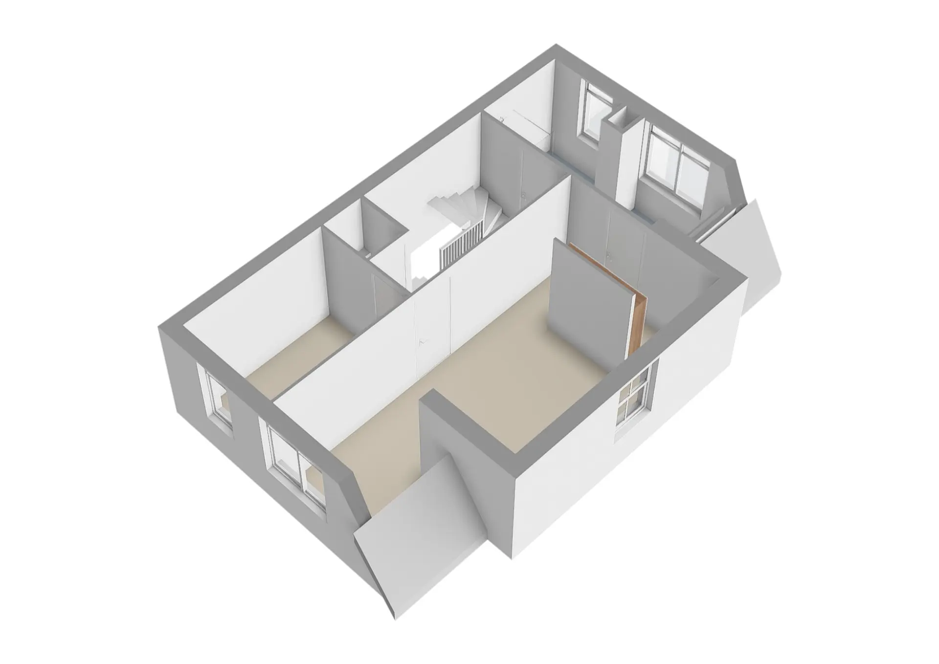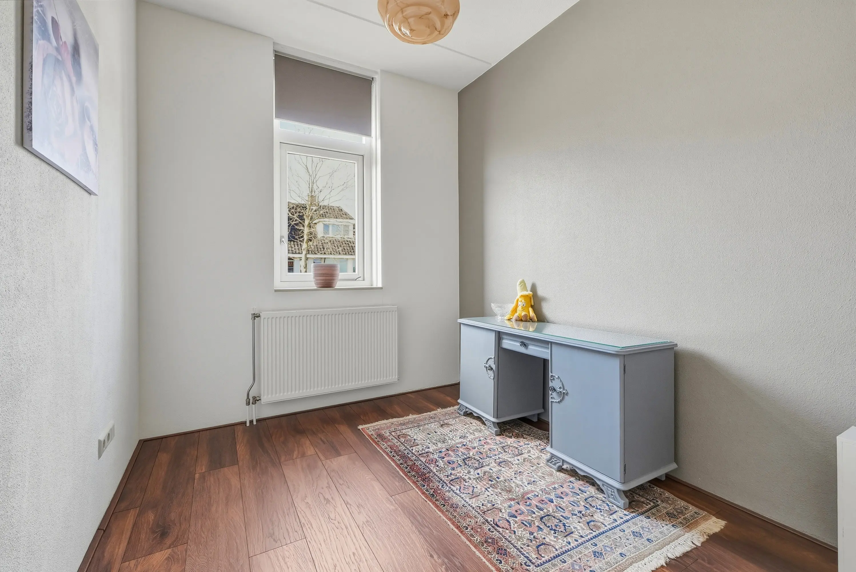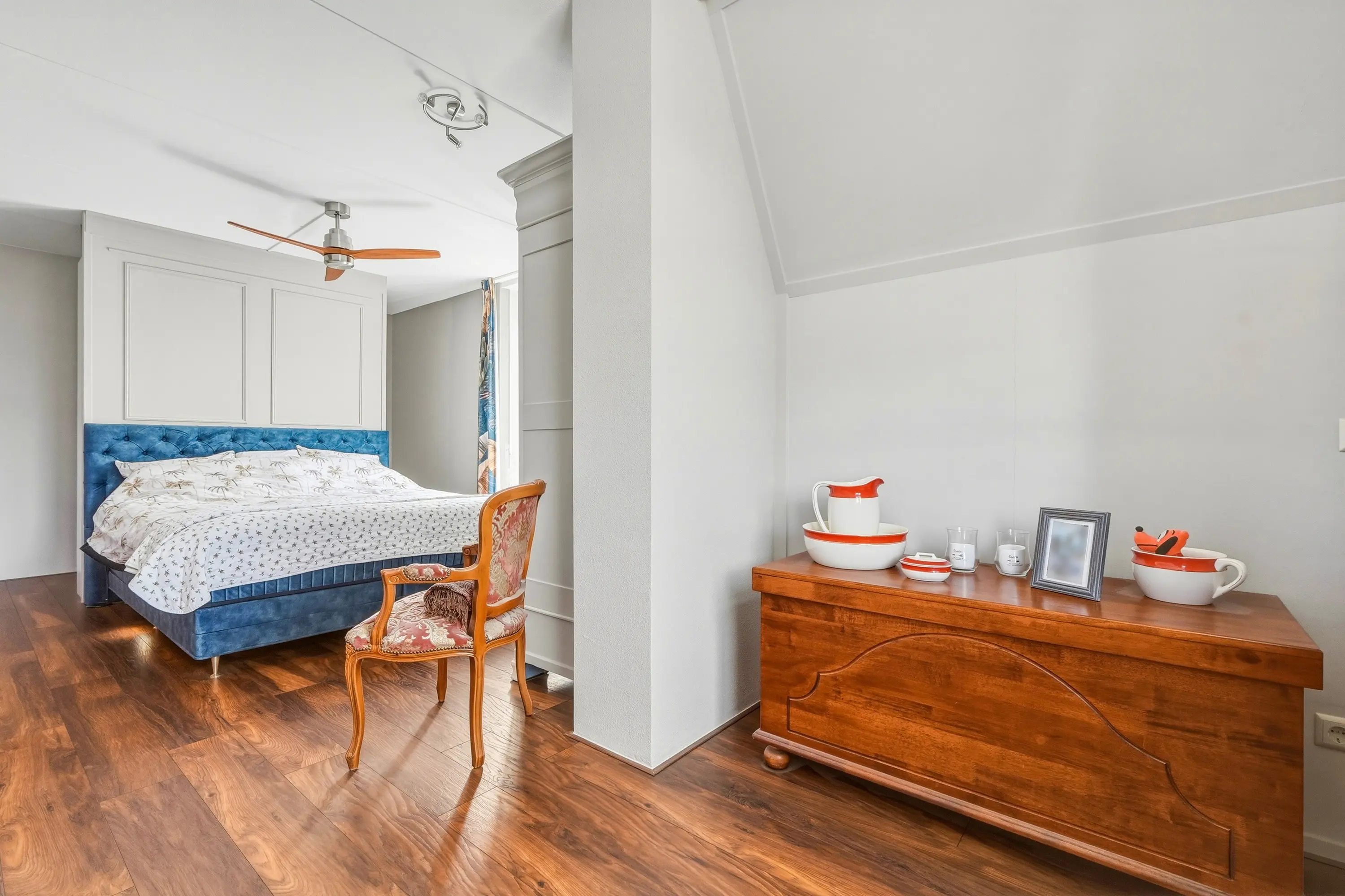 Ruime open zolderkamer met wasmachineaansluiting, dakraam, c.v.-kast en twee ruime slaapkamers waarvan één met dakraam en rolluik.