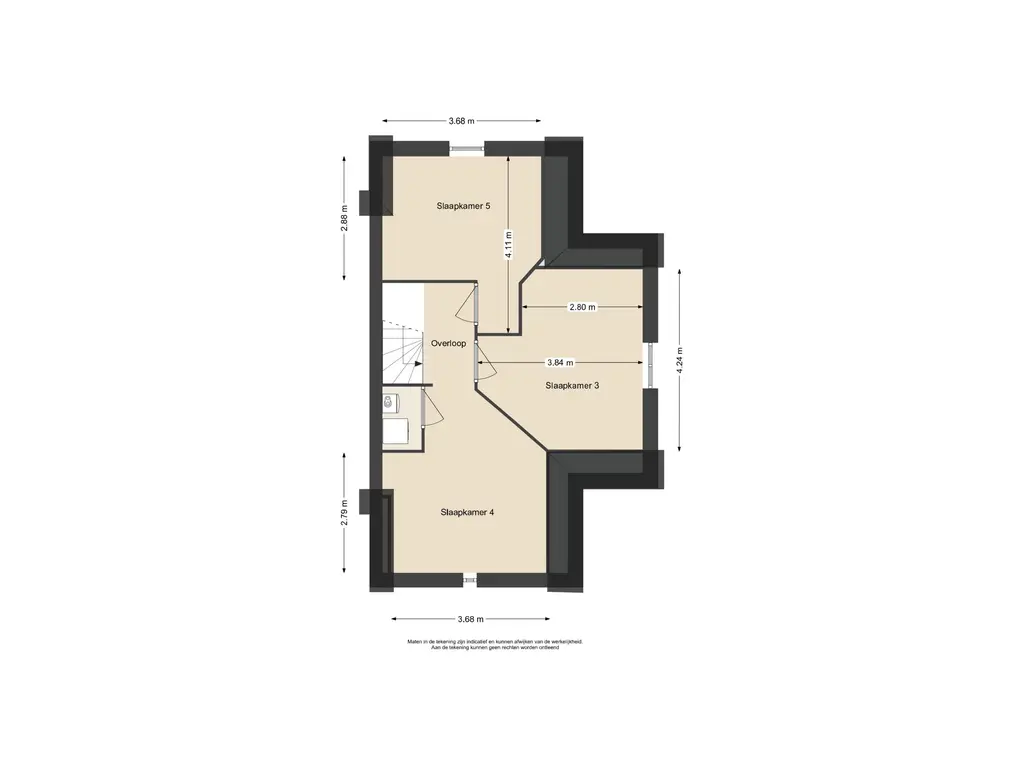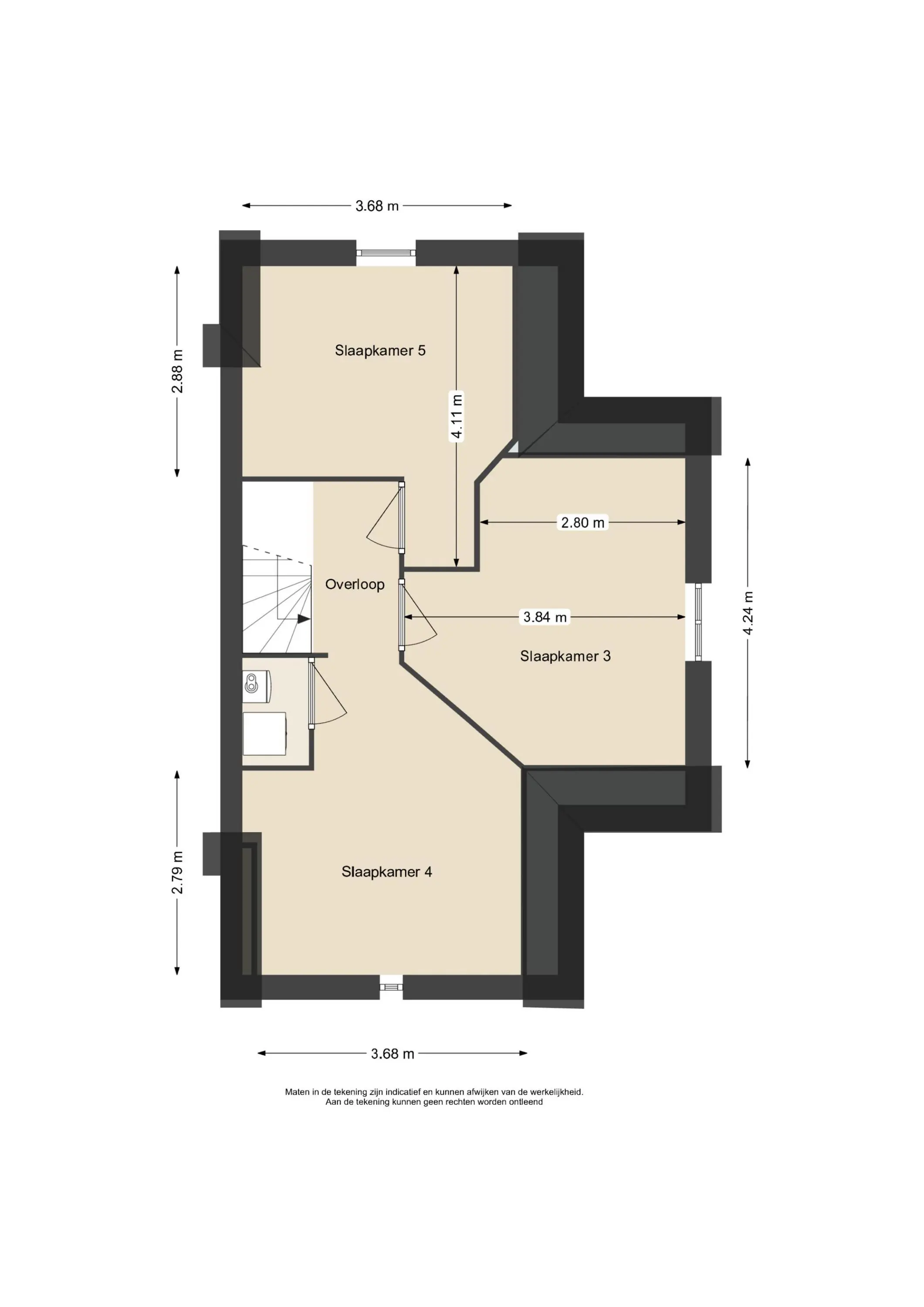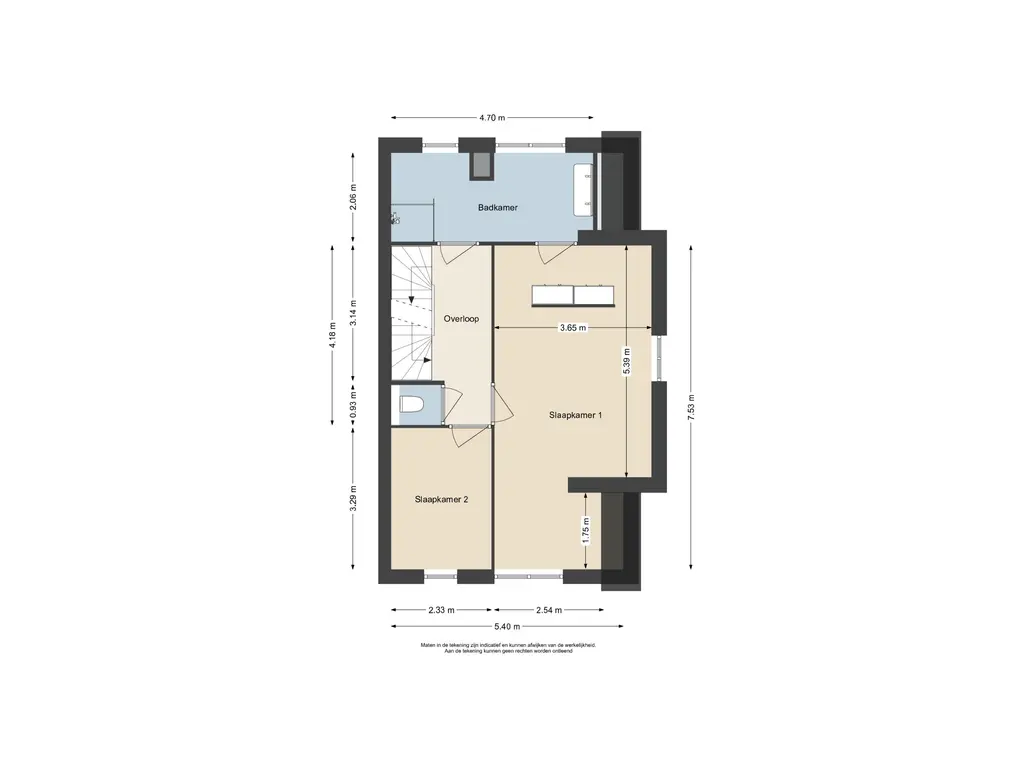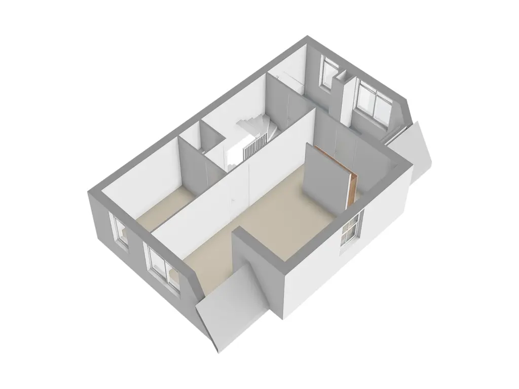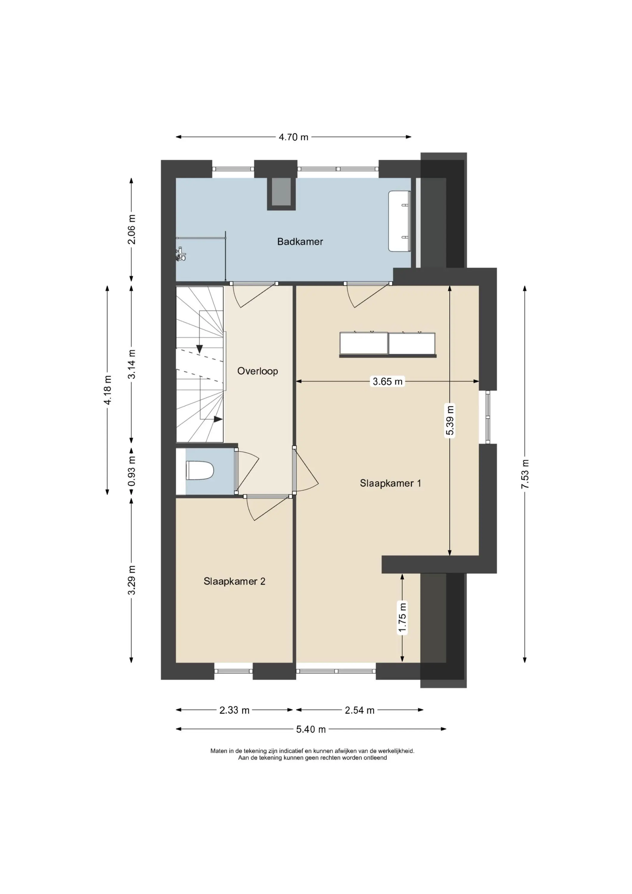 Ruime open zolderkamer met wasmachineaansluiting, dakraam, c.v.-kast en twee ruime slaapkamers waarvan één met dakraam en rolluik.