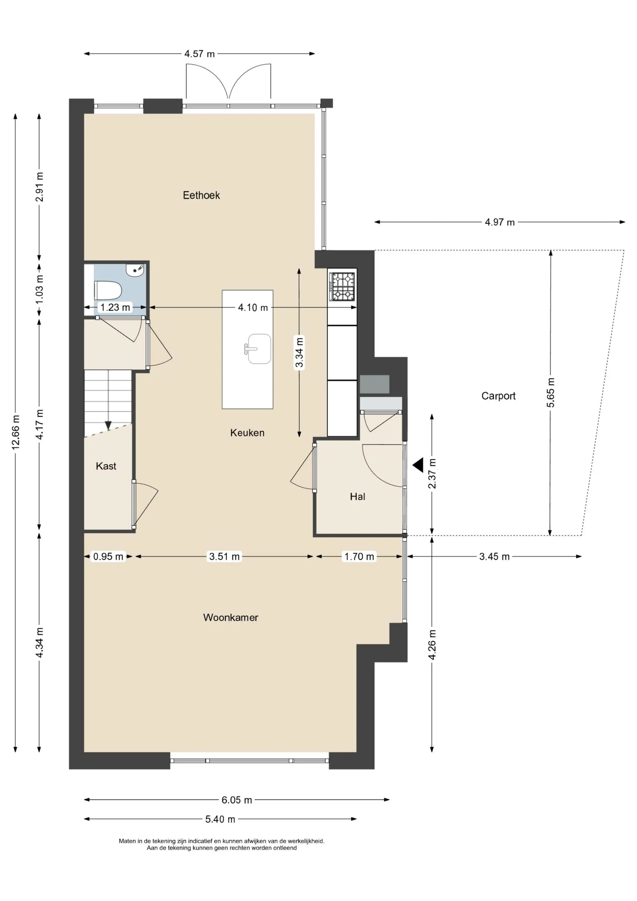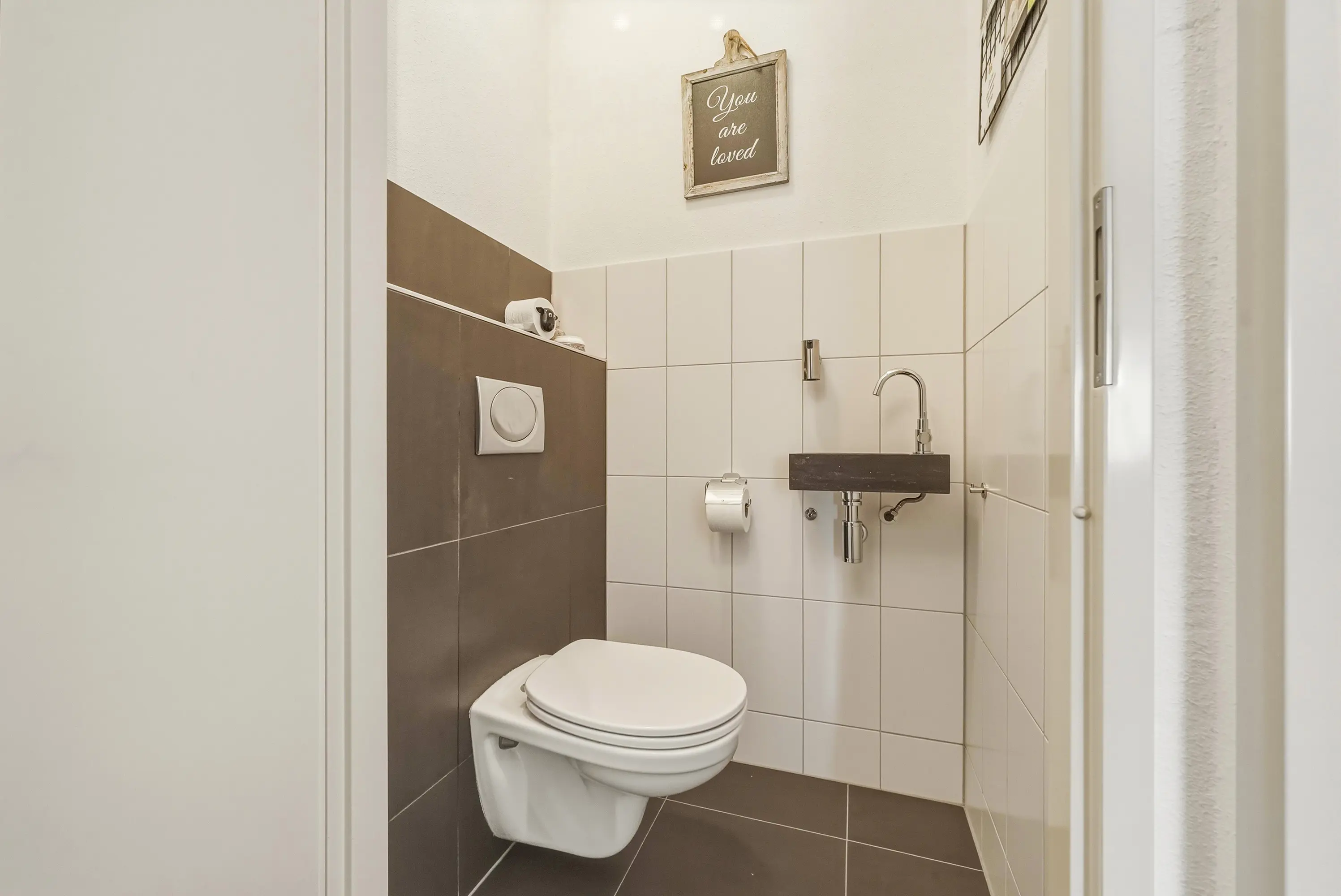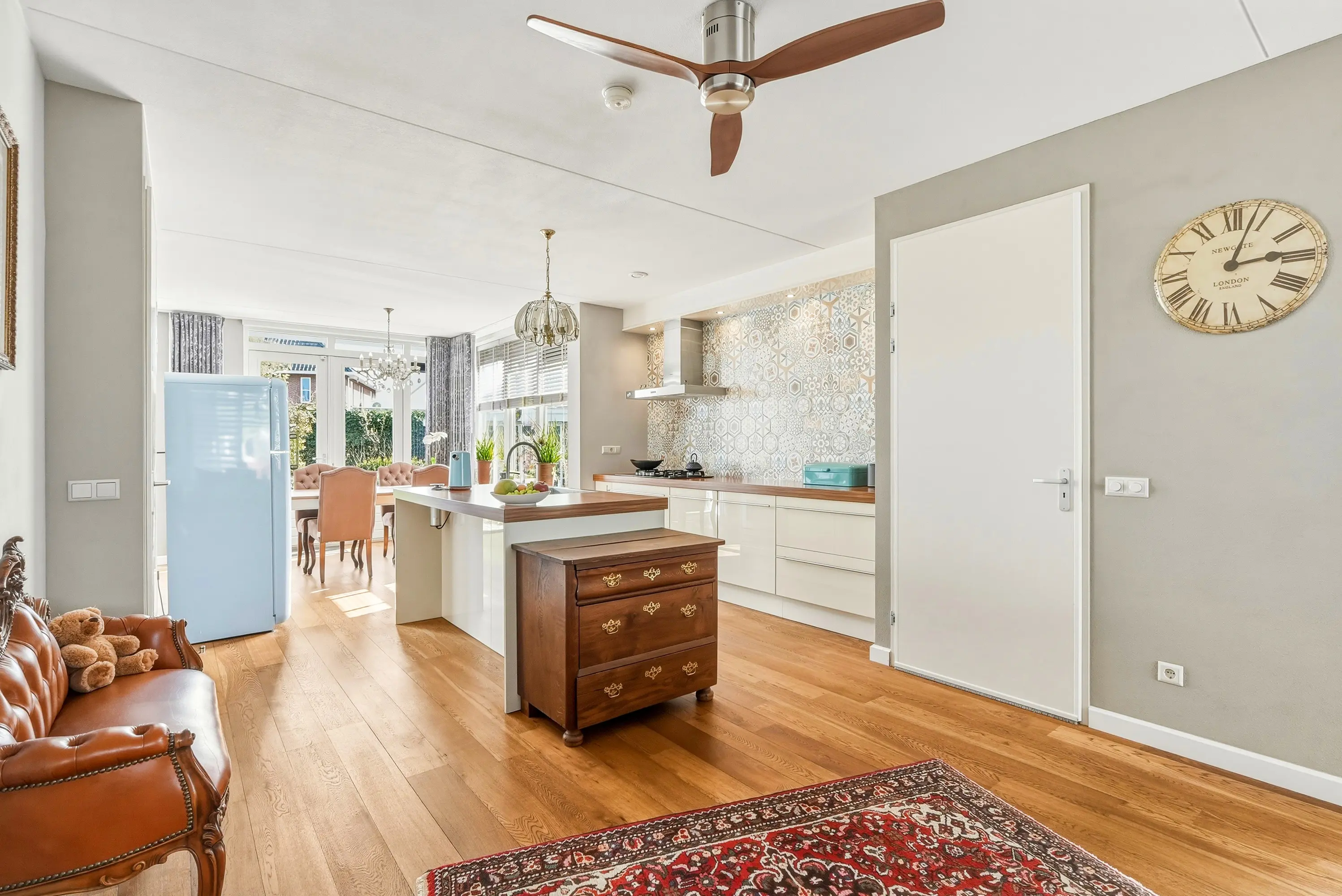 Hal, lichte woonkamer met trapkast en heerlijk ruime woonkeuken met dubbele tuindeur, spoeleiland en inbouwapparatuur: 5-pits gaskookplaat / wasemkap / vaatwasser / combi-magnetron / oven. Via een afgesloten portaal is het modern toilet met fonteintje bereikbaar en de trap naar de 1e verdieping.