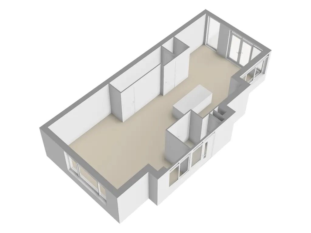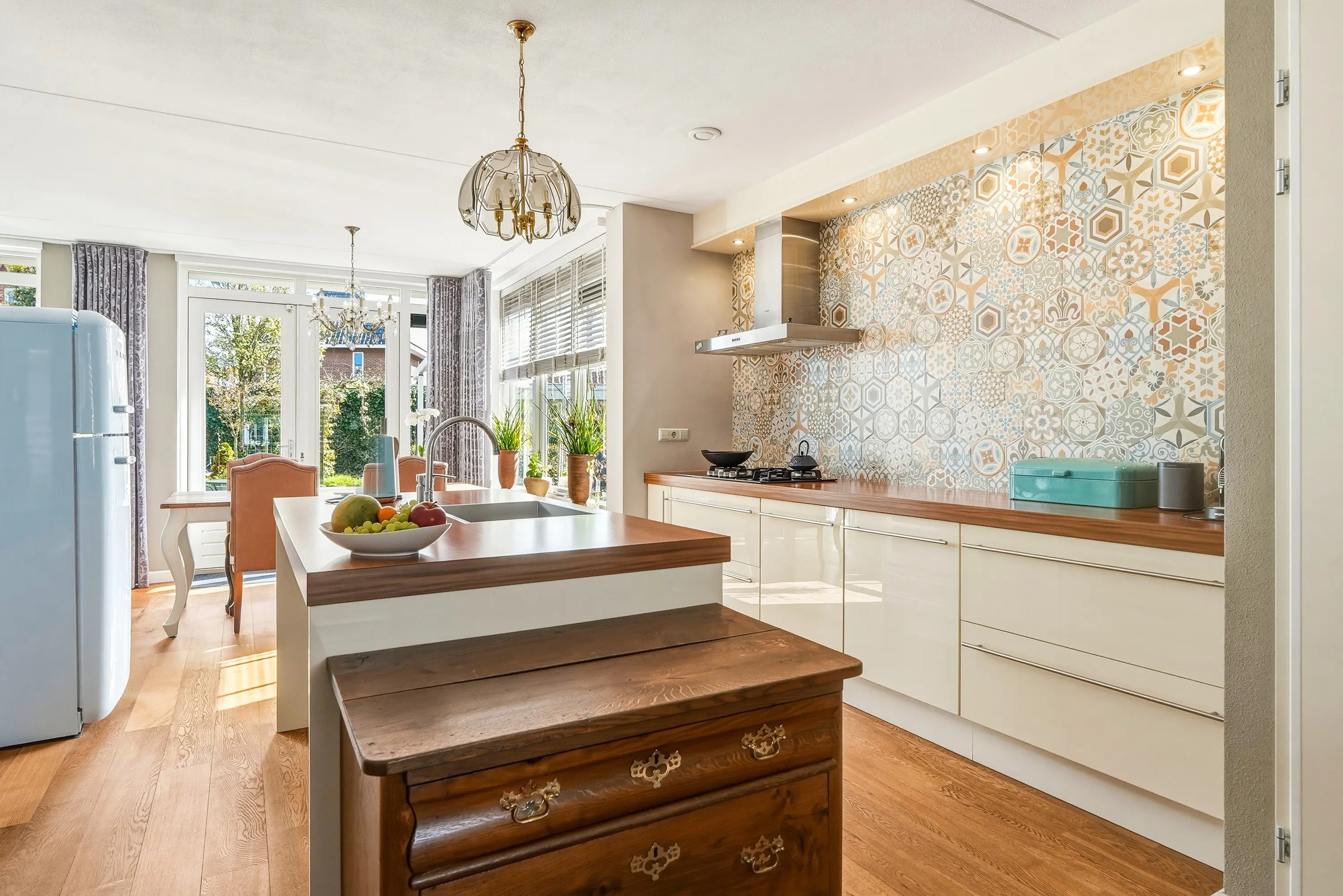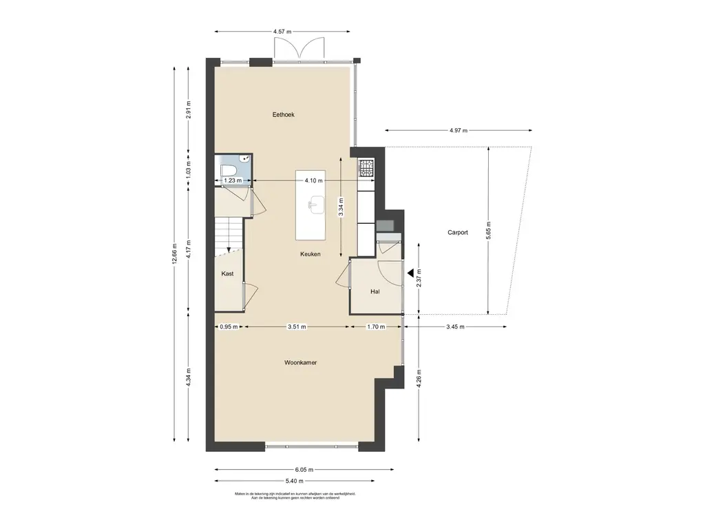 Hal, lichte woonkamer met trapkast en heerlijk ruime woonkeuken met dubbele tuindeur, spoeleiland en inbouwapparatuur: 5-pits gaskookplaat / wasemkap / vaatwasser / combi-magnetron / oven. Via een afgesloten portaal is het modern toilet met fonteintje bereikbaar en de trap naar de 1e verdieping.