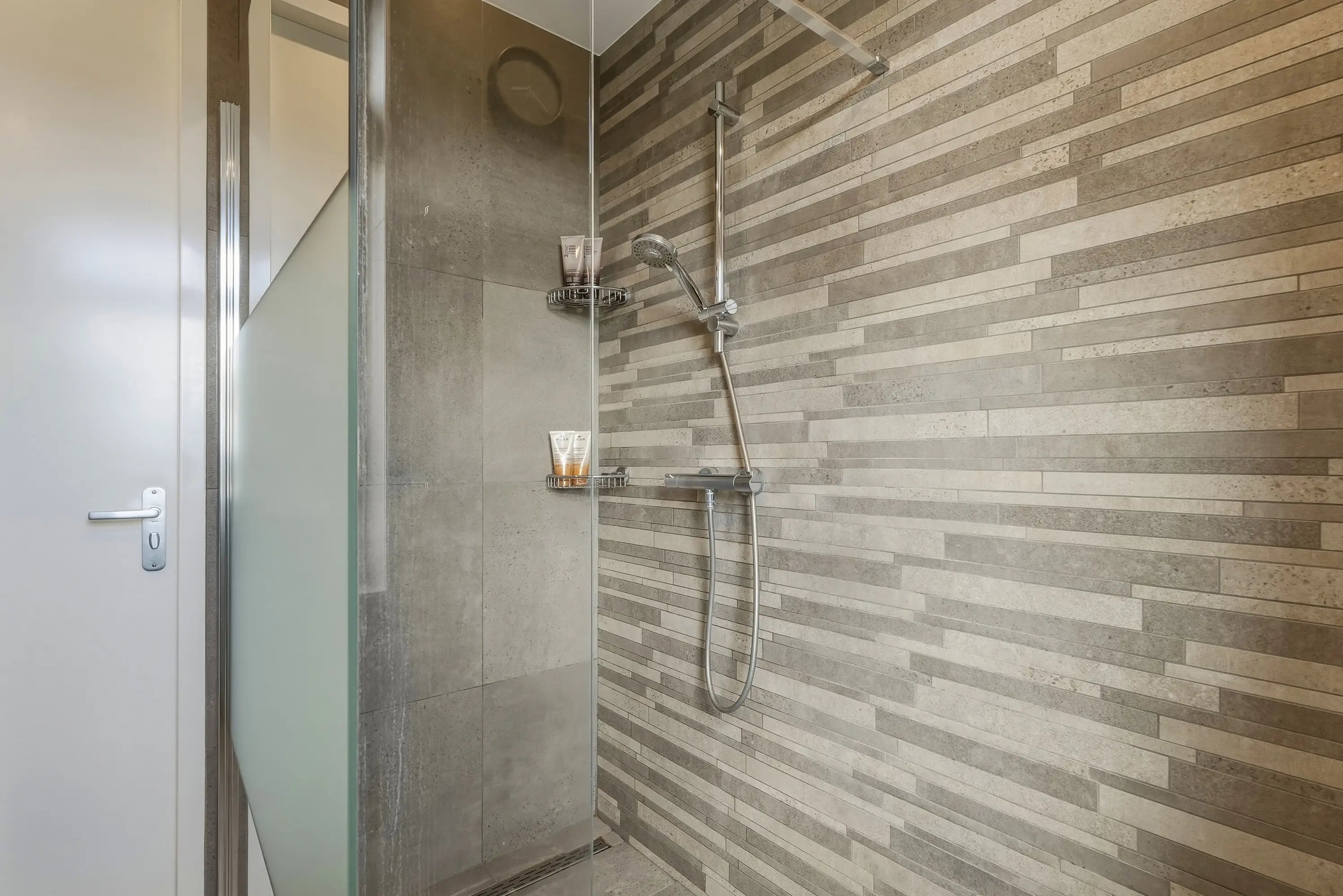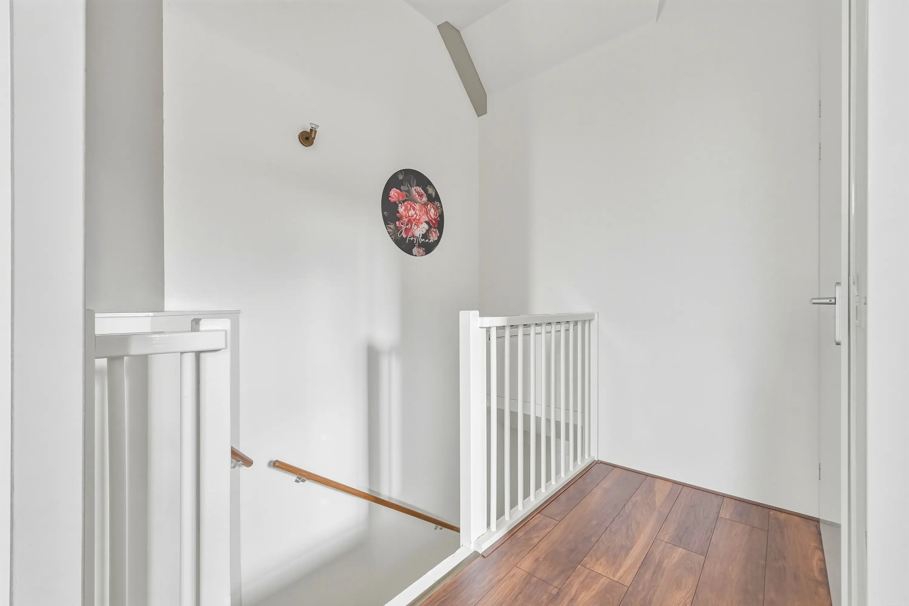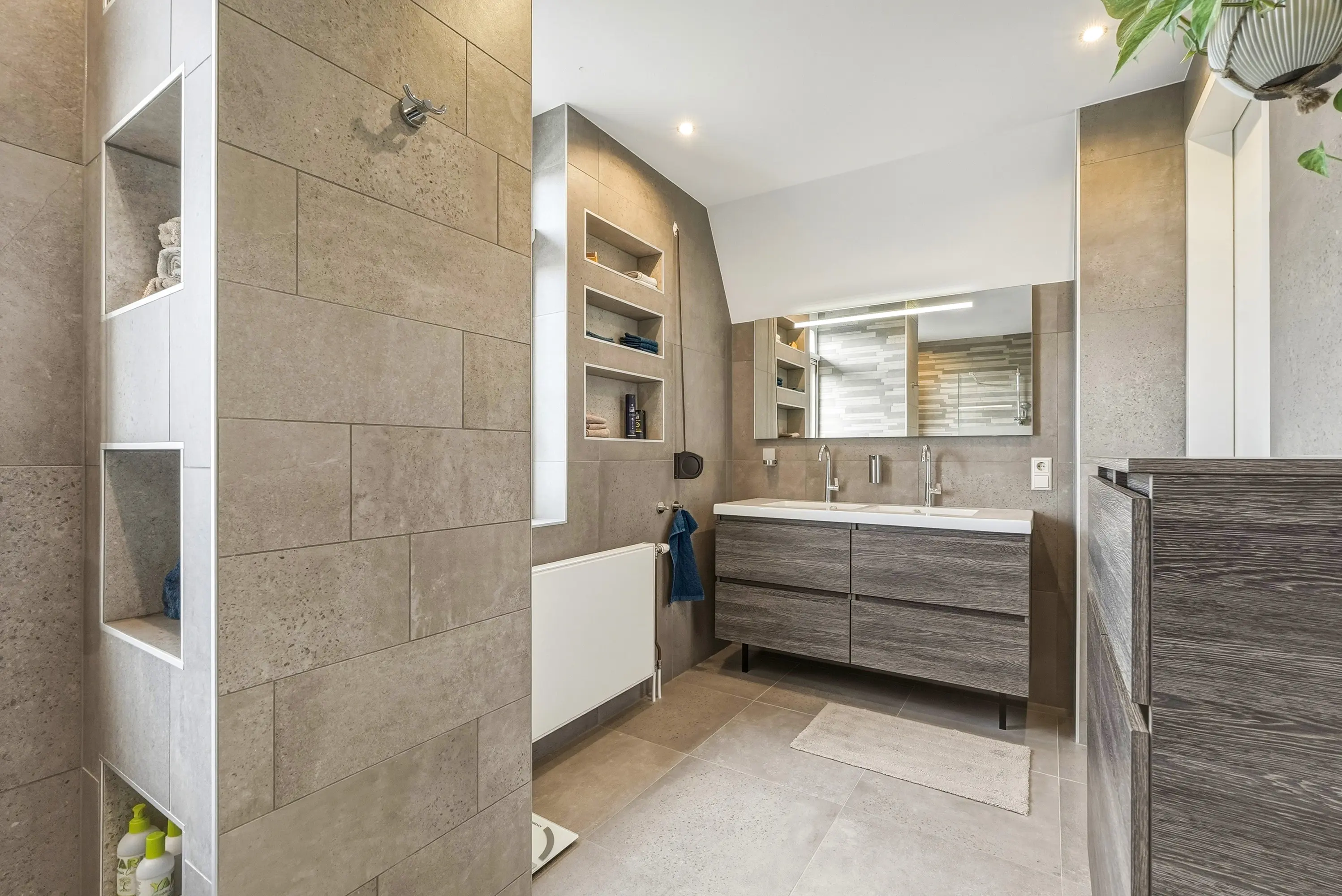 Overloop met vaste trap naar de 2e verdieping, separaat modern toilet, twee slaapkamers waarvan een ruime masterbedroom en een kleinere slaapkamer, luxe volledig betegelde badkamer voorzien van rolluik, inloopdouche en dubbel wastafelmeubel.