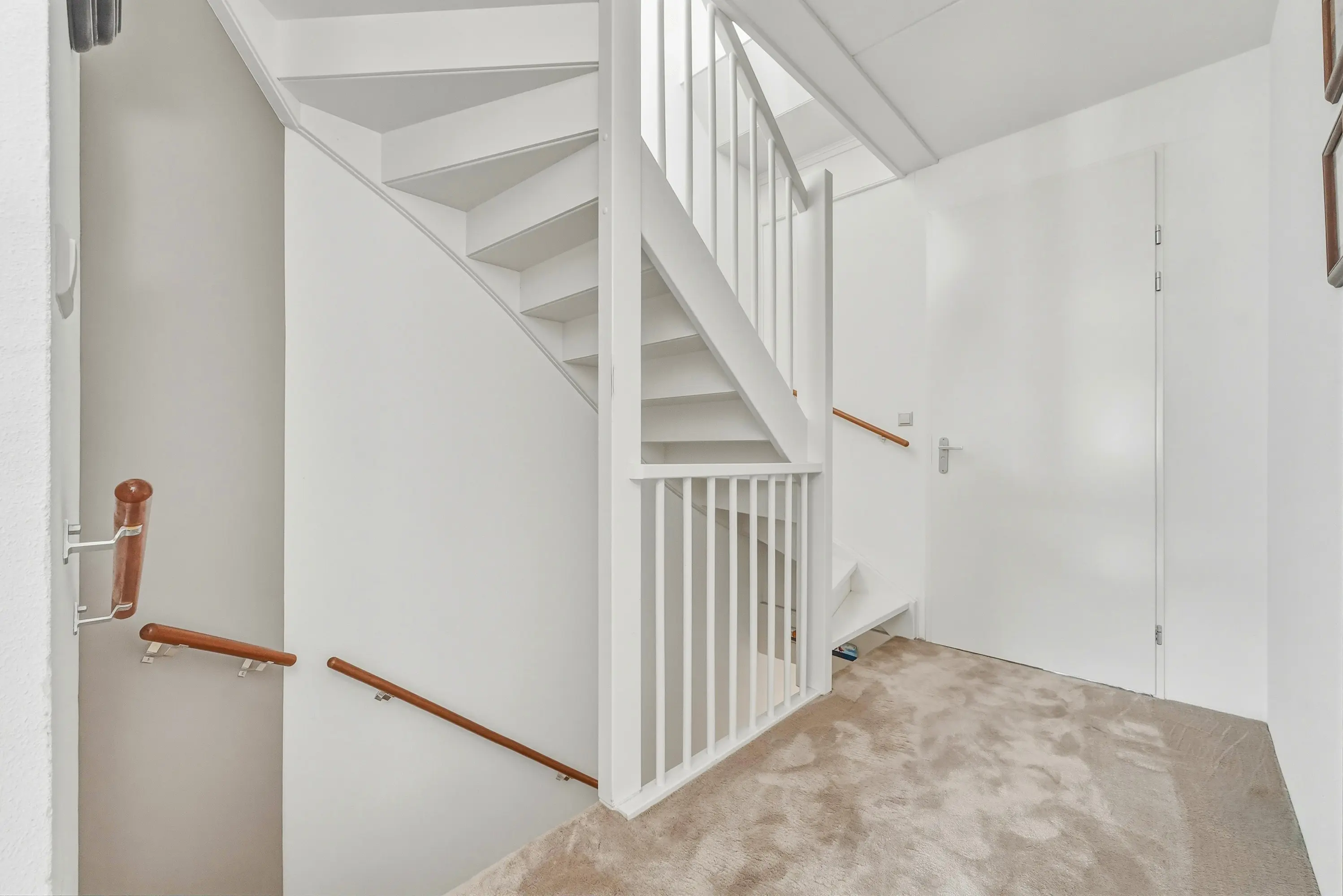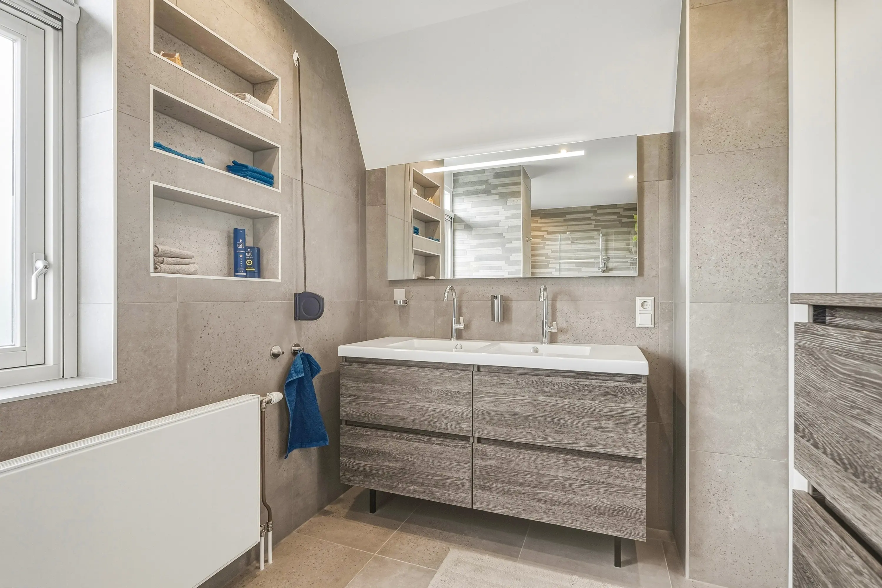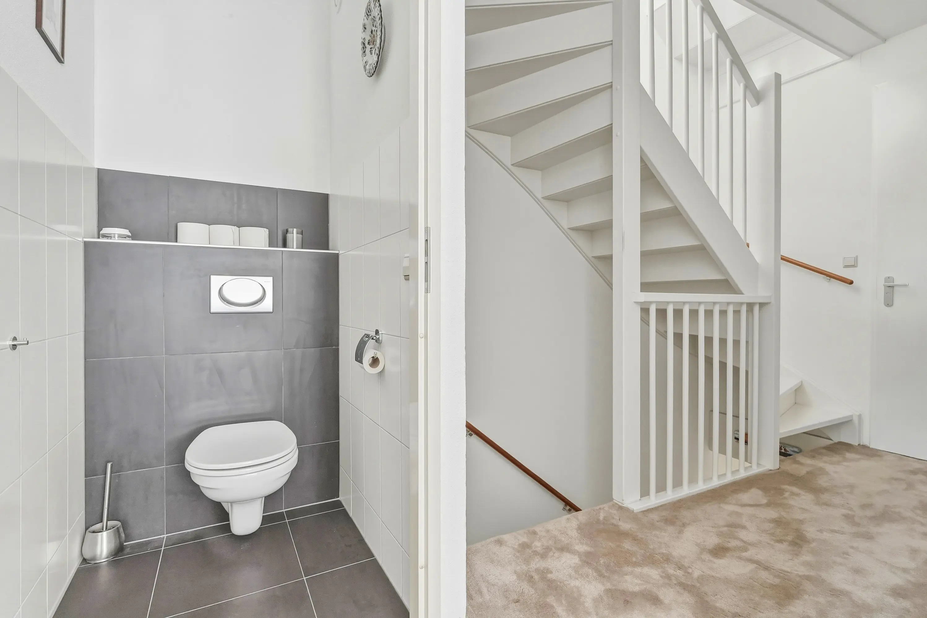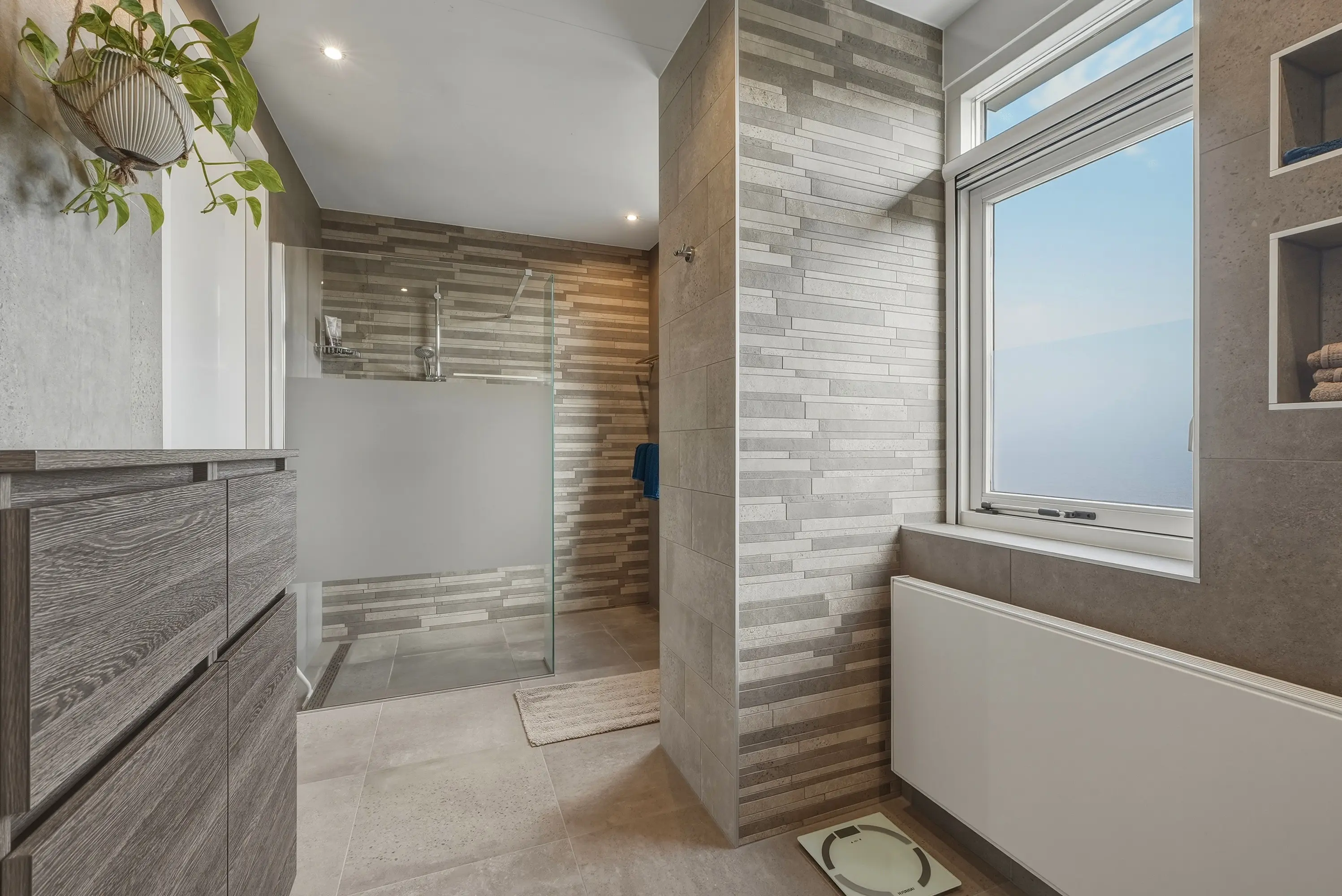 Overloop met vaste trap naar de 2e verdieping, separaat modern toilet, twee slaapkamers waarvan een ruime masterbedroom en een kleinere slaapkamer, luxe volledig betegelde badkamer voorzien van rolluik, inloopdouche en dubbel wastafelmeubel.