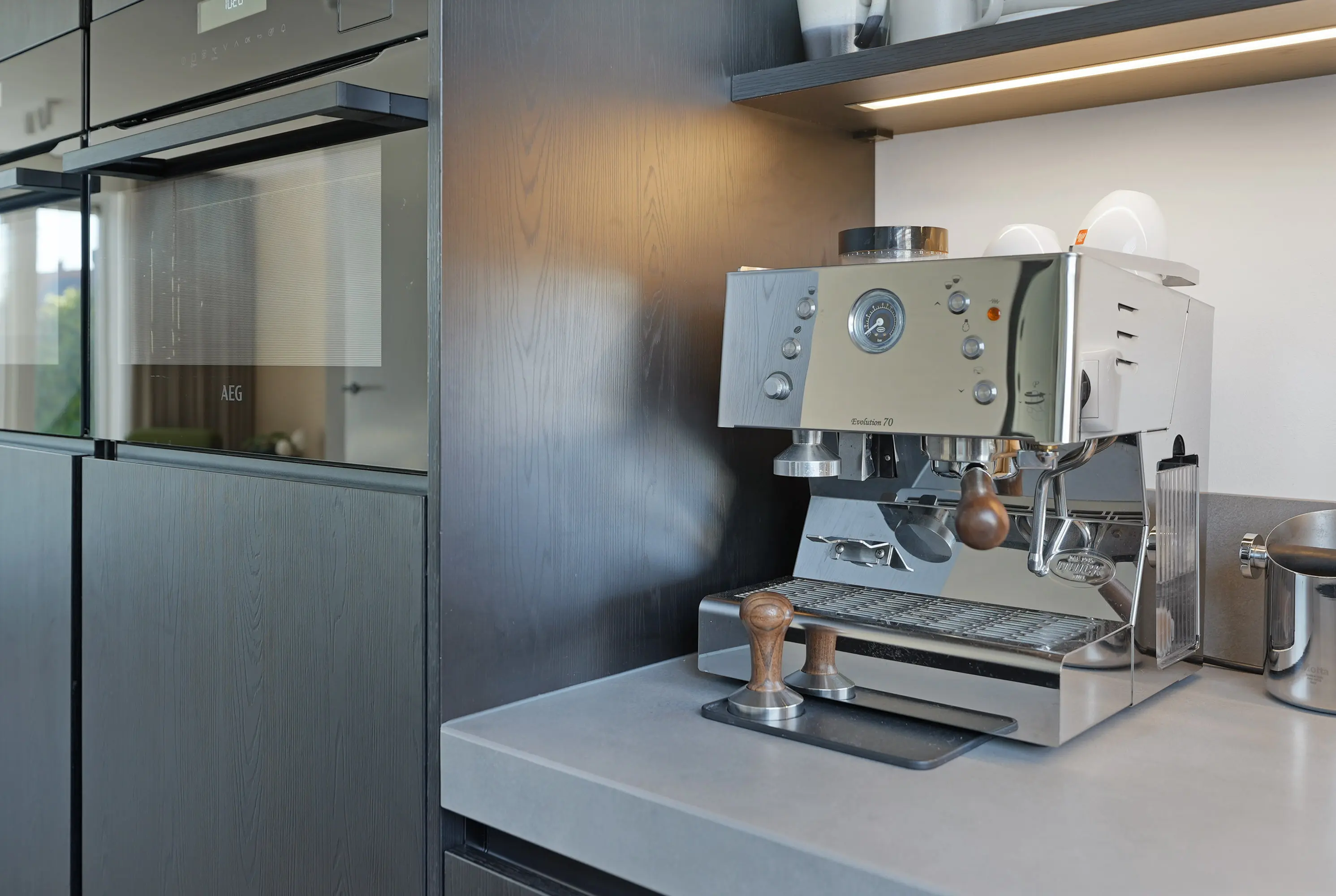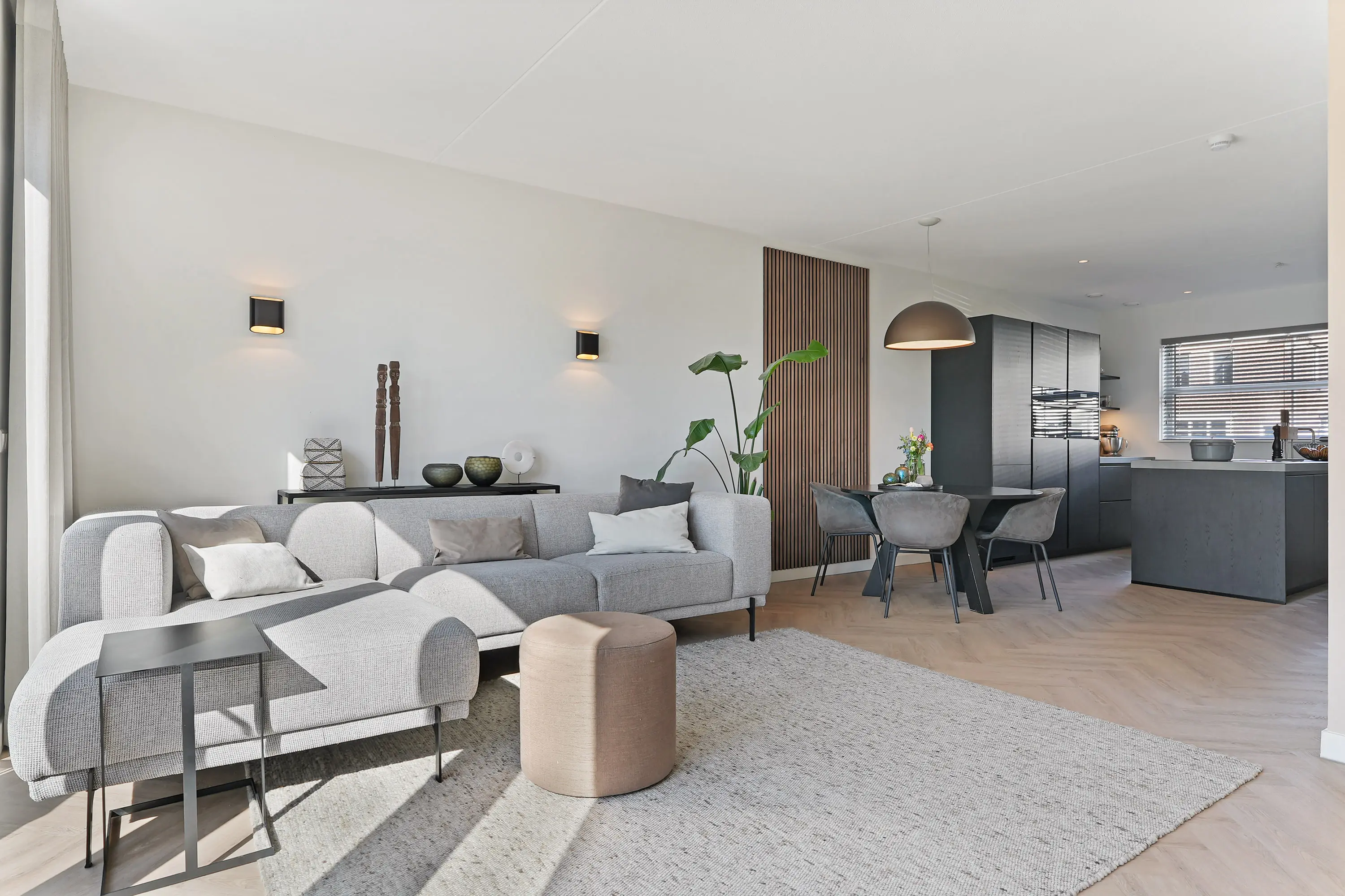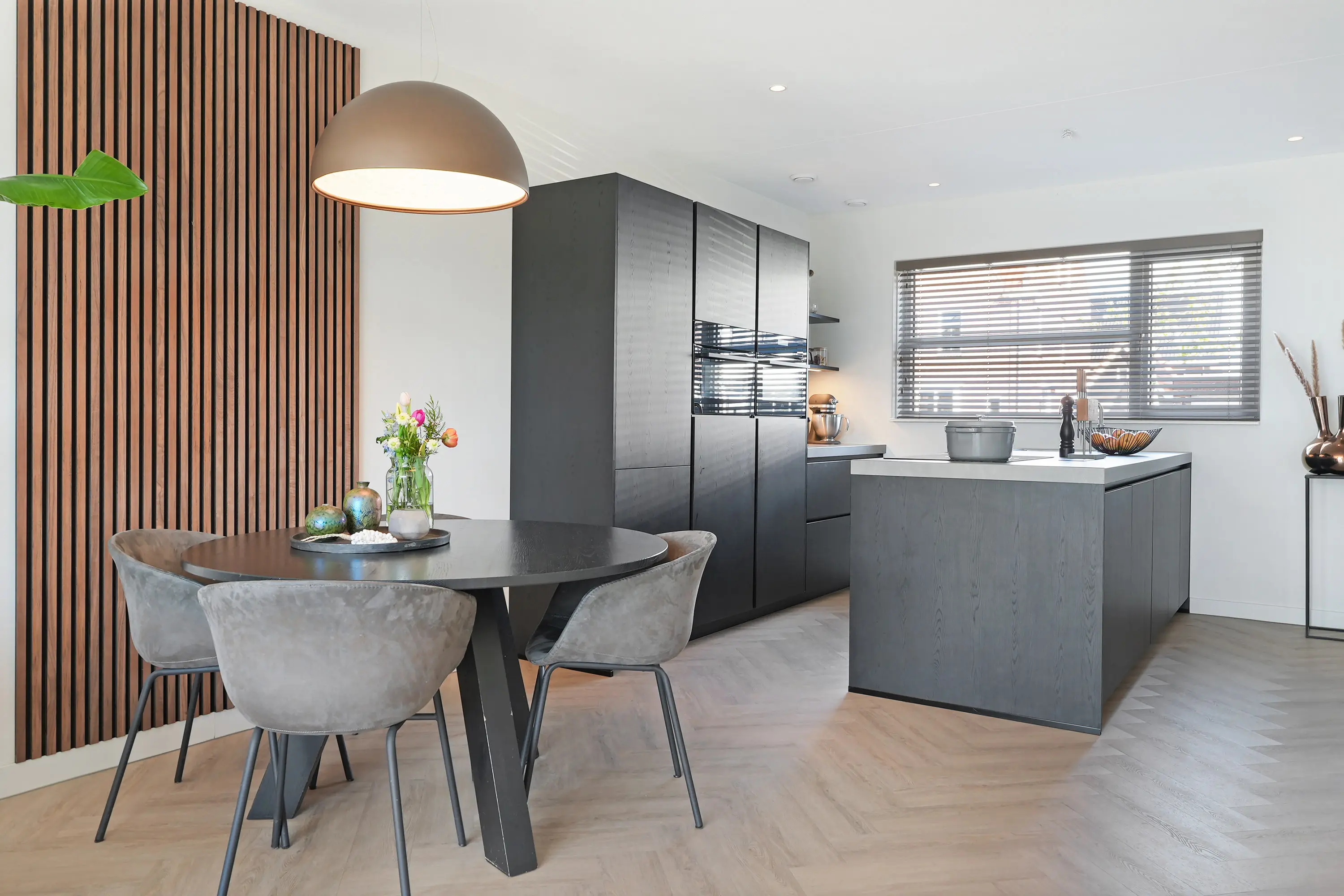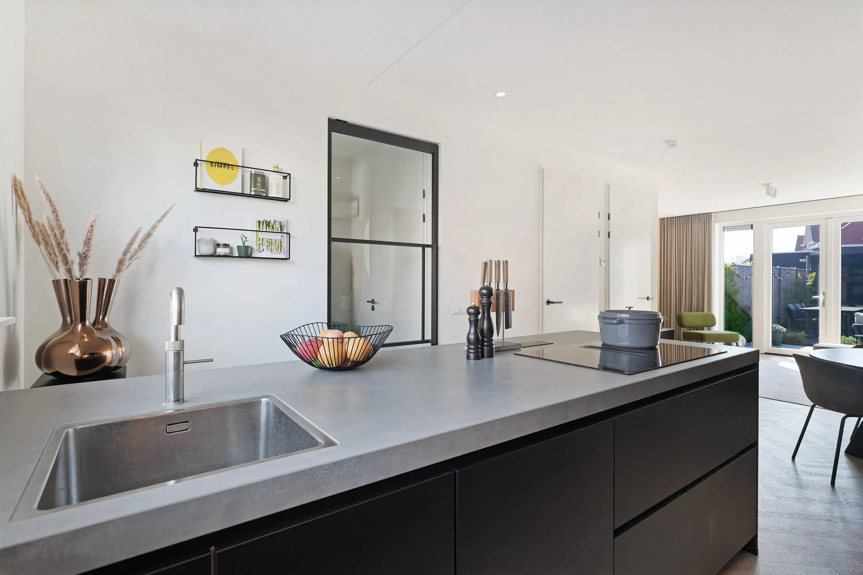 Het hart van de woning is de moderne keuken met kookeiland. Deze keuken nodigt uit tot koken, tafelen en samenzijn. De keuken beschikt over een oven én stoomoven, inductiekookplaat met geïntegreerde afzuiging, Quooker en een ingebouwde koelkast en vriezer. Praktisch, luxe én een echte blikvanger. De begane grond is afgewerkt met een PVC-visgraatvloer, wat de woning een warme en luxe uitstraling geeft.