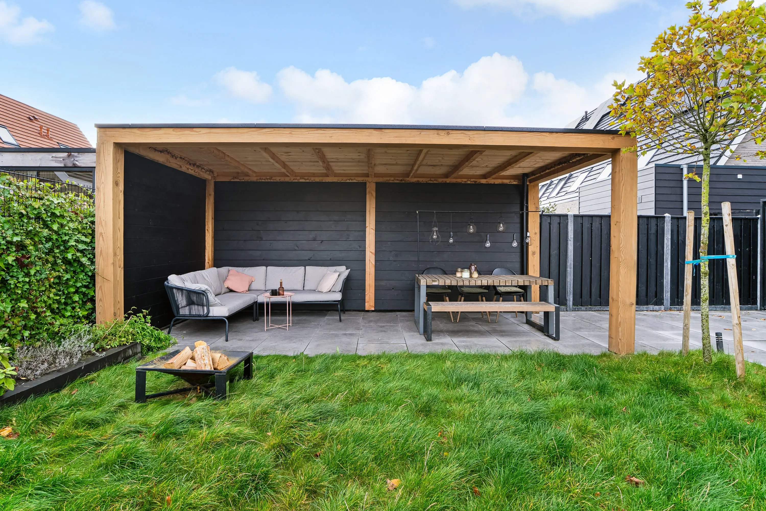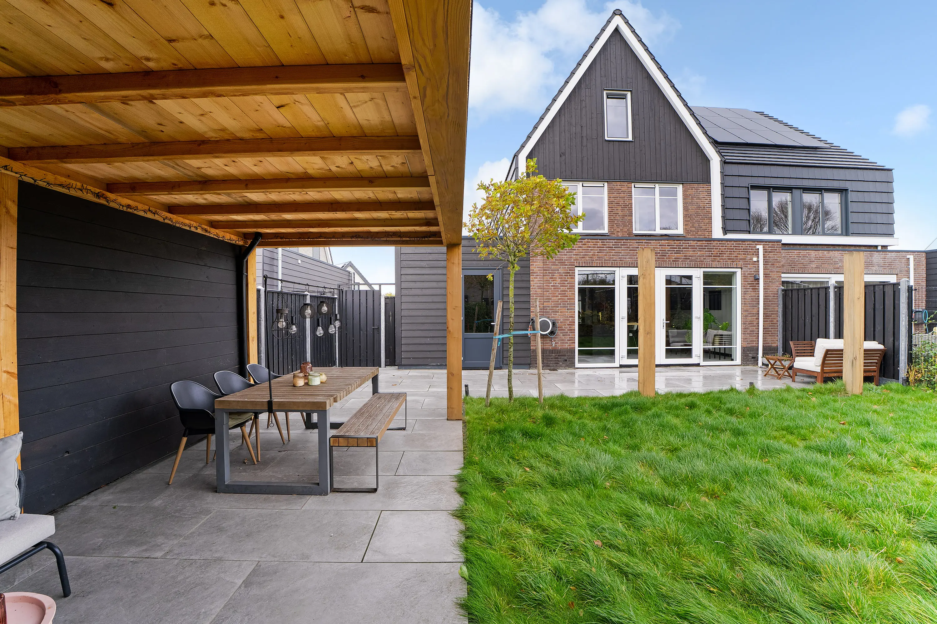 De tuin is zonovergoten, volledig aangelegd en onderhoudsarm. Door het ontbreken van hoge bebouwing geniet u volop privacy en een vrij uitzicht. De tuin is voorzien van een groot terras, een gazon en een fraaie Douglas-overkapping – dé plek voor lange zomeravonden in een comfortabele loungehoek.