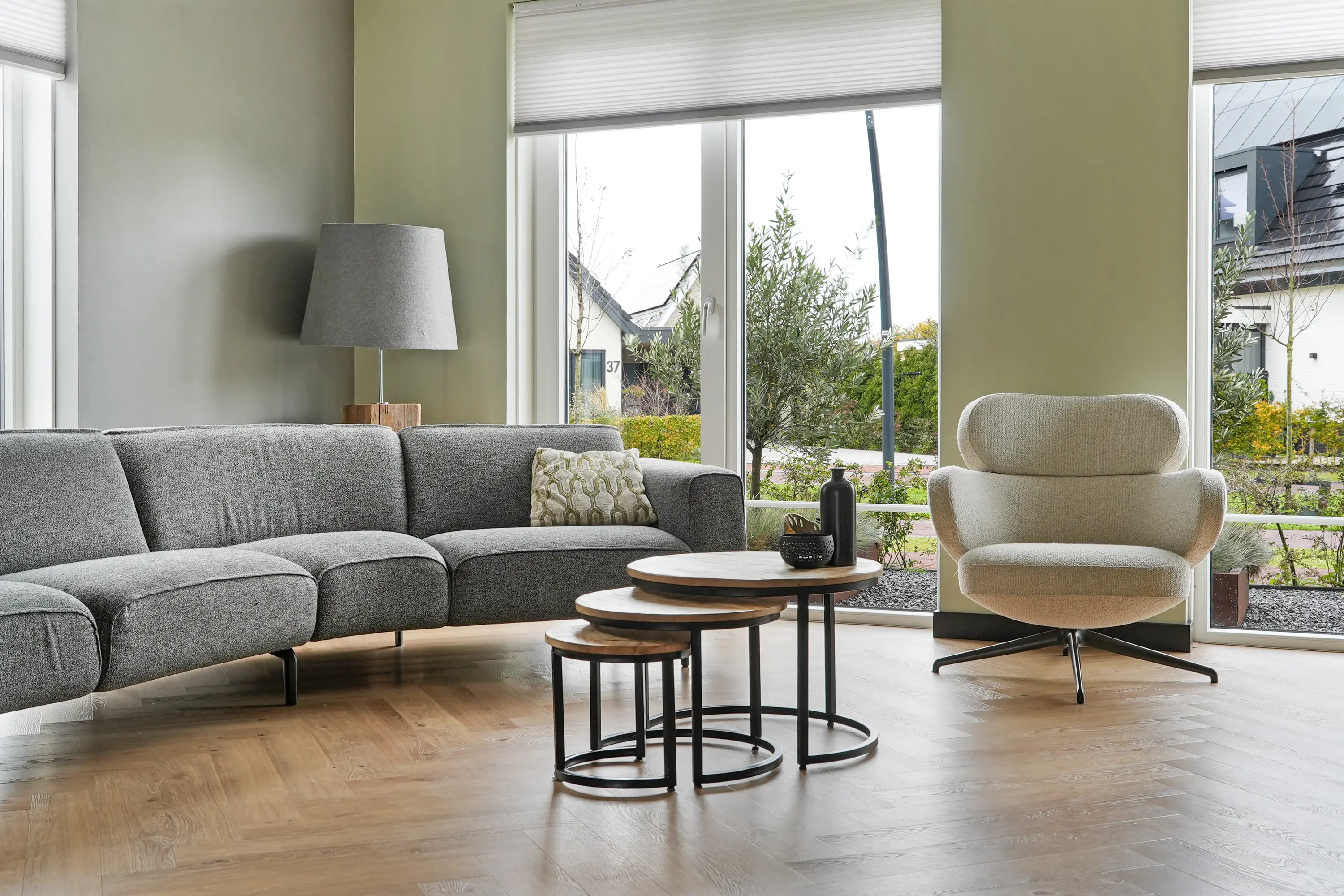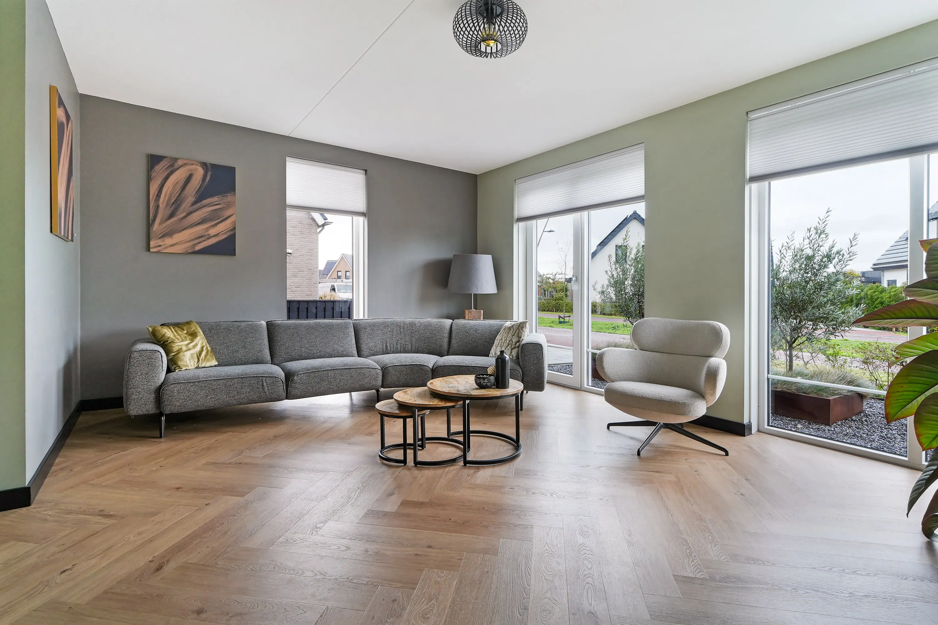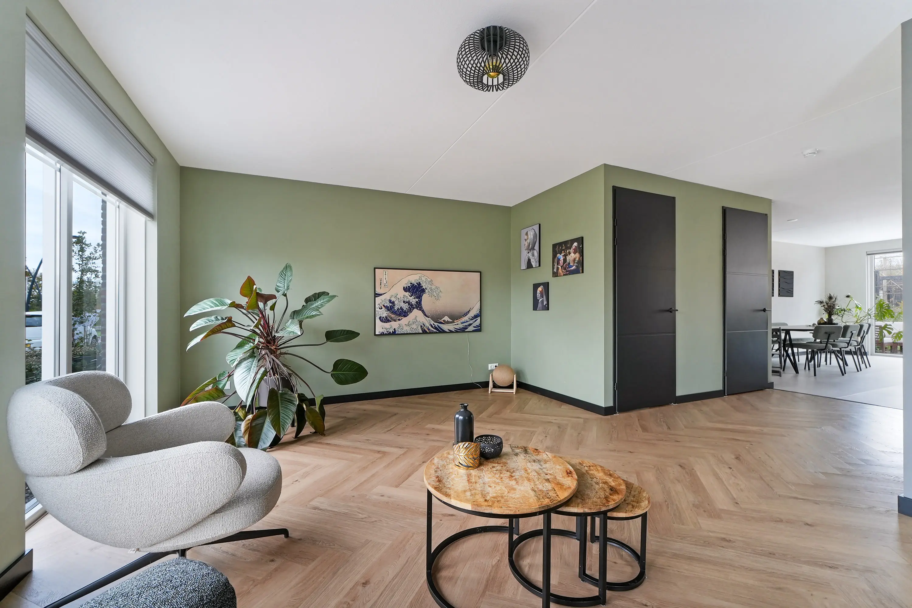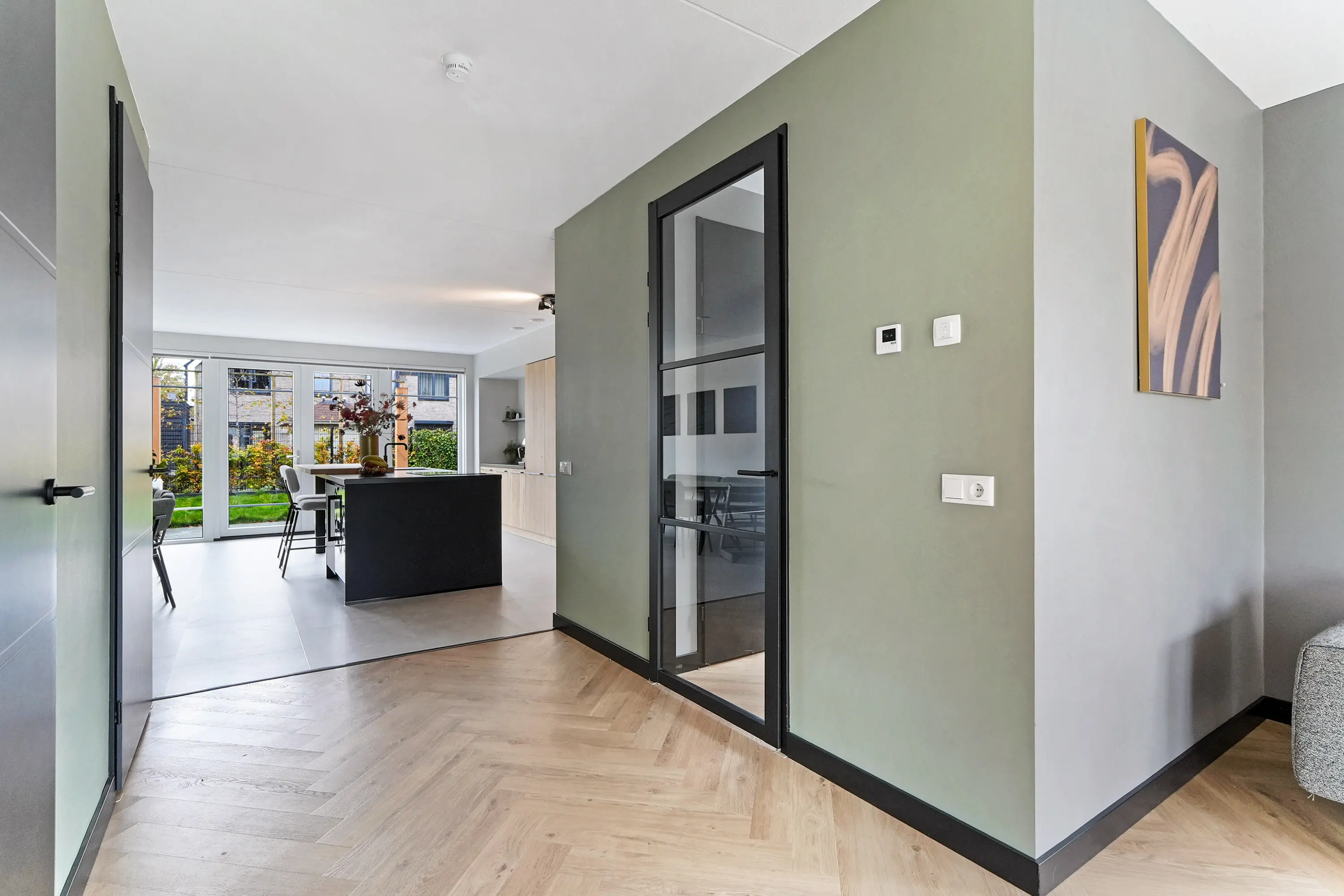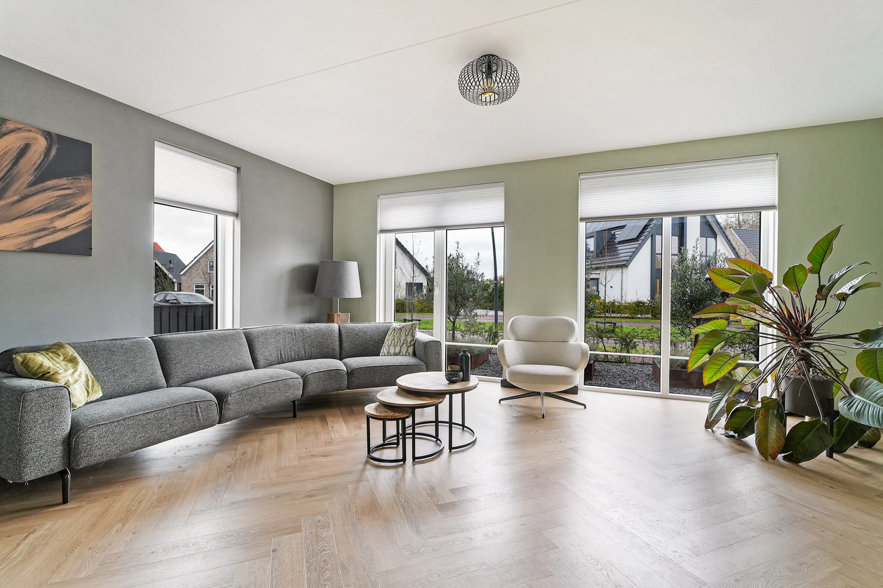 Via de eigen oprit bereikt u de zij-entree, die toegang biedt tot de ruime hal met meterkast, garderobe en toilet. Vanuit hier betreedt u de woonkamer, waar direct de lichte en luxe woonsfeer opvalt. De royale zithoek aan de voorzijde is voorzien van plafondhoge ramen, wat zorgt voor een heerlijk lichte leefruimte met uitzicht op de groene laan.