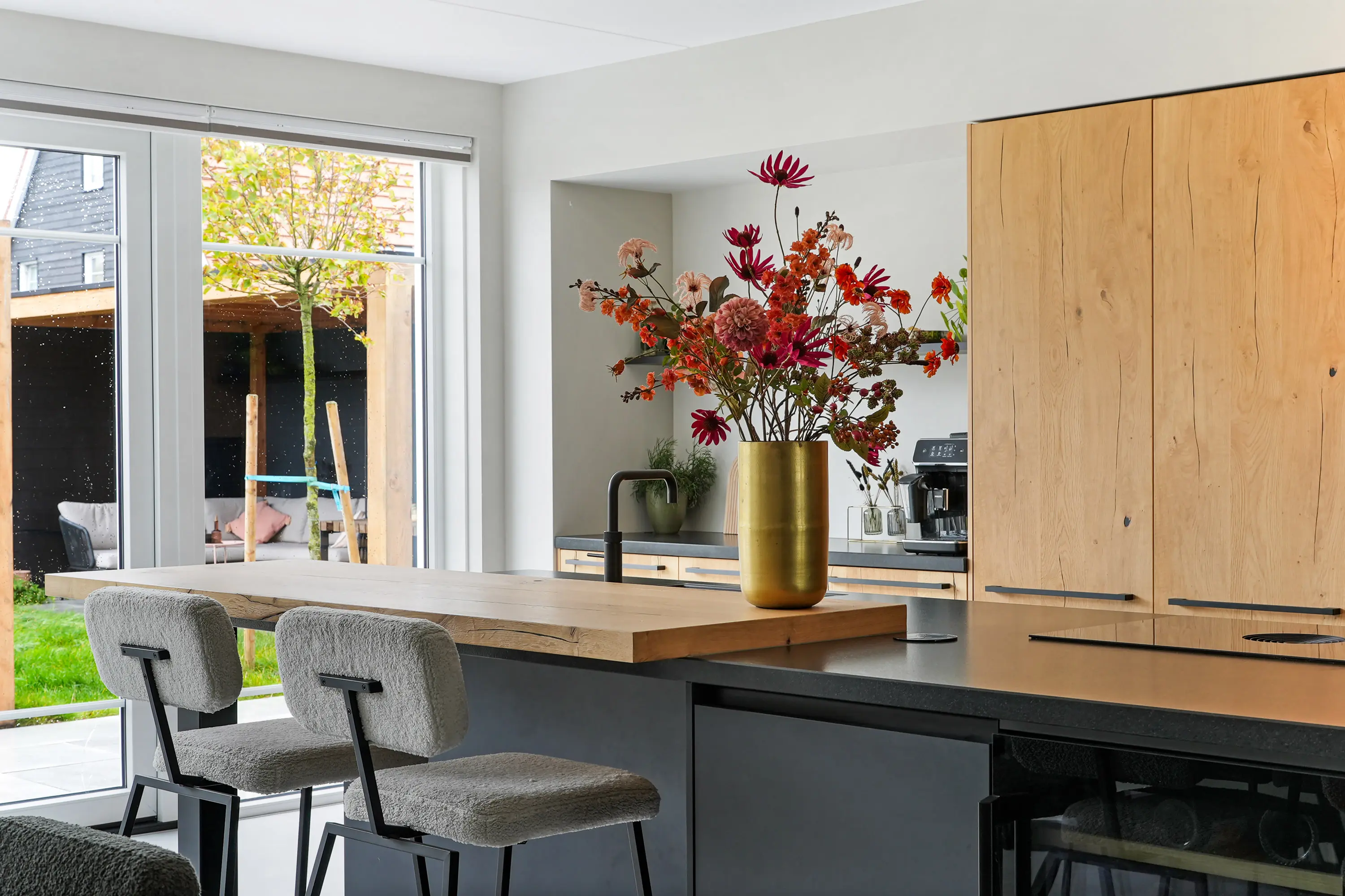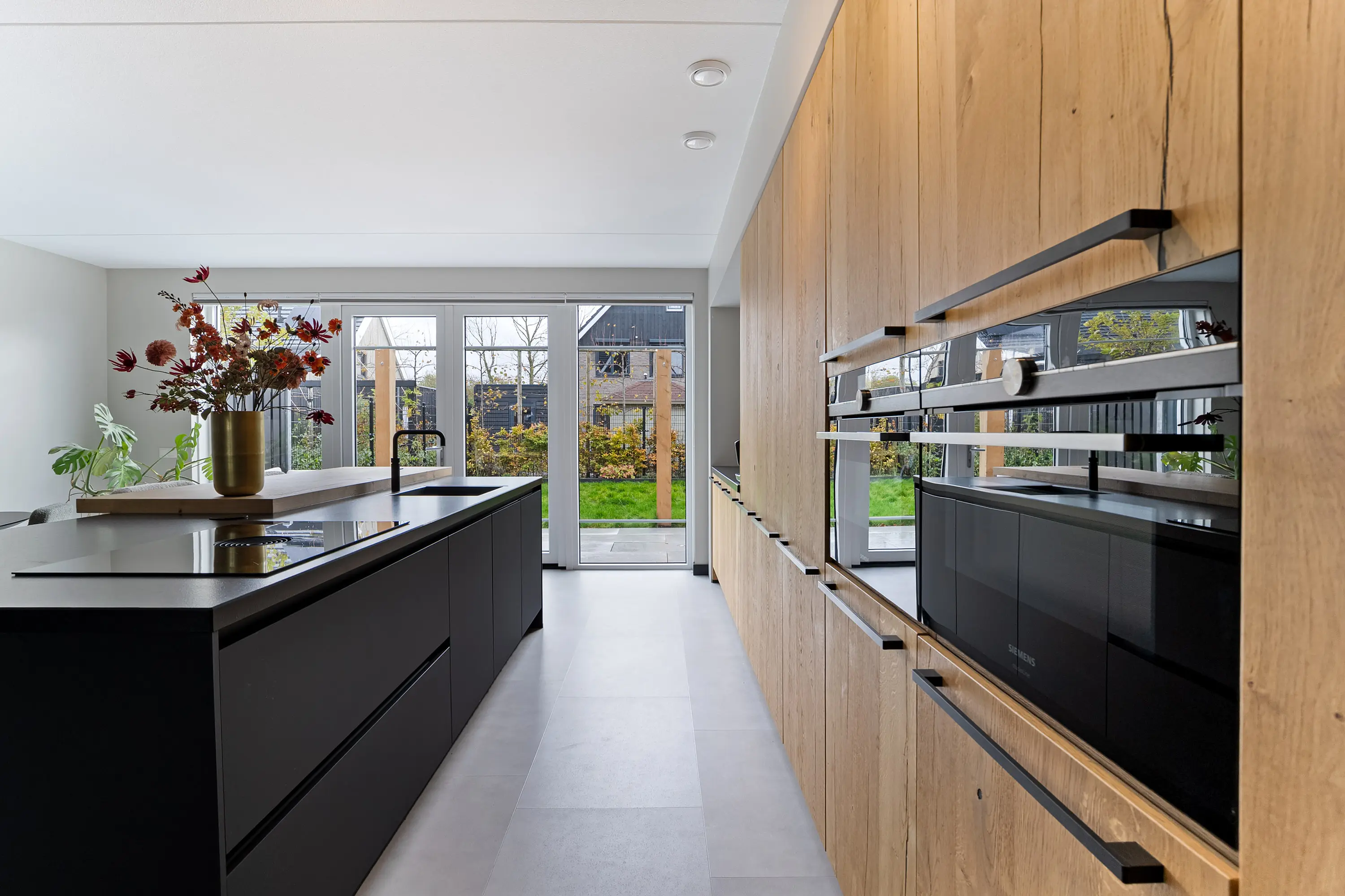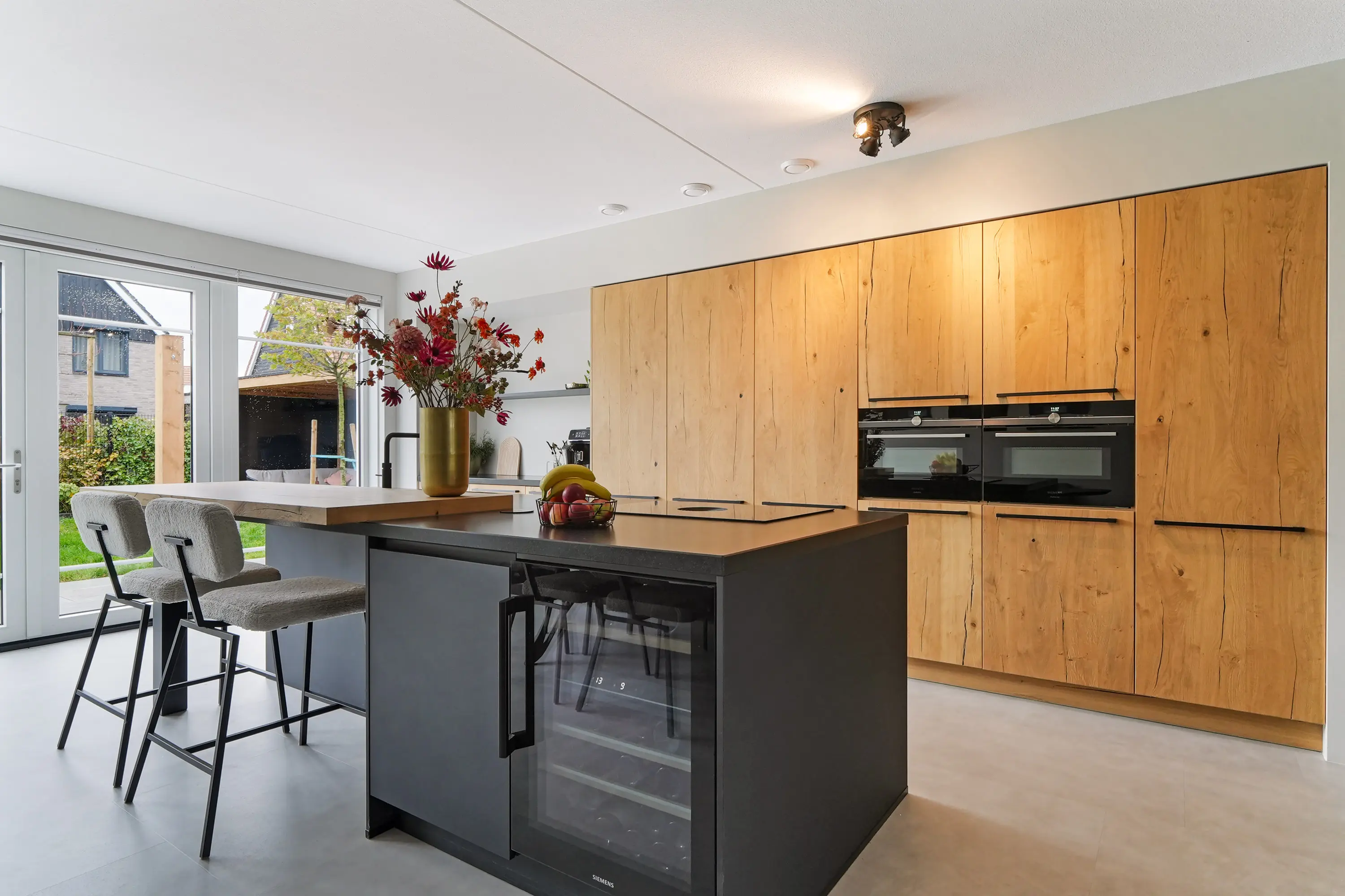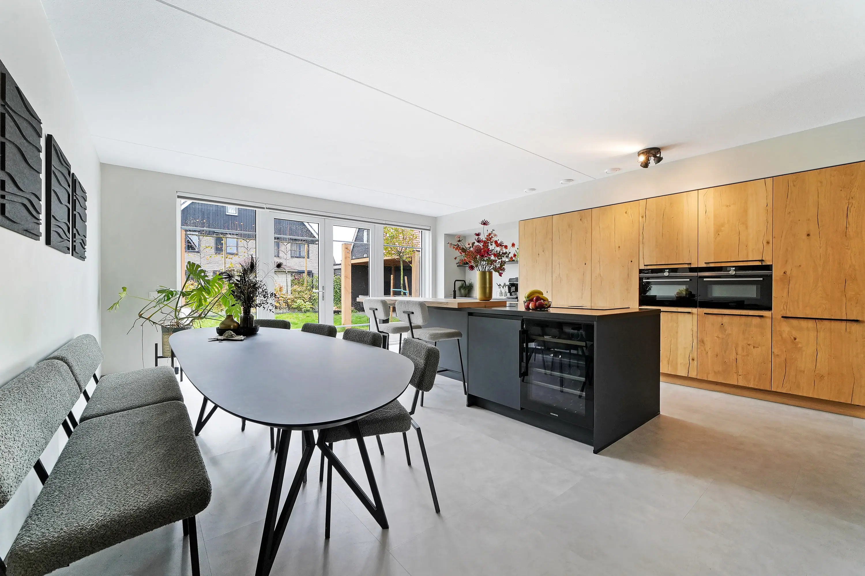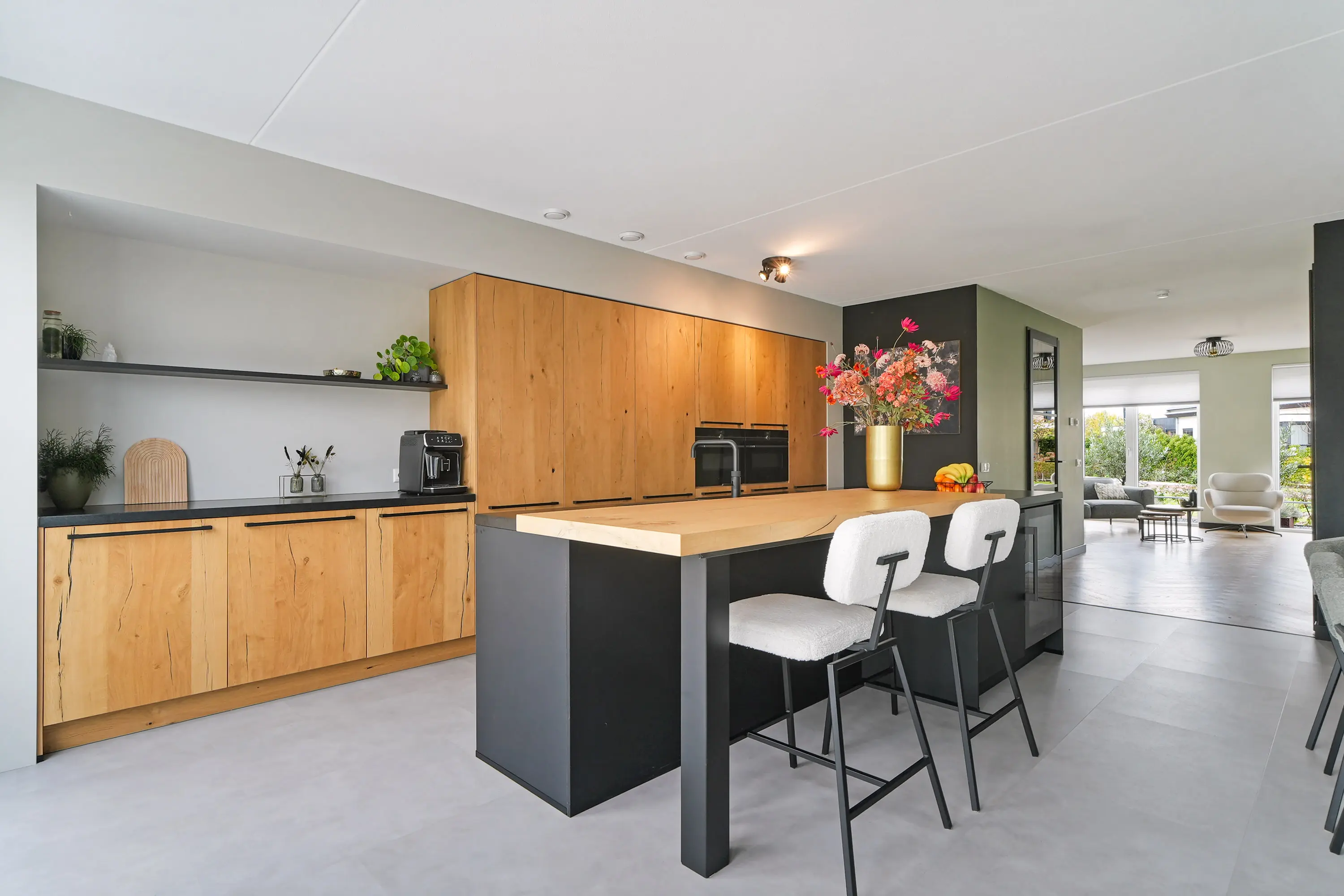 Aan de tuinzijde bevindt zich de riante woonkeuken – een echte blikvanger! Deze fantastische keuken met groot kookeiland en bar is uitgevoerd in hoogwaardige materialen en voorzien van complete inbouwapparatuur, zoals o.a. een Quooker en wijnkoeler. Via de openslaande deuren loopt u zo de tuin in. Tussen woonkamer en keuken vindt u de trapkast en de trapopgang naar de eerste verdieping.