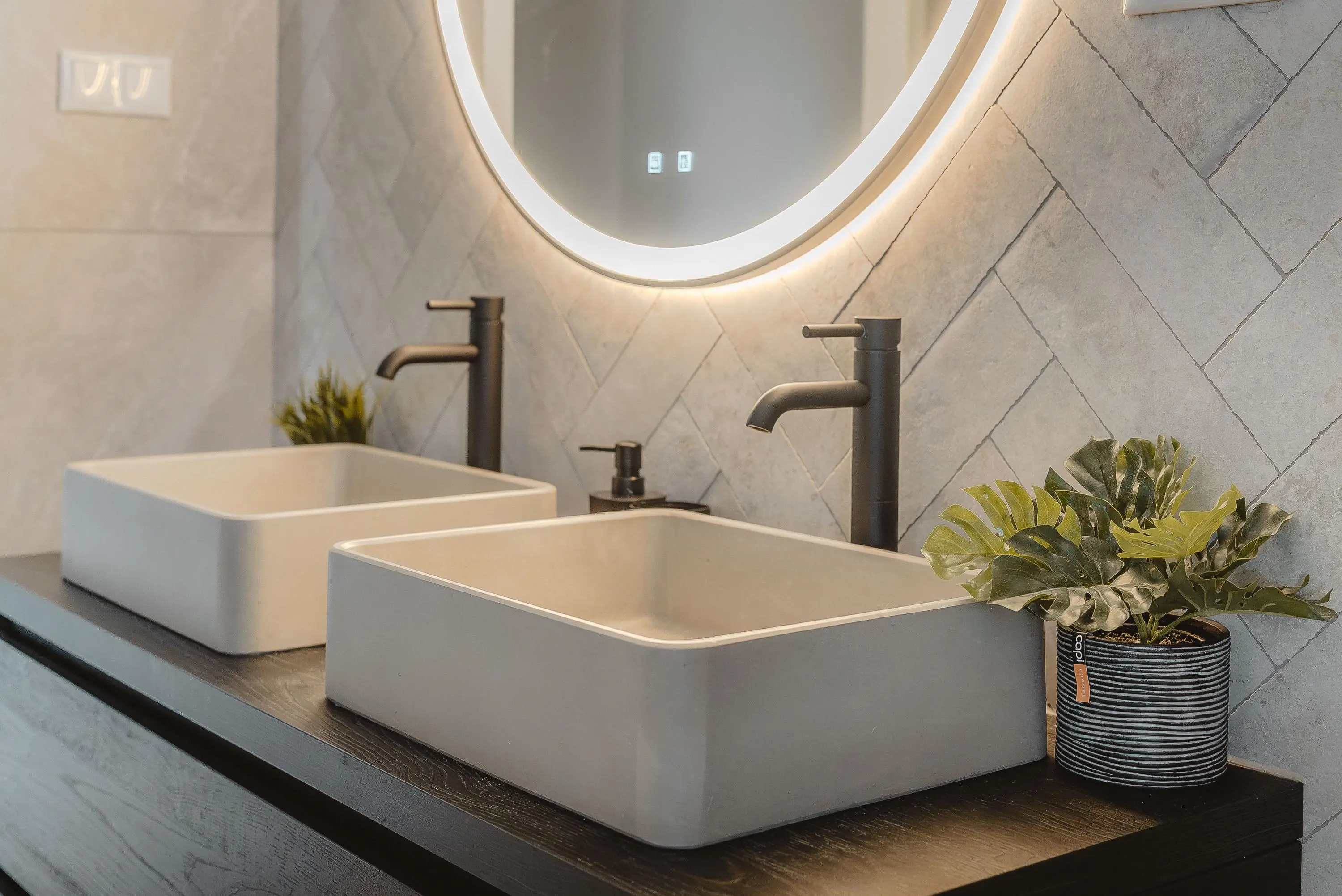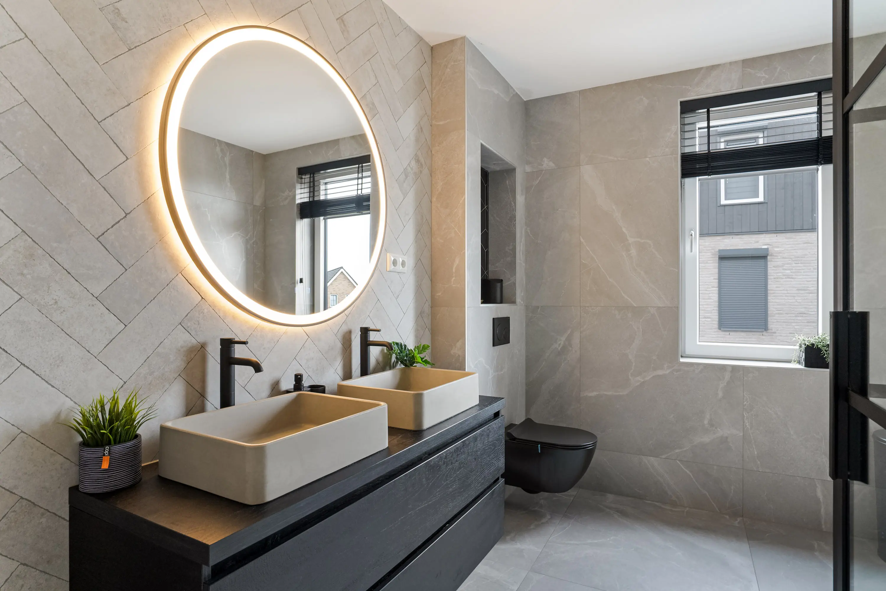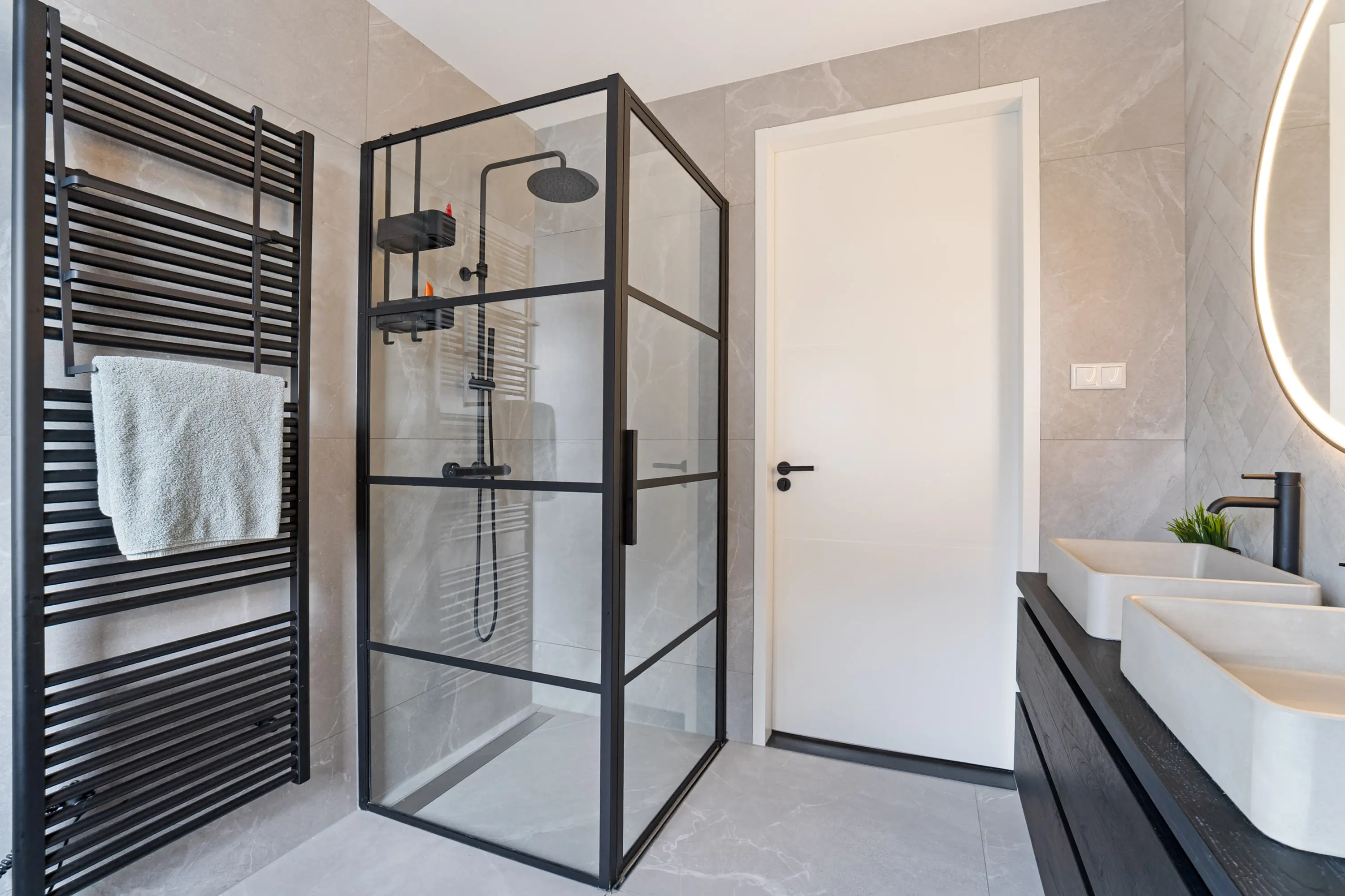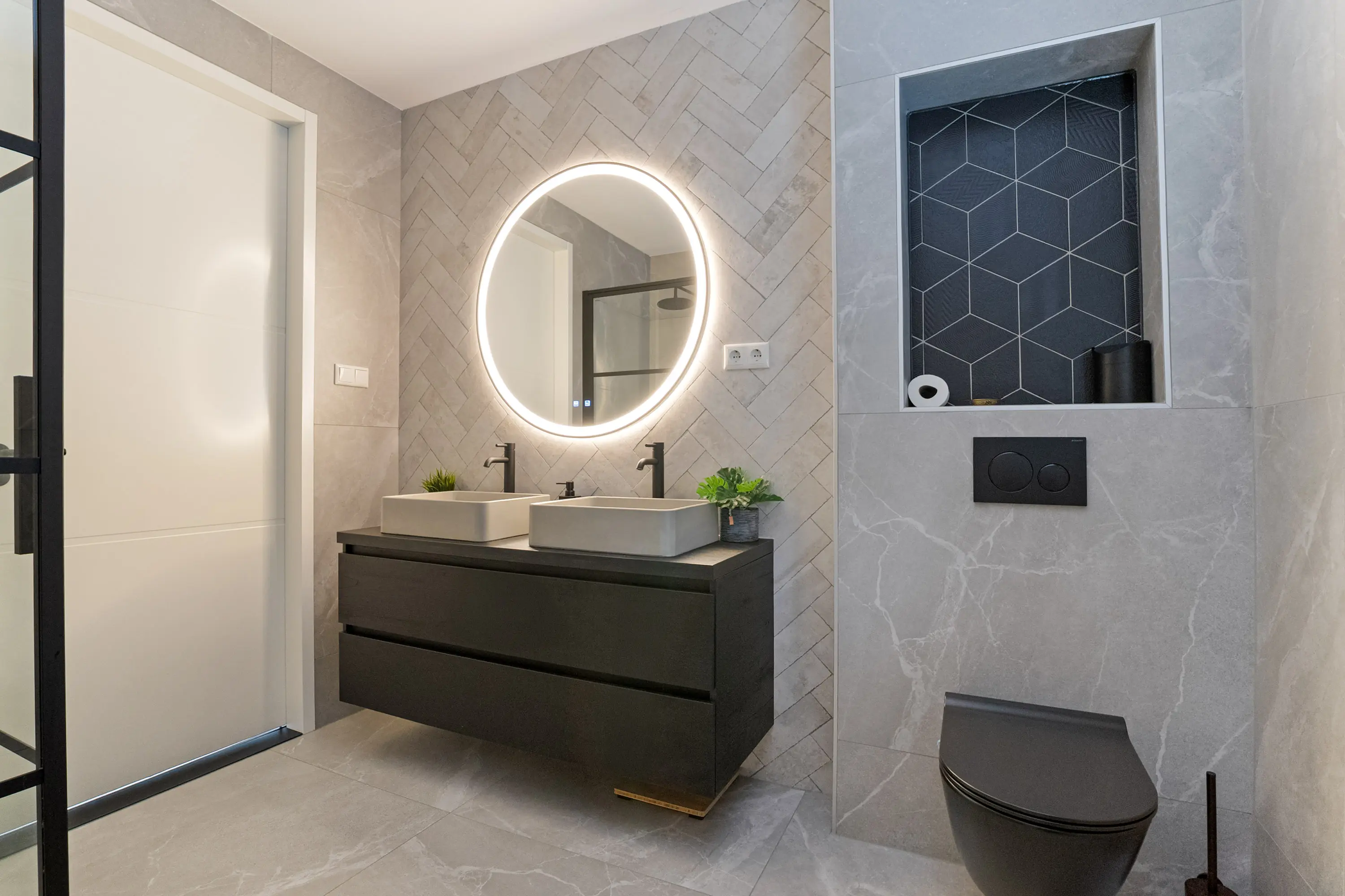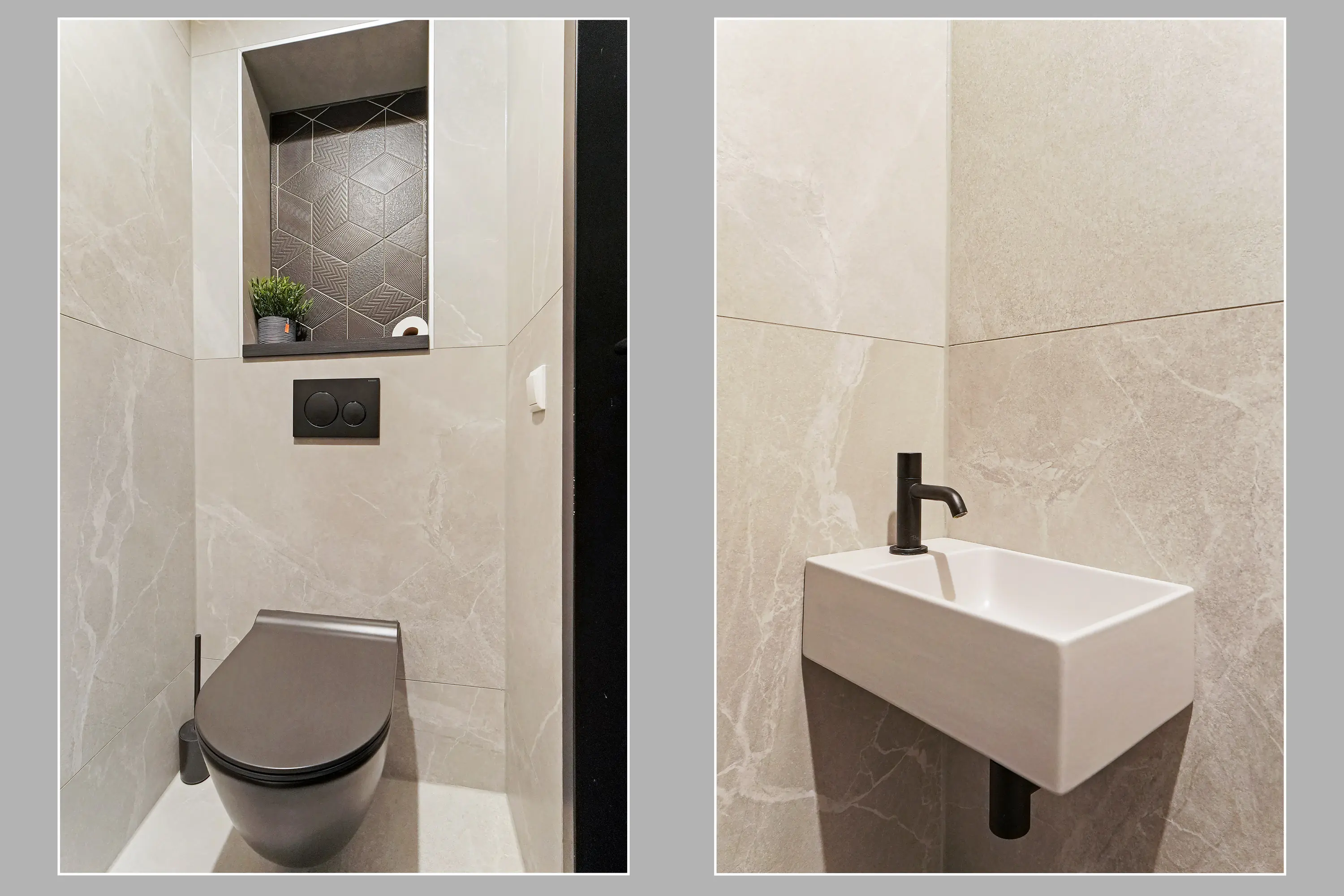 De badkamer is stijlvol en luxe uitgevoerd met een inloopdouche, tweede toilet en dubbel wastafelmeubel. De combinatie van visgraatwandtegels, grote vloertegels (90x90) en donkere accenten creëert een eigentijdse en luxe uitstraling.