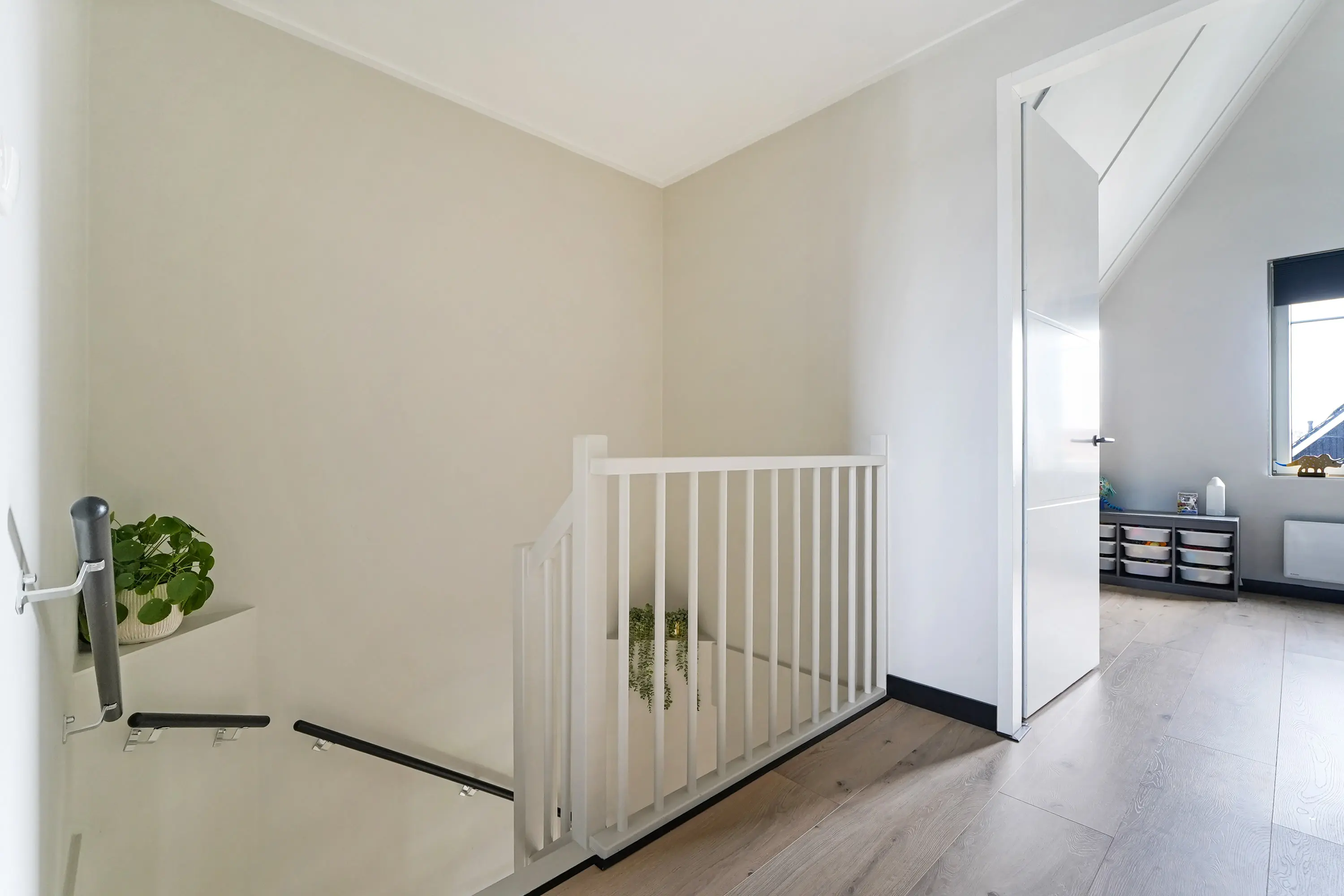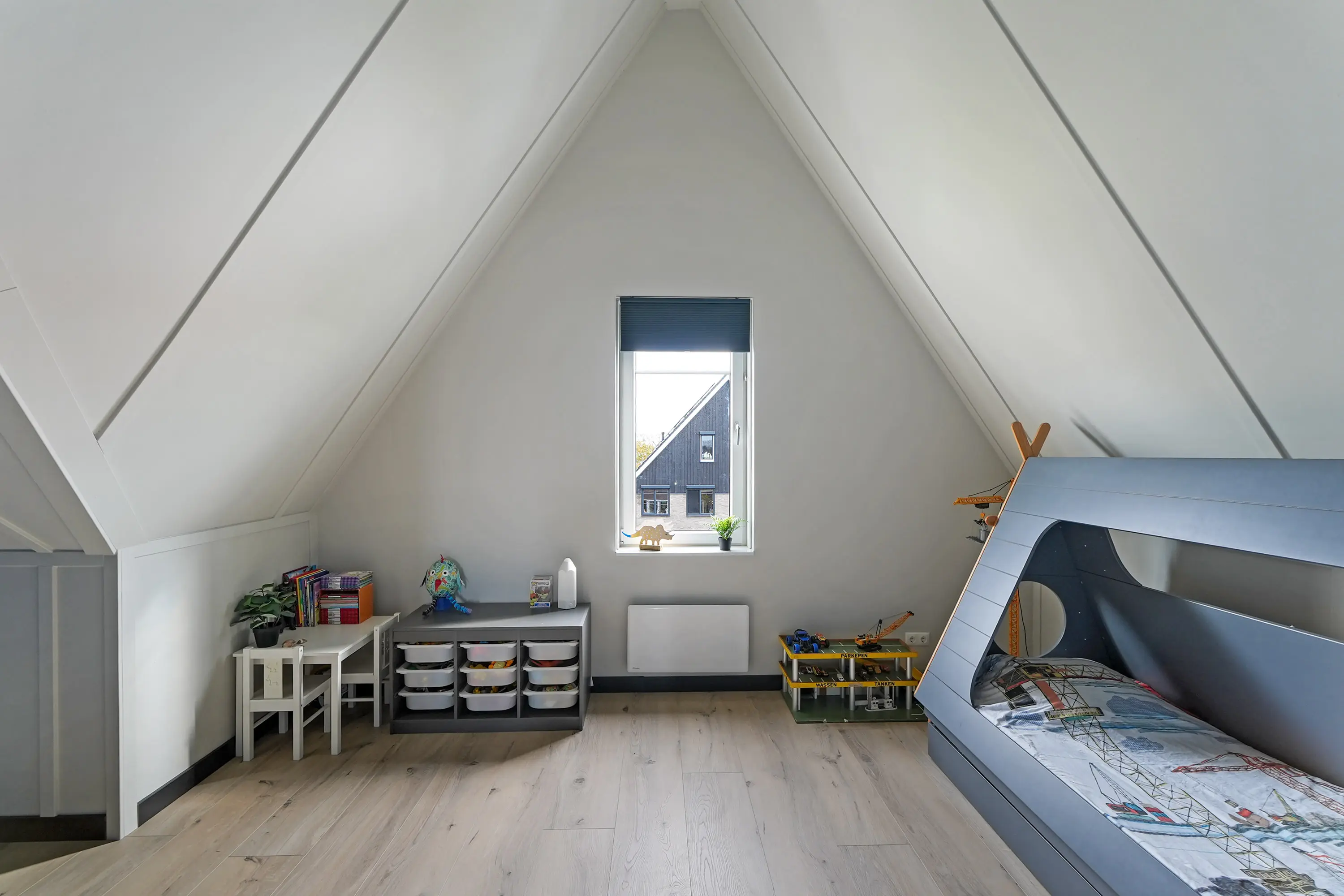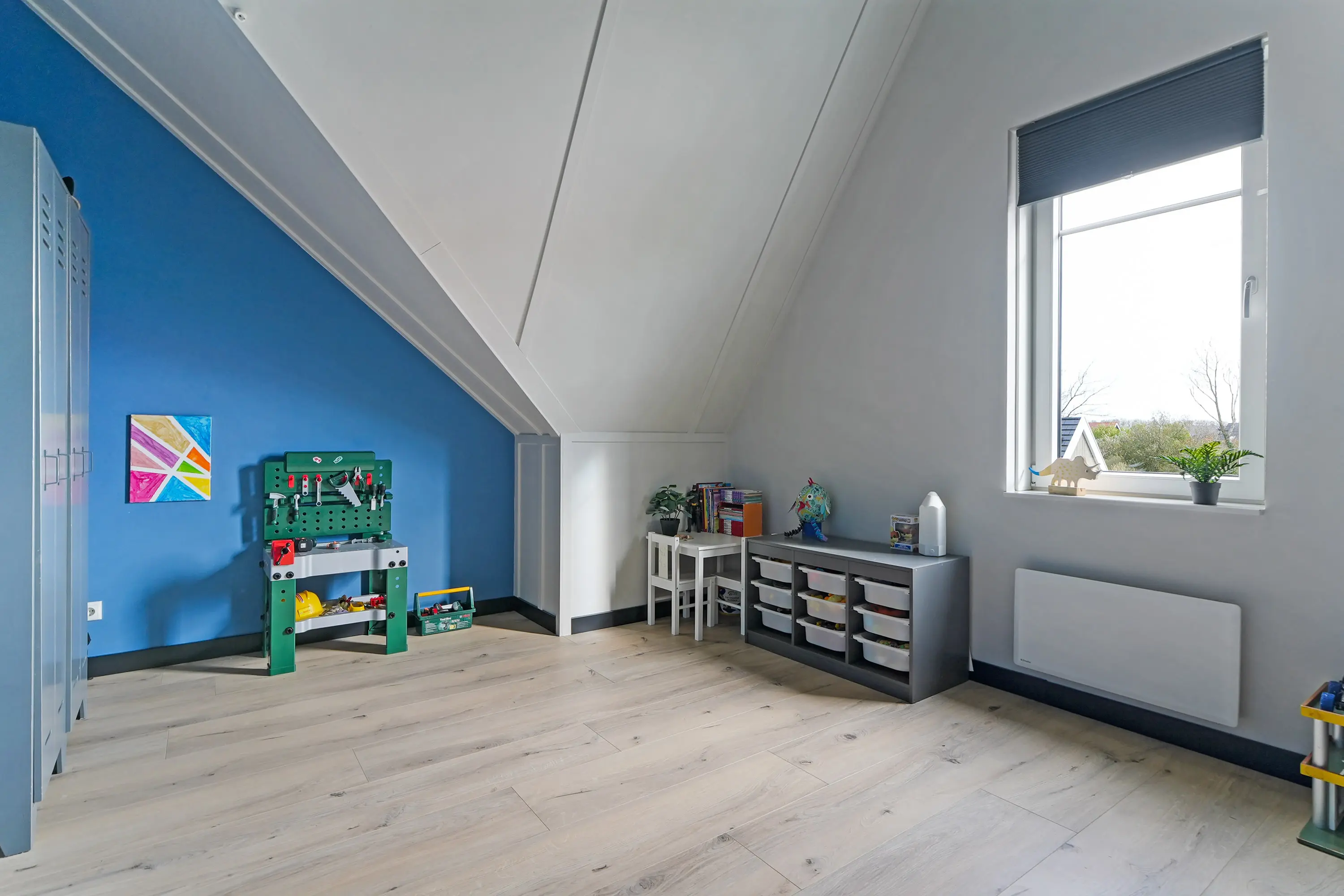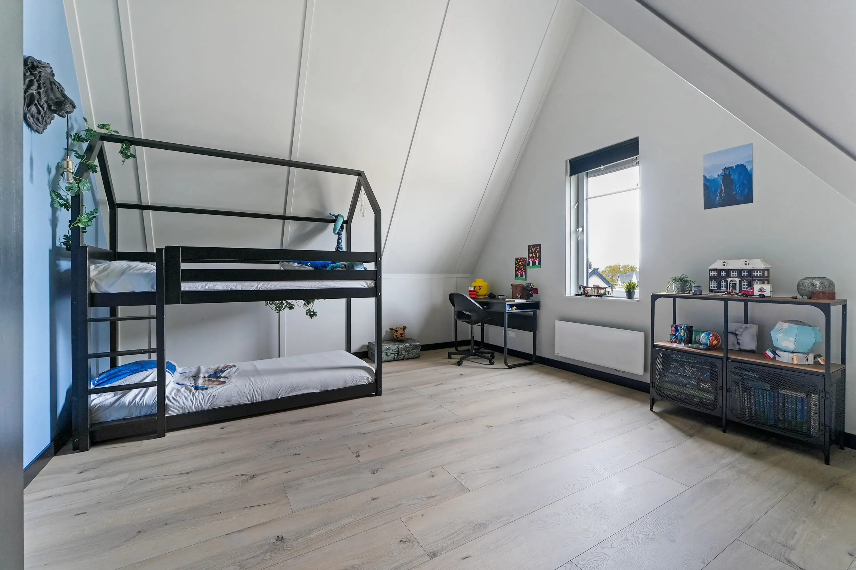 Via de vaste trap bereikt u de volwaardige tweede verdieping met nog twee riante slaapkamers. Dankzij de hoge nok en verlengde kap voelen beide kamers opvallend ruim aan. Daarnaast vindt u hier een technische ruimte met aansluitingen voor wasmachine en droger, de warmtepomp, omvormer en mechanische ventilatie.