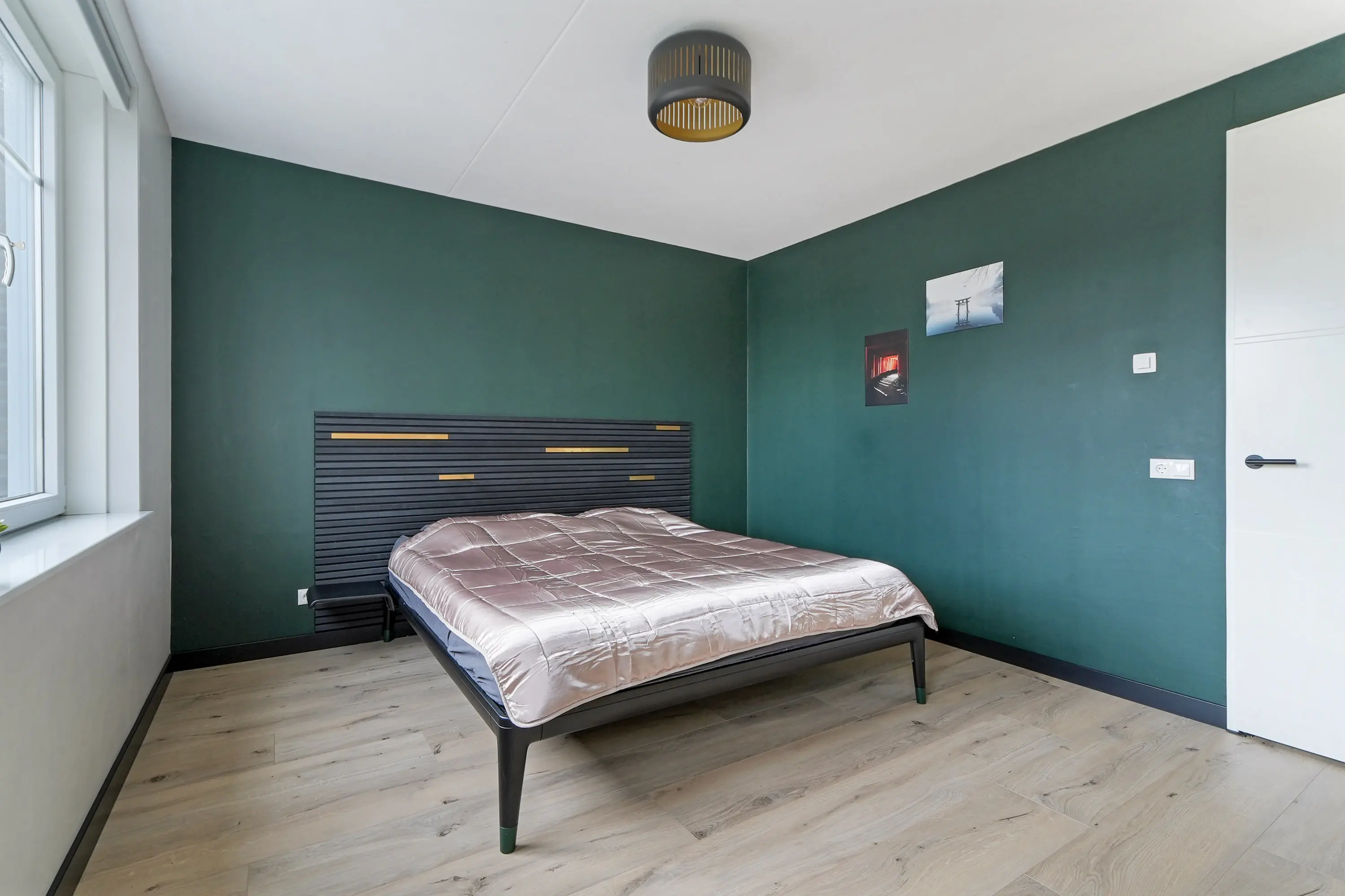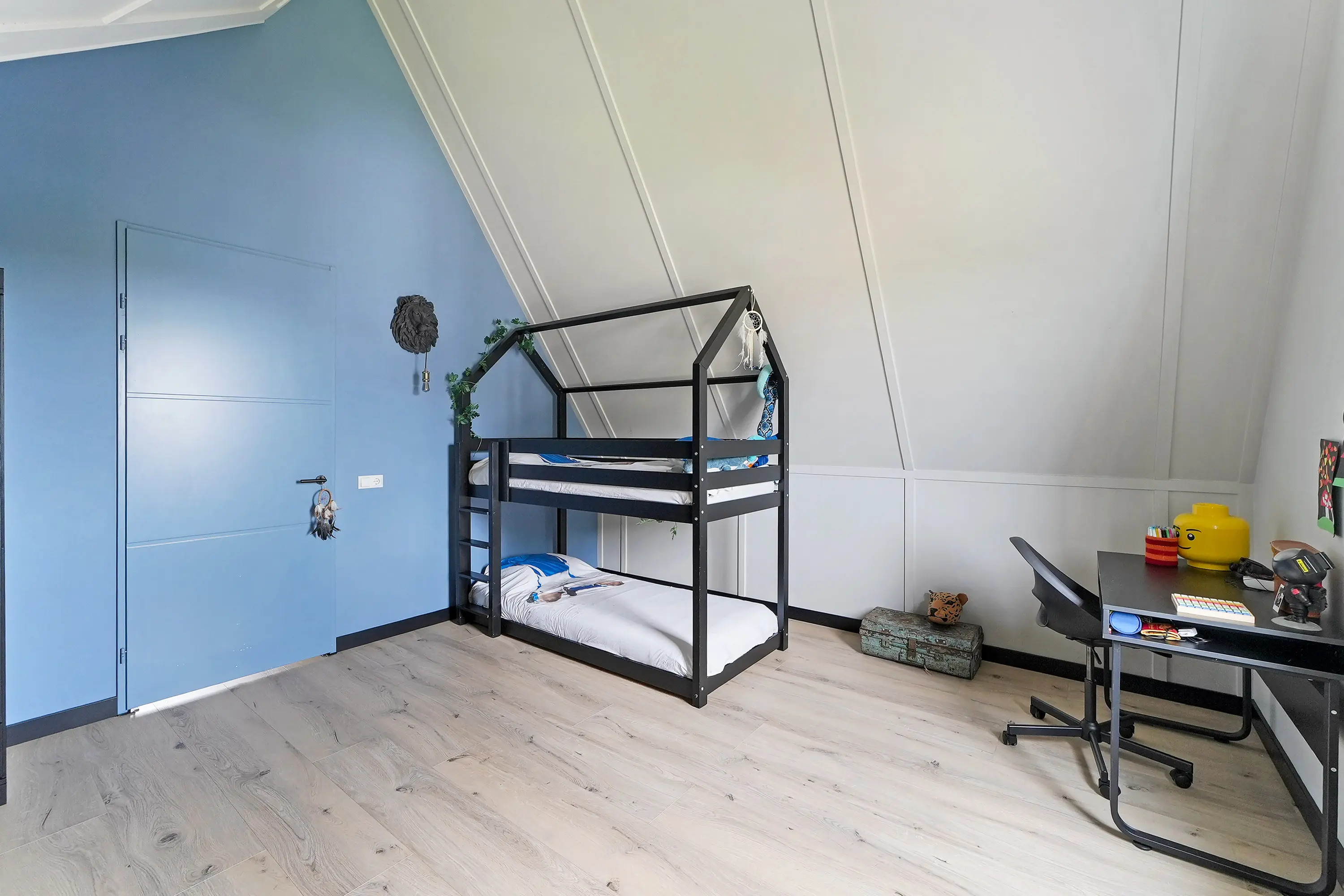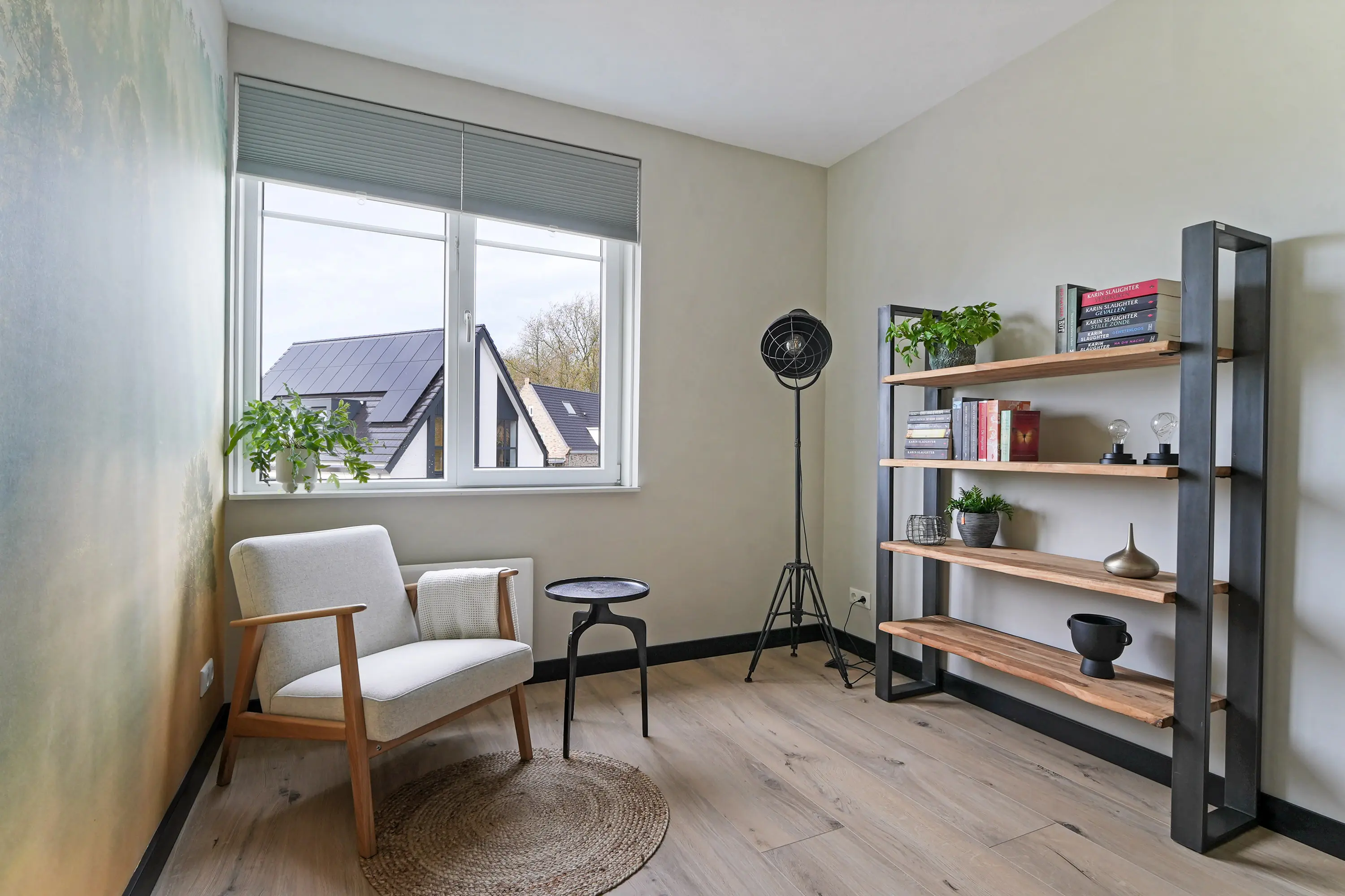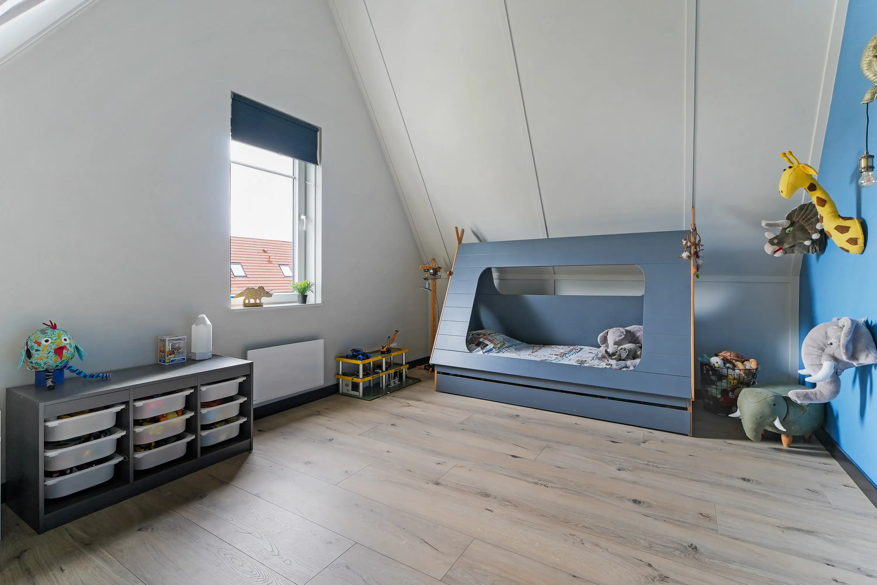 Via de vaste trap bereikt u de volwaardige tweede verdieping met nog twee riante slaapkamers. Dankzij de hoge nok en verlengde kap voelen beide kamers opvallend ruim aan. Daarnaast vindt u hier een technische ruimte met aansluitingen voor wasmachine en droger, de warmtepomp, omvormer en mechanische ventilatie.