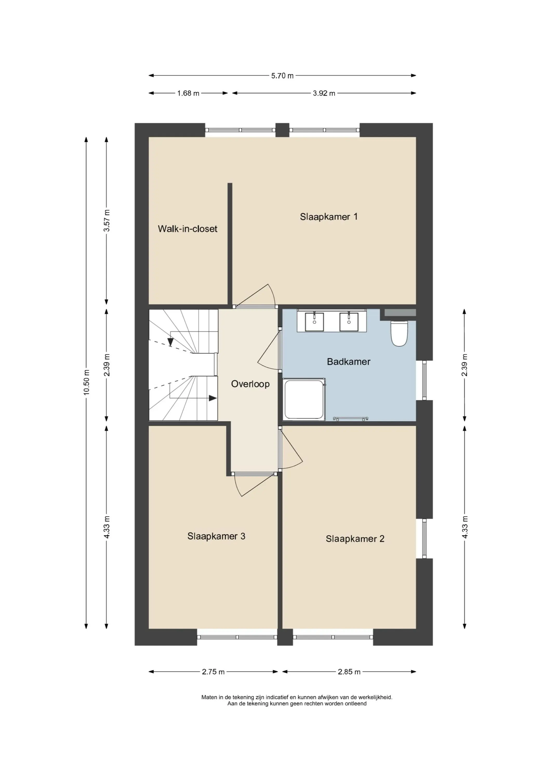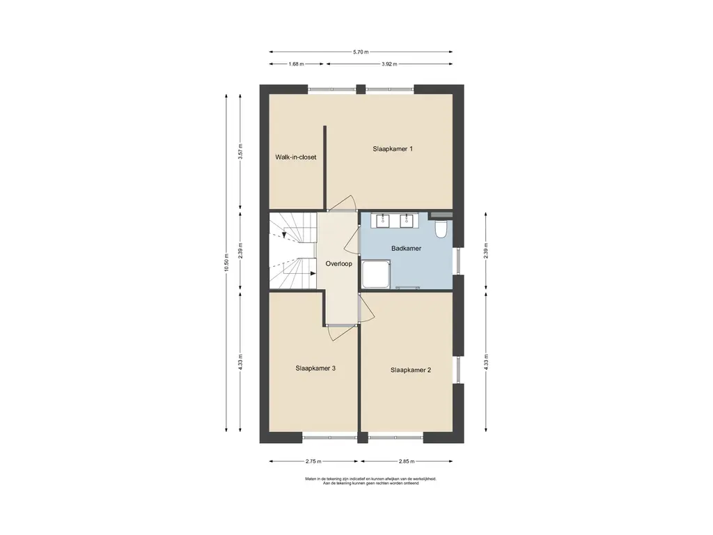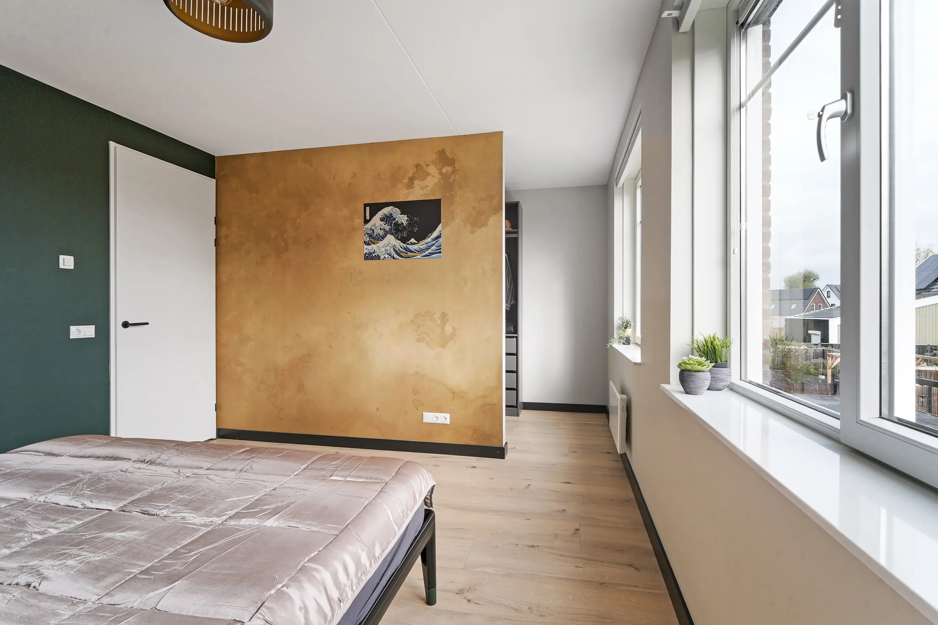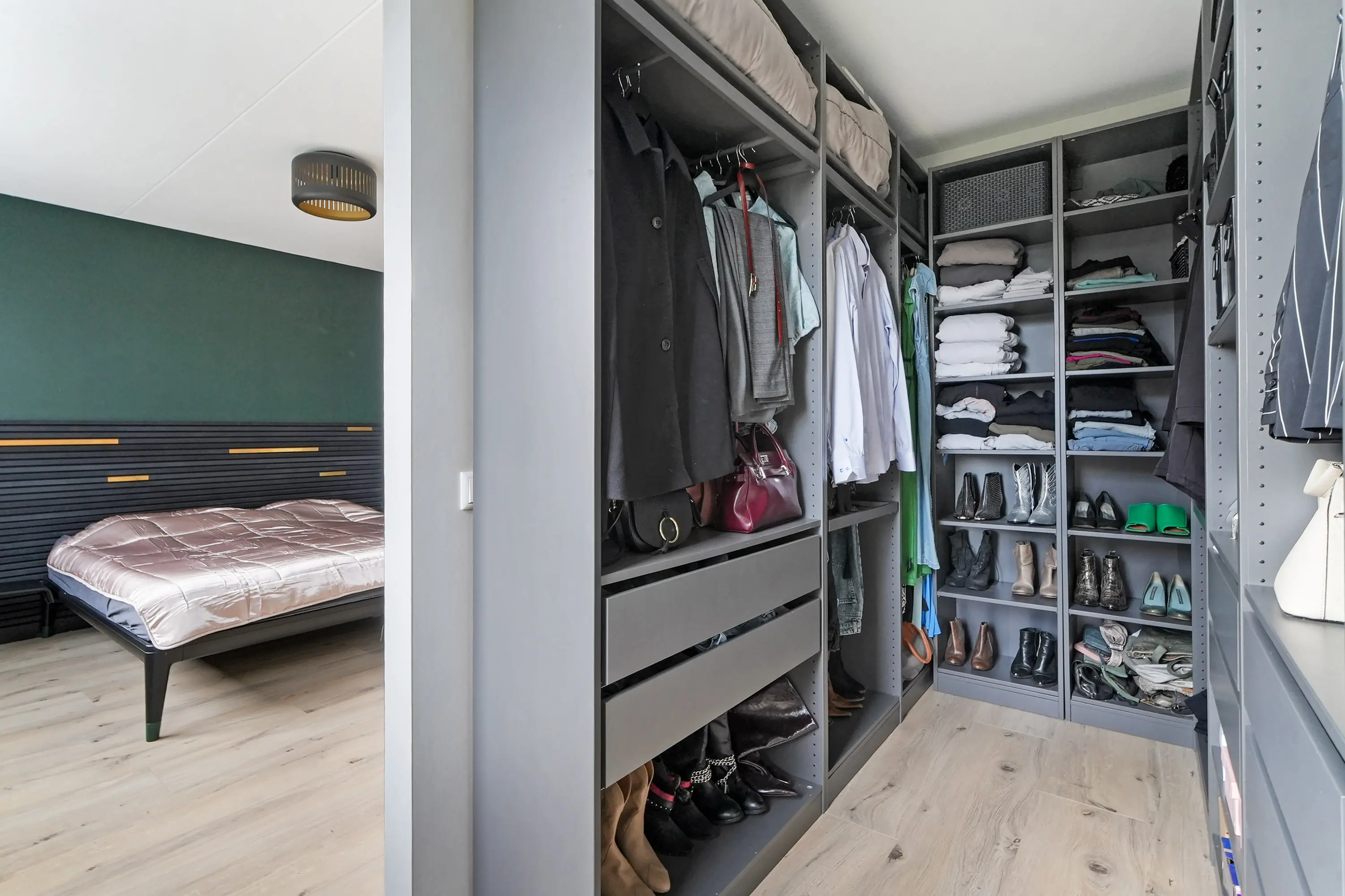 De ruime overloop geeft toegang tot drie ruime slaapkamers, waaronder de royale ouderslaapkamer aan de voorzijde. Deze strekt zich uit over de volle breedte van de woning en beschikt over een praktische walk-in closet.