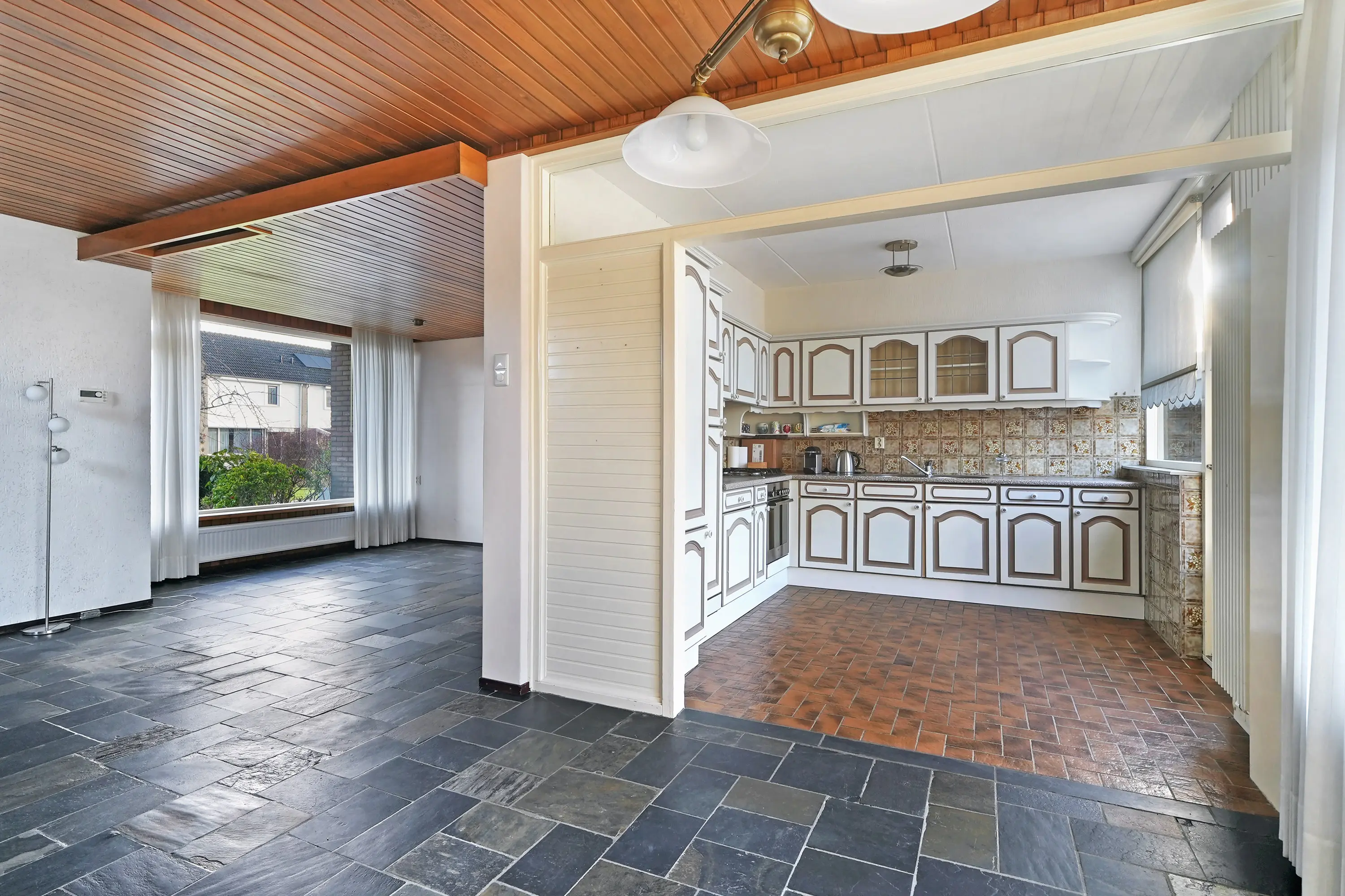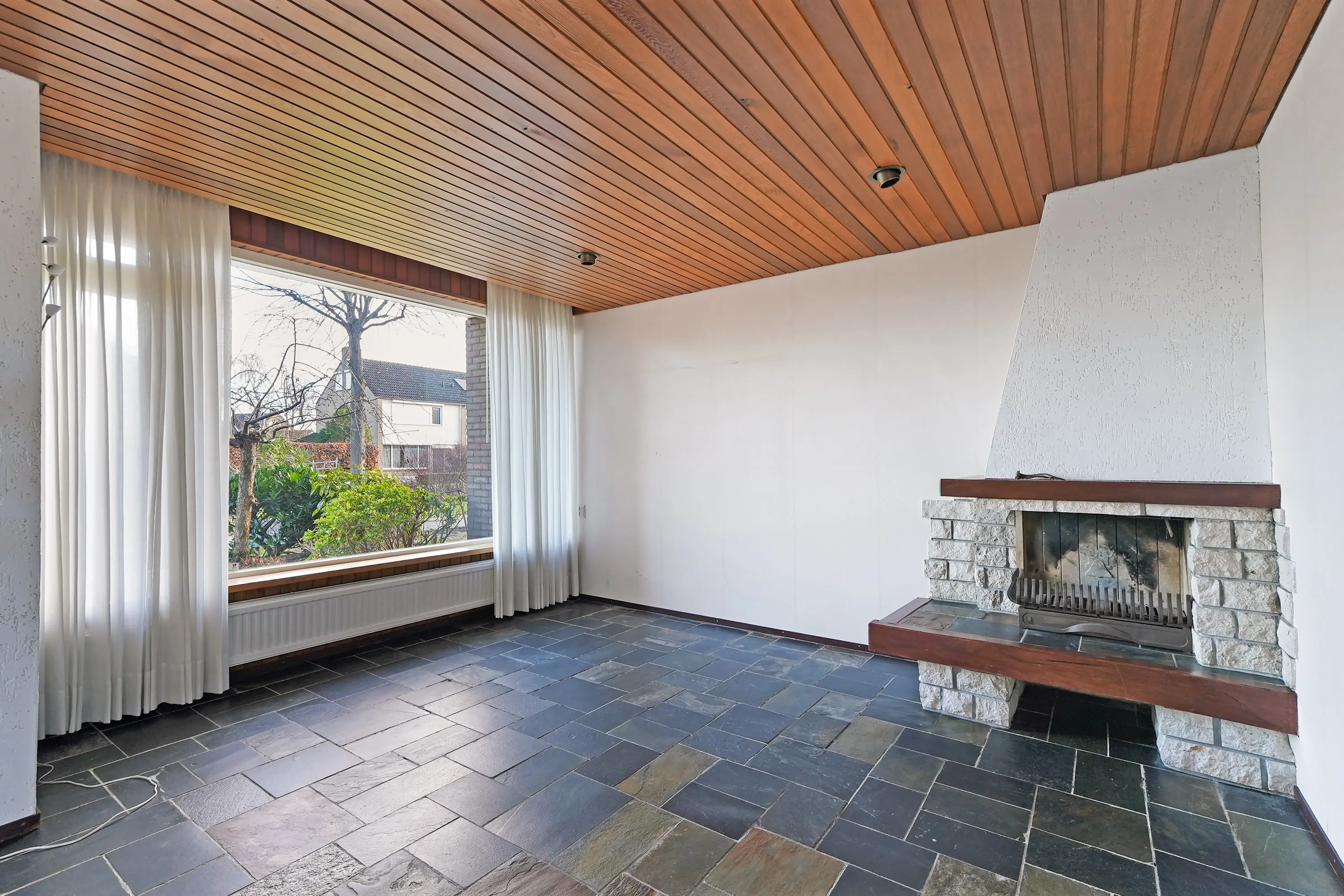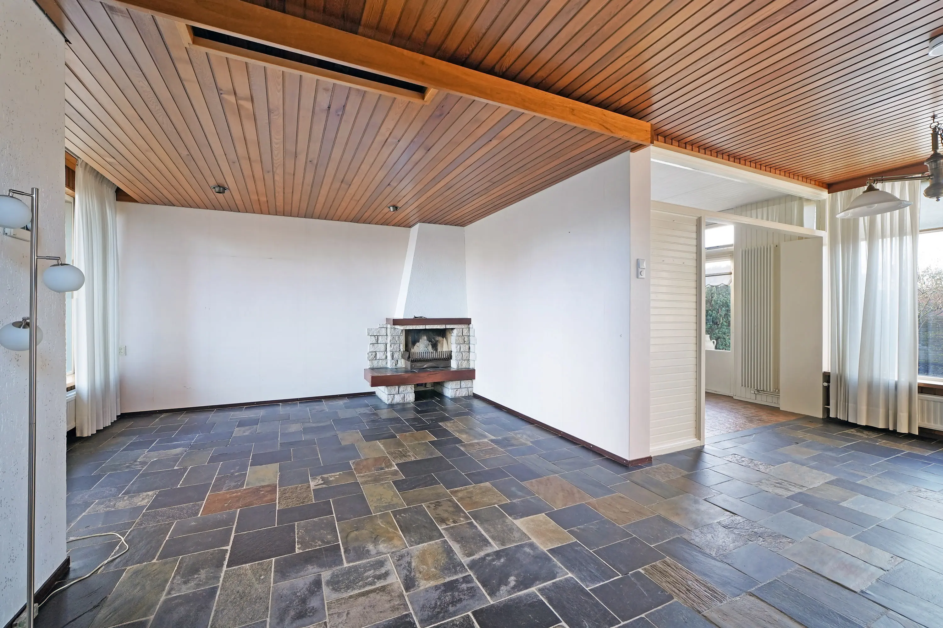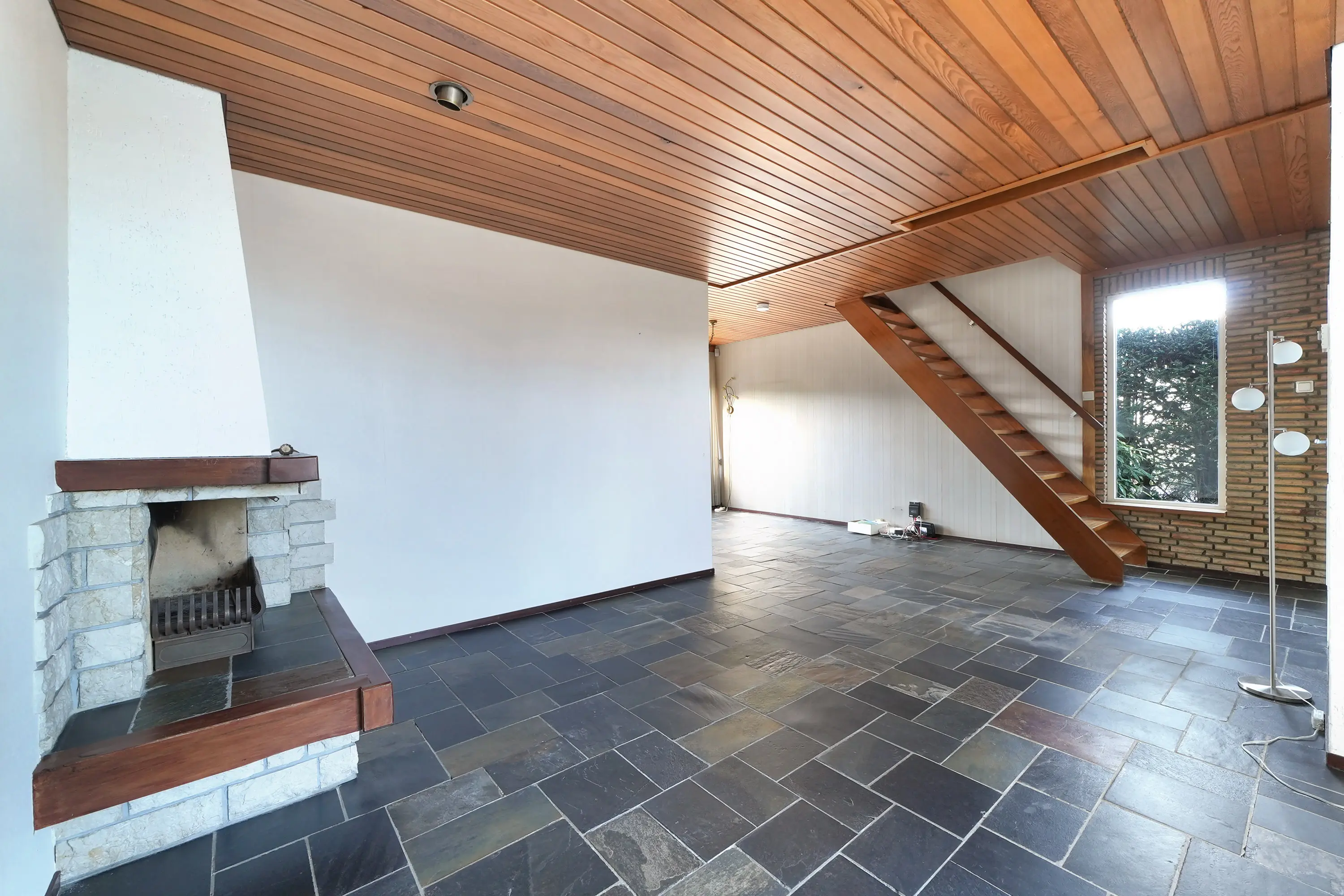 Portaal, toilet met fonteintje, woonkamer met trap naar de 1e verdieping en gezellige open haard en vervolgens een open keuken met de inrichting in een hoekopstelling en tuindeur.
