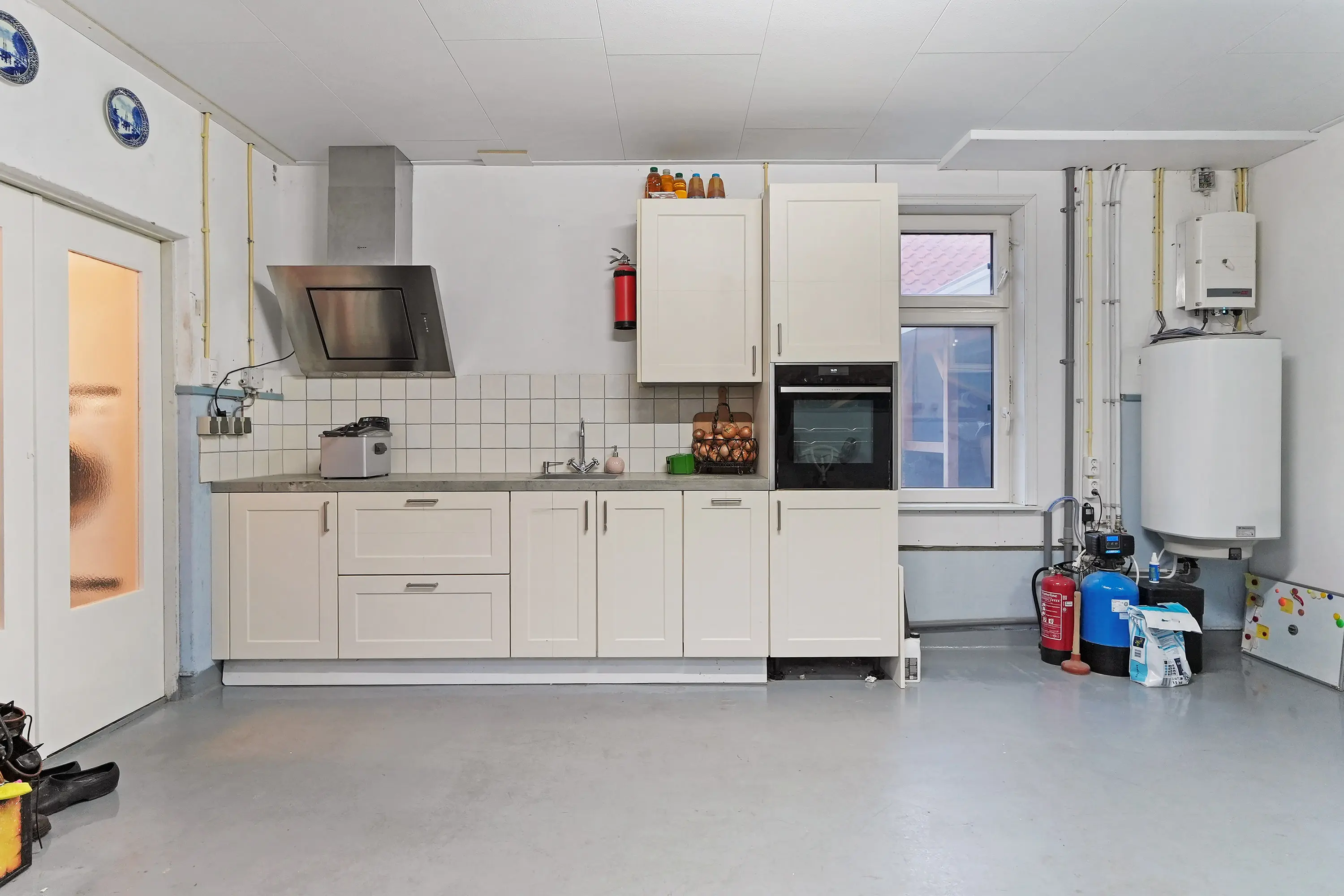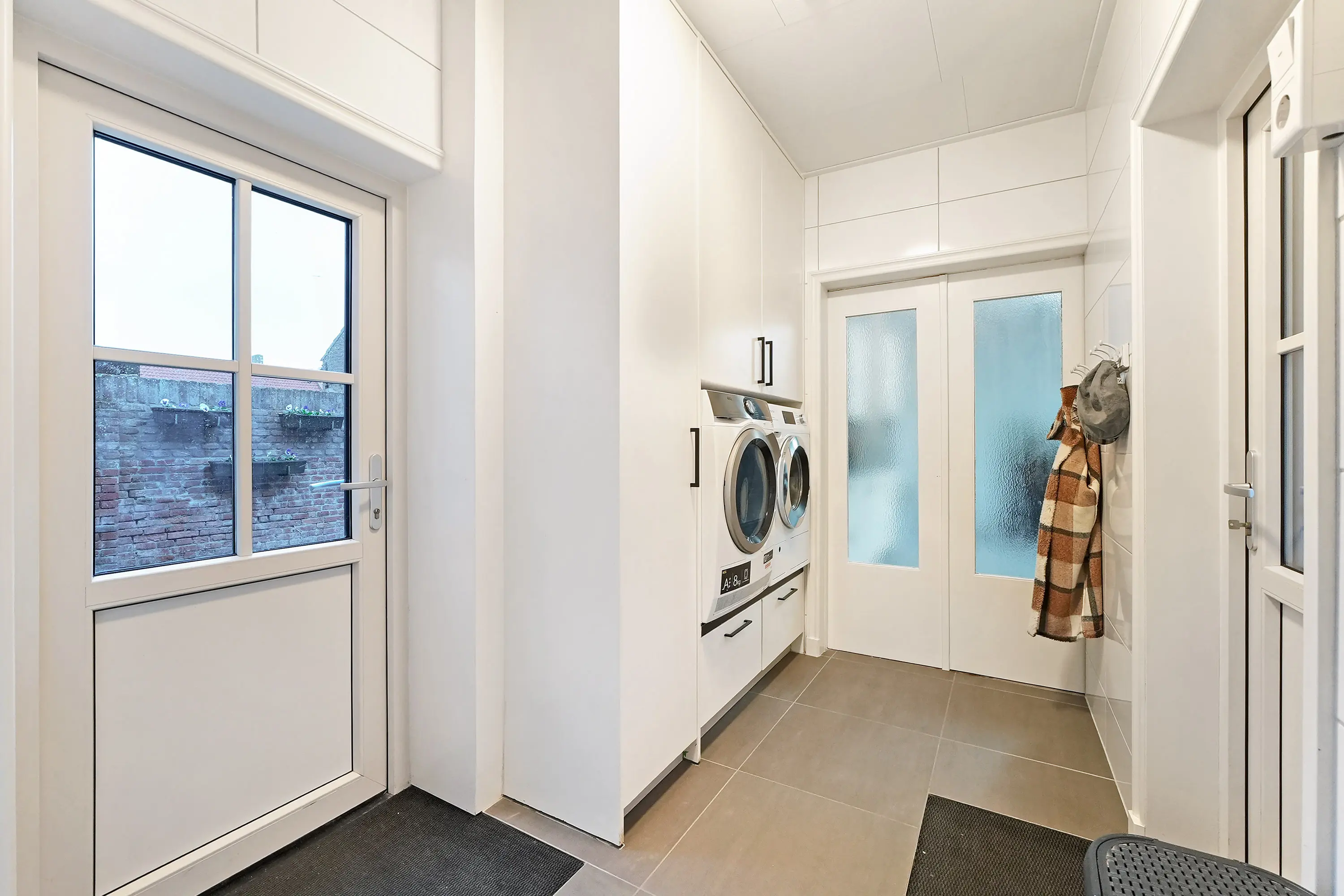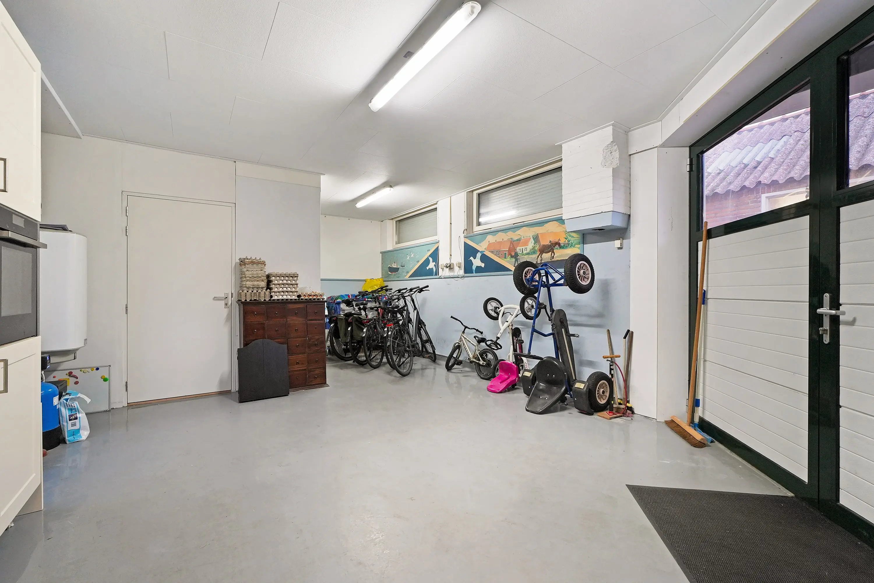 Vanuit het woongedeelte bereikt u de praktische bijkeuken, waar de wasmachine en de drogeropstelling bevinden en tevens praktische opbergkasten. Vanuit hier is de toegang richting de tuin, garage en naar de straat. De garage is ruim van formaat en ideaal voor het opbergen of stallen van spullen en fietsen of voor het uitoefenen van uw hobby!