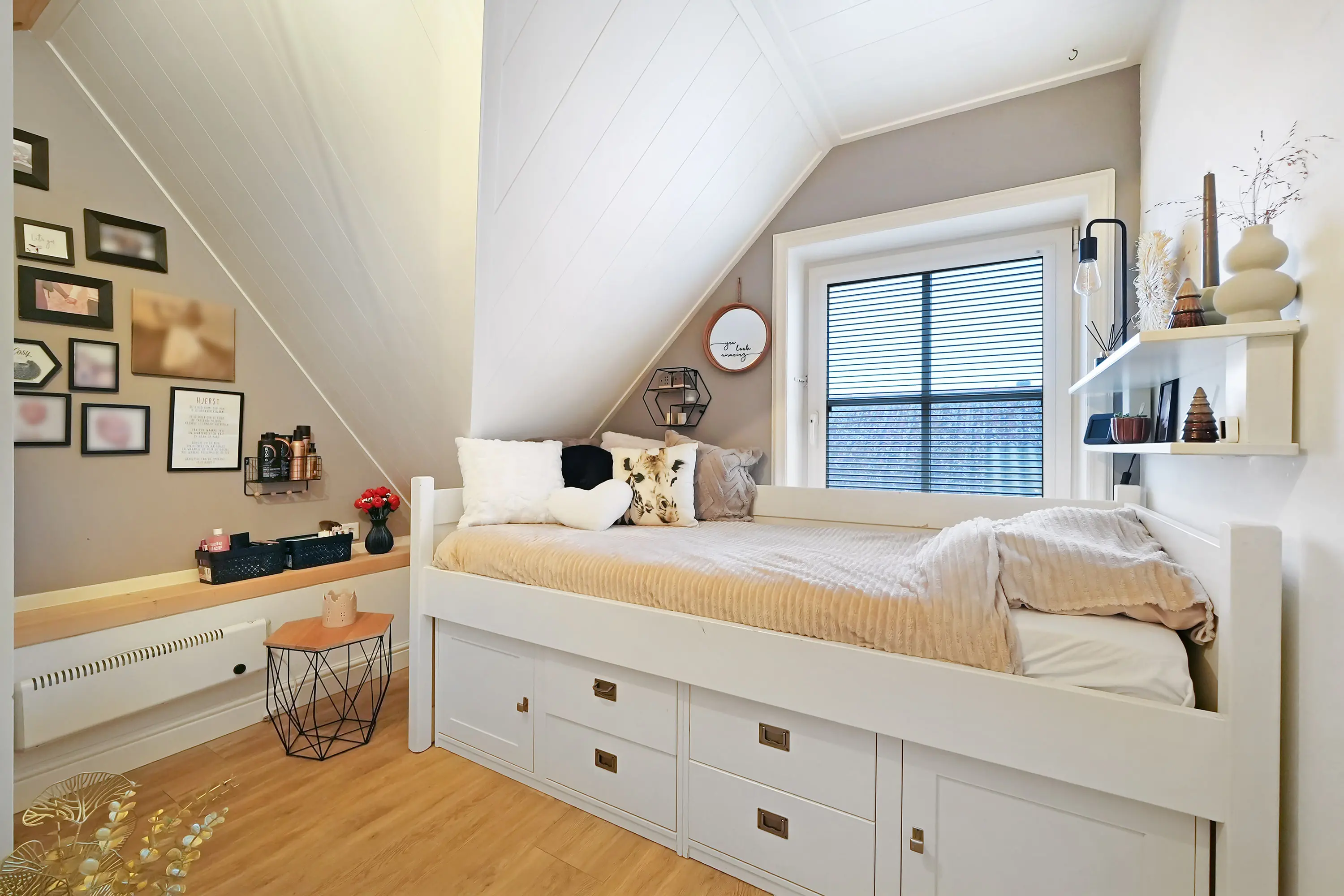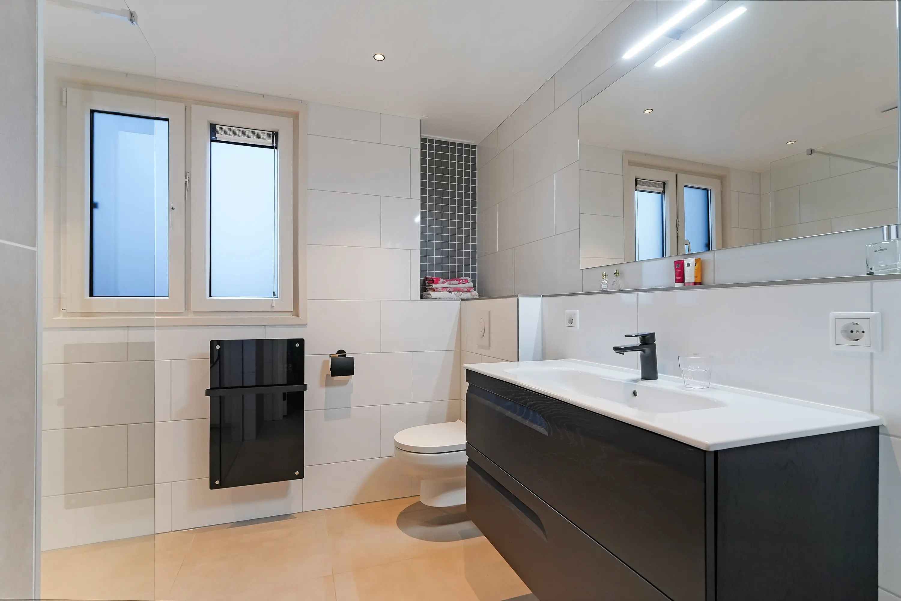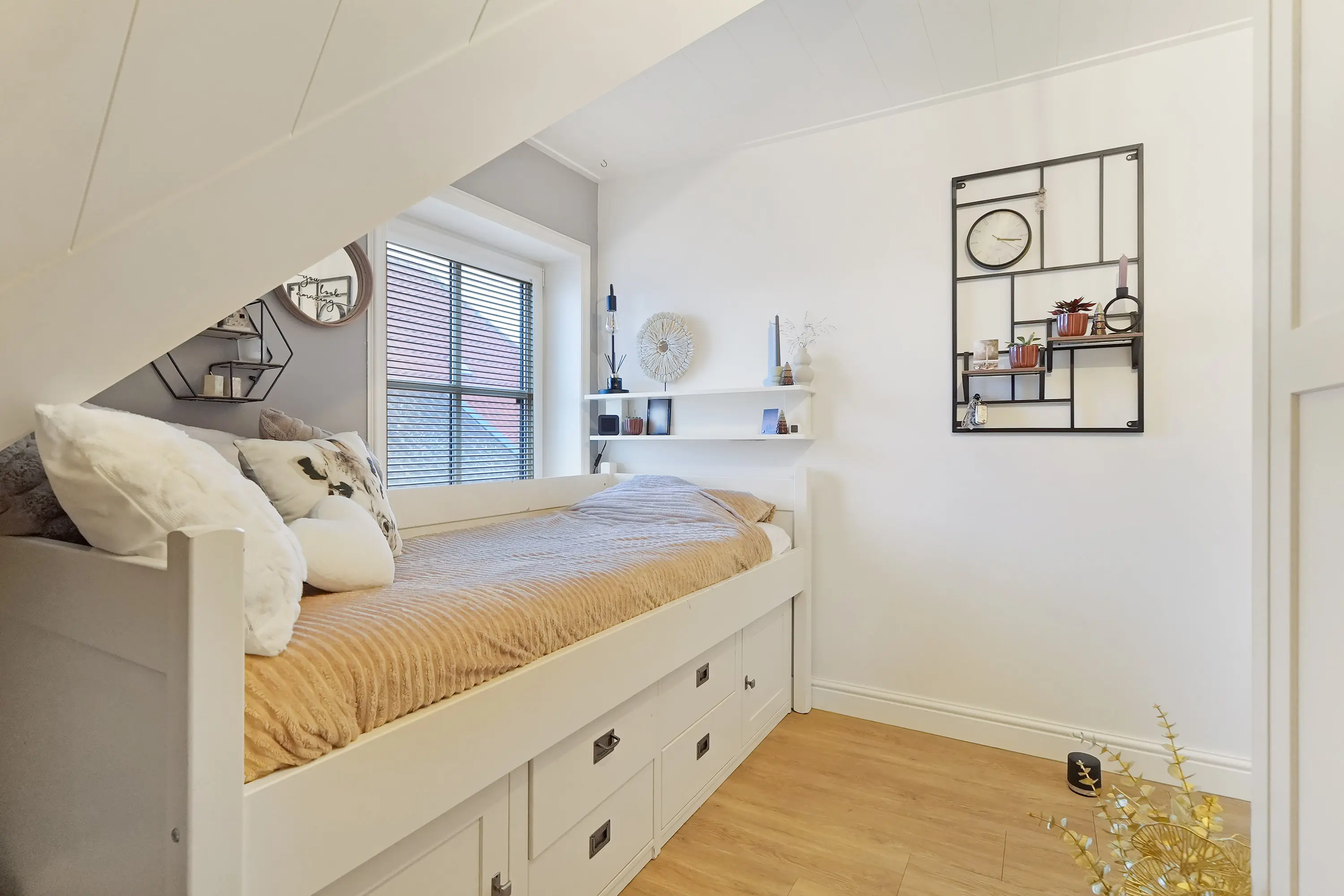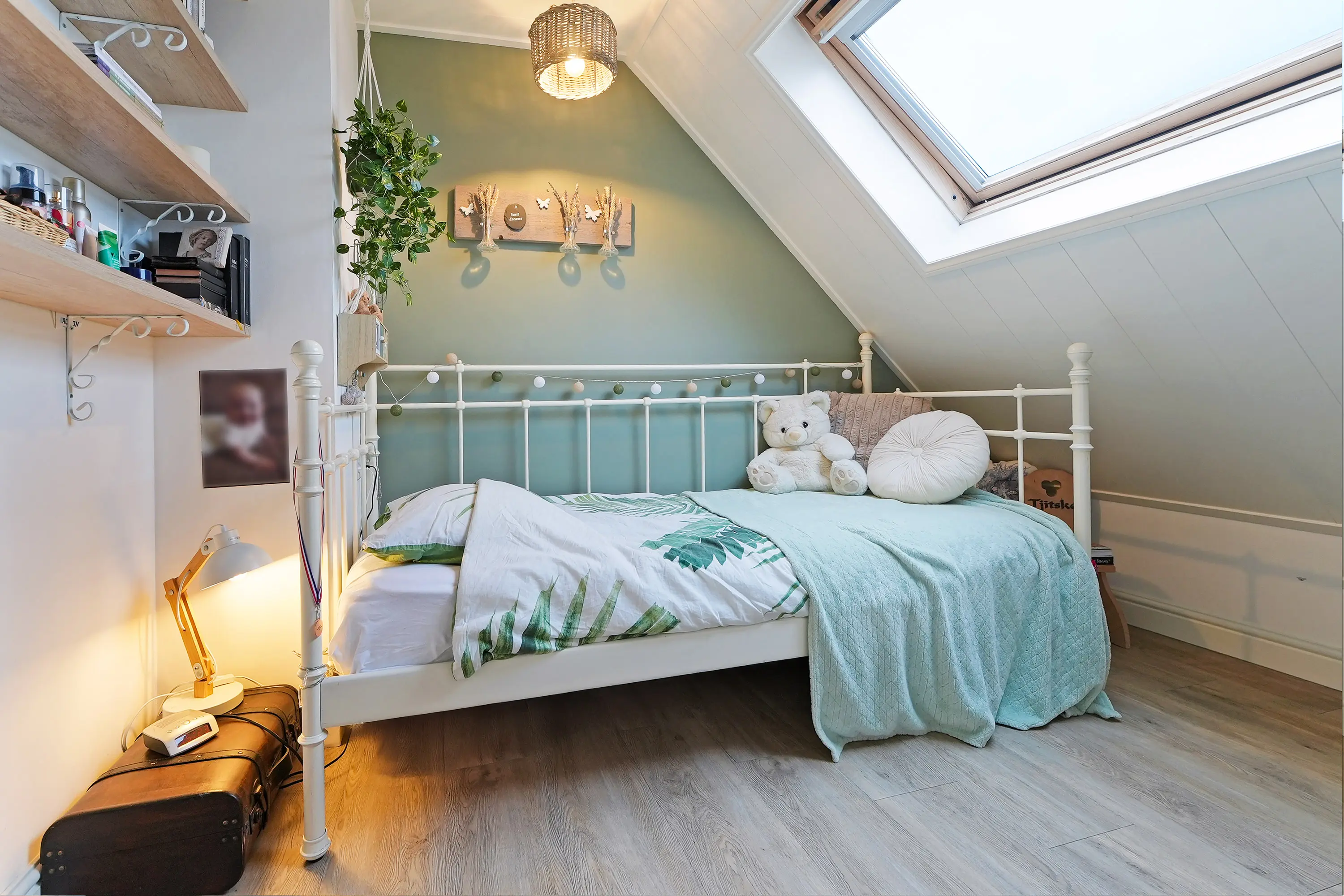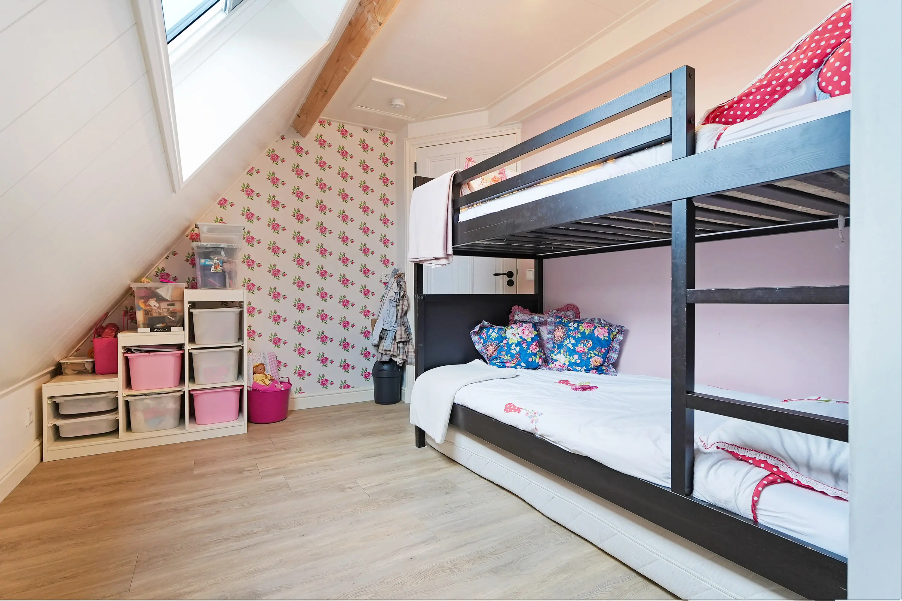 Op de eerste verdieping bevinden zich meerdere ruime slaapkamers, waardoor deze woning uitermate geschikt is voor grote gezinnen, thuiswerken of logeergebruik. In totaal beschikt de woning over 8 slaapkamers. De badkamer is zeer netjes uitgevoerd met moderne en tijdloze tegels. Deze beschikt over een brede wastafel, toilet en ruime inloopdouche.