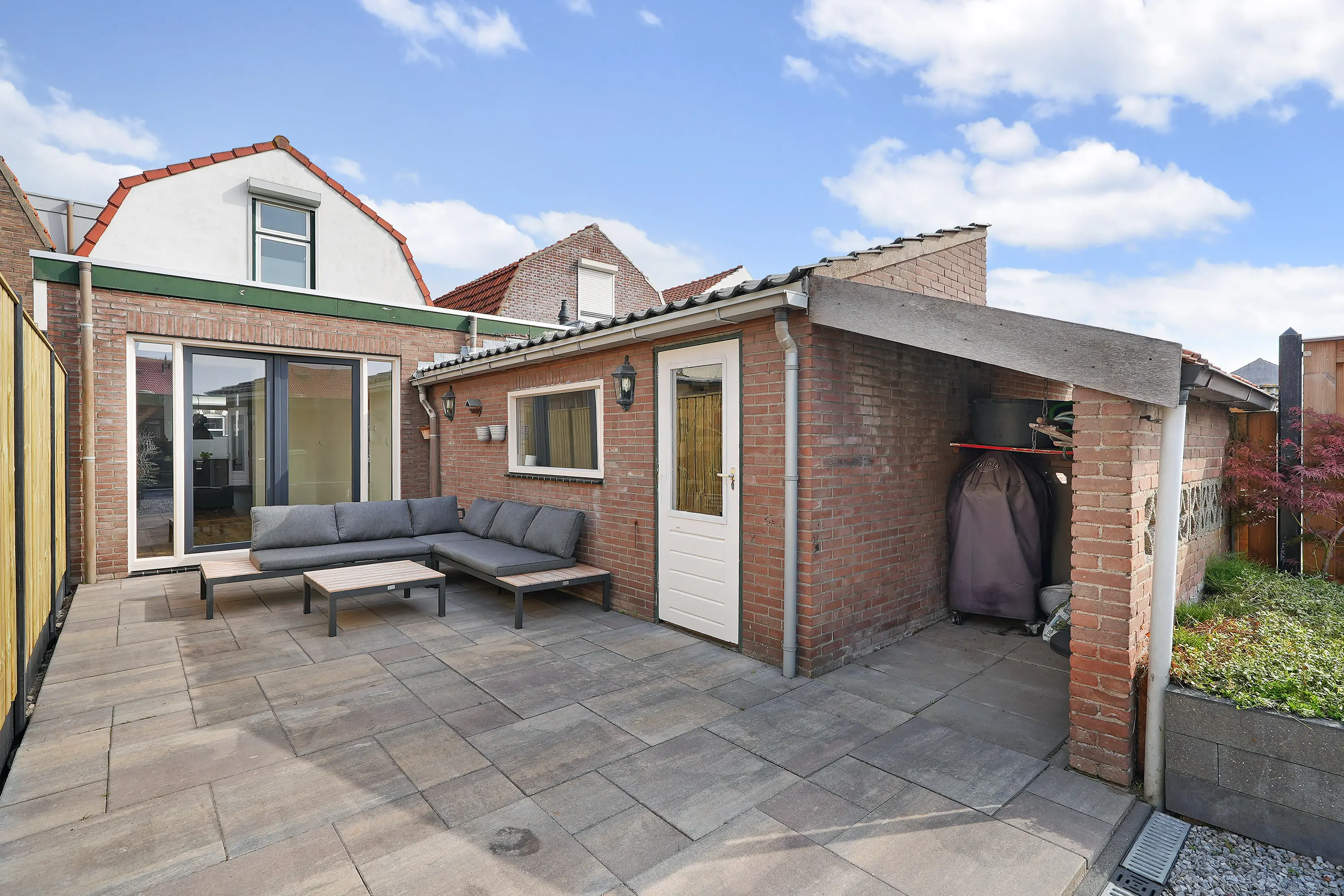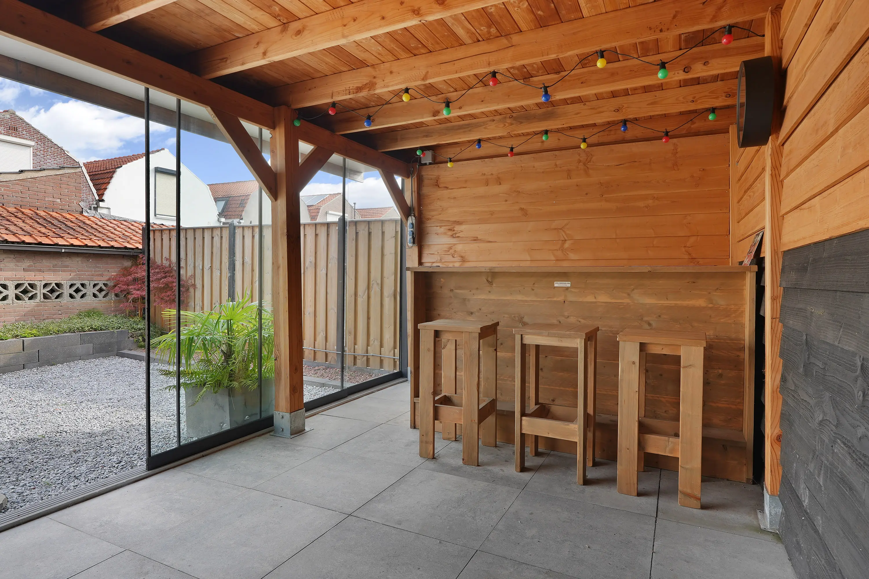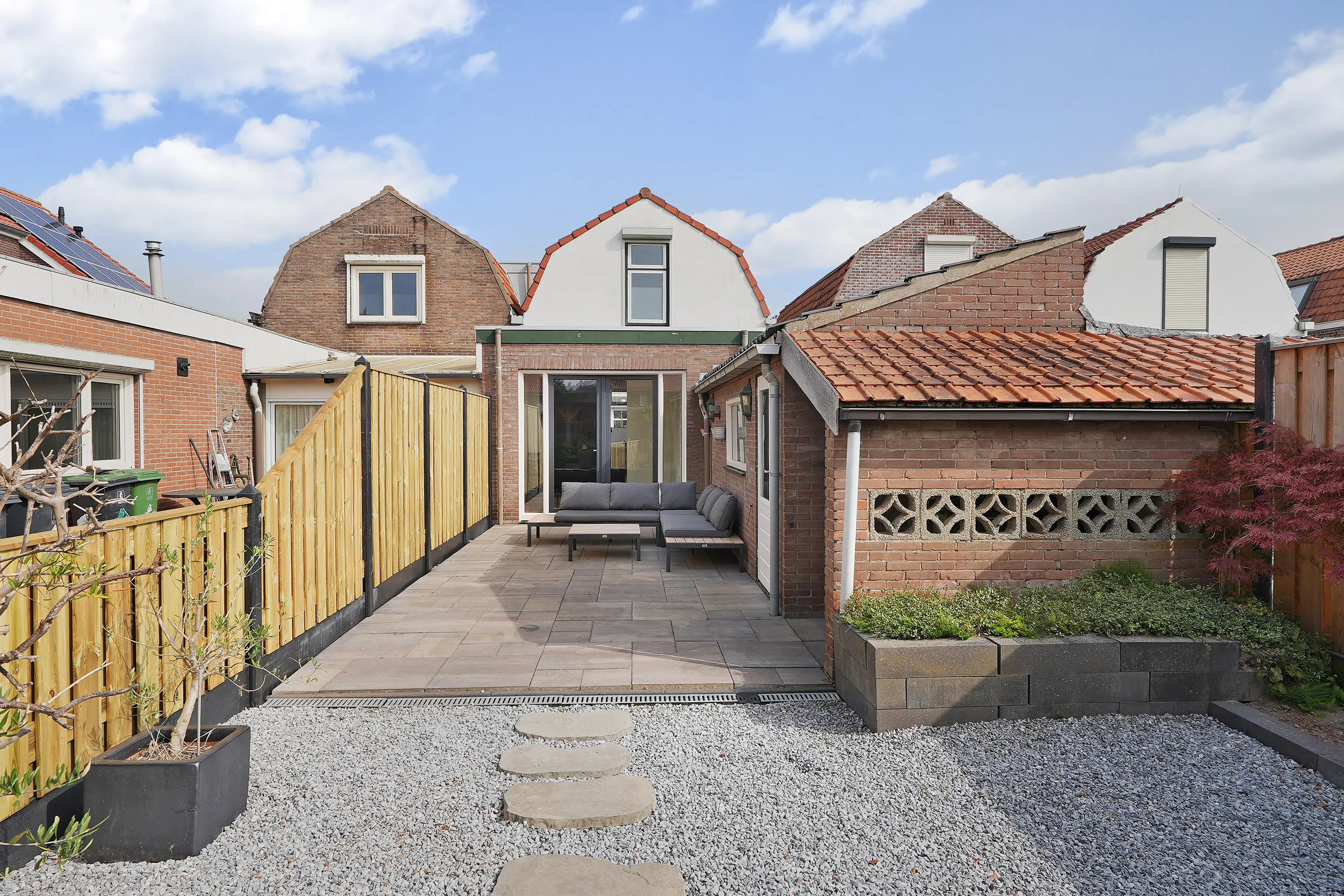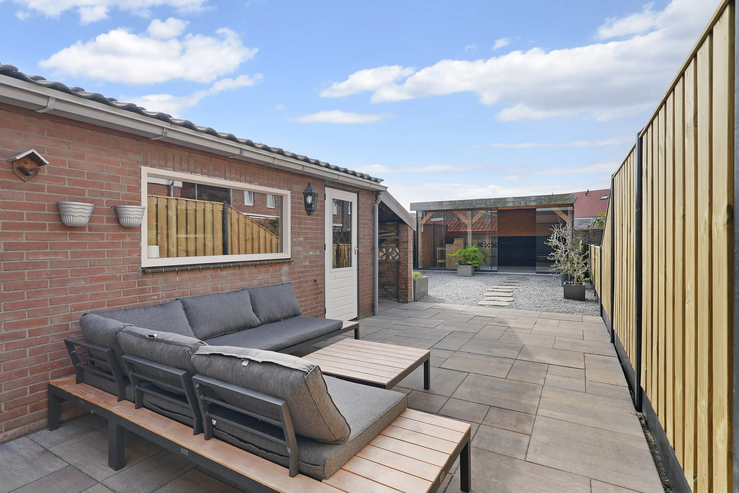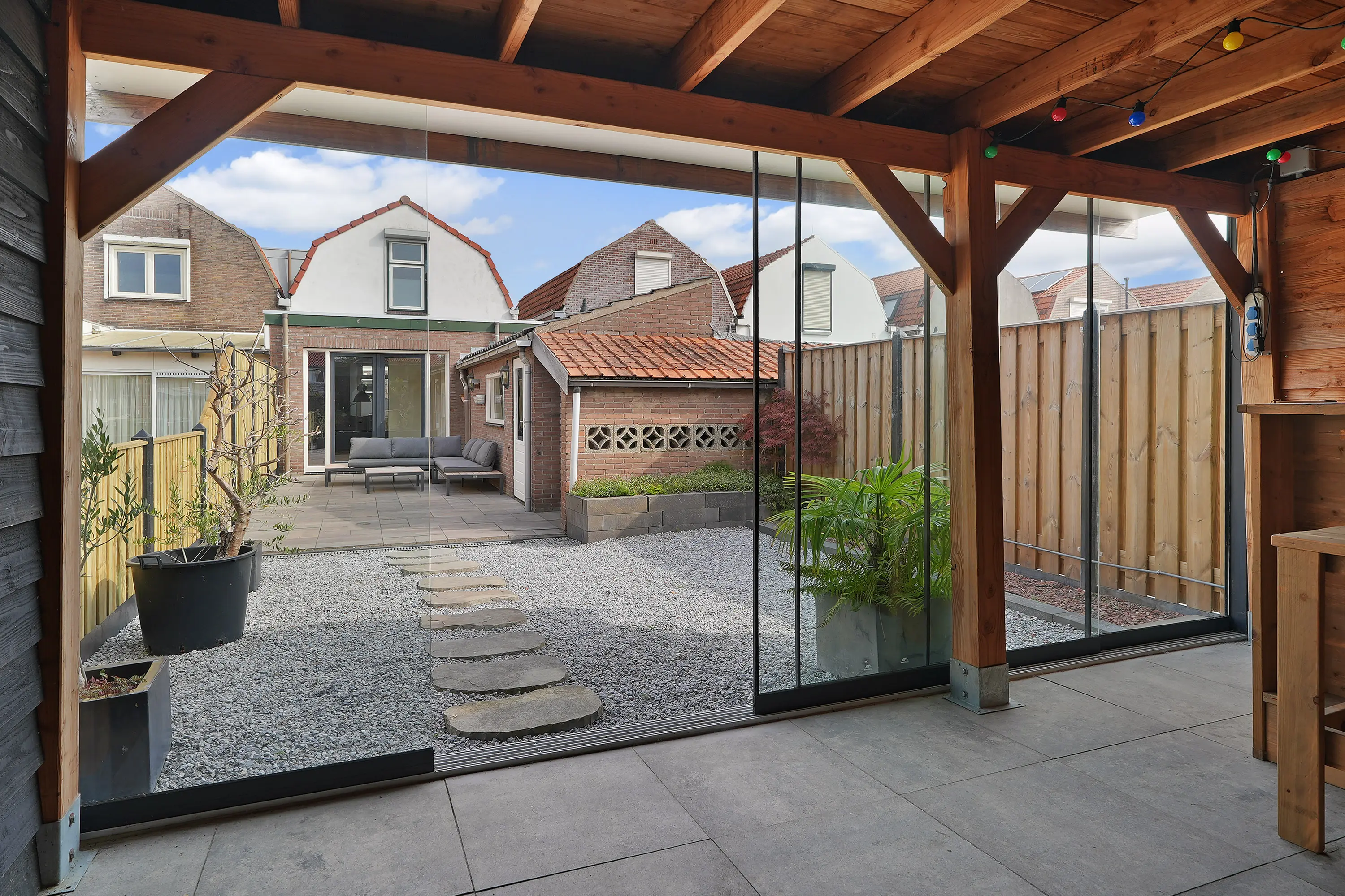 De achtertuin is een absoluut hoogtepunt: diep, zonnig gelegen op het zuiden en met veel privacy. Het geheel is fraai aangelegd met vernieuwde bestrating, grind, schuttingdelen en een looppad naar de royale houten terrasoverkapping. Deze overkapping is uitgerust met glazen schuifwanden, waardoor u er het hele jaar door comfortabel kunt genieten van het buitenleven en van lange zomeravonden tot knusse winterdagen.