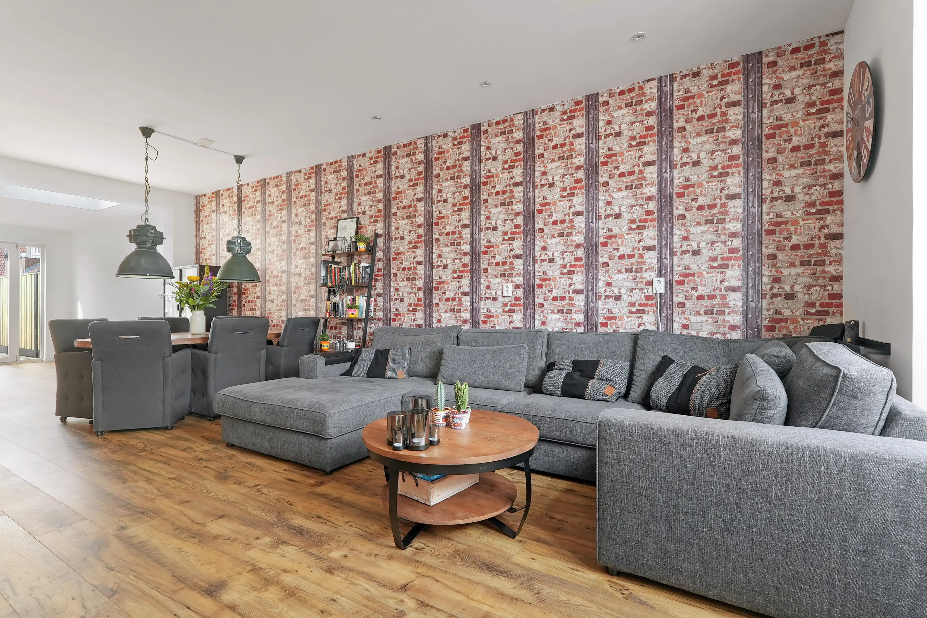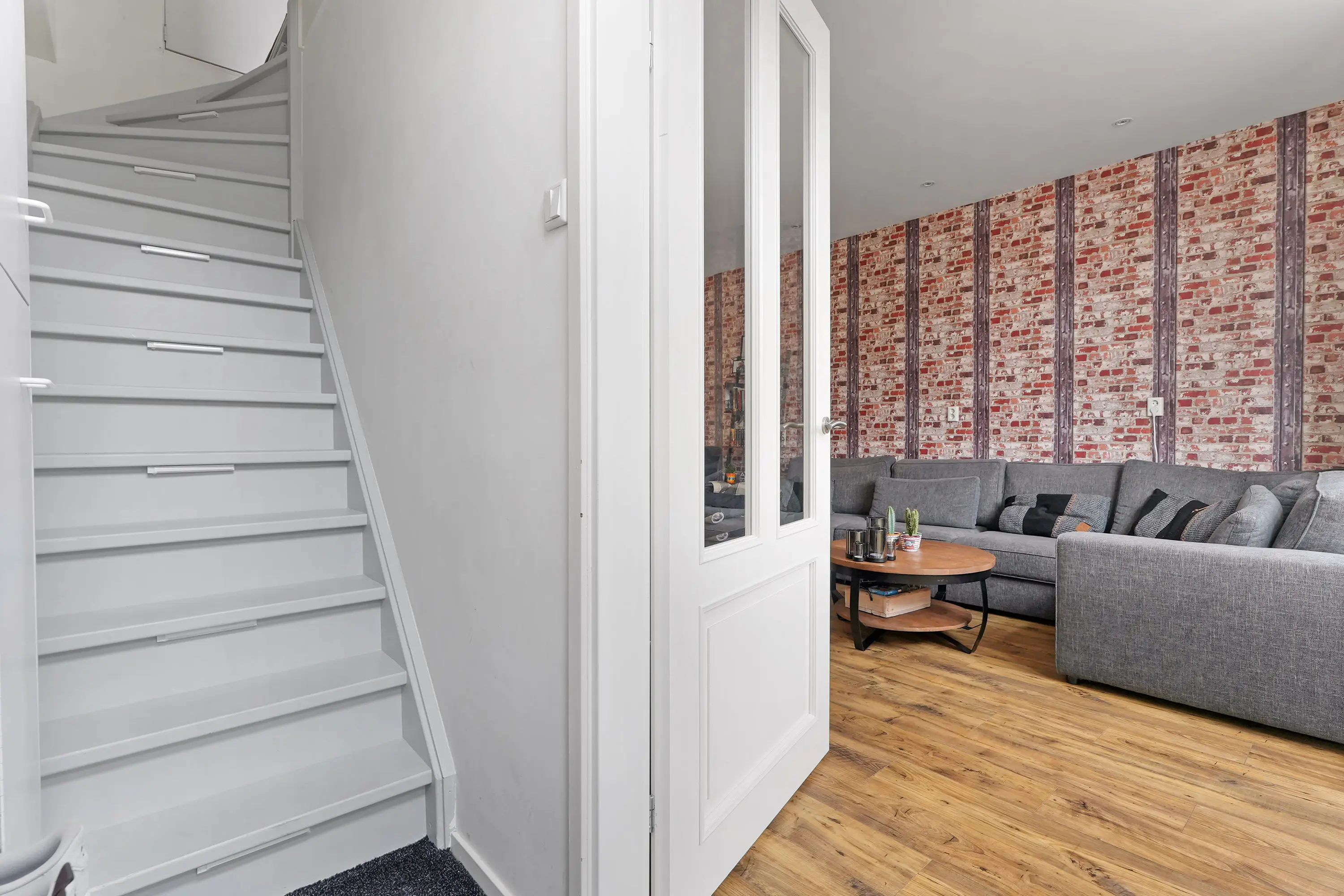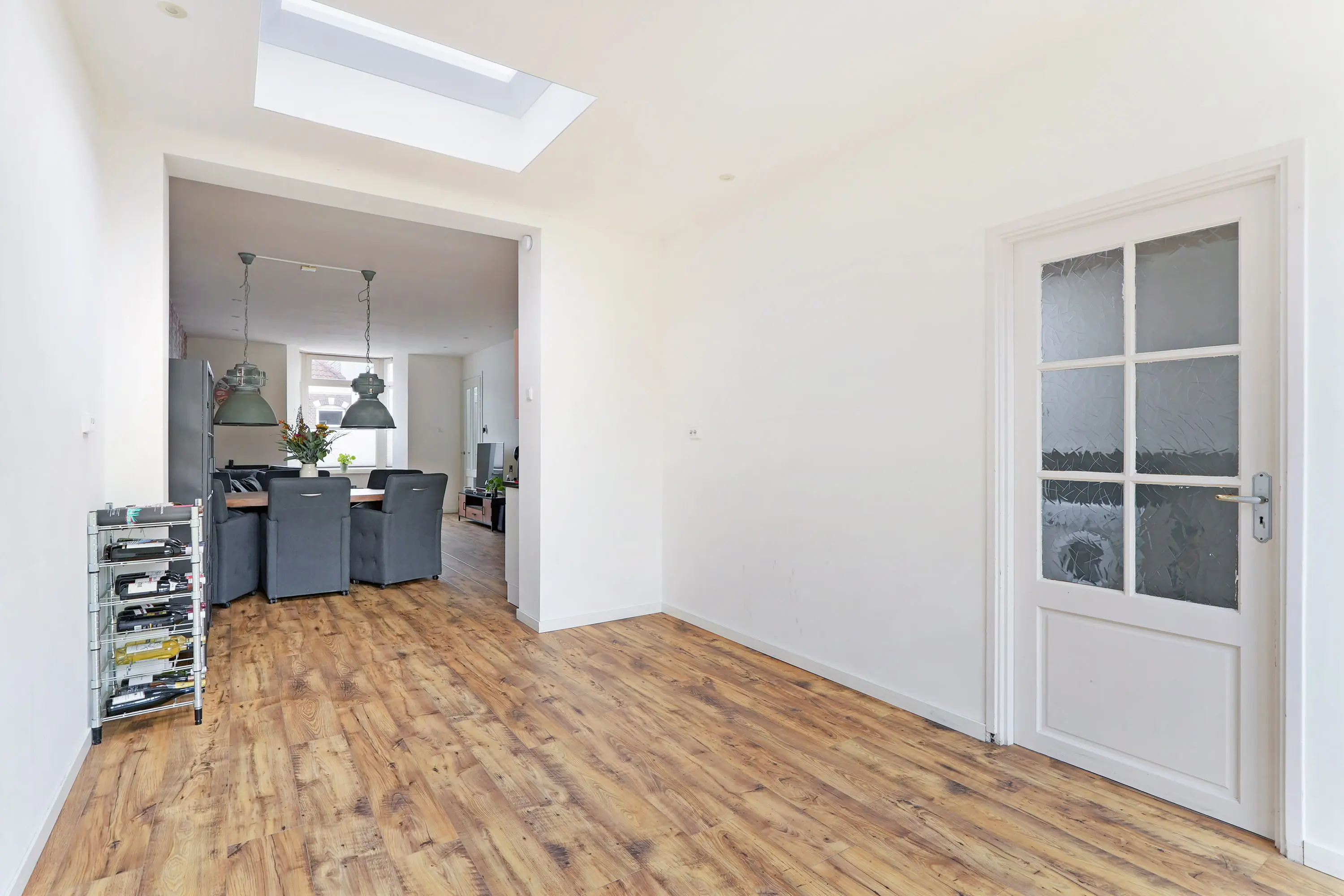 De entree brengt u in de hal met meterkast, trapopgang en toegang tot de woonkamer. Bij binnenkomst ervaart u direct de enorme diepte van maar liefst 12 meter – een bijzondere verrassing die zorgt voor een fantastische ruimtebeleving.