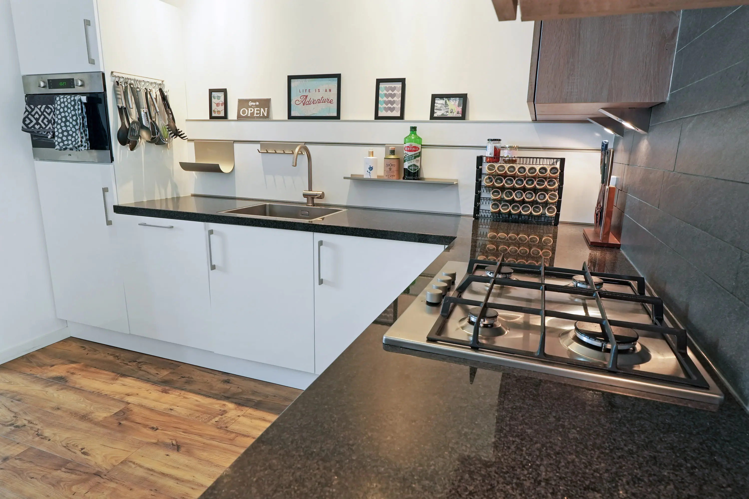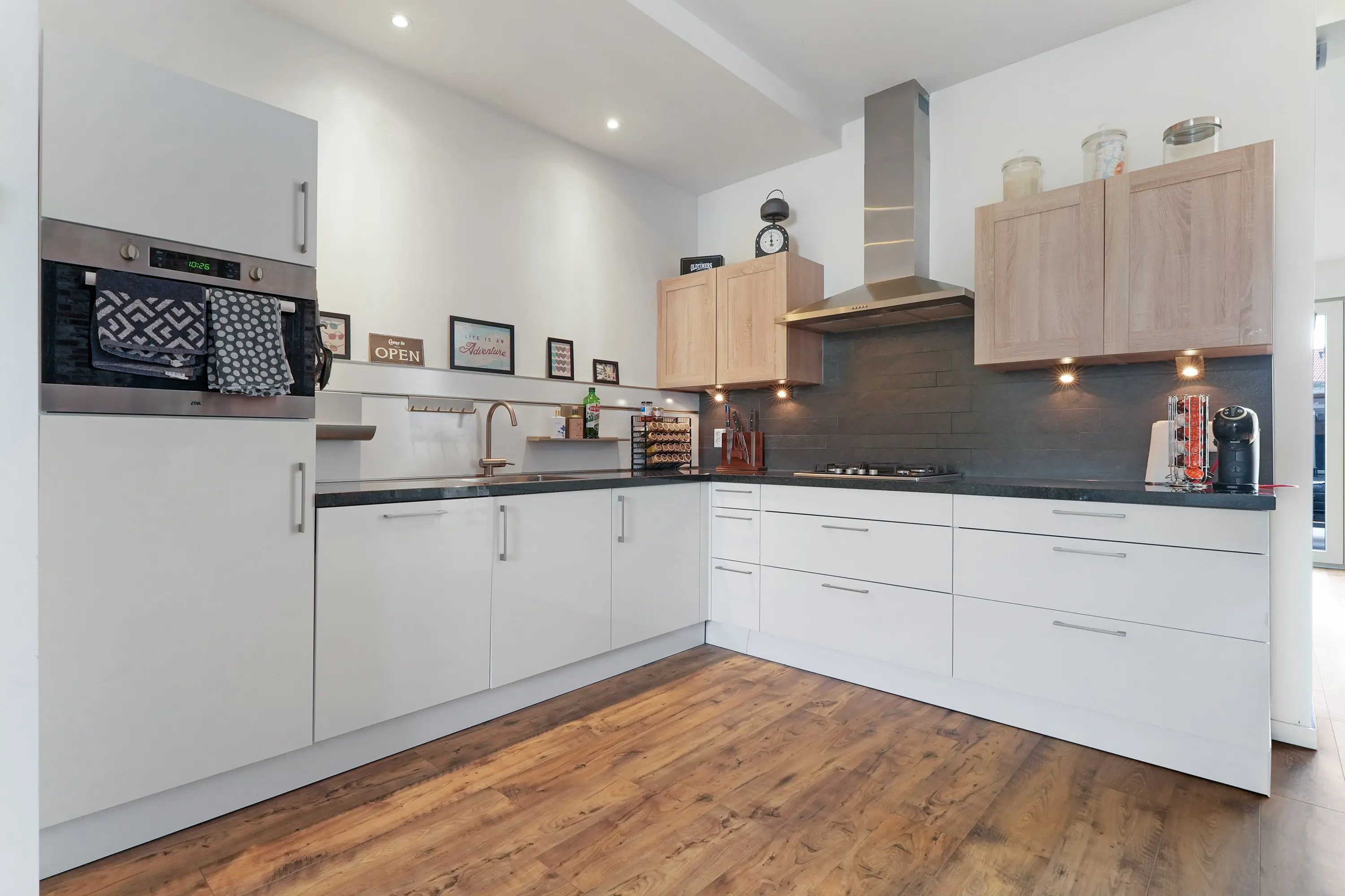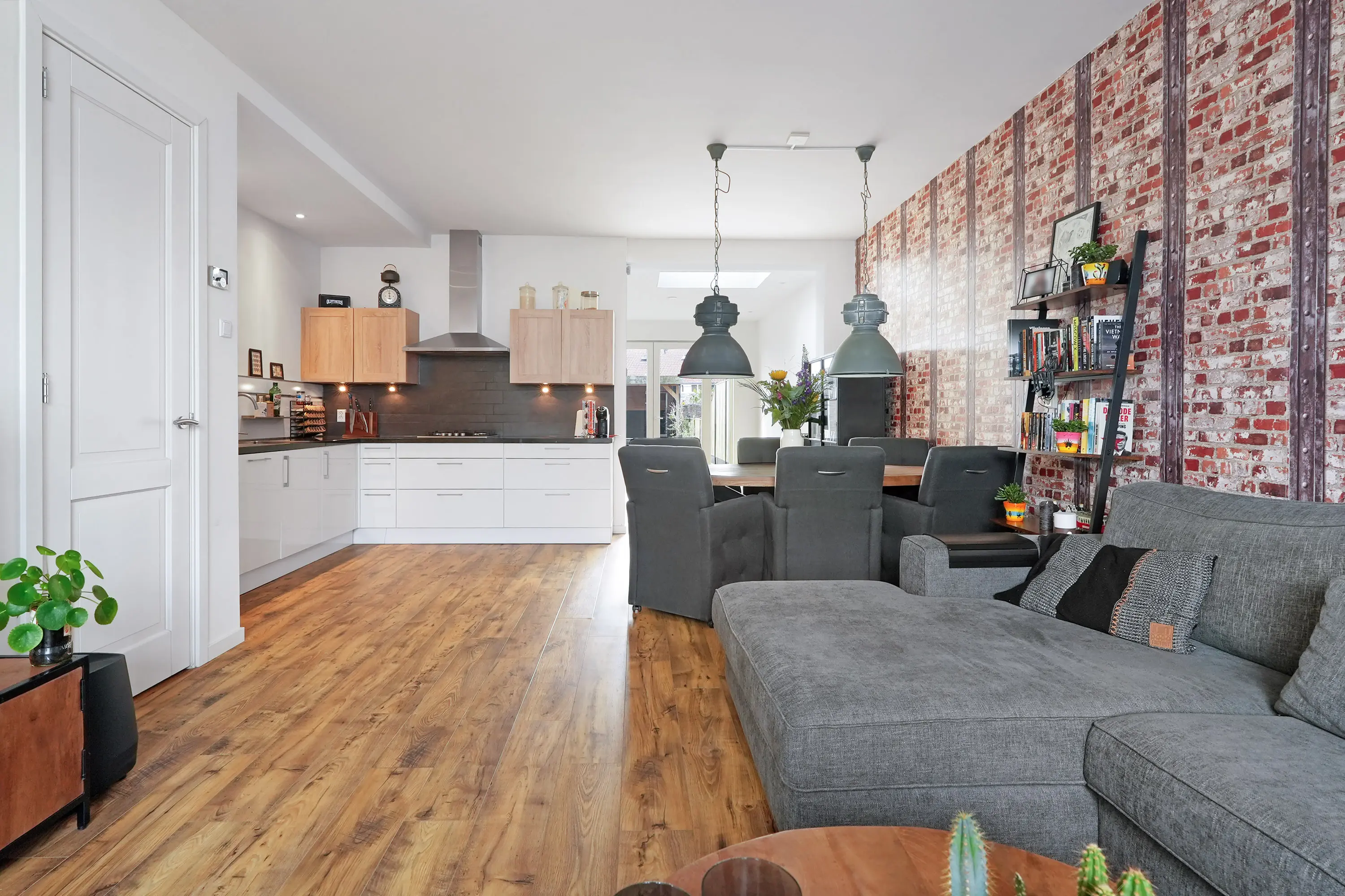 Aan de voorzijde bevindt zich de zithoek, terwijl de eethoek slim geplaatst is naast de keuken. De open keuken is uitgevoerd in een ruime hoekopstelling met lichte kastfronten en een donker composiet werkblad: stijlvol, praktisch én voorzien van de gewenste inbouwapparatuur. Hier kookt u met plezier, met volop werk- en bergruimte. De uitbouw met grote lichtkoepel zorgt voor extra licht en geeft toegang tot de bijkeuken. Hier vindt u de wasmachine-opstelling, de cv-ketel en het toilet. Bovendien fungeert deze ruimte als vrije achterom, dankzij een toegangsdeur langs de woning. Via de bijkeuken heeft u ook inpandig toegang tot de (fietsen)berging. Vanuit de uitbouw loopt u via openslaande deuren zó de zonnige tuin in.