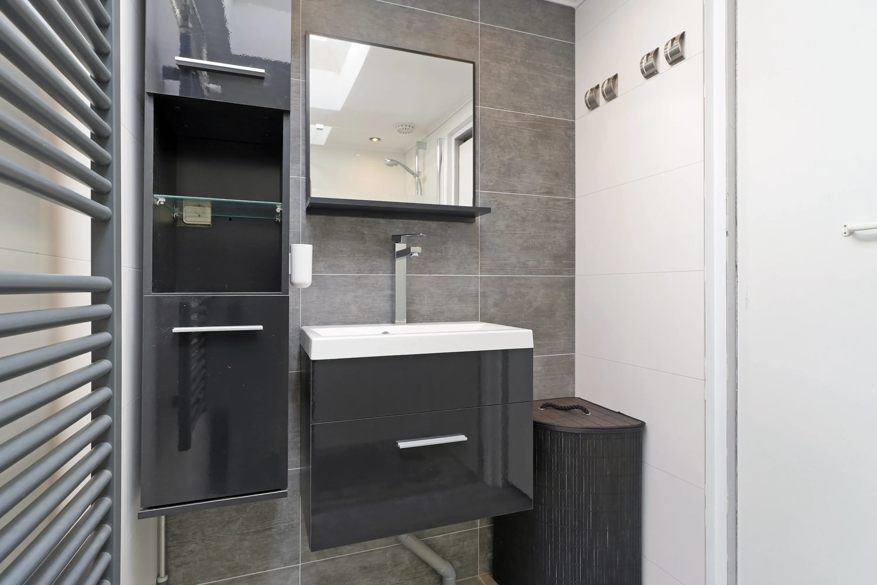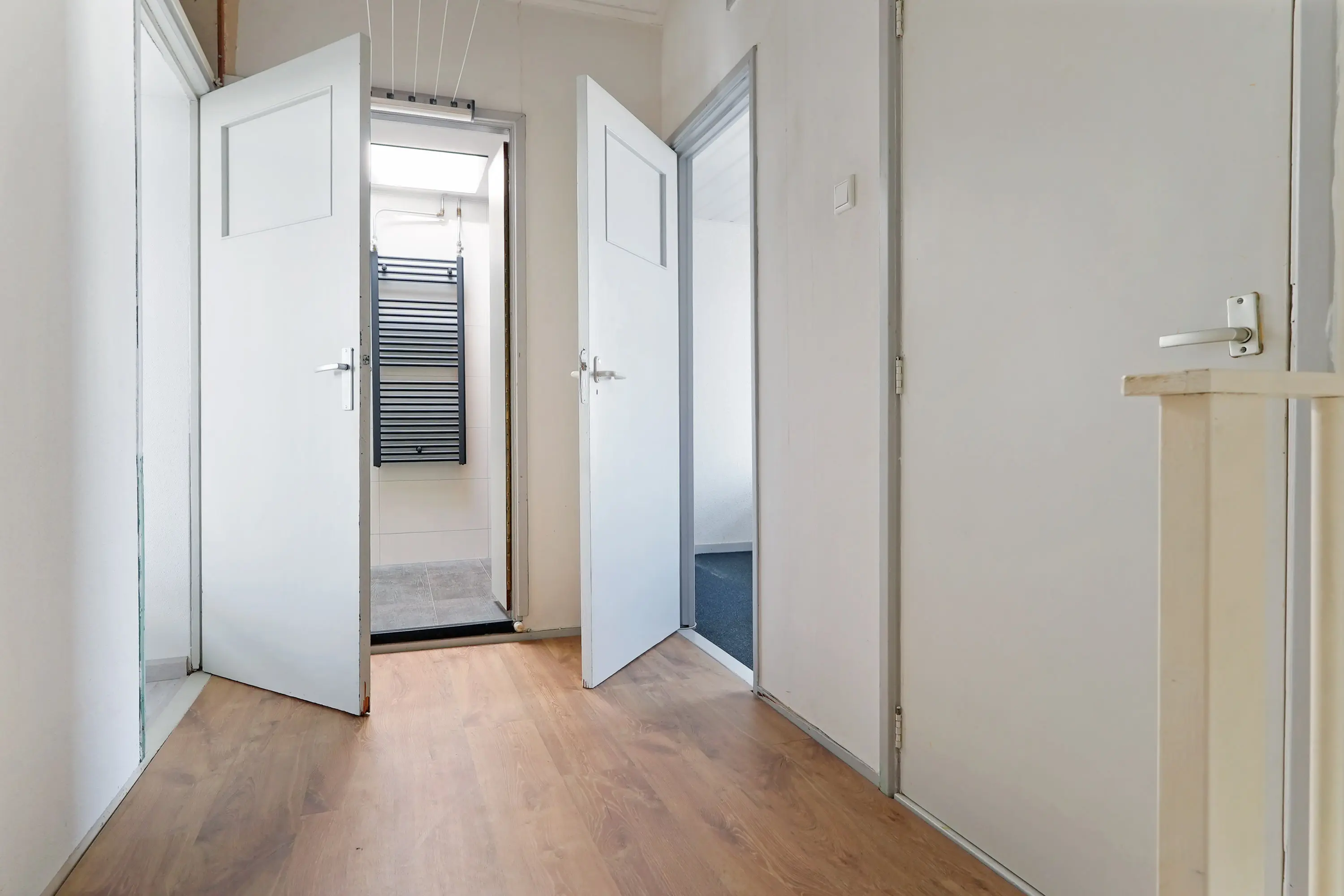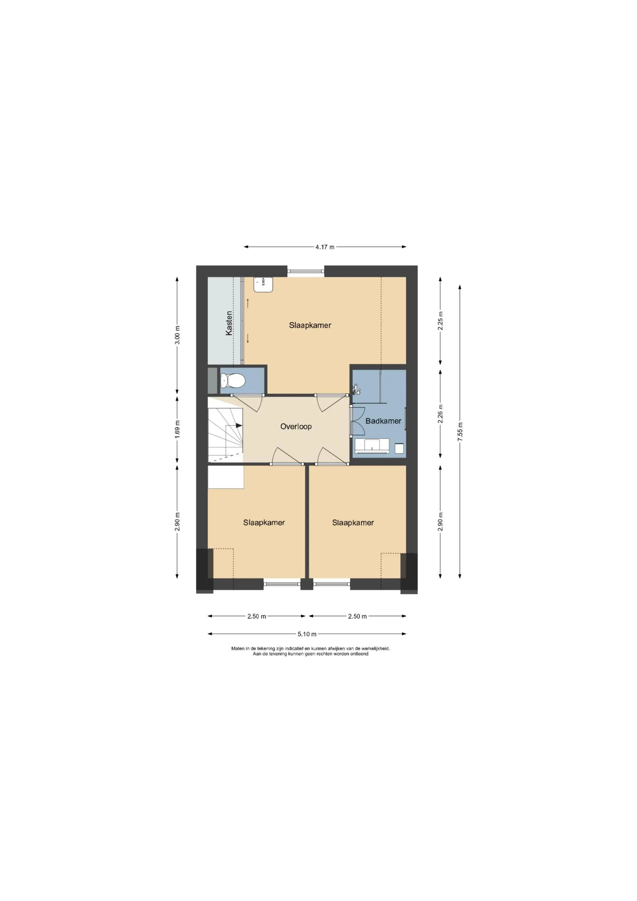 De overloop biedt toegang tot drie slaapkamers, waaronder de royale ouderslaapkamer aan de achterzijde met vaste inbouwkast. De twee overige slaapkamers, gelegen aan de voorzijde, zijn vrijwel gelijk van formaat en daardoor ideaal in te delen als kinderkamer, logeerkamer of thuiswerkplek. De badkamer is keurig verzorgd en voorzien van een inloopdouche en een fraai wastafelmeubel. Dankzij de dakkapellen aan beide zijden van de woning is ook deze verdieping ruimtelijk.