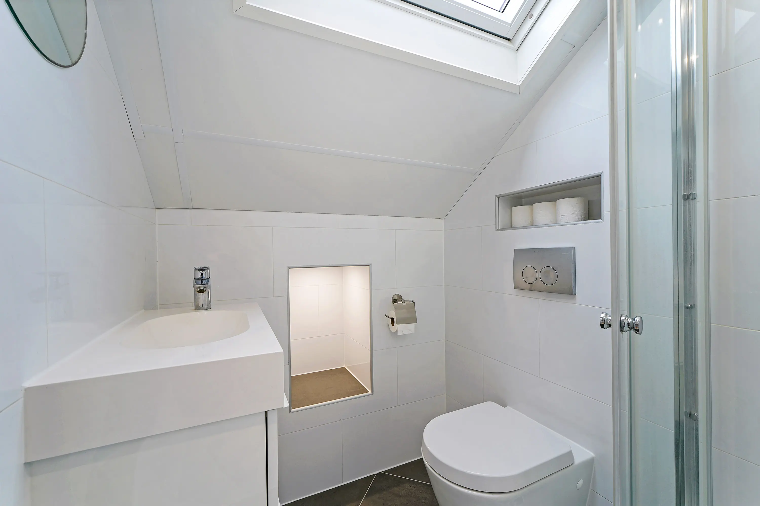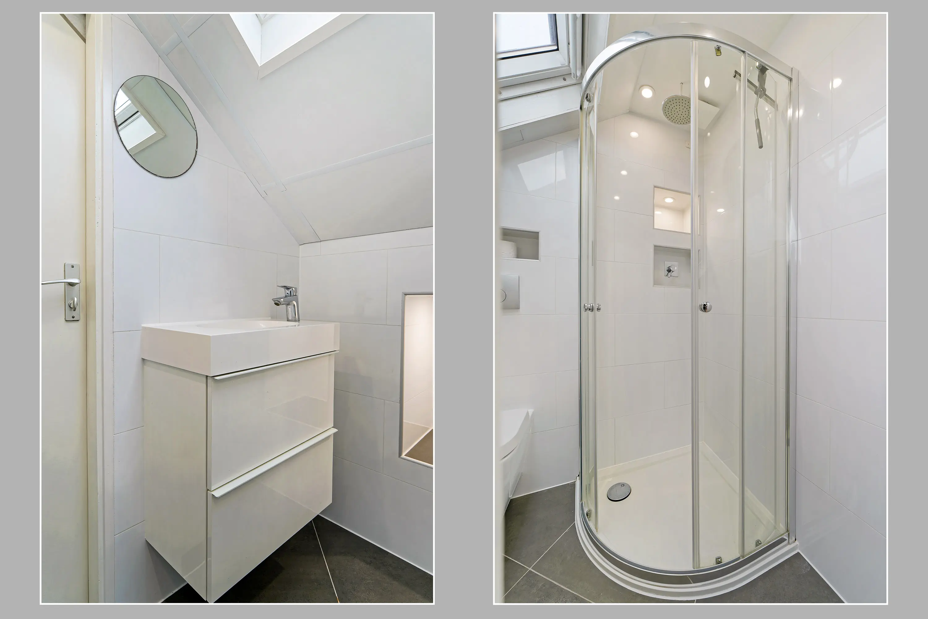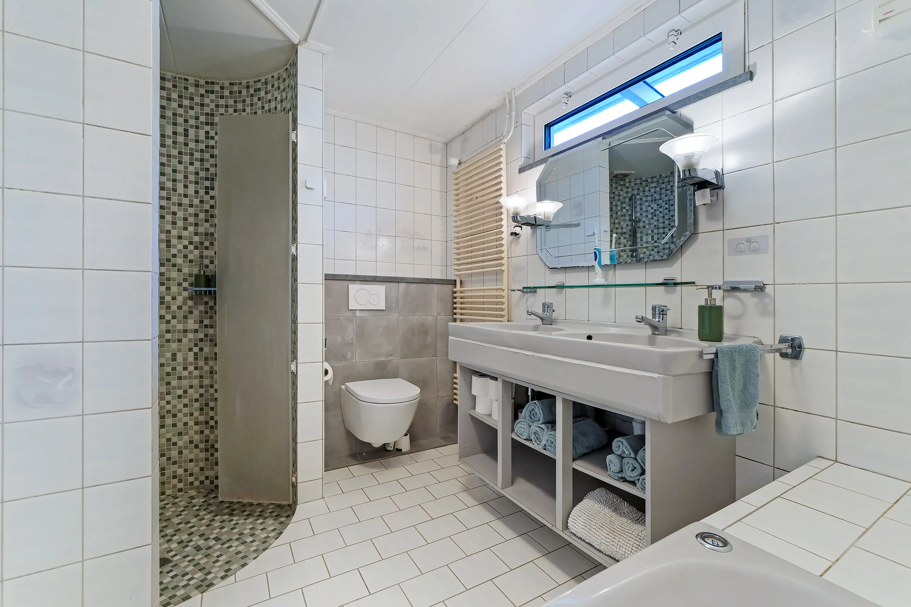 Op de overloop bevindt zich tevens de tweede badkamer, volledig vernieuwd en voorzien van een douche, derde toilet en wastafel.