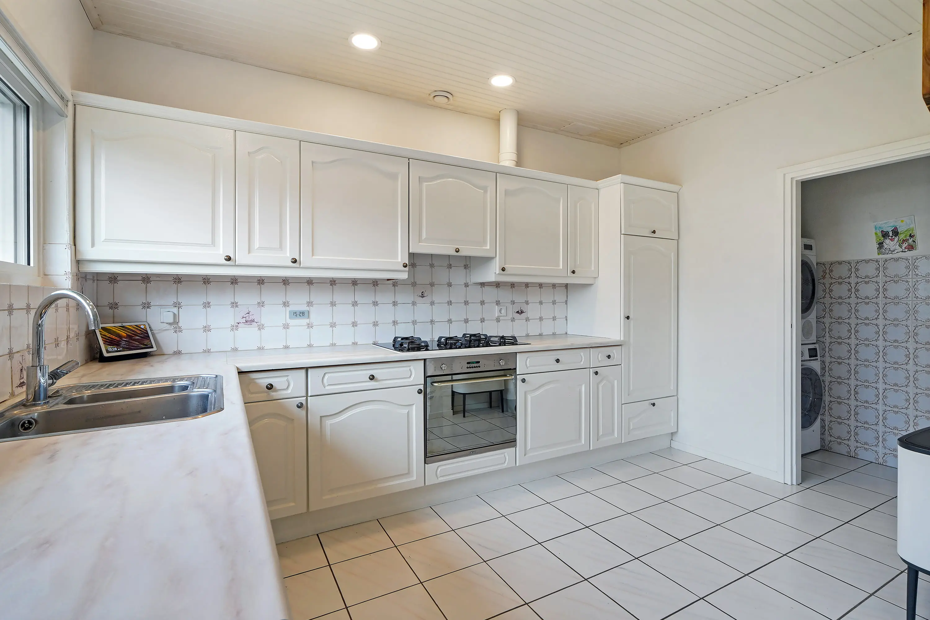 De keuken is opgesteld in een L-vorm, heeft een gedateerde uitstraling en kan naar eigen wens worden gemoderniseerd. De keuken beschikt over diverse inbouwapparatuur. Achter de keuken bevindt zich het washok, waar zowel de droger als de wasmachine op een eigen groep zijn aangesloten. Vanuit de eetkamer bereikt u een slaapkamer, die ook uitstekend kan dienen als speel-, hobby- of werkkamer.