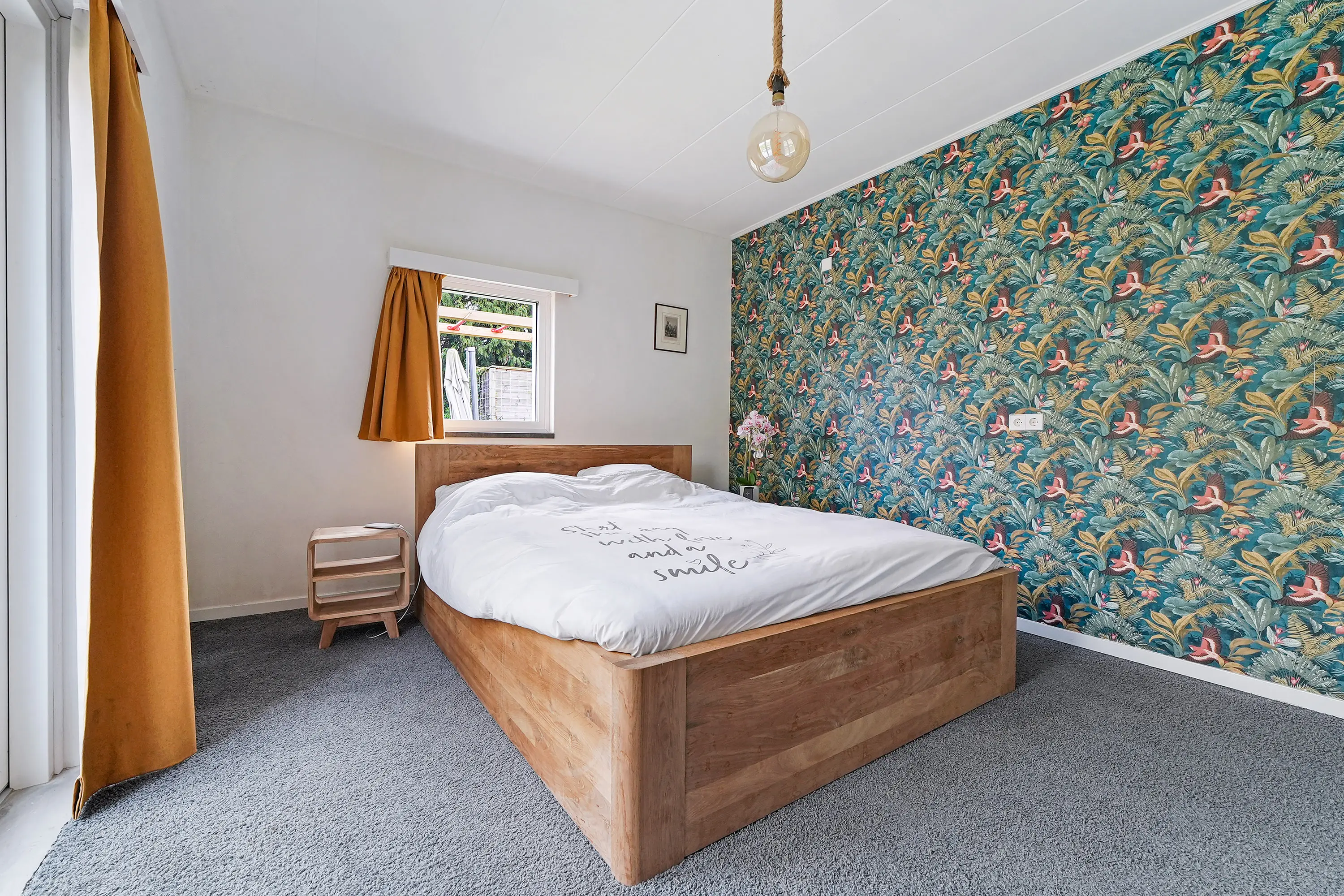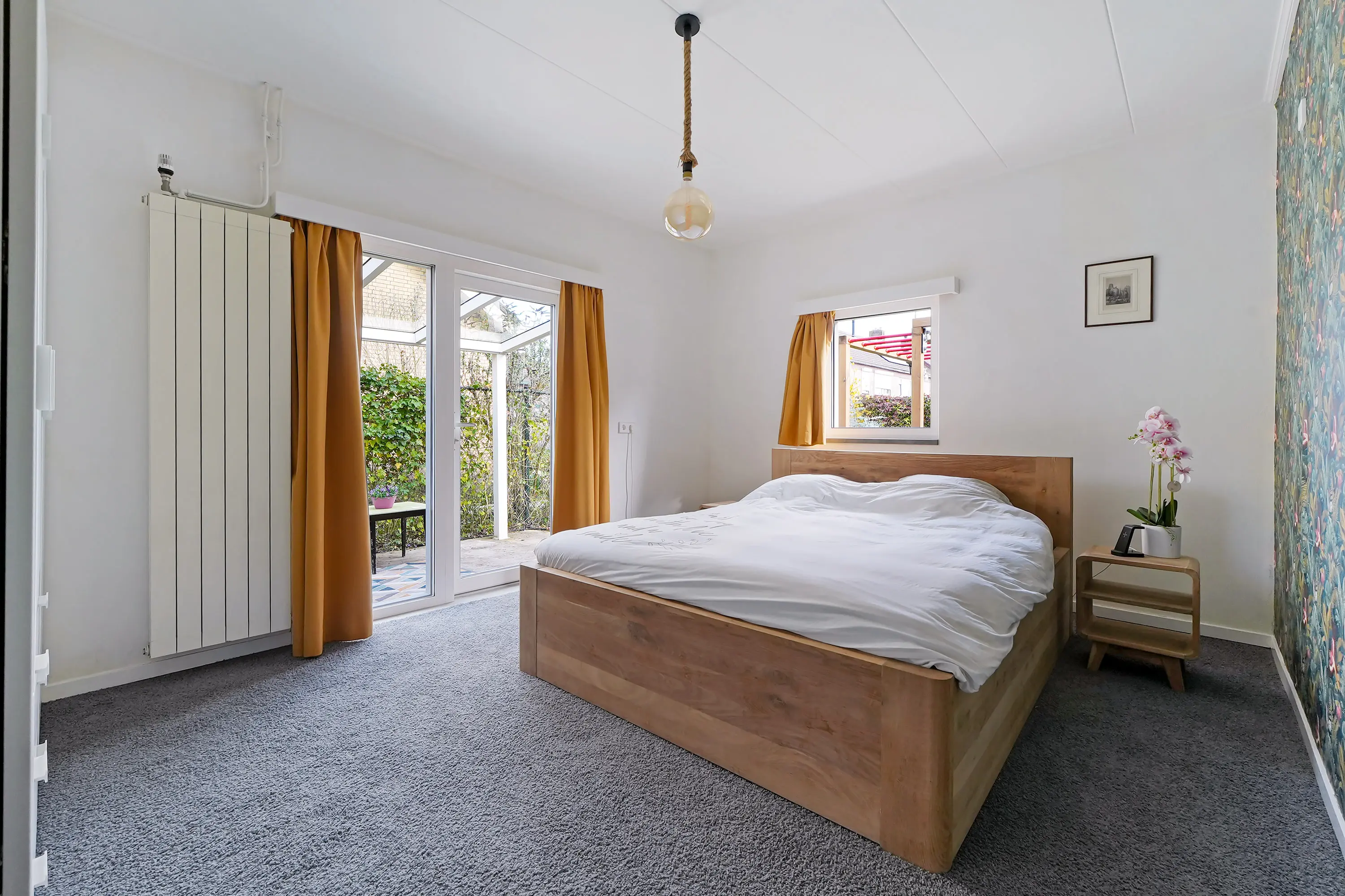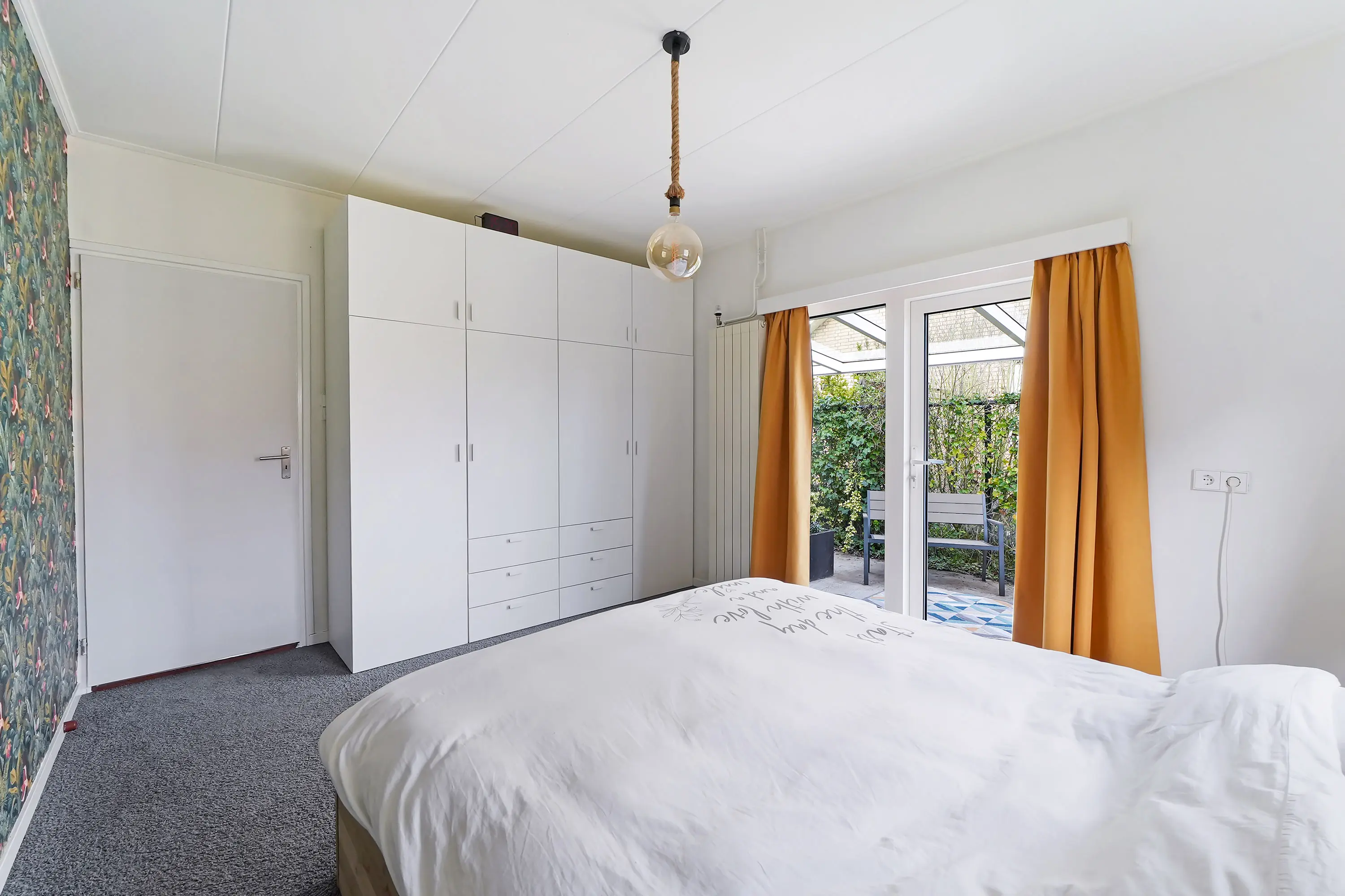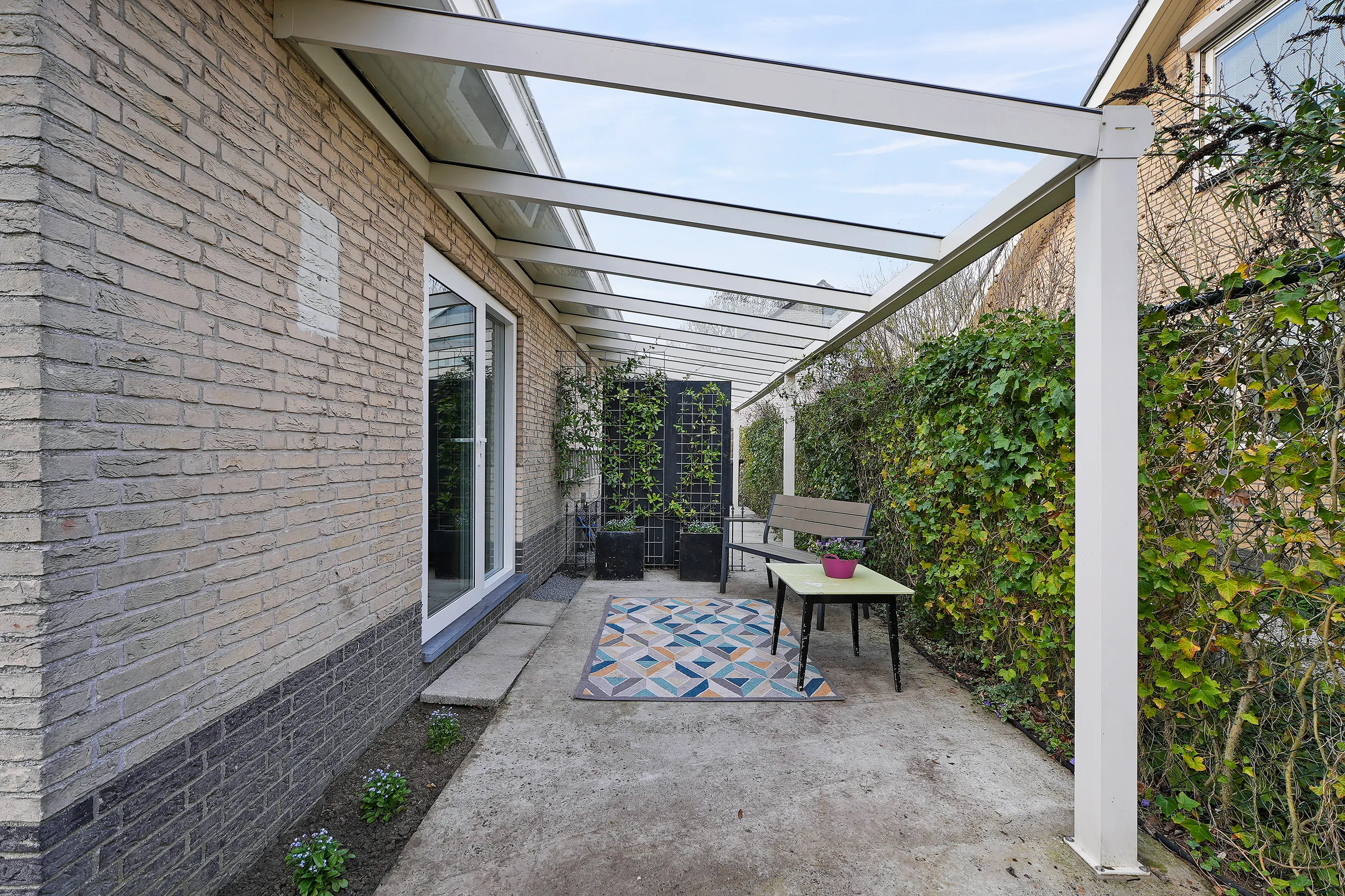 Vanuit de masterbedroom heeft u via een loopdeur toegang tot het naastgelegen terras, voorzien van een nieuwe betonnen vloer en een aluminium overkapping van circa 30m2. Ideaal om een comfortabel zitgedeelte te creëren, met aan de voorzijde ruimte voor onder andere het stallen van fietsen.