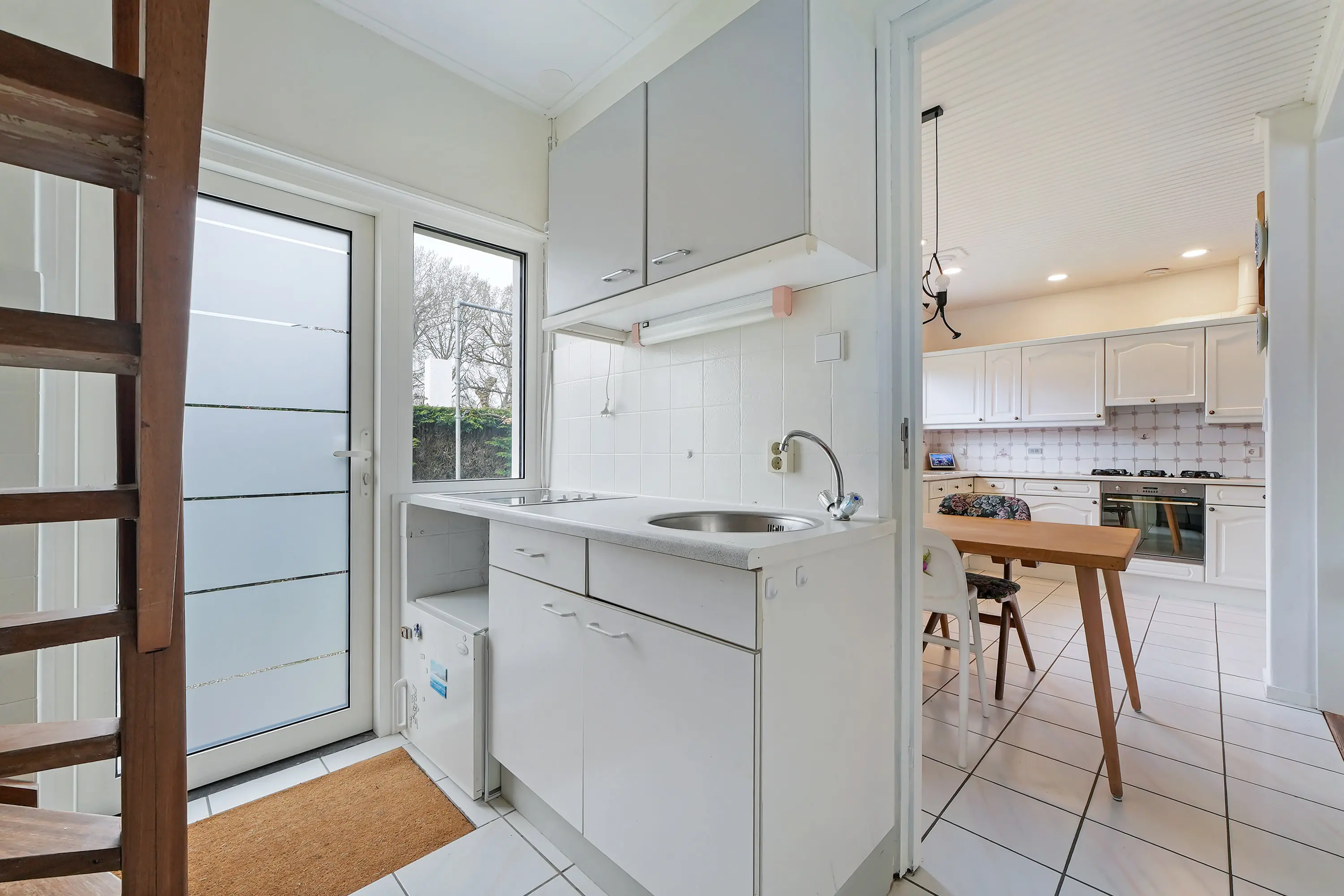 Naast de keuken bevindt zich een bijkeuken waar ook de trapopgang is gesitueerd. Deze trap brengt ons naar de eerste verdieping.