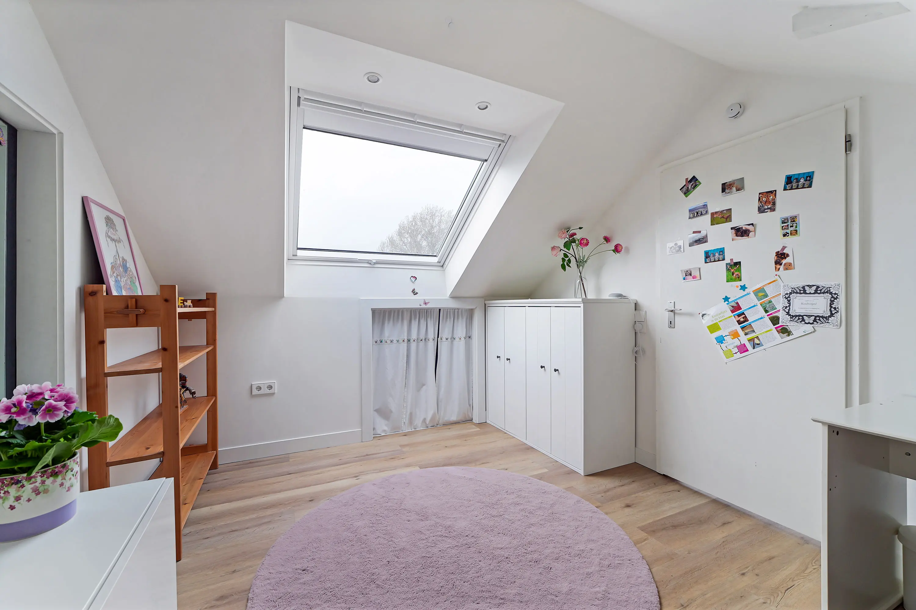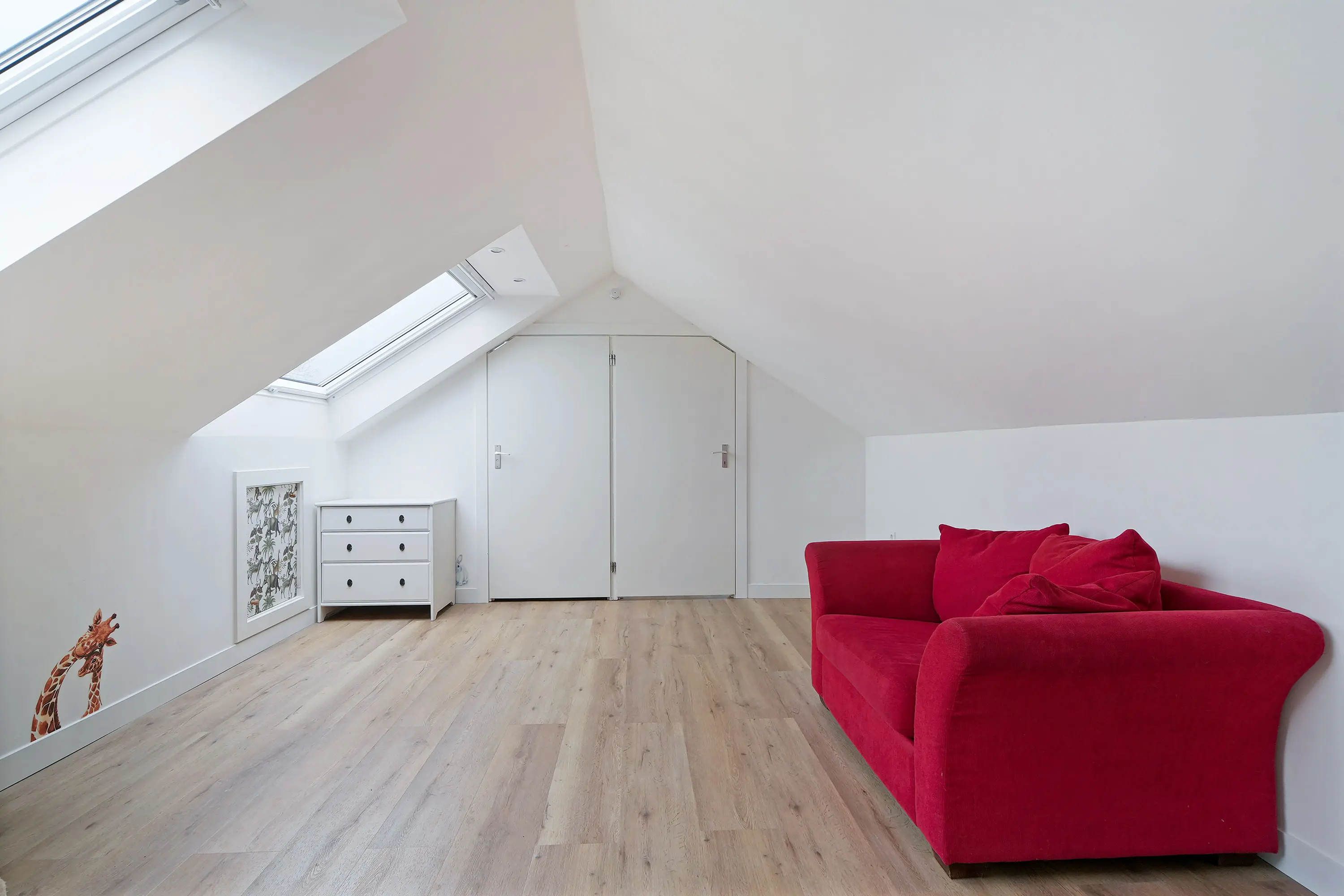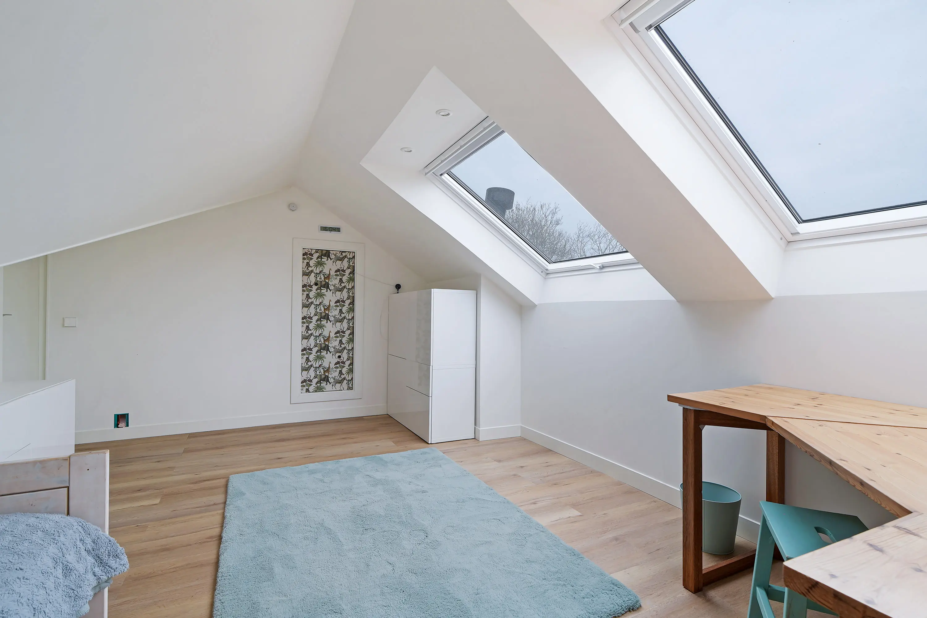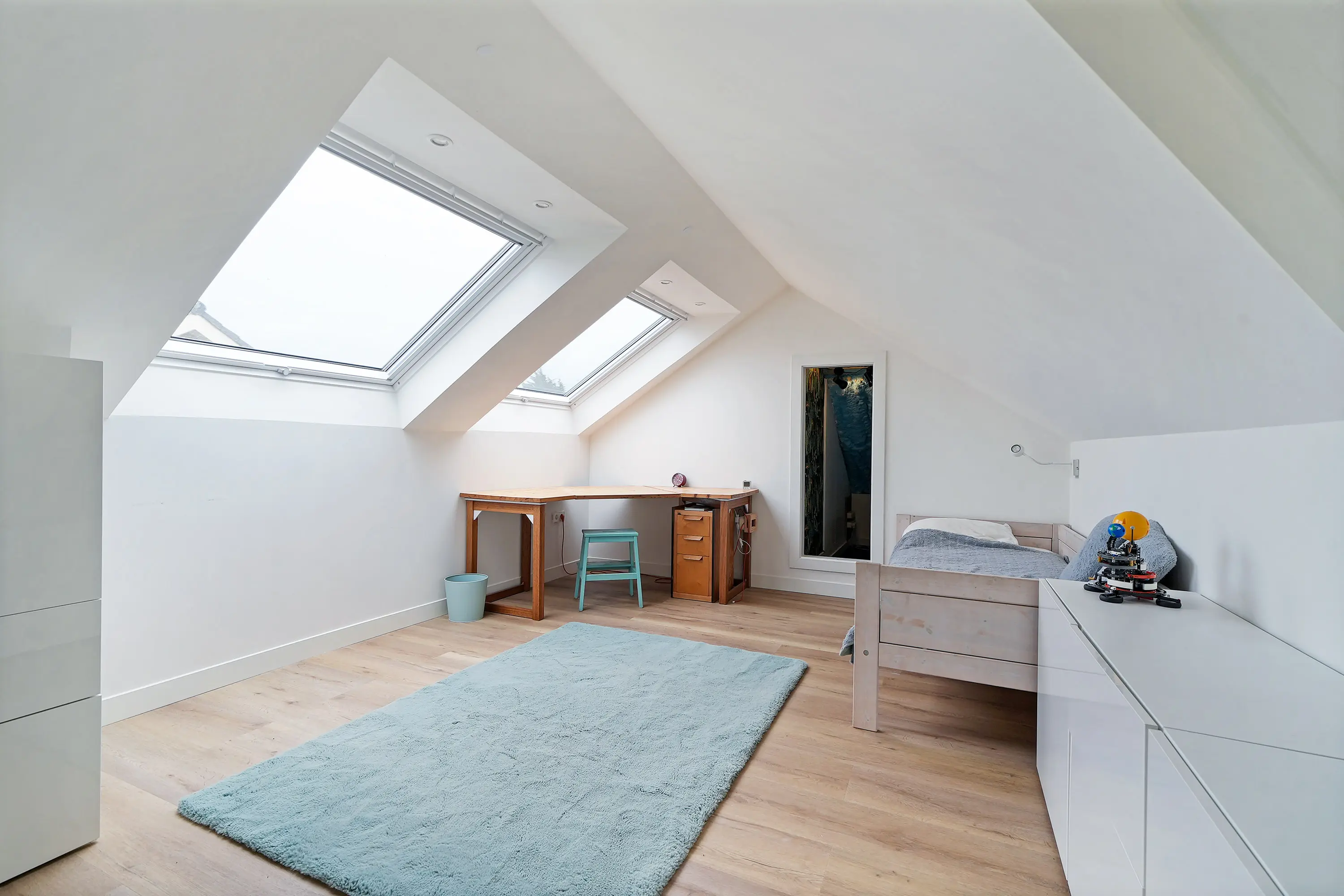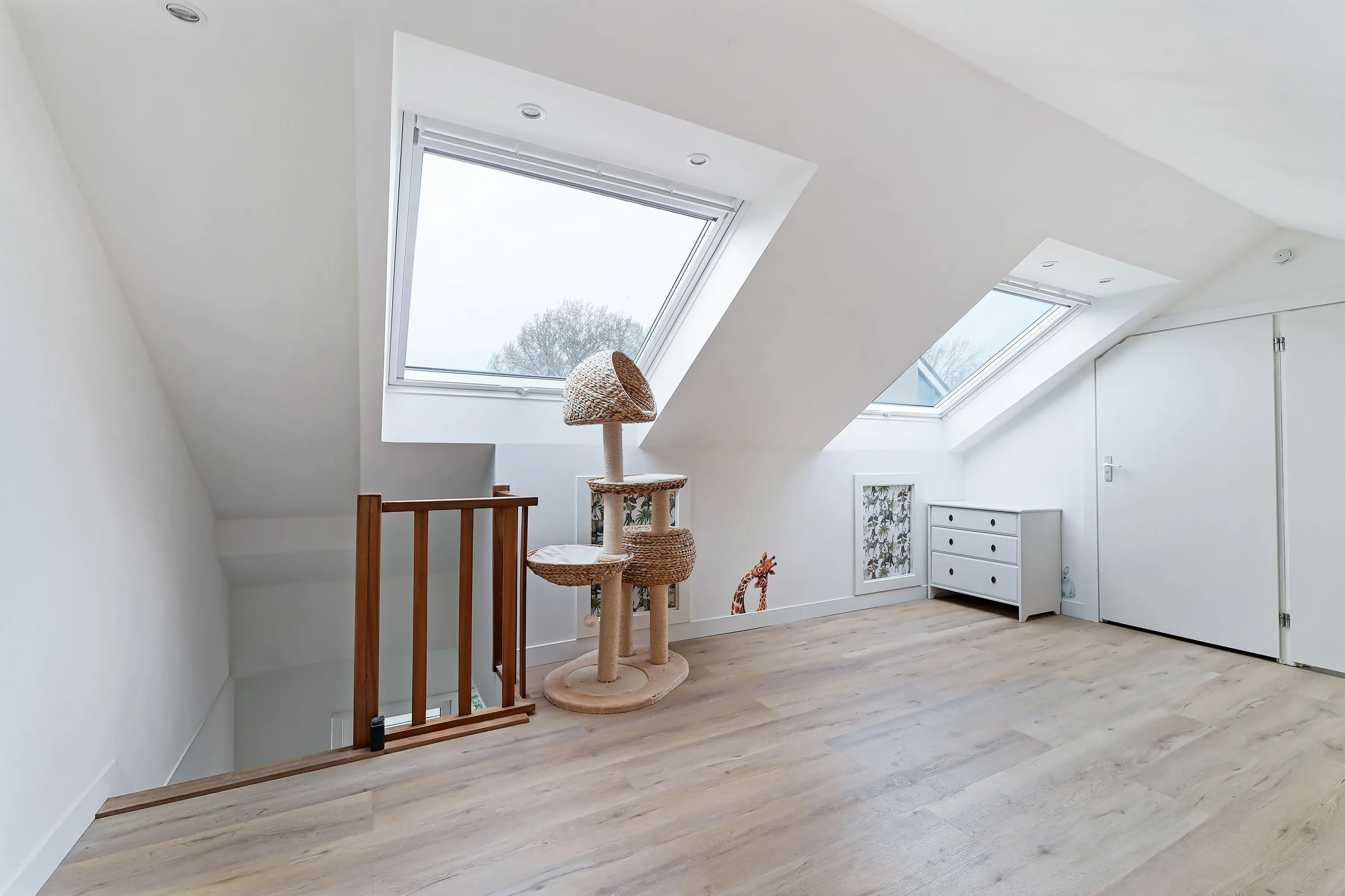 De eerste verdieping is volledig vernieuwd en strak afgewerkt. Hier is duidelijk aandacht besteed aan elk detail. Zo is de draagconstructie verhoogd om de verdieping optimaal beloopbaar te maken en zijn er grote uitzettuimelvensters geplaatst met in het afgewerkte plafond ingebouwde spotjes.