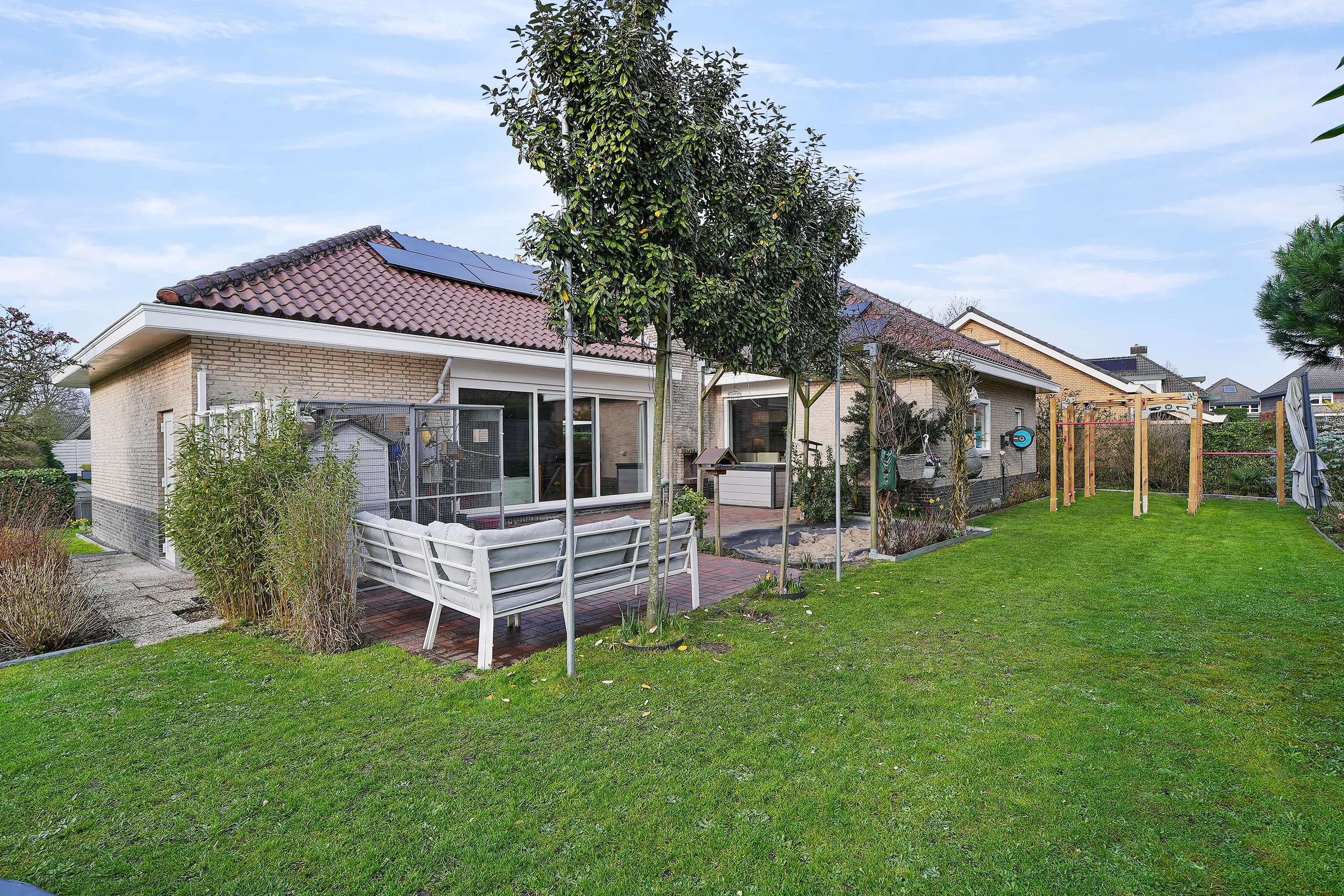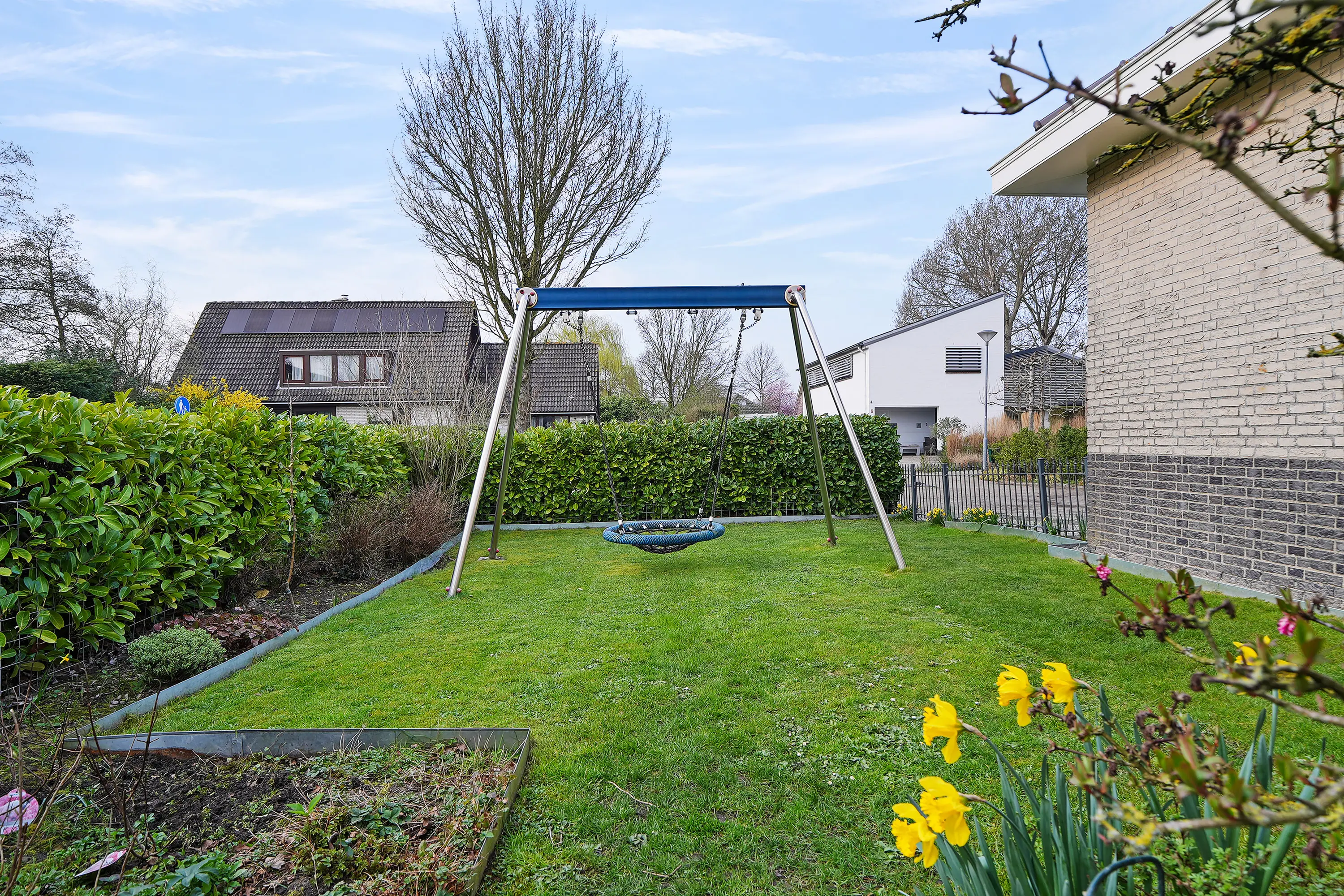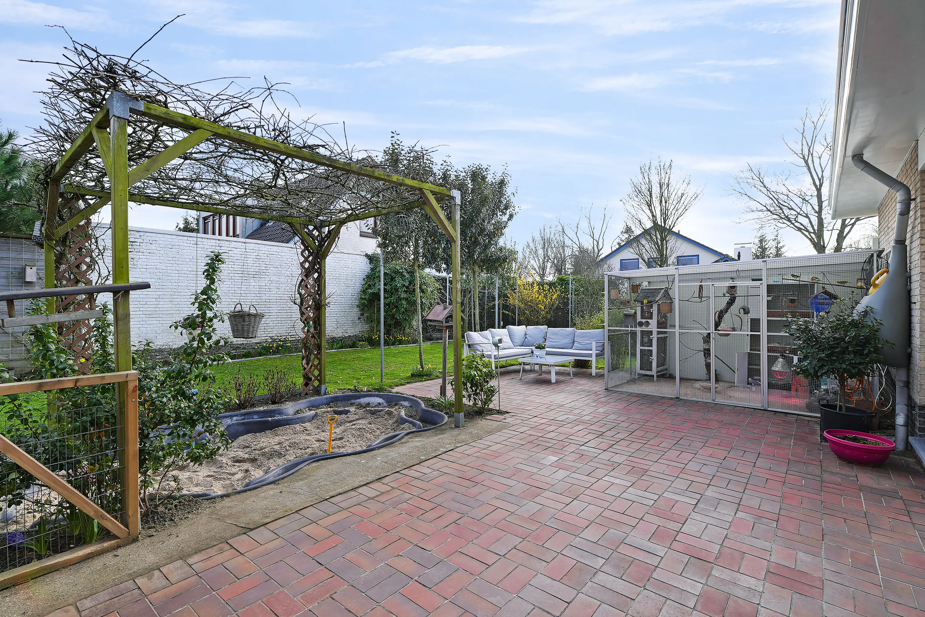 De tuin beschikt over een groot terras aan de achterzijde van de woning, gunstig gelegen op de zon en met veel privacy. Daarnaast zijn er meerdere speelhoeken voor kinderen aanwezig. Verder is de tuin voorzien van een beregeningssysteem, zowel in de borders als met sprinklers in het gazon.