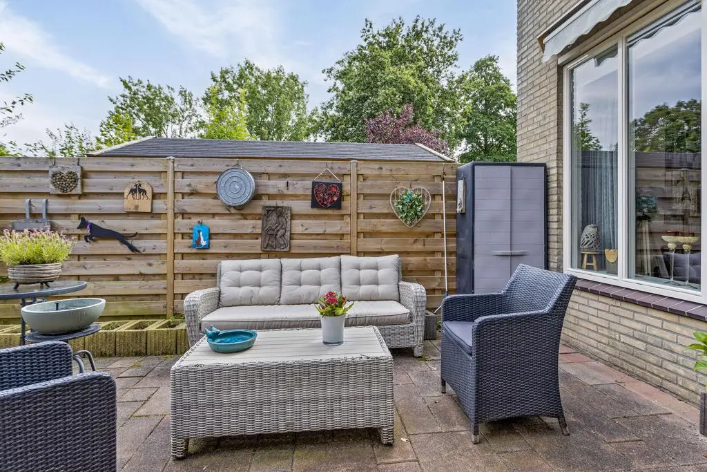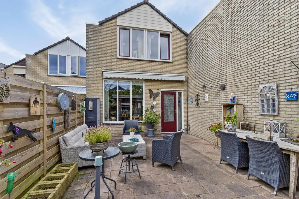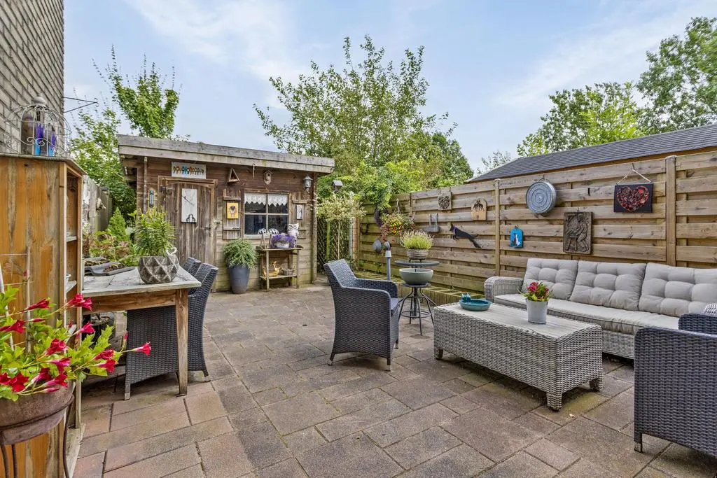 Een heerlijk zonnige tuin met houten berging en veel privacy. De tuin is onderhoudsarm ingericht en beschikt over een zonnescherm. Kortom, een leuke tuin waar u veel plezier van zult hebben!