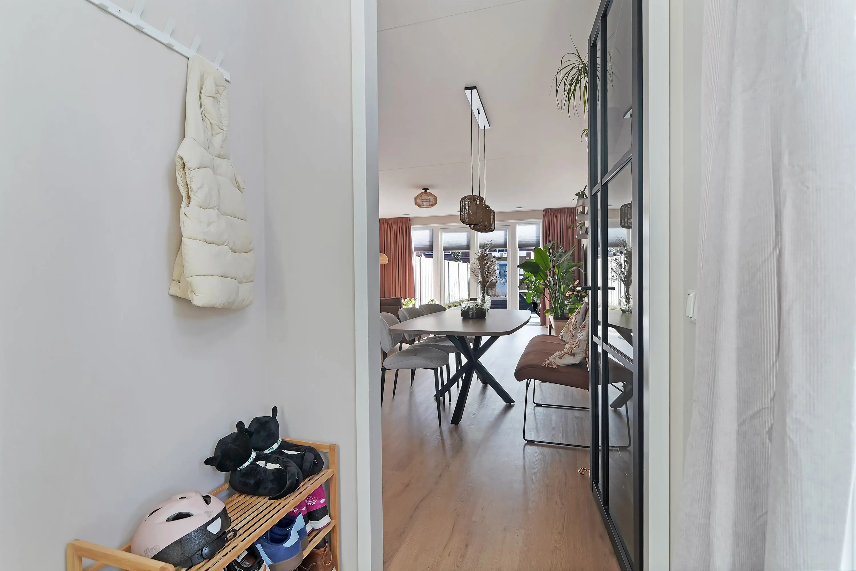 Via de eigen oprit betreedt u de woning. De entree biedt toegang tot de welkomsthal met uitgebreide meterkast, hip toilet, garderobe en doorgang naar de royale woonkamer. Bij binnenkomst ervaart u direct de ruimtelijkheid dankzij de uitbouw aan de tuinzijde en de flitsende aankleding in combinatie met afwerking.