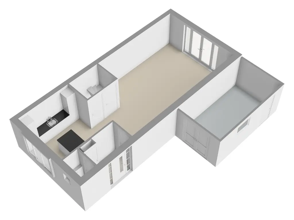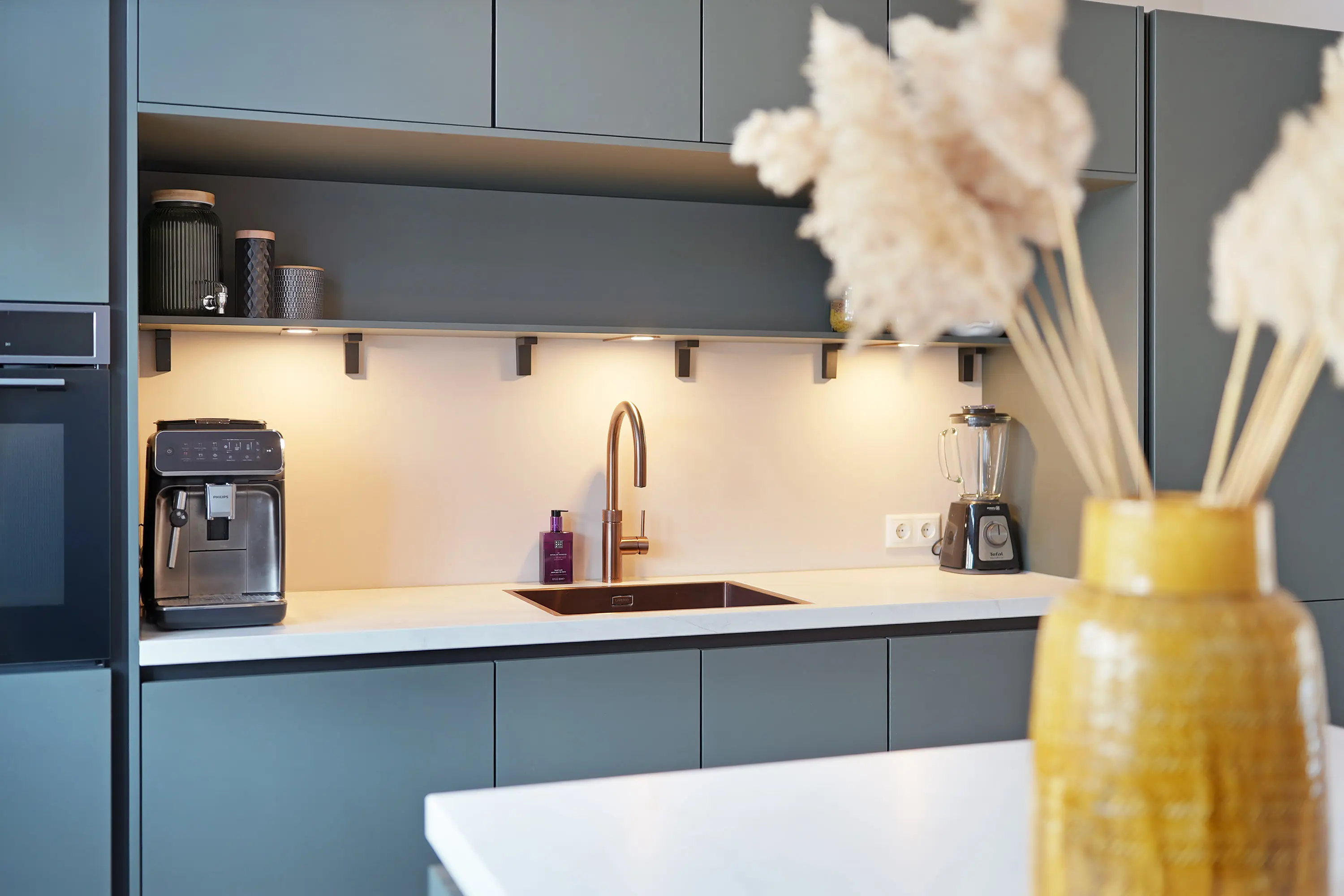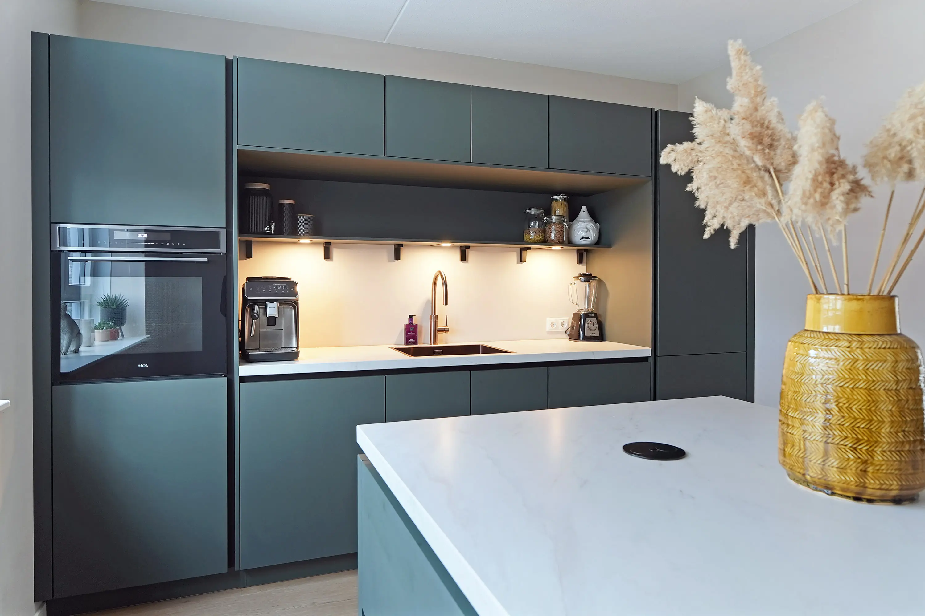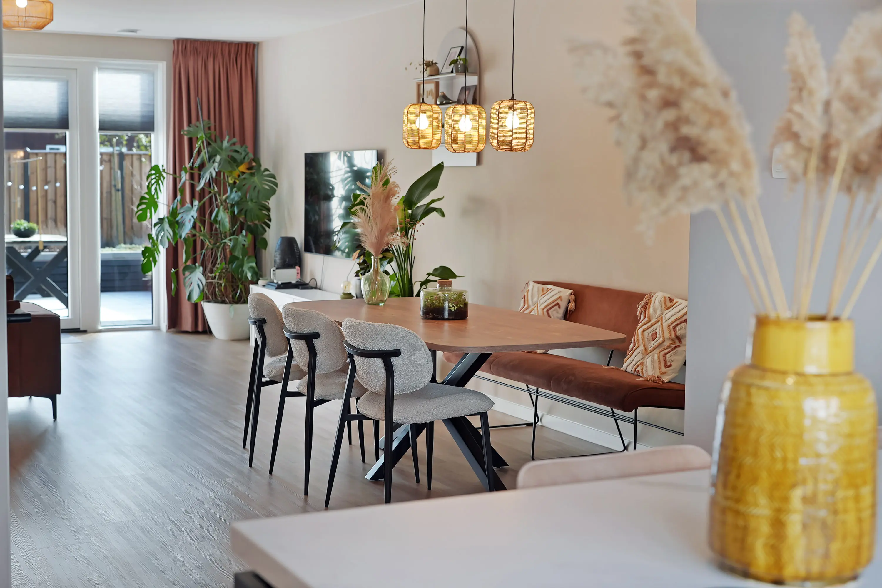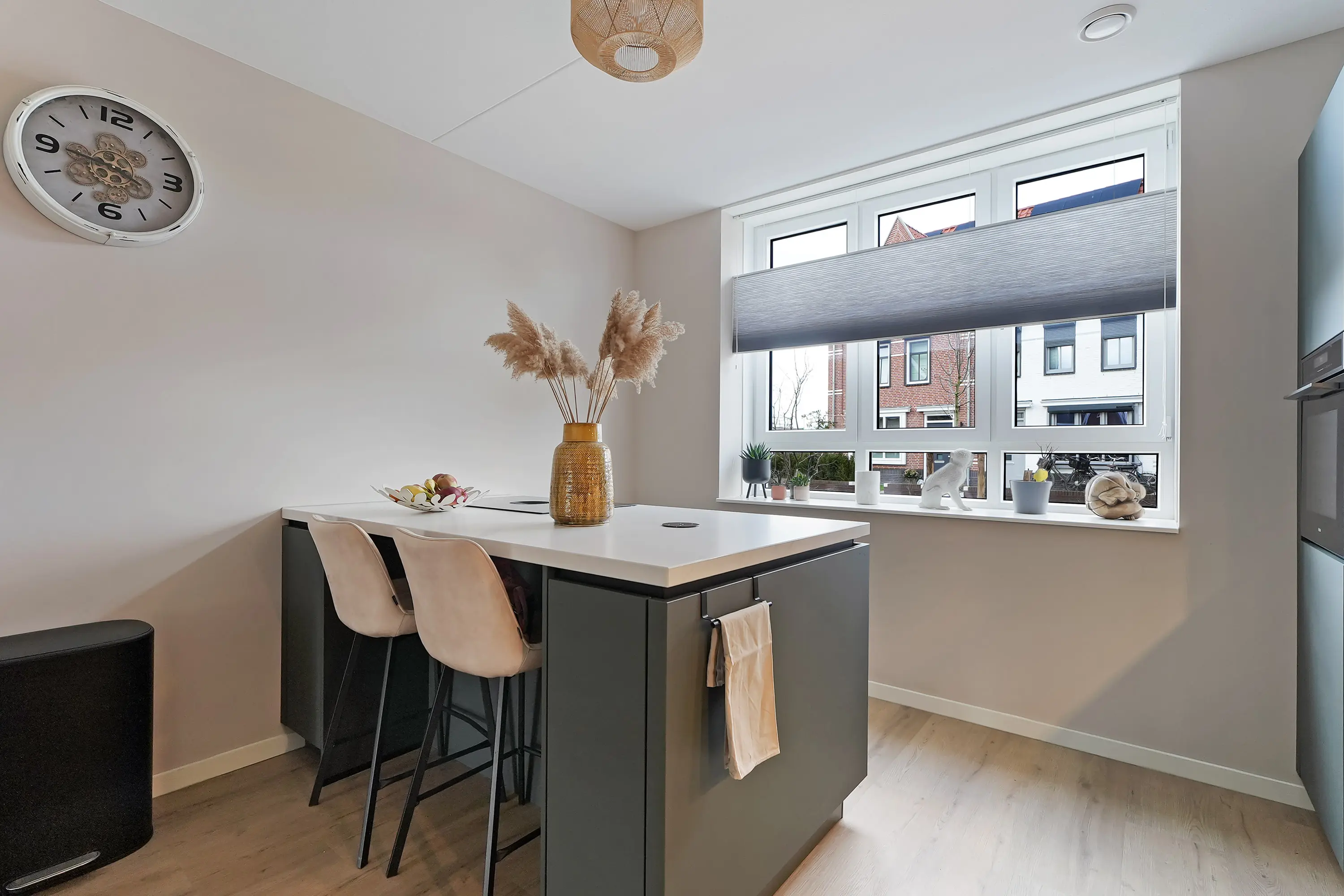 In de royale woonkamer treft u de zithoek aan de tuinzijde waar u een geweldige mate heeft aan effectieve daglichttoetreding door de grote pui met openslaande deuren naar de tuin. De eethoek bevindt zich halverwege de woonkamer met een open verbinding naar de fancy keuken aan de voorzijde. Deze keuken met schiereiland is werkelijk dé eyecatcher: Strak vormgegeven in een donkere kleurstelling, met een licht keramiek werkblad en uiteraard compleet met hoogwaardige inbouwapparatuur. Zo kunt u culinair aan de slag met o.a. de Bora inductie kookplaat met downdraft, Quooker, koel-vriescombi, vaatwasser en grote combi-oven. Naast de trapopgang naar de 1e verdieping treft u een ruime praktische trapkast. Via de openslaande deuren bereikt u de zonnige tuin. De openslaande deuren verbindt binnen met buiten en leidt u naar de tuin.